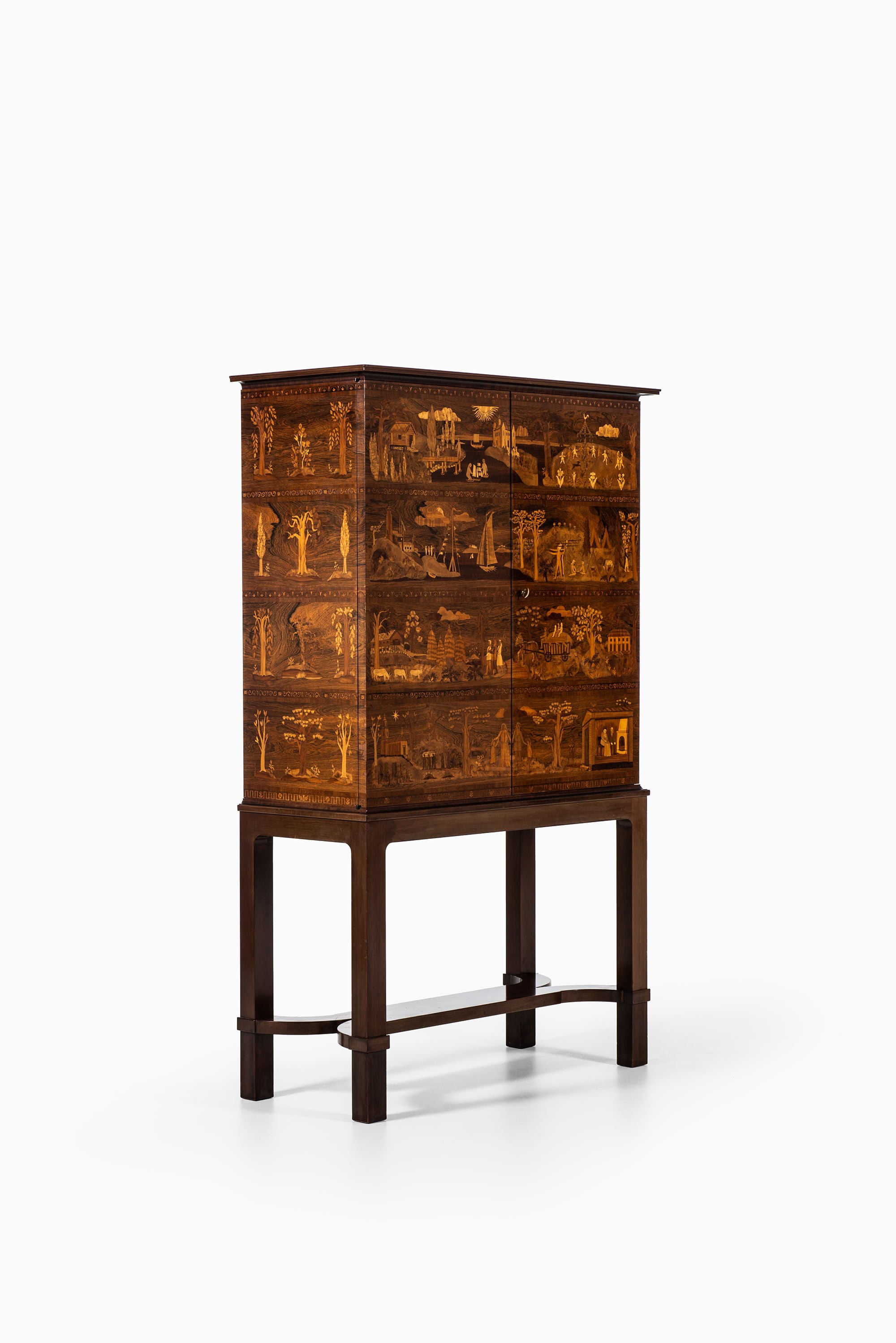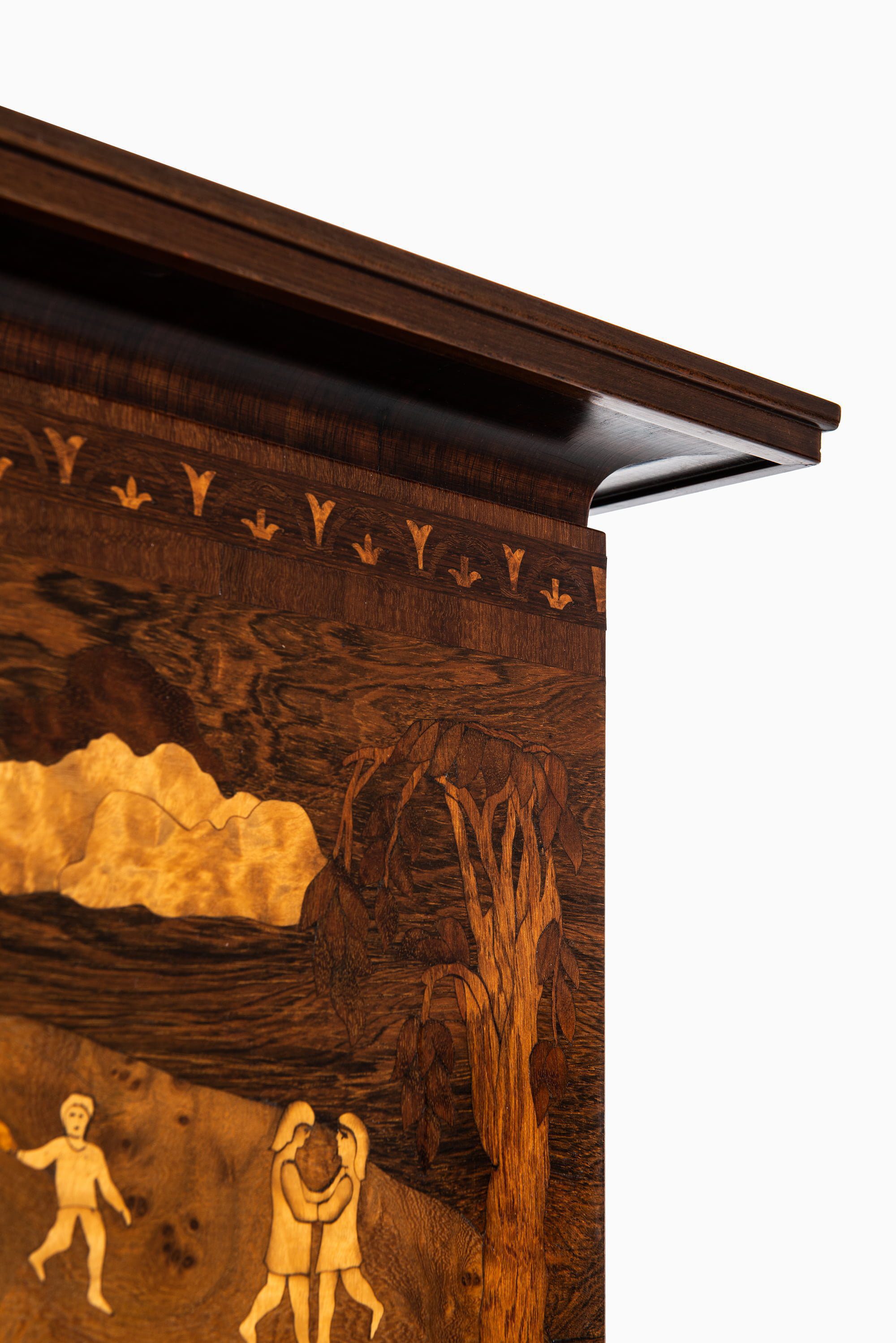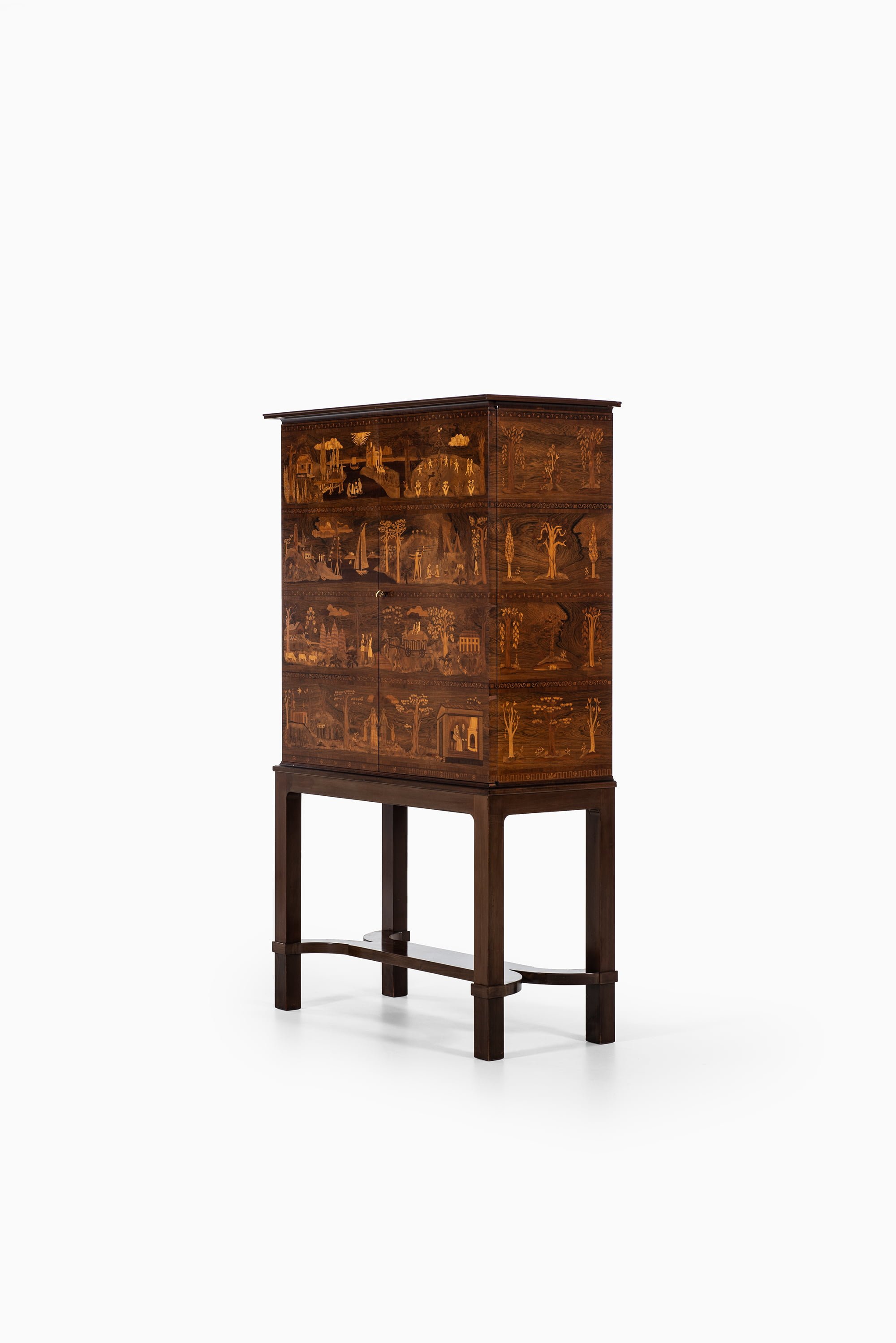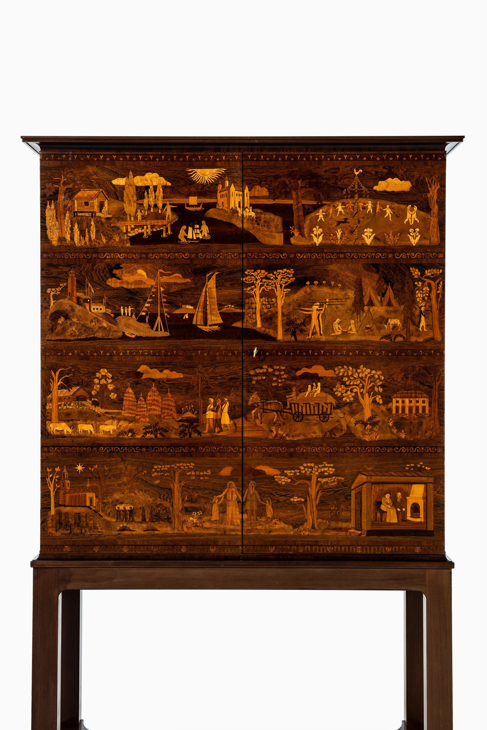A very rare and historically significant master cabinet titled “The Four Ages”, designed by Carl Malmsten and produced by David Blomberg in Sweden in 1931. This extraordinary piece stands as a testament to Malmsten’s lifelong dedication to Swedish craftsmanship, symbolism, and narrative design. Executed in richly figured rosewood, the cabinet is adorned with exceptional marquetry panels depicting allegorical scenes of life’s four stages — childhood, youth, adulthood, and old age — rendered with meticulous precision and artistic poetry.