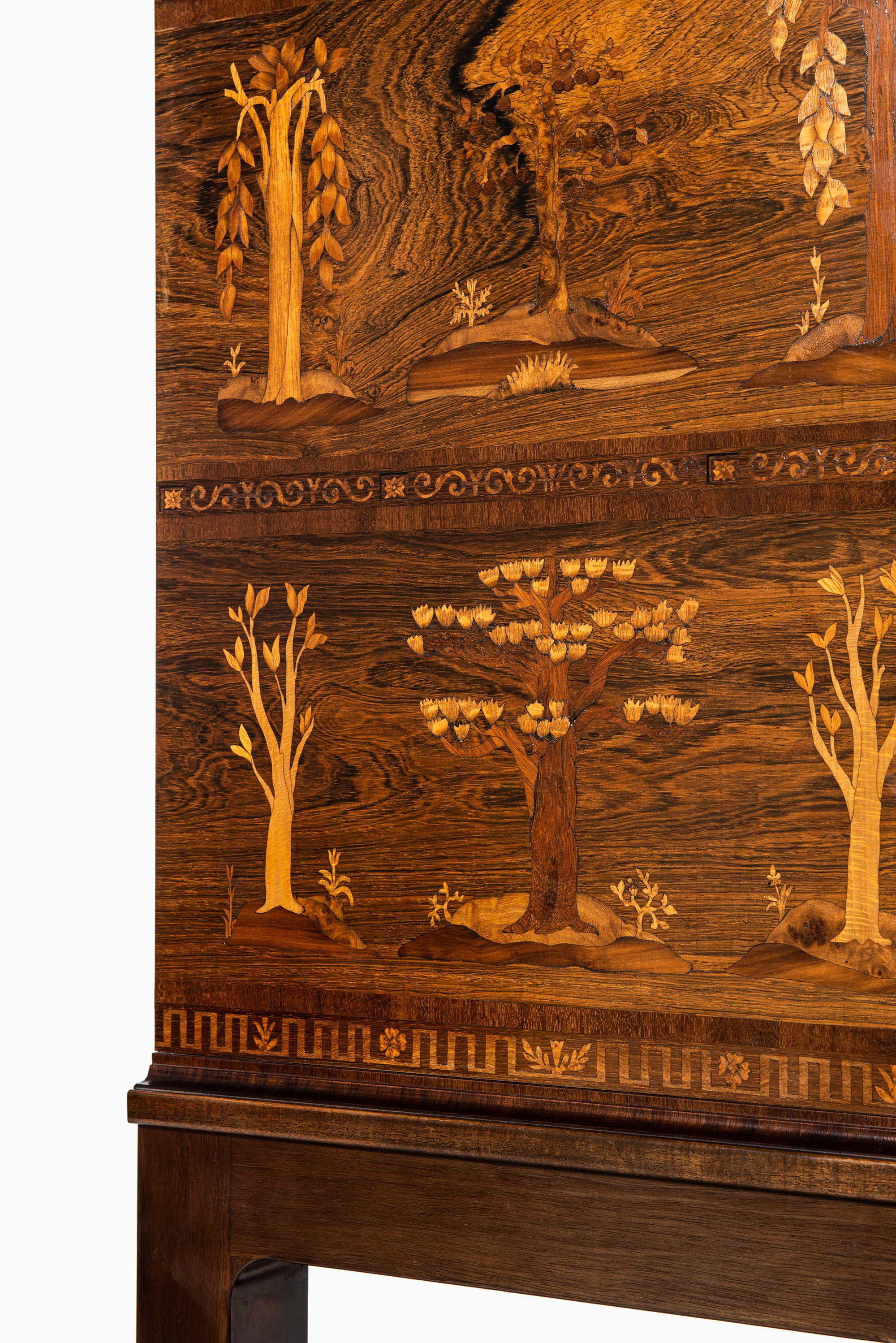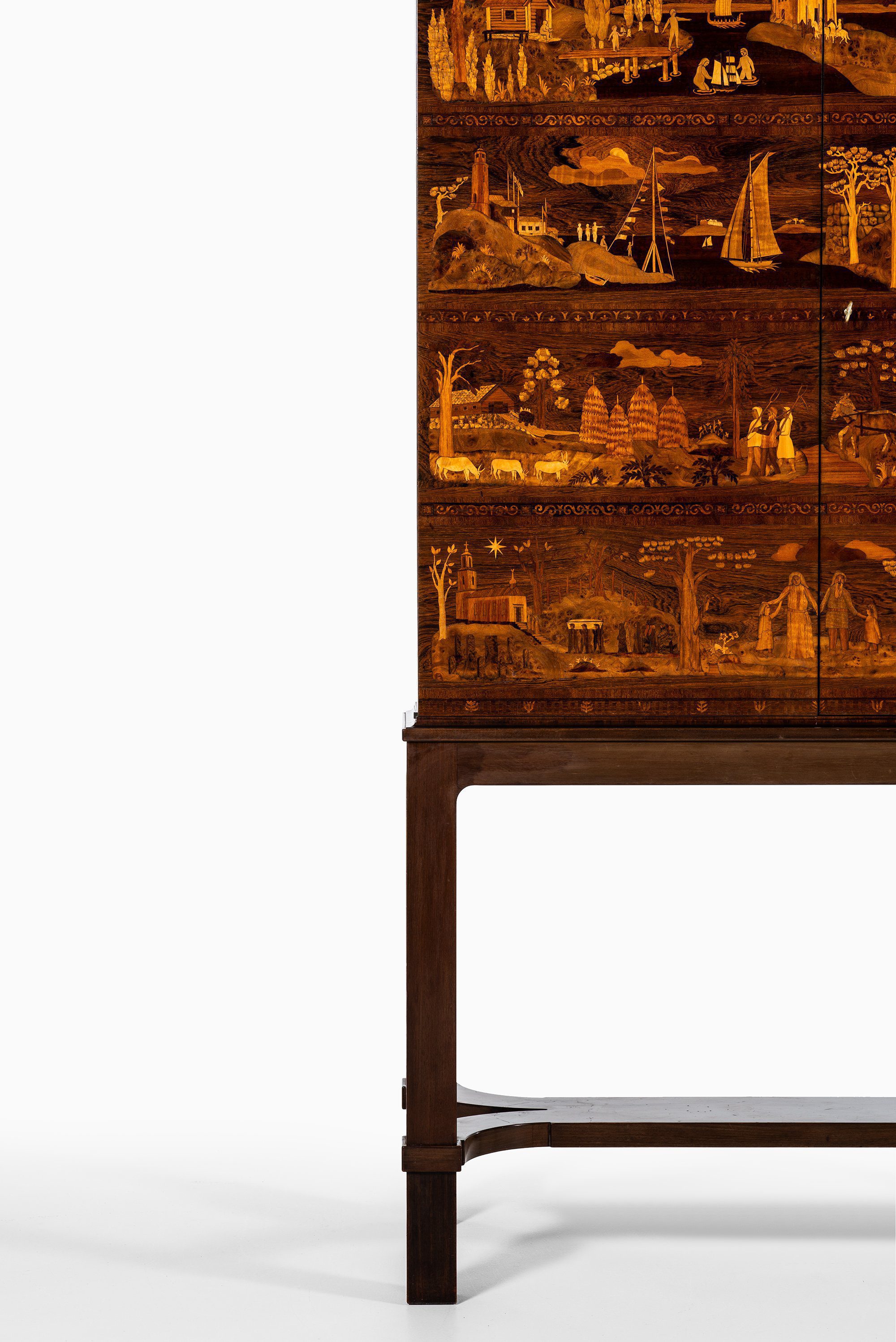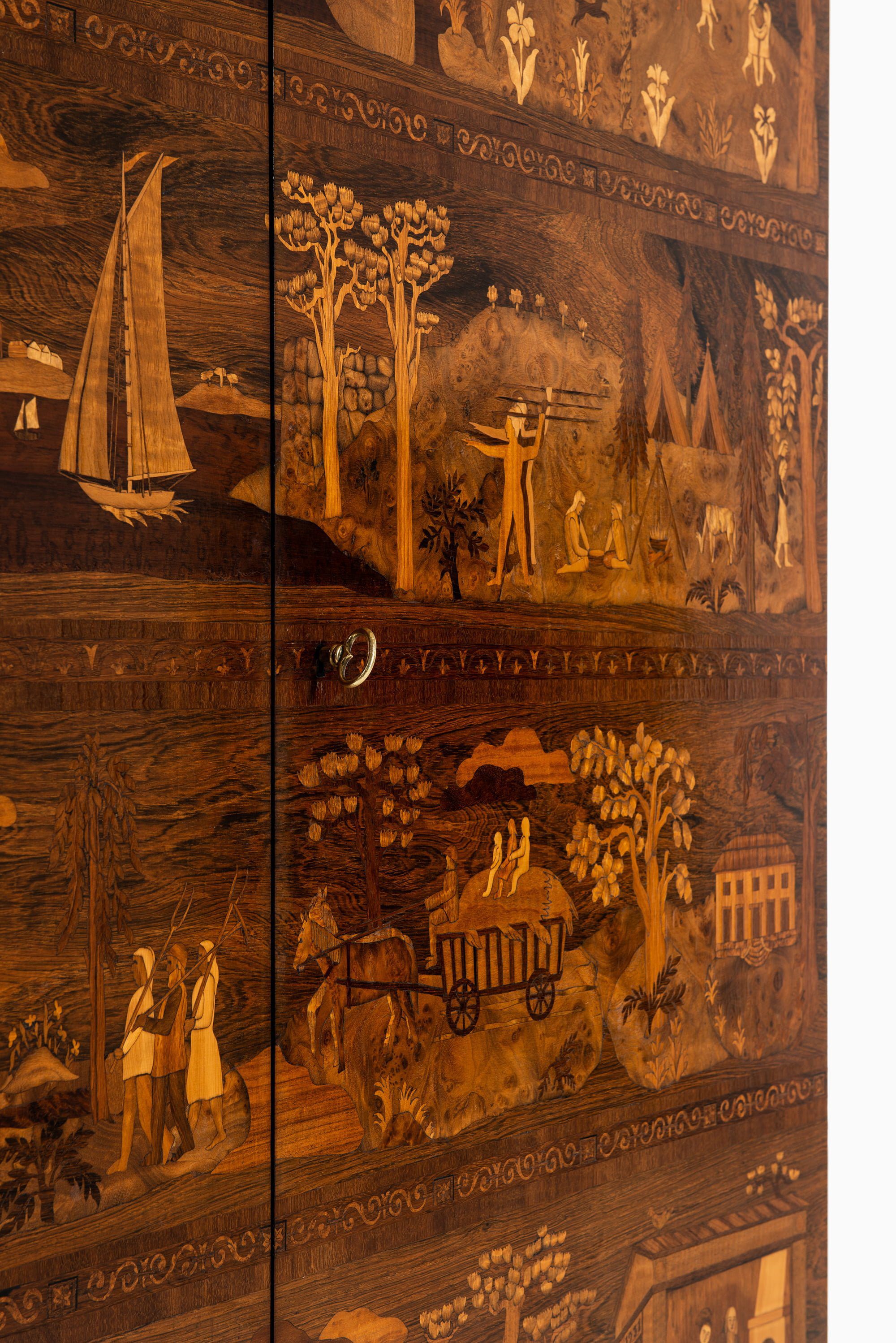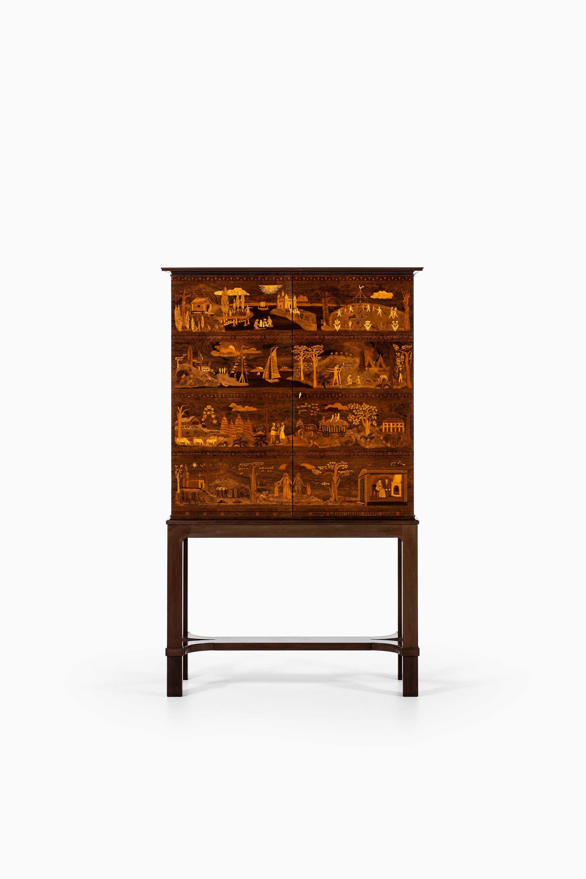A very rare and historically significant master cabinet titled “The Four Ages”, designed by Carl Malmsten and produced by David Blomberg in Sweden in 1931. This extraordinary piece stands as a testament to Malmsten’s lifelong dedication to Swedish craftsmanship, symbolism, and narrative design. Executed in richly figured rosewood, the cabinet is adorned with exceptional marquetry panels depicting allegorical scenes of life’s four stages — childhood, youth, adulthood, and old age — rendered with meticulous precision and artistic poetry.