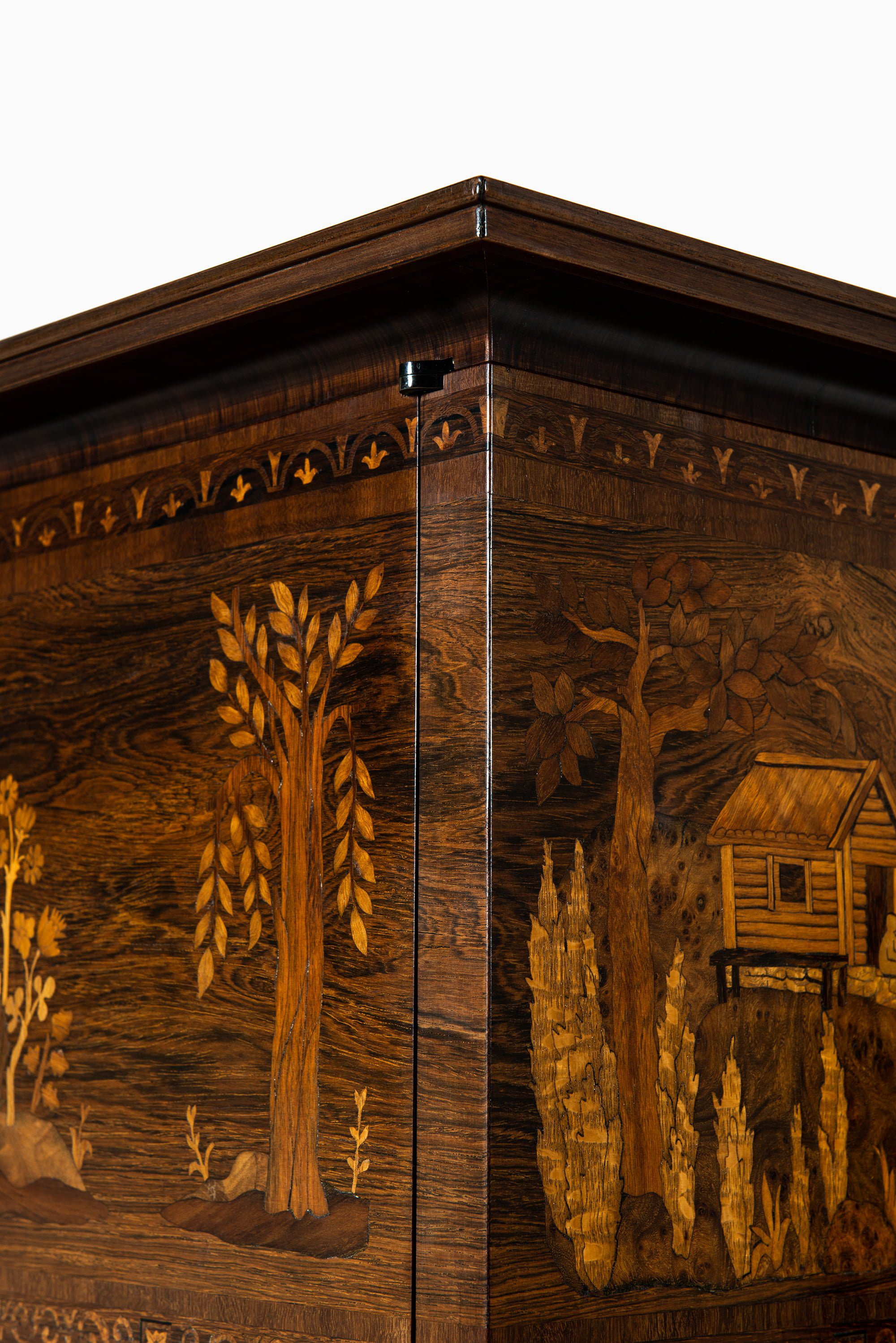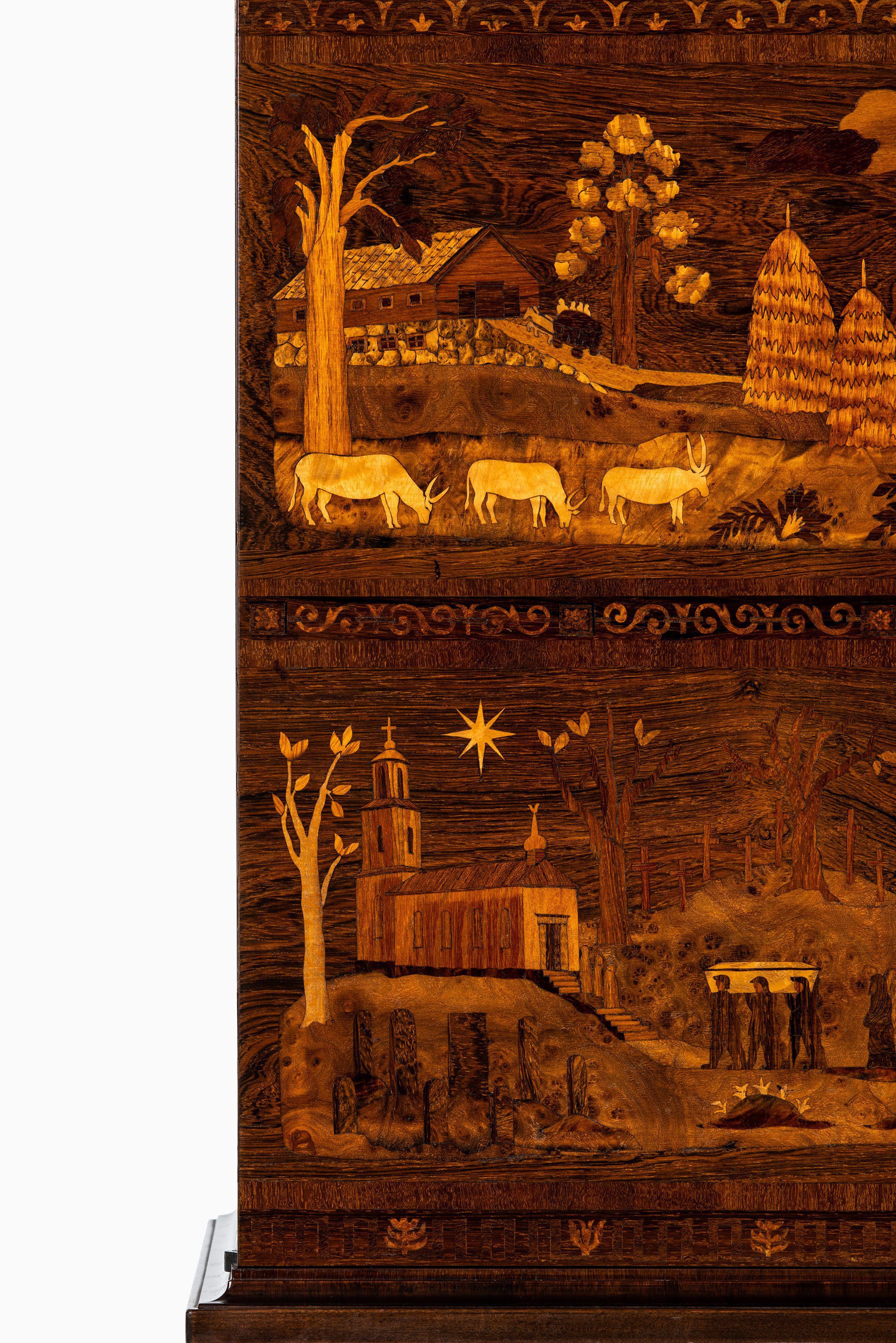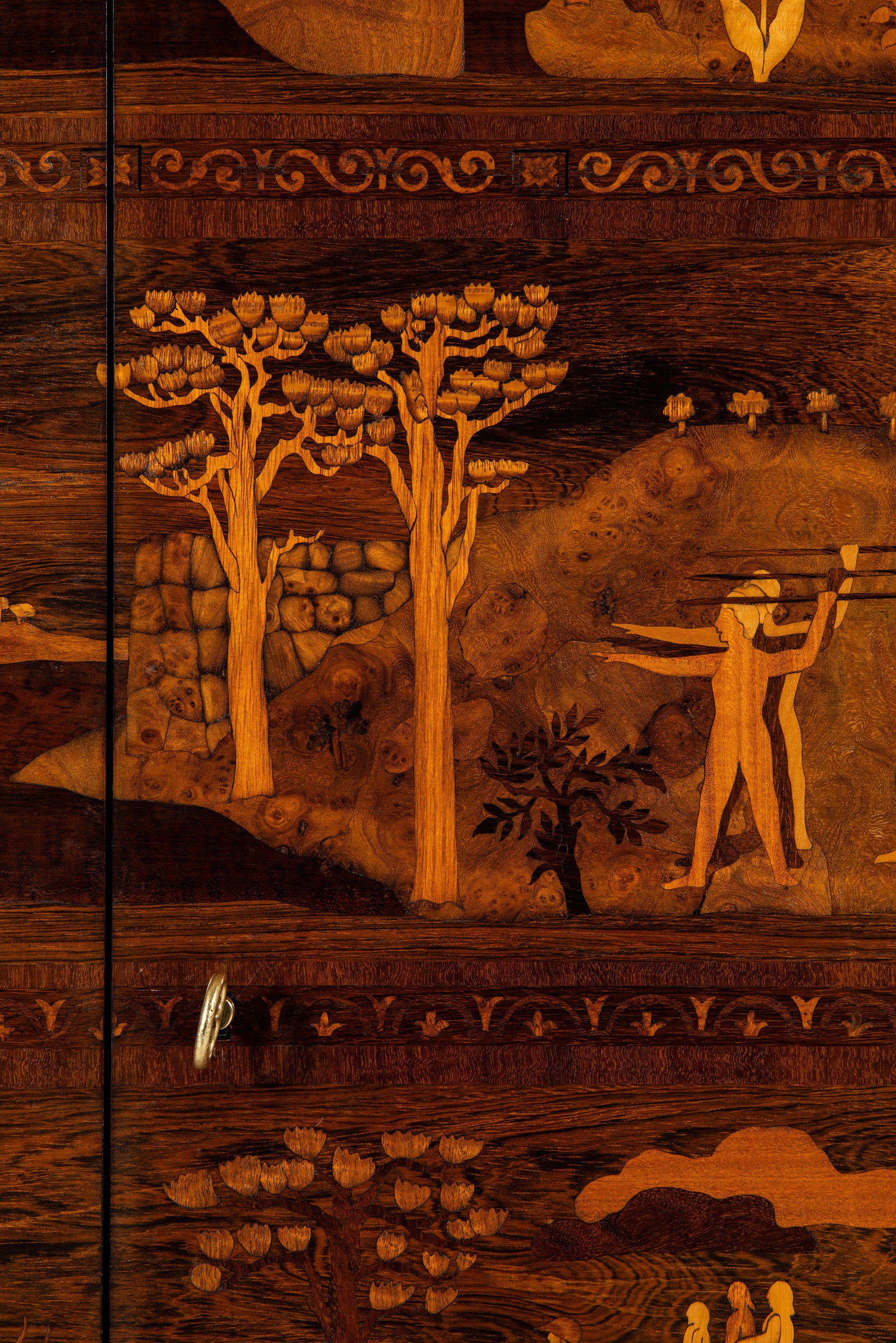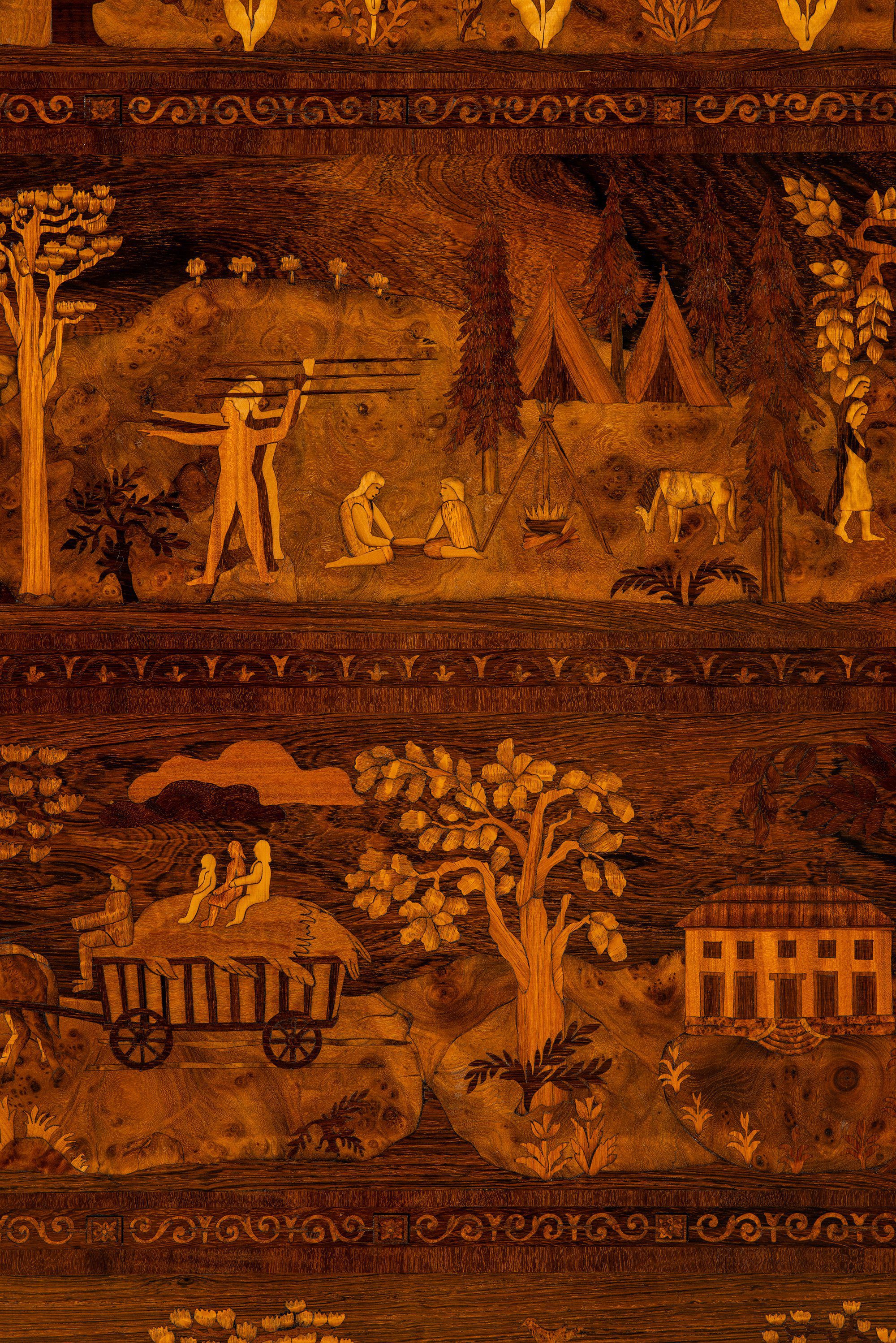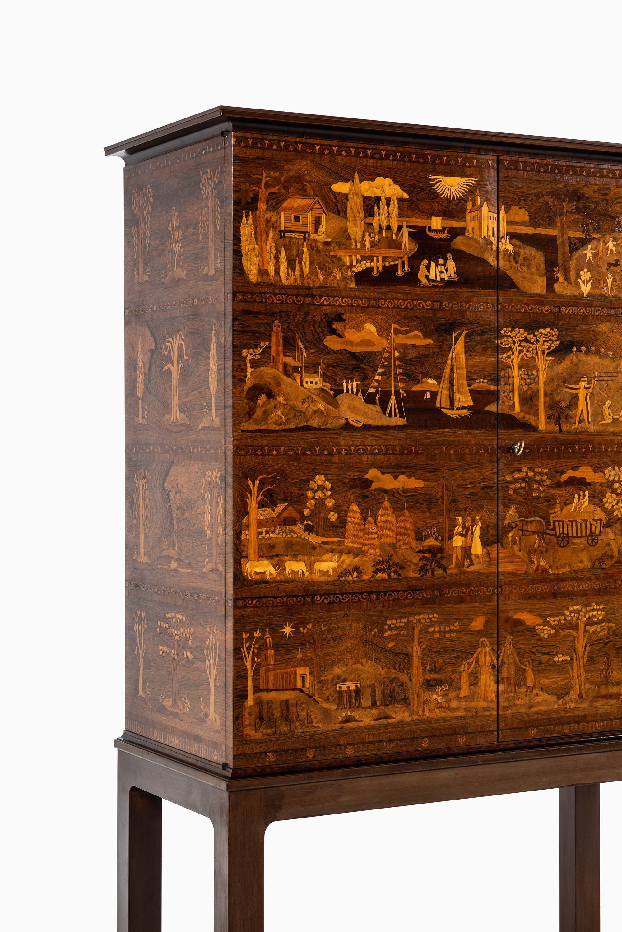 Each surface is inlaid with an intricate composition of landscapes, figures, and architecture, crafted from contrasting wood veneers in varying tones. The marquetry displays an extraordinary level of detail and depth, achieving a painterly quality through the use of wood grain, color, and texture. These scenes evoke both the pastoral serenity of Swedish life and the timeless philosophical reflections central to Malmsten’s oeuvre.