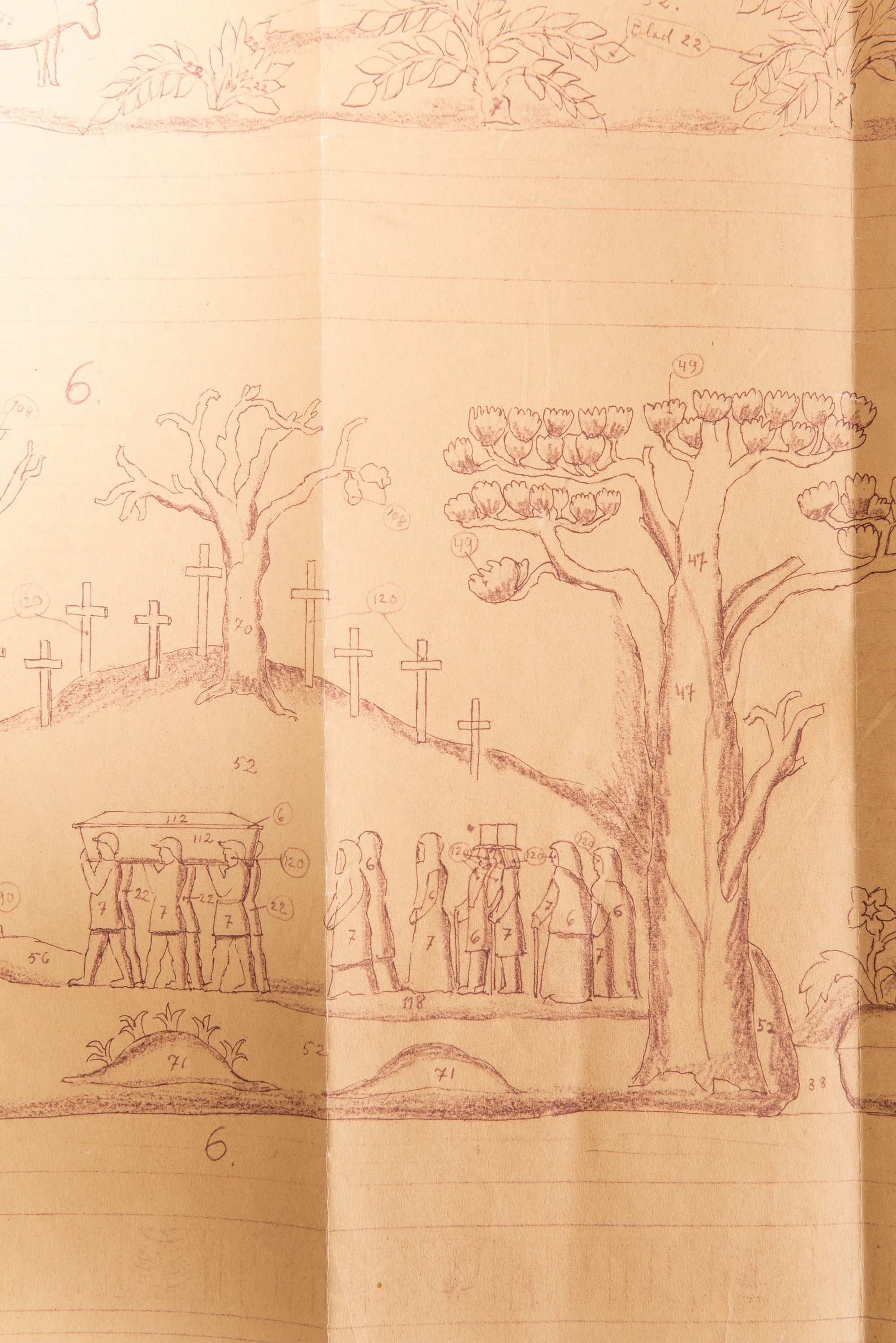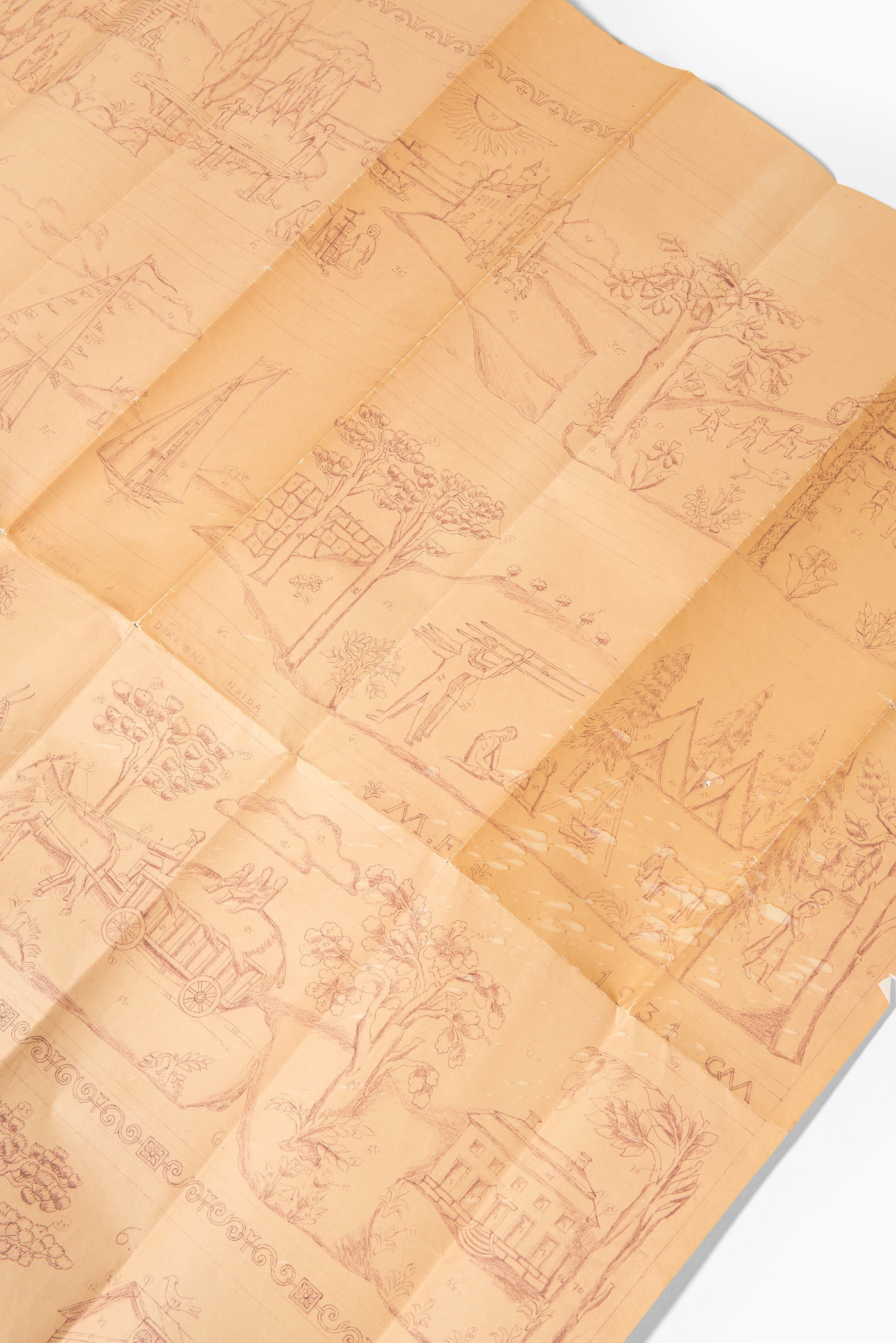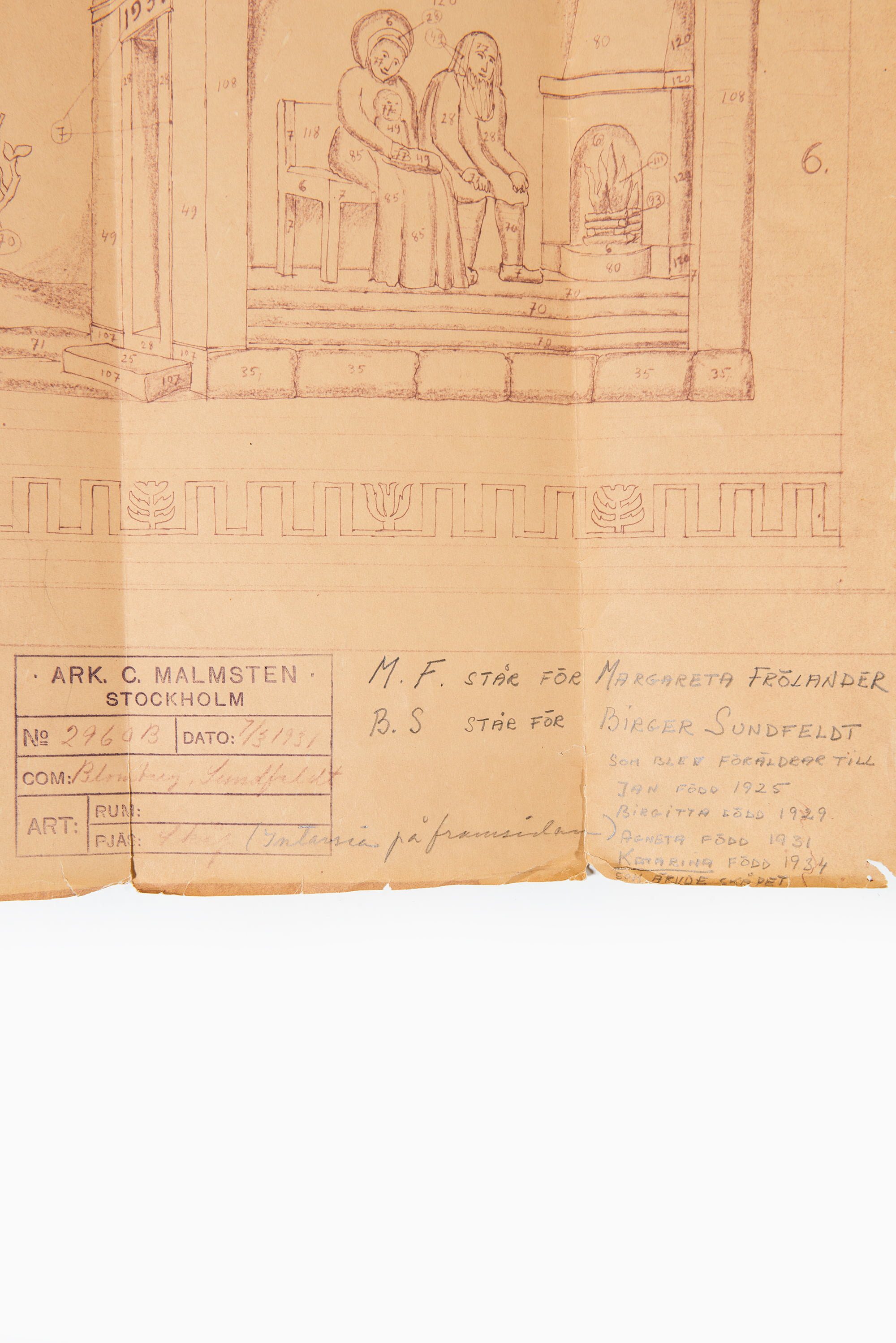 This piece is not only a rare collector’s item but also an important example of Swedish applied arts at its highest level—bridging fine furniture, storytelling, and craftsmanship. It remains in beautiful condition for its age, retaining its original drawings dated March 7, 1931, which accompany the piece and further attest to its provenance and historical significance.