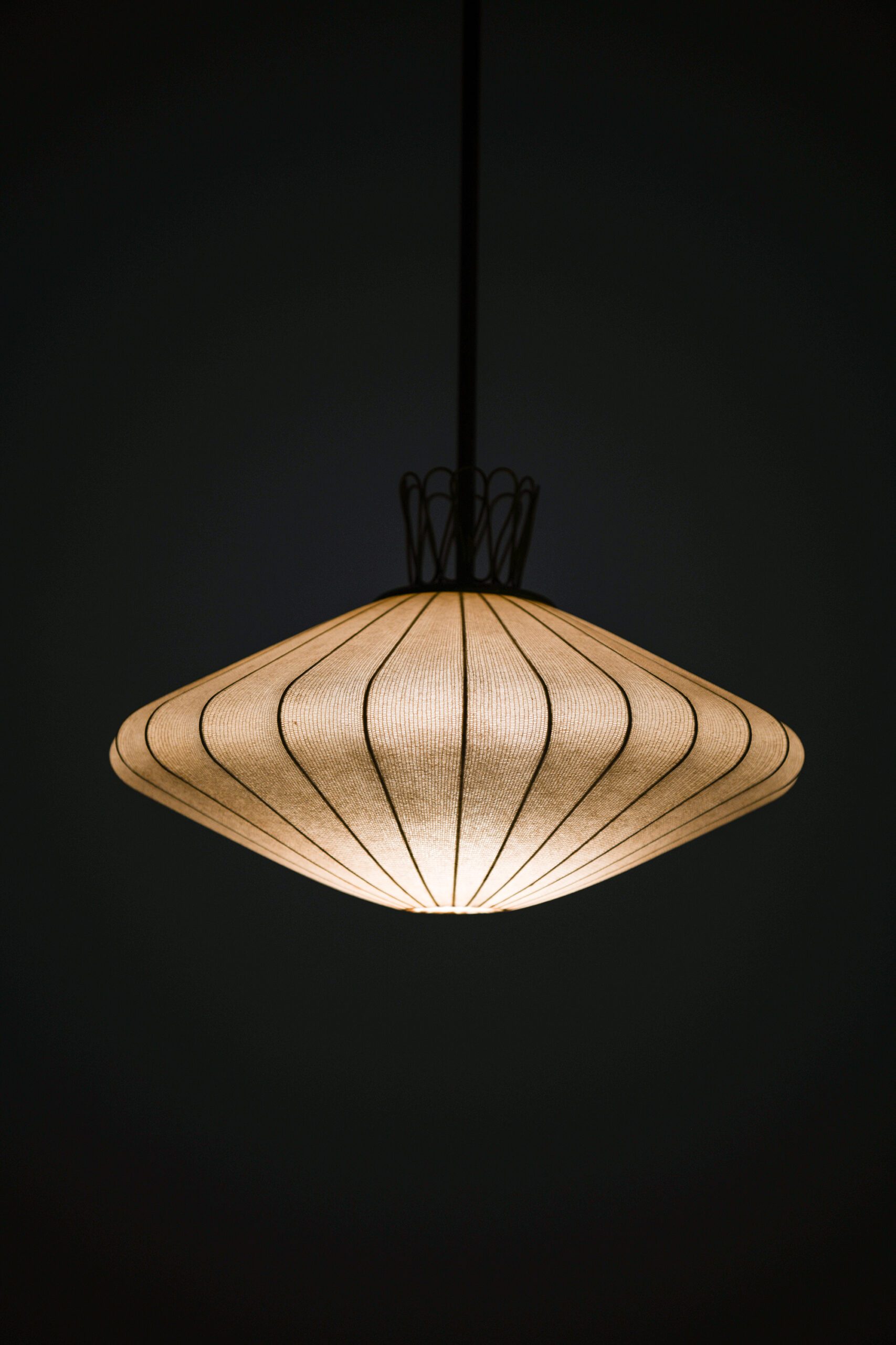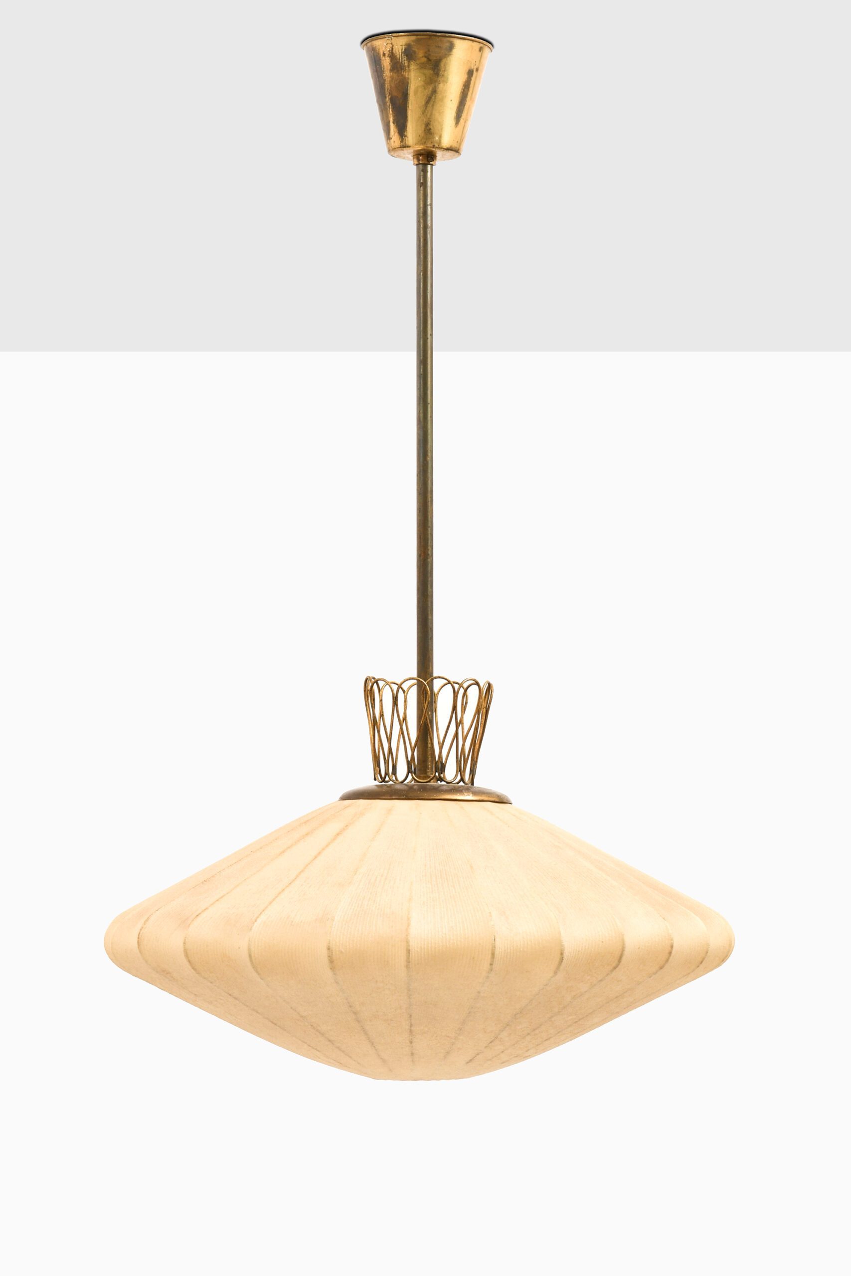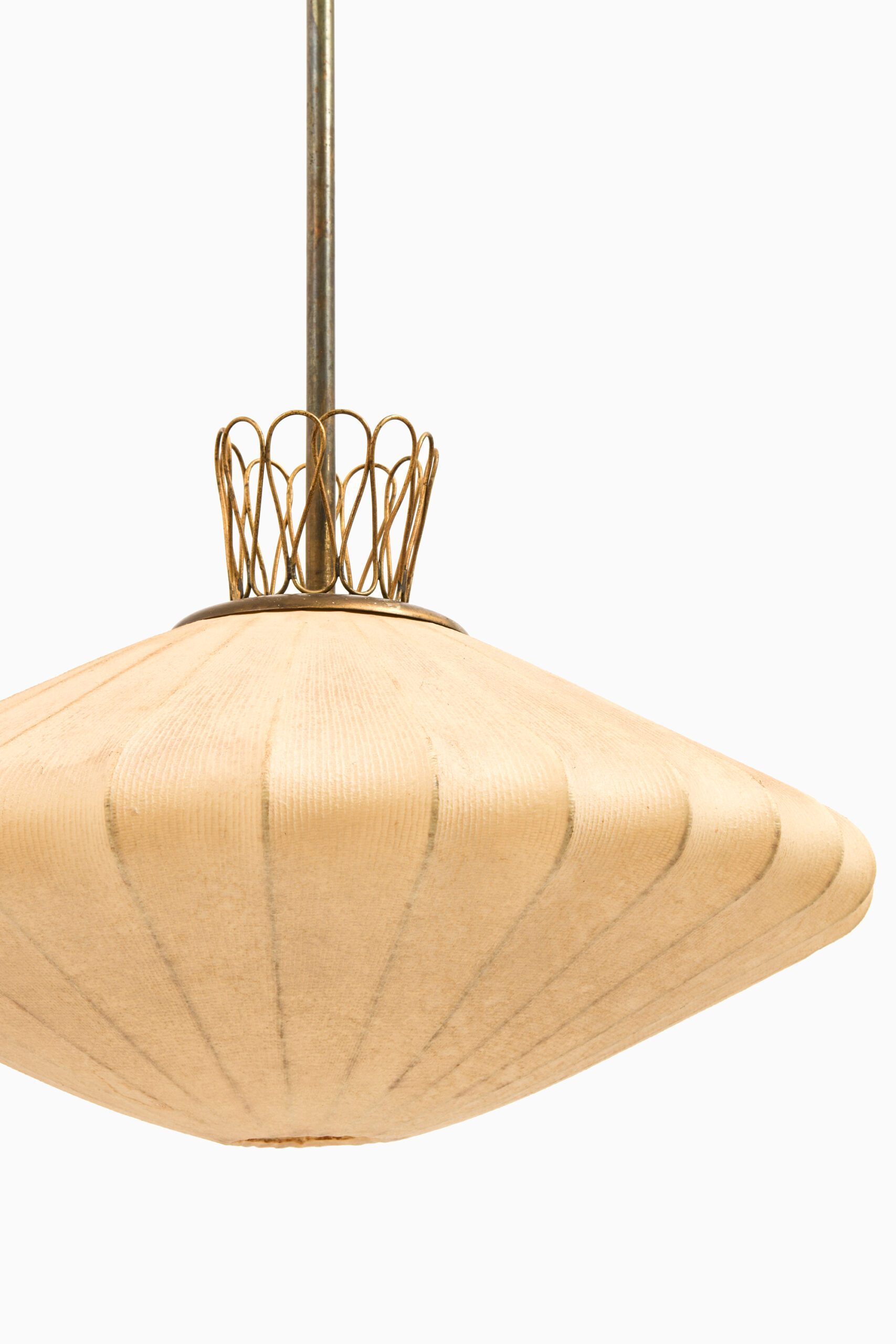 This rare ceiling lamp, likely produced in Sweden during the 1950s, is a fine example of mid-century Scandinavian design characterized by organic form and careful material selection. The lamp’s structure is composed of a brass suspension system, including a ceiling canopy and rod, which support a sculptural diffuser. The shade is crafted from a delicate translucent textile stretched over a wireframe, creating a symmetrical, slightly flattened lantern shape.