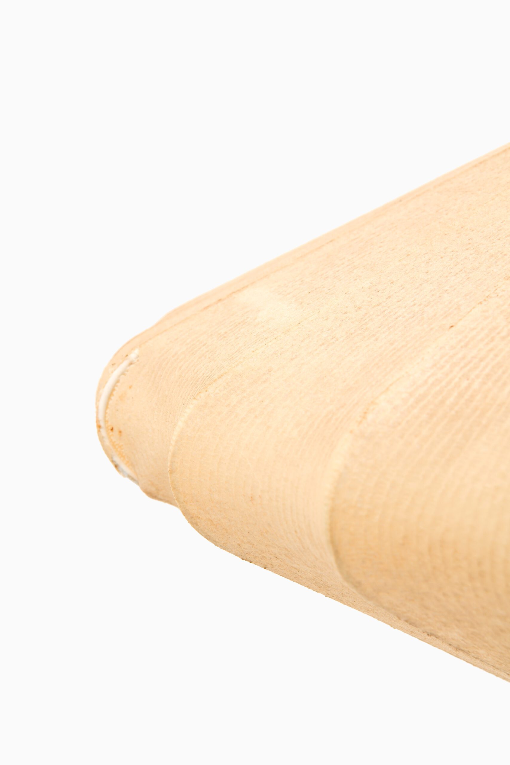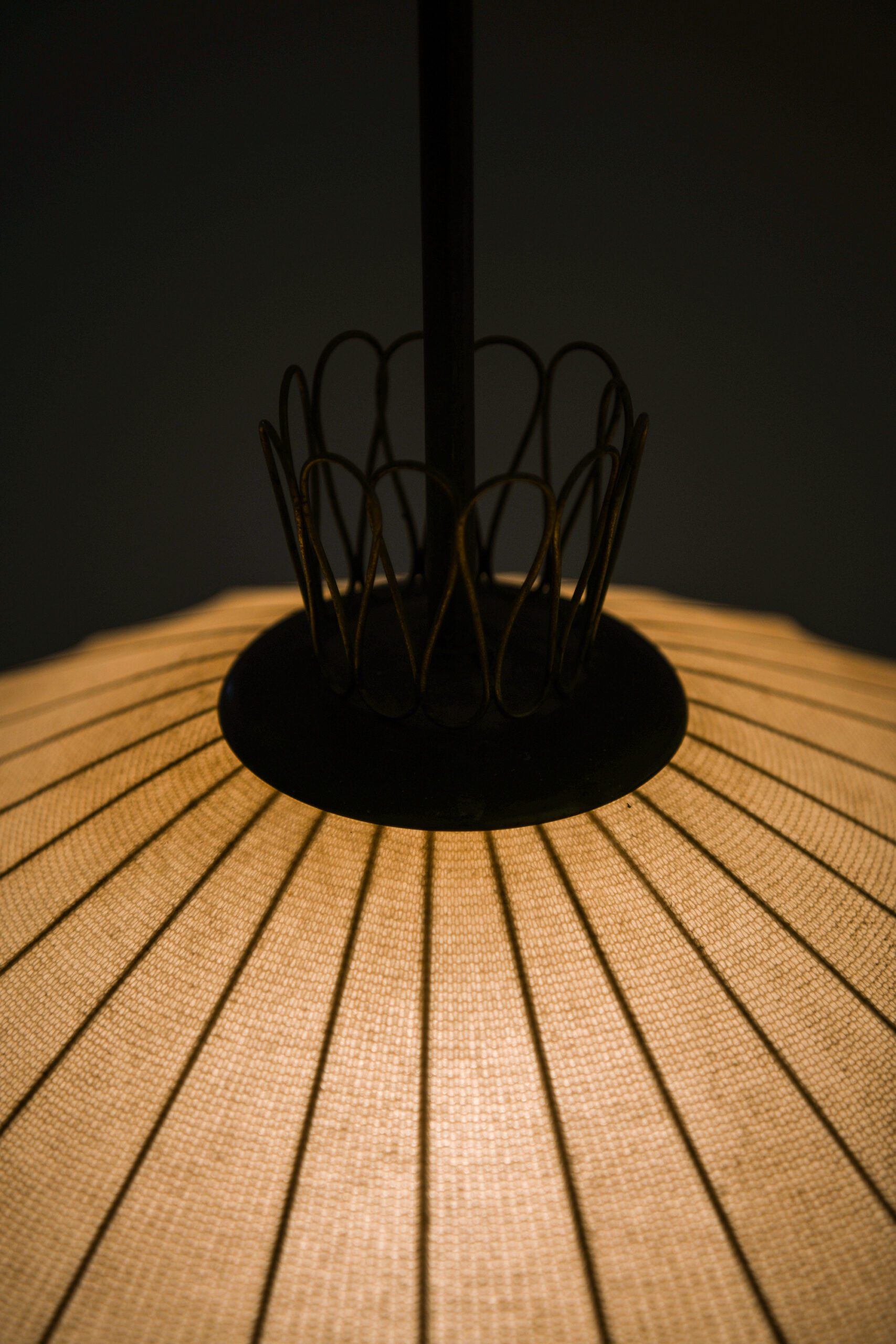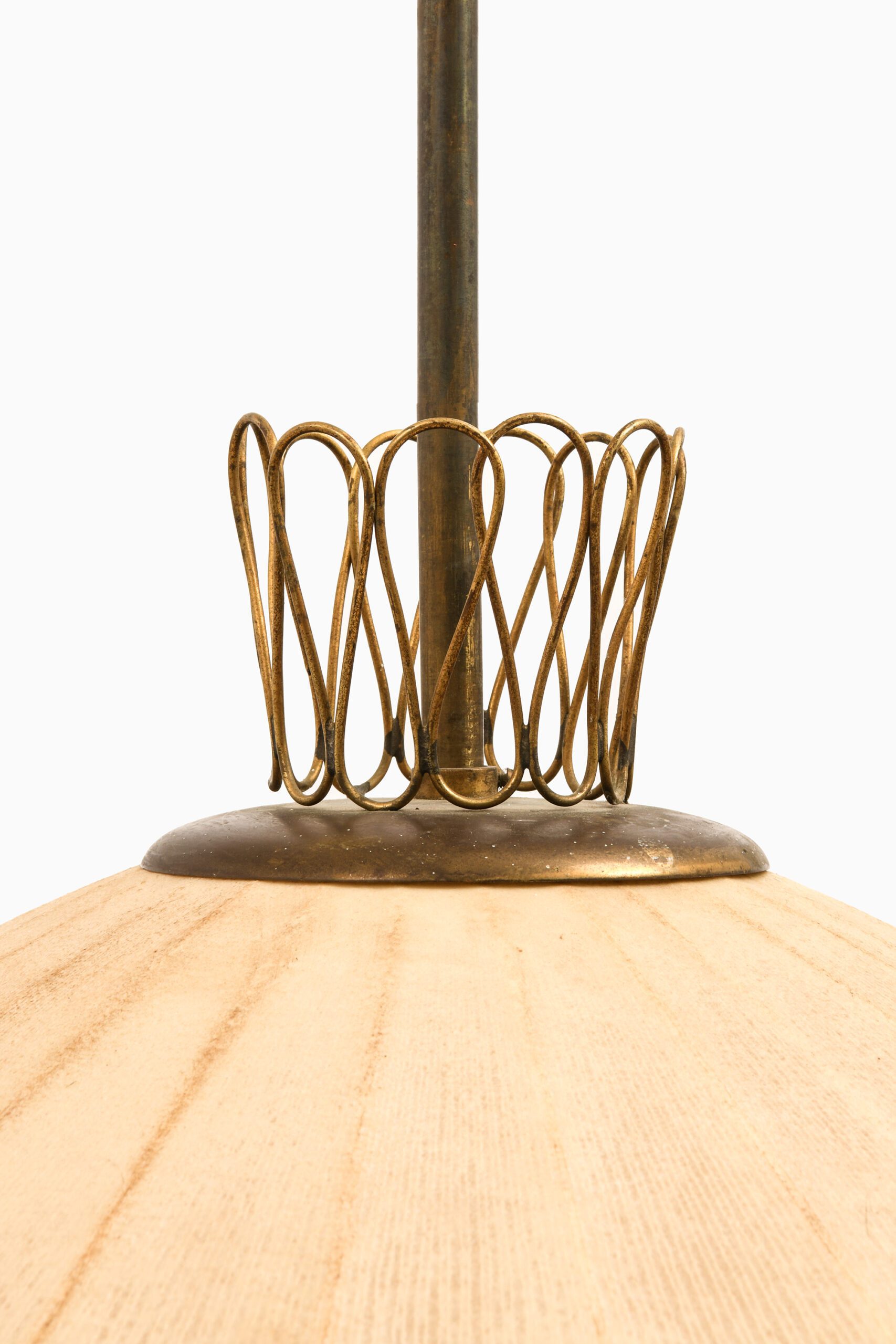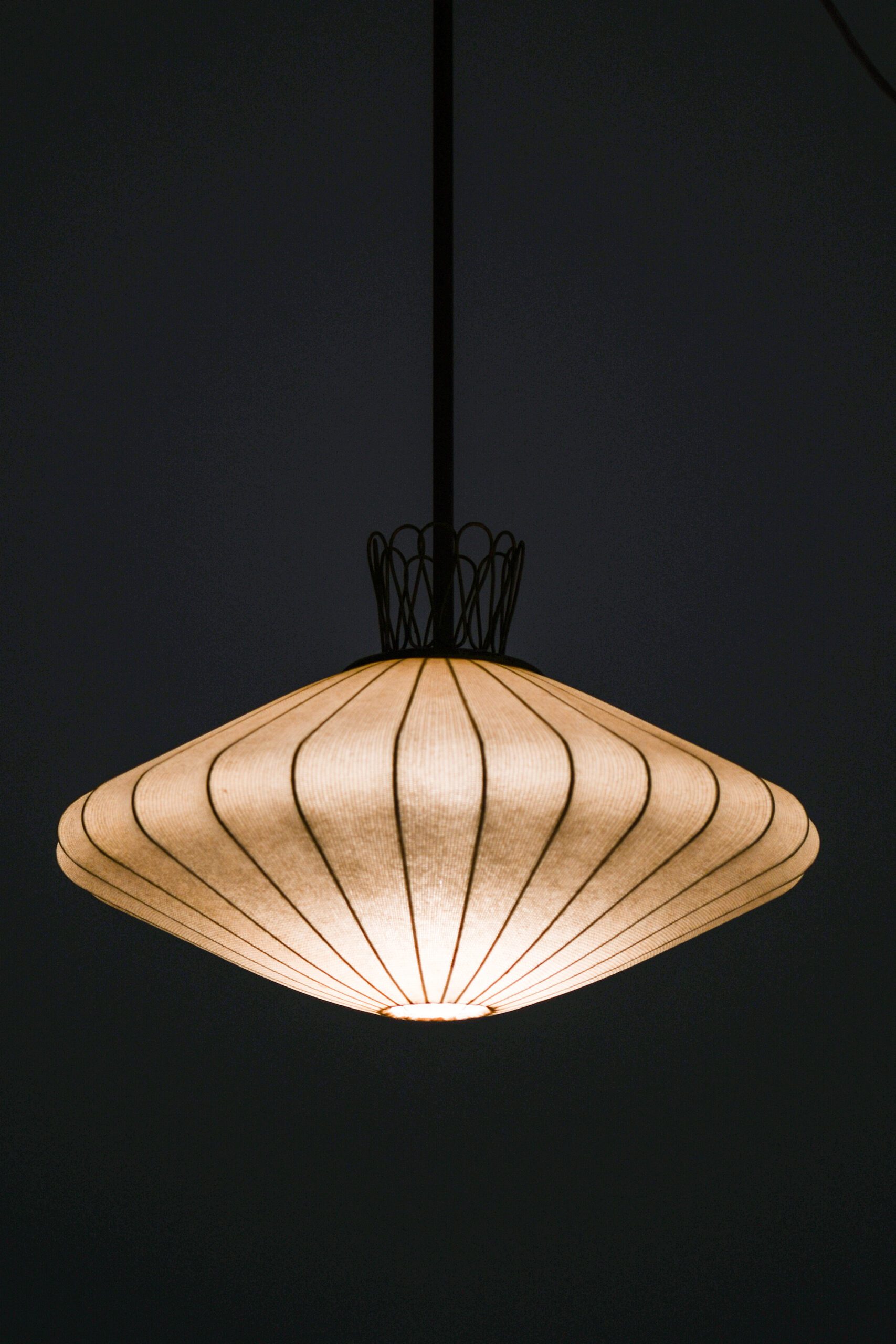 This rare ceiling lamp, likely produced in Sweden during the 1950s, is a fine example of mid-century Scandinavian design characterized by organic form and careful material selection. The lamp’s structure is composed of a brass suspension system, including a ceiling canopy and rod, which support a sculptural diffuser. The shade is crafted from a delicate translucent textile stretched over a wireframe, creating a symmetrical, slightly flattened lantern shape.