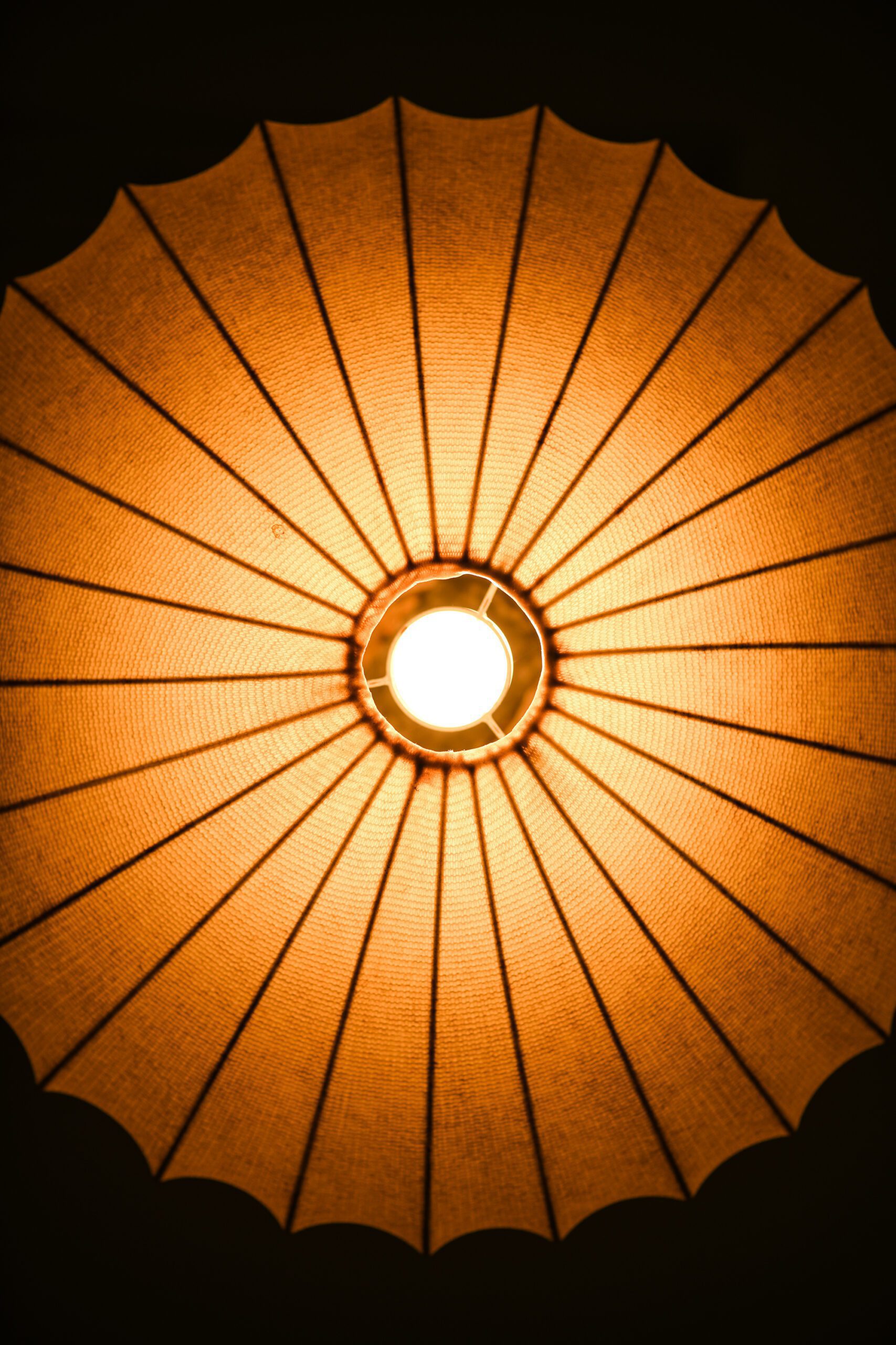 The brass fittings show a natural patina consistent with age, notably featuring a decorative crown-like detail near the upper section of the shade, adding subtle elegance to the design. The fabric shade has subtle vertical ribbing that diffuses light warmly and evenly, casting a soft glow throughout the space. Inside, the light source sits centrally, with an internal frame holding the pleated fabric in a precise, radial geometric pattern.