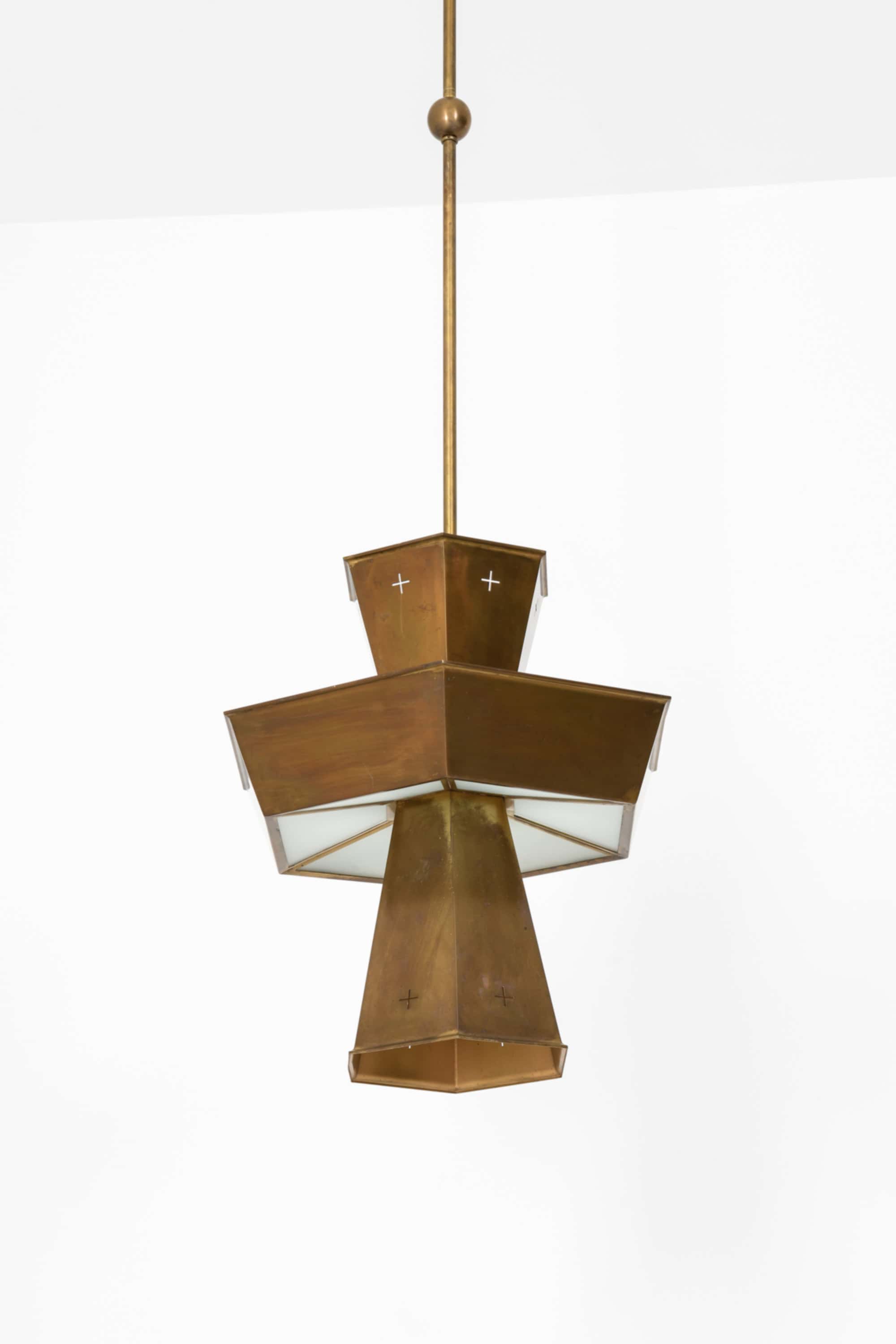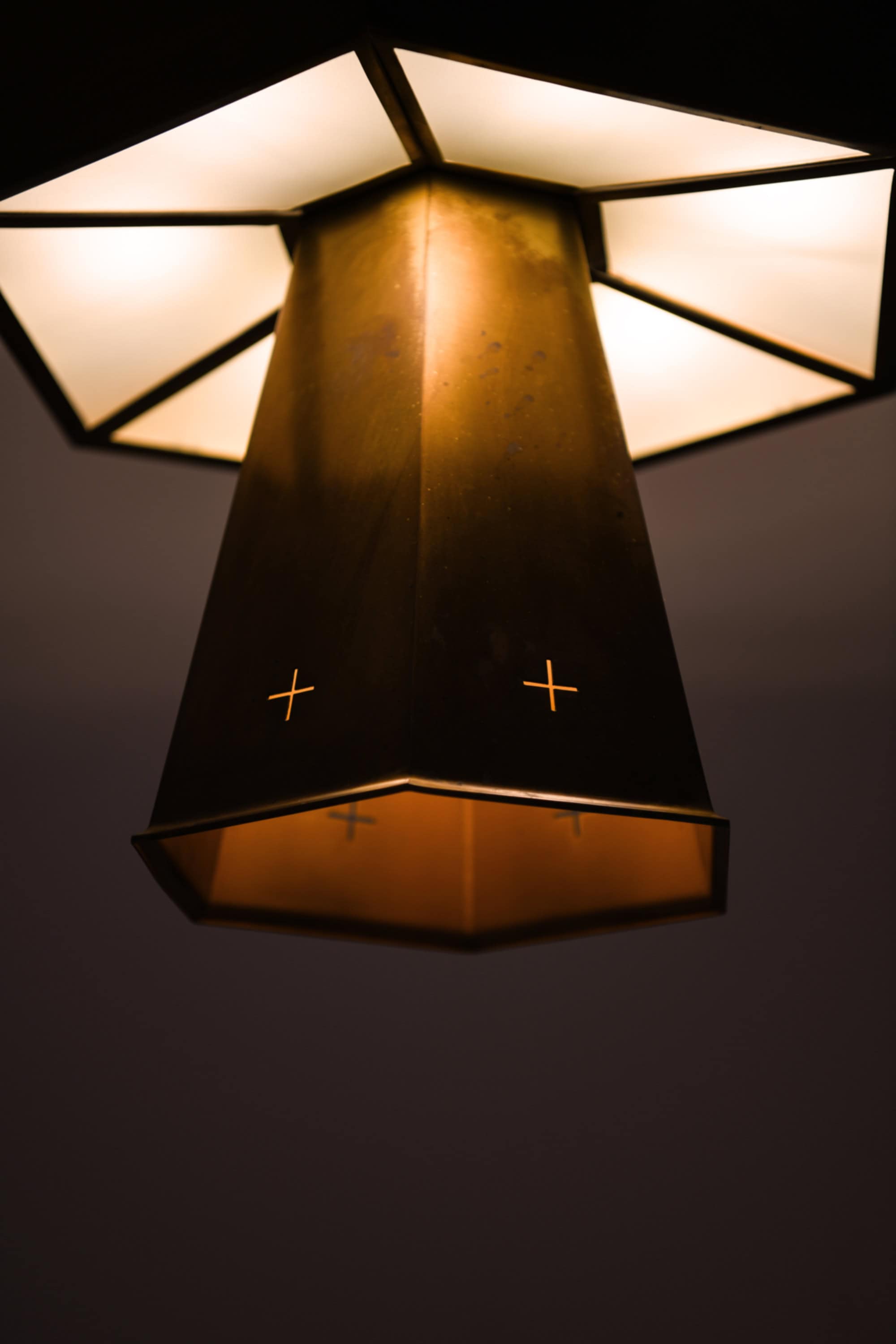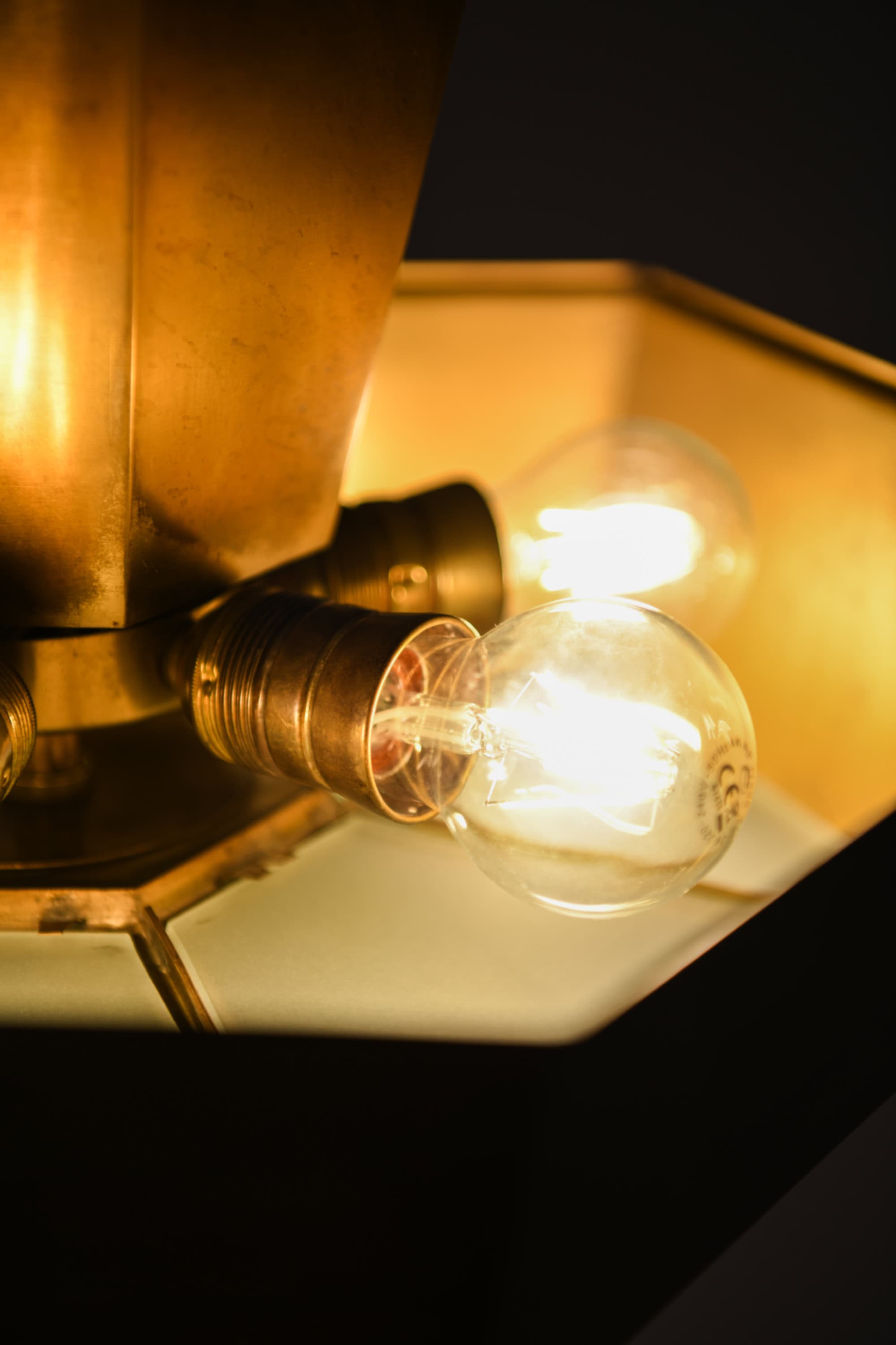This rare pair of ceiling lamps was produced in Sweden during the 1950s. The lamps are constructed from solid brass with frosted glass diffusers and feature ten internal light sources arranged in a circular configuration. Each lamp has a sculptural, hexagonal form composed of two opposing tapered sections that create a cross-like silhouette, an architectural design characteristic of Swedish modern lighting from the mid-twentieth century.