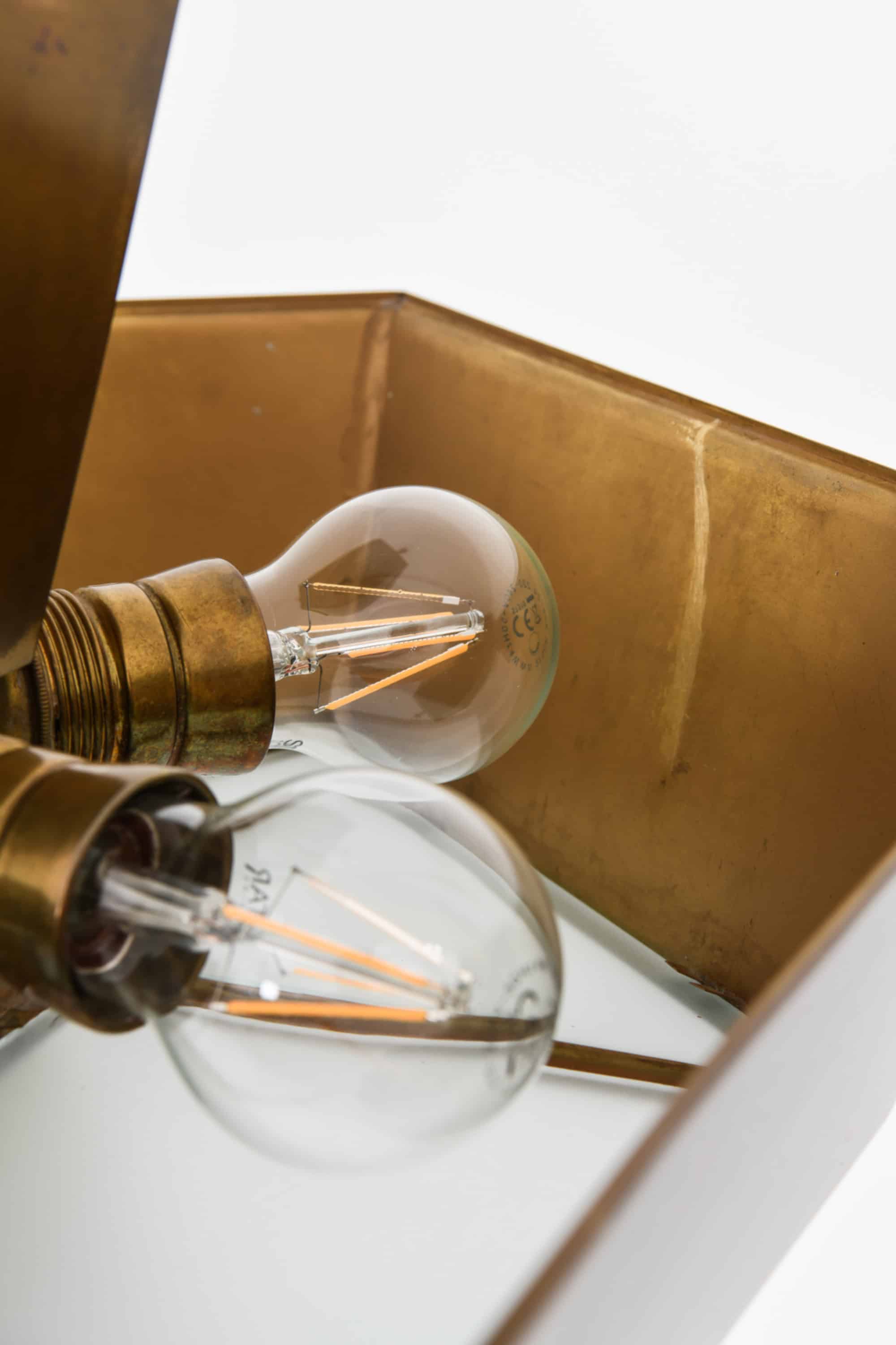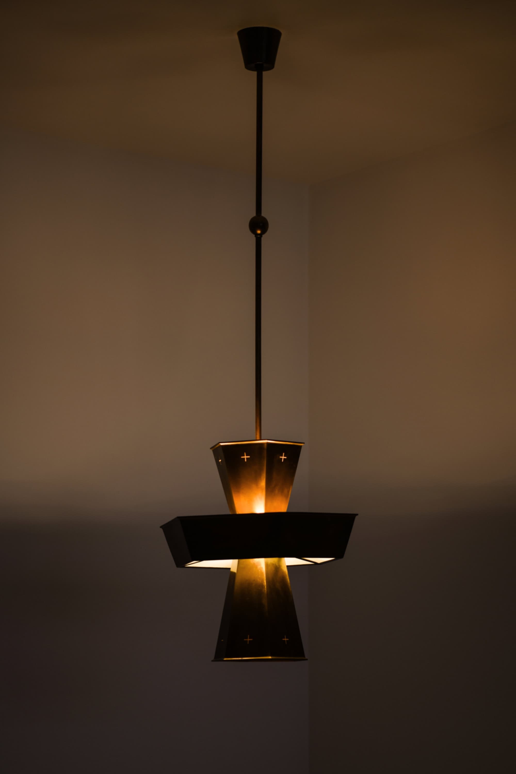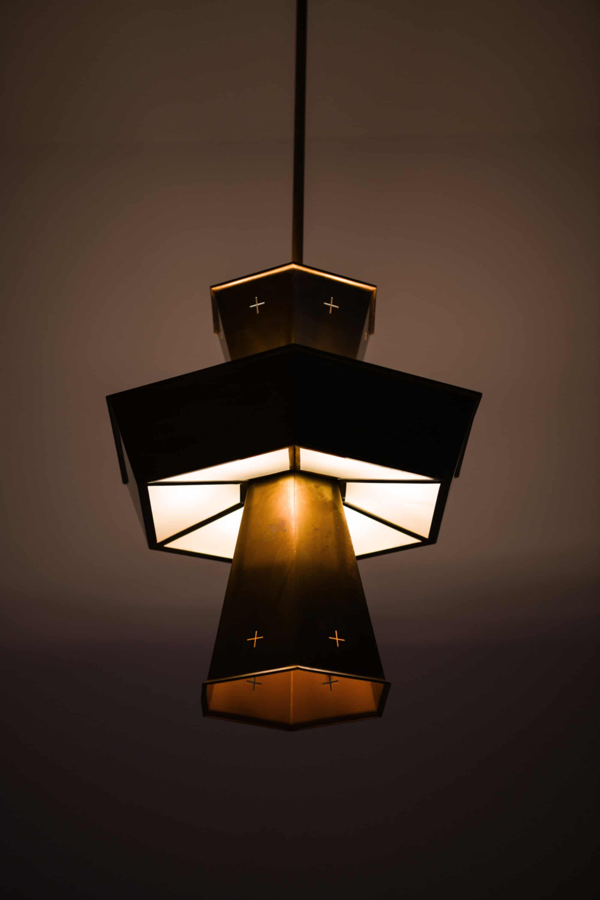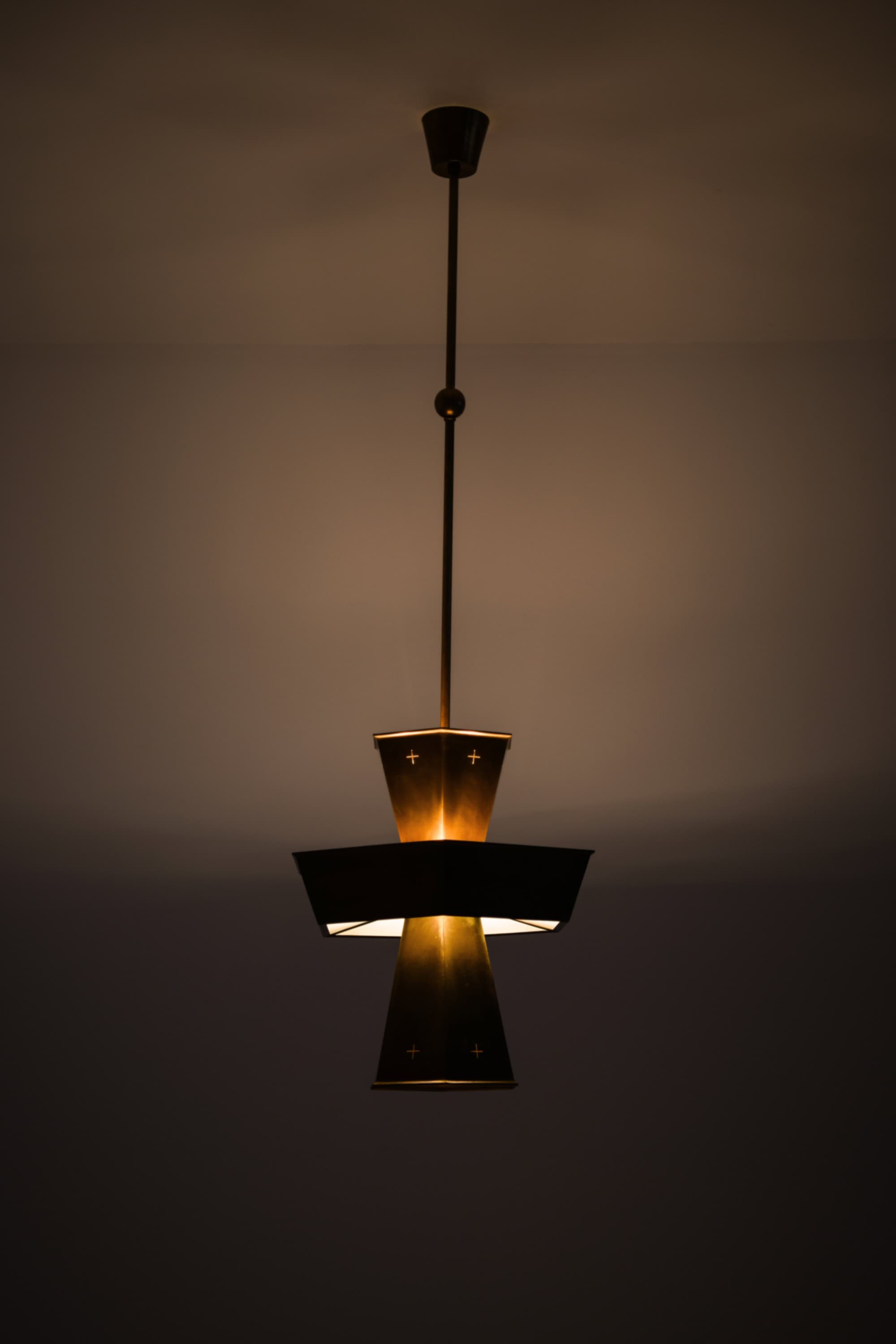 This rare pair of ceiling lamps was produced in Sweden during the 1950s. The lamps are constructed from solid brass with frosted glass diffusers and feature ten internal light sources arranged in a circular configuration. Each lamp has a sculptural, hexagonal form composed of two opposing tapered sections that create a cross-like silhouette, an architectural design characteristic of Swedish modern lighting from the mid-twentieth century.