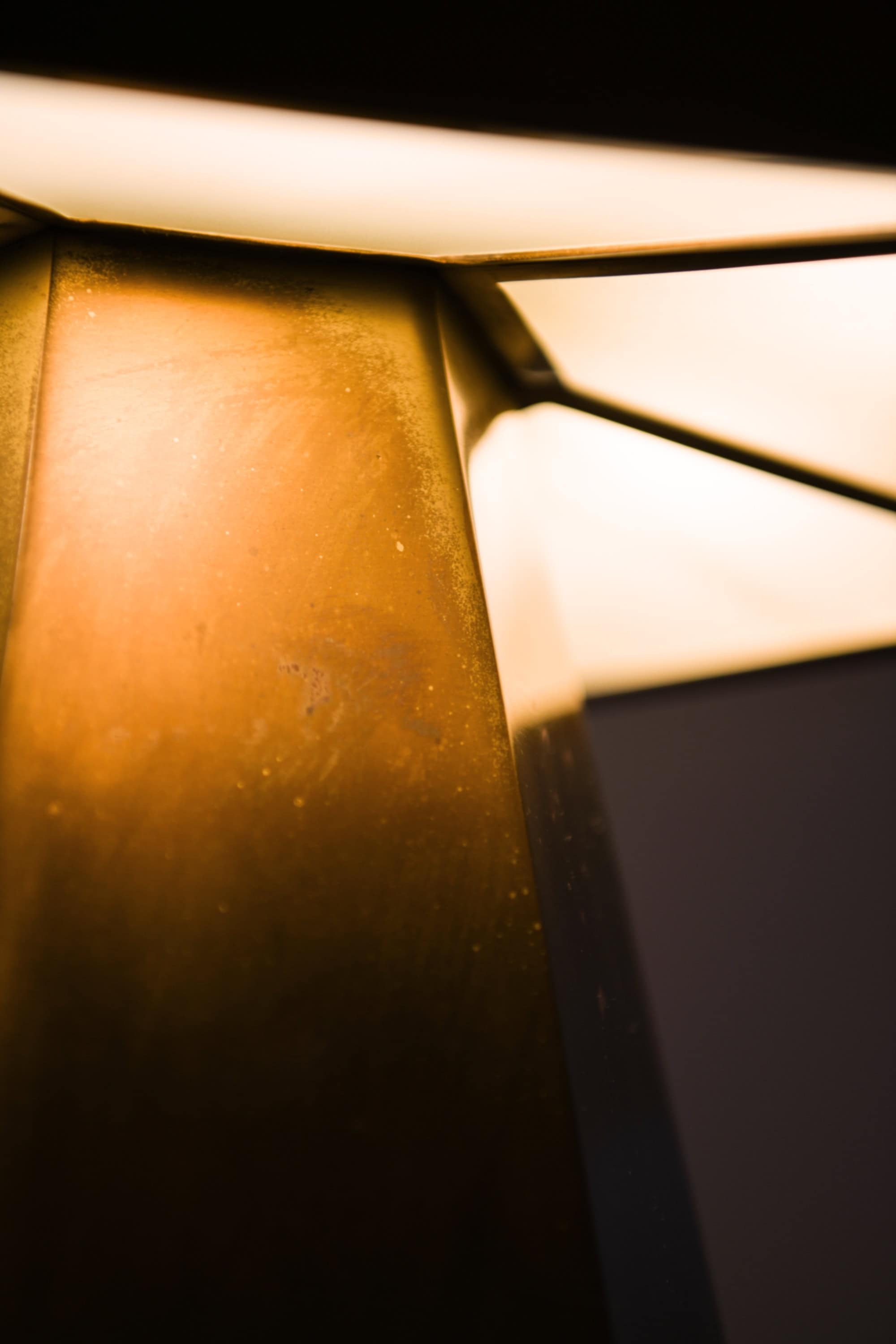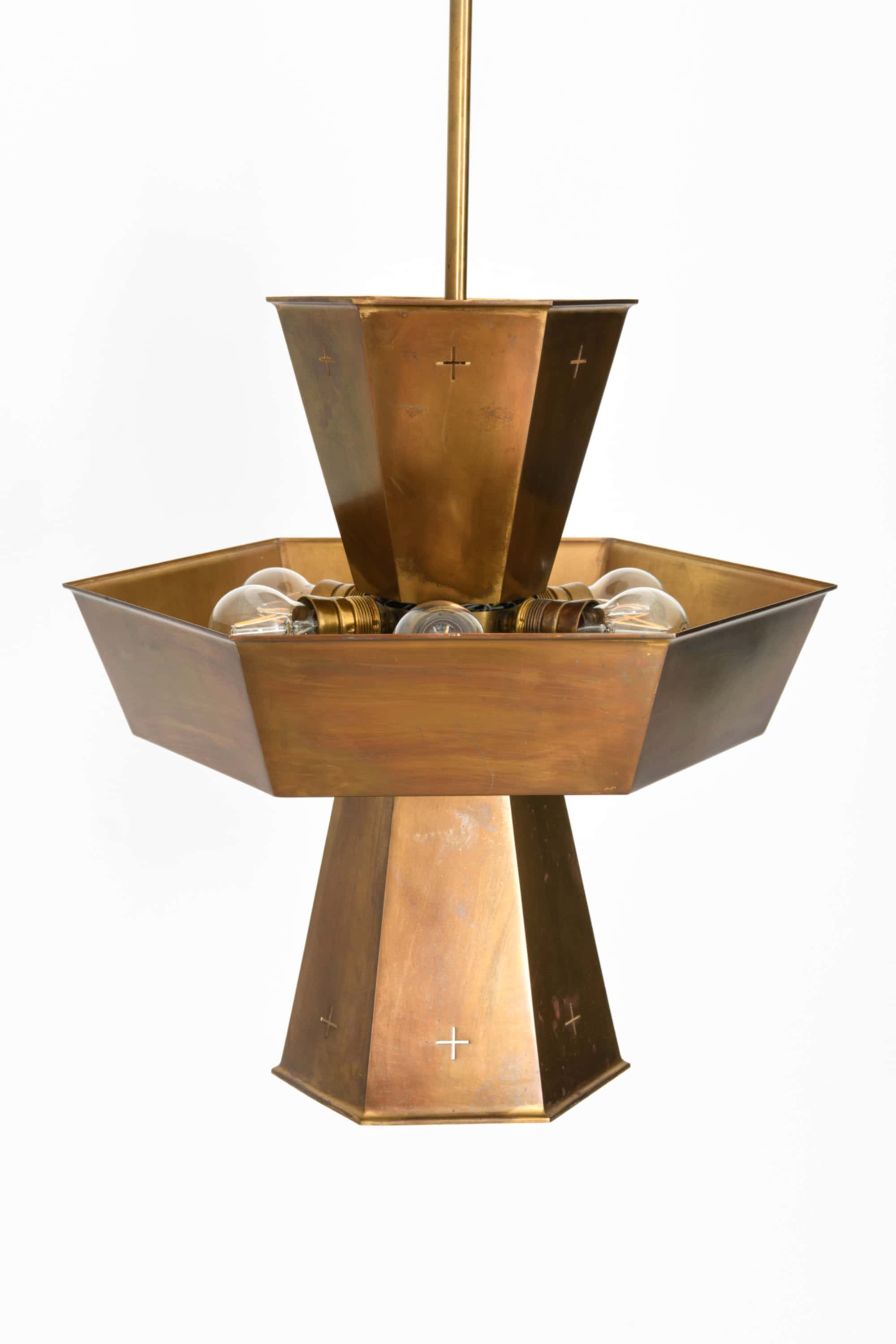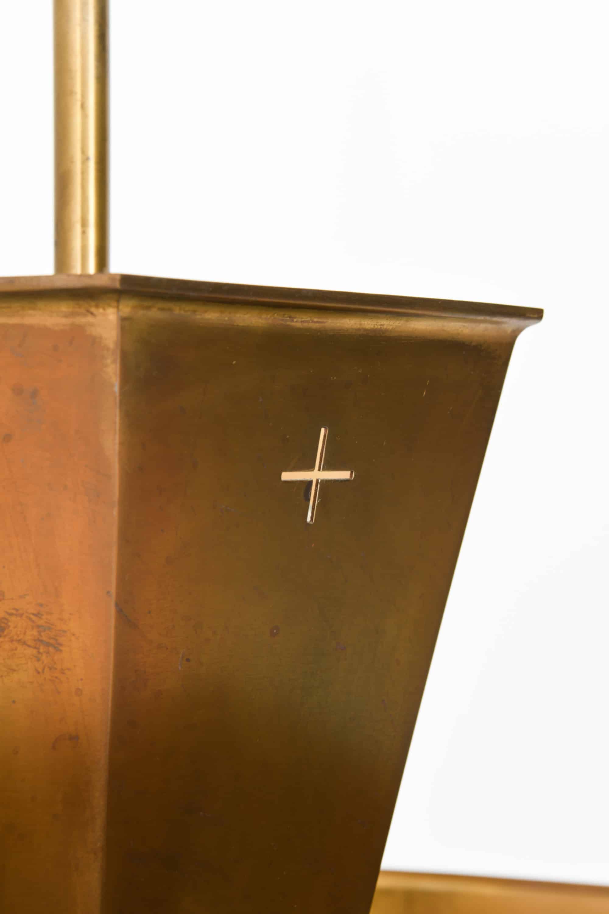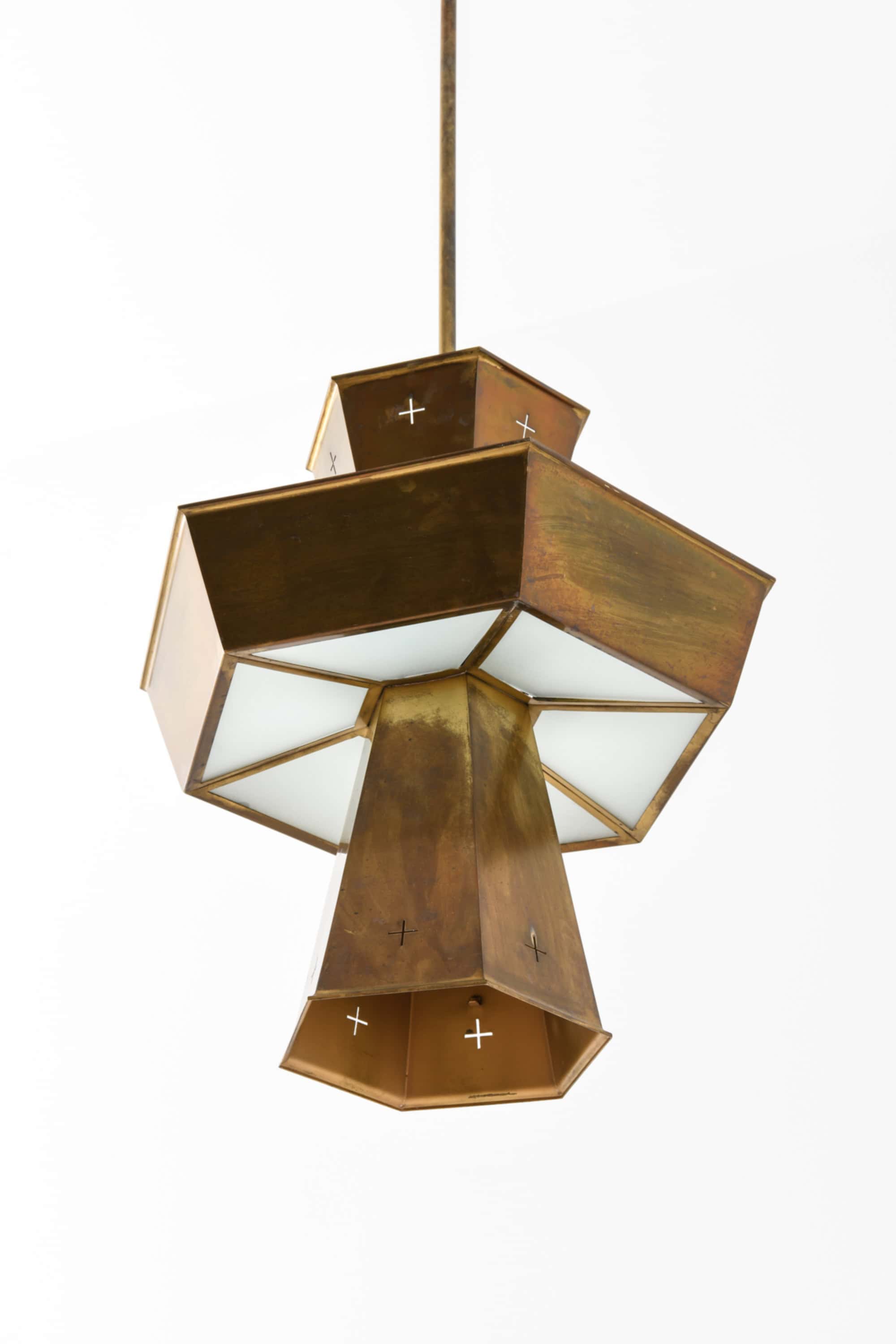 The brass surfaces exhibit a naturally aged patina with warm tonal variations, enhancing the material’s depth and character. Small perforated cross motifs are distributed evenly across the exterior panels, allowing subtle points of light to escape and creating a refined decorative effect. The frosted glass diffusers soften the illumination, producing an even, ambient glow both upward and downward. The design achieves a balance between functional clarity and sculptural presence, suitable for both domestic and public interiors.