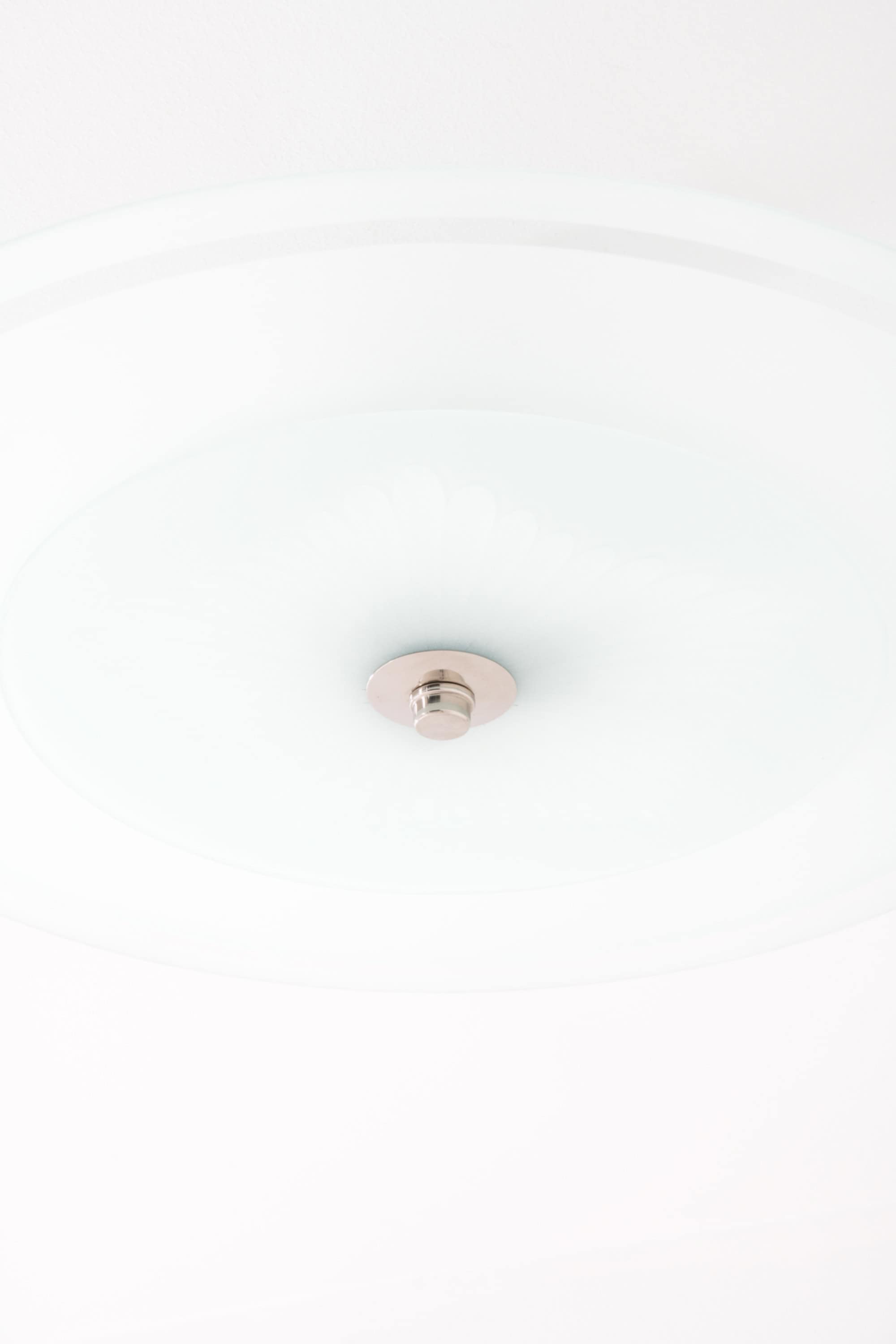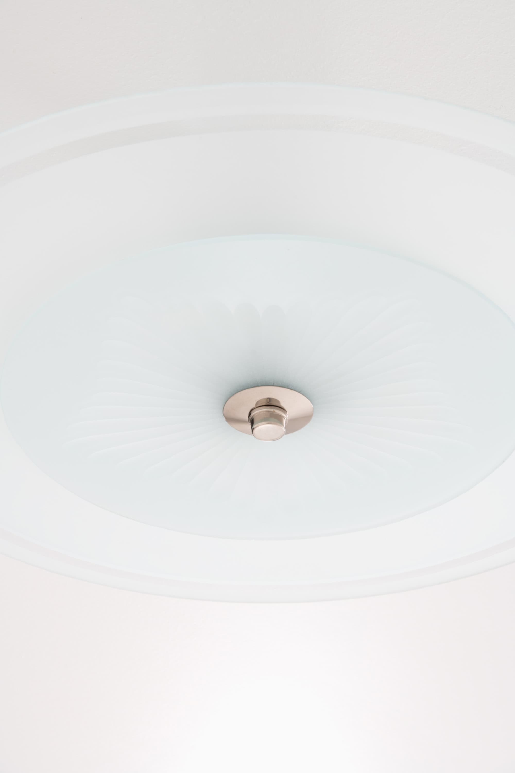 Each lamp is constructed with a nickel plated metal ceiling cup and central fitting, paired with a substantial glass diffuser. The metal components have a clean, understated geometry typical of the period, emphasizing function and proportion rather than ornament. The glass is thick and precisely formed, with subtle concentric rings that contribute both to the visual depth and to the controlled diffusion of light.
