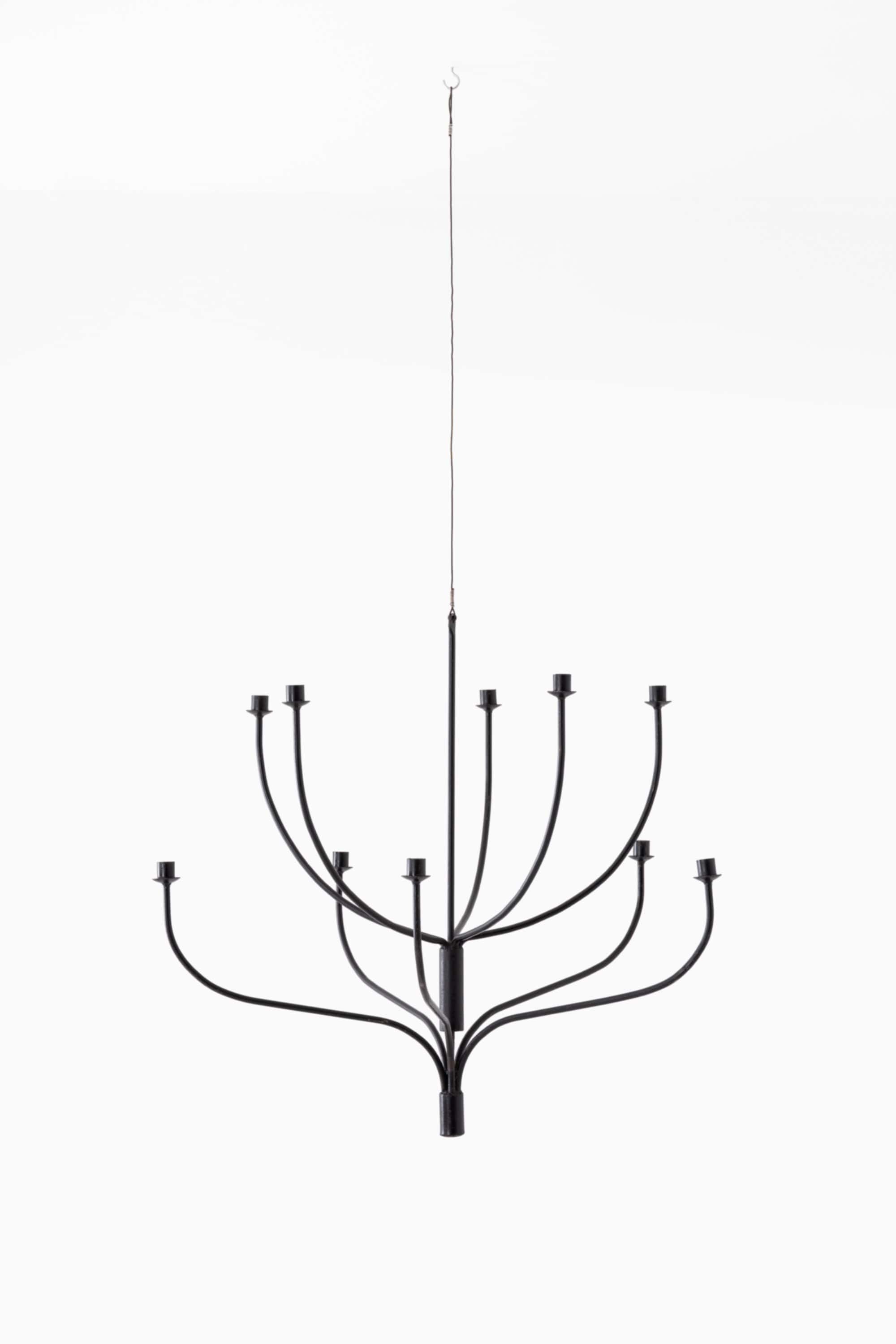 The chandelier is constructed around a central vertical stem from which multiple softly curved arms extend on two levels. The lower tier projects outward in wide, sweeping lines, while the upper tier rises more vertically before gently curving, creating a balanced and architectural silhouette. Each arm terminates in a cylindrical candle holder with an integrated drip tray, designed for crown candles. The repetition of these elements forms a rhythmic composition, almost reminiscent of branching foliage, giving the piece an organic yet structured character.