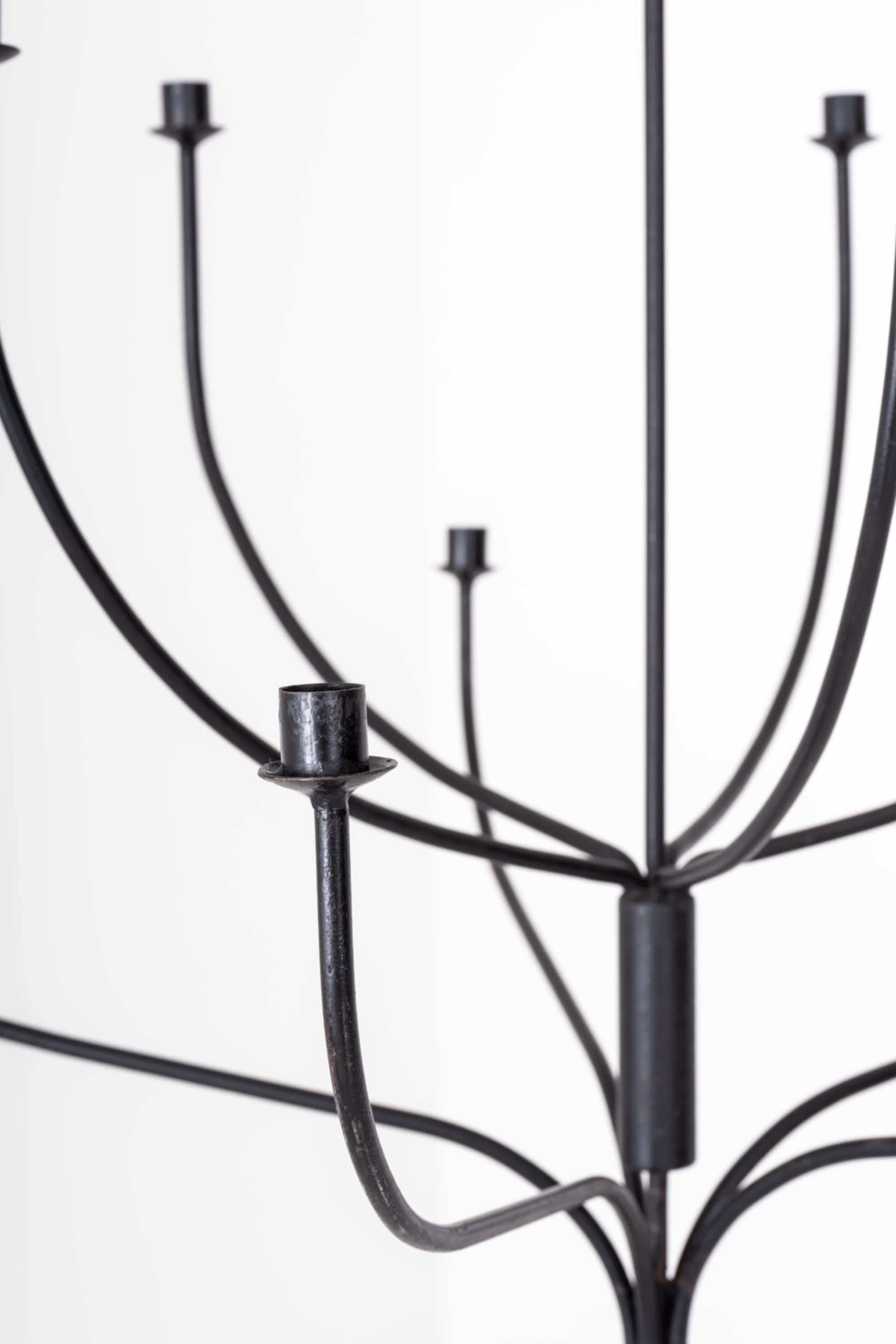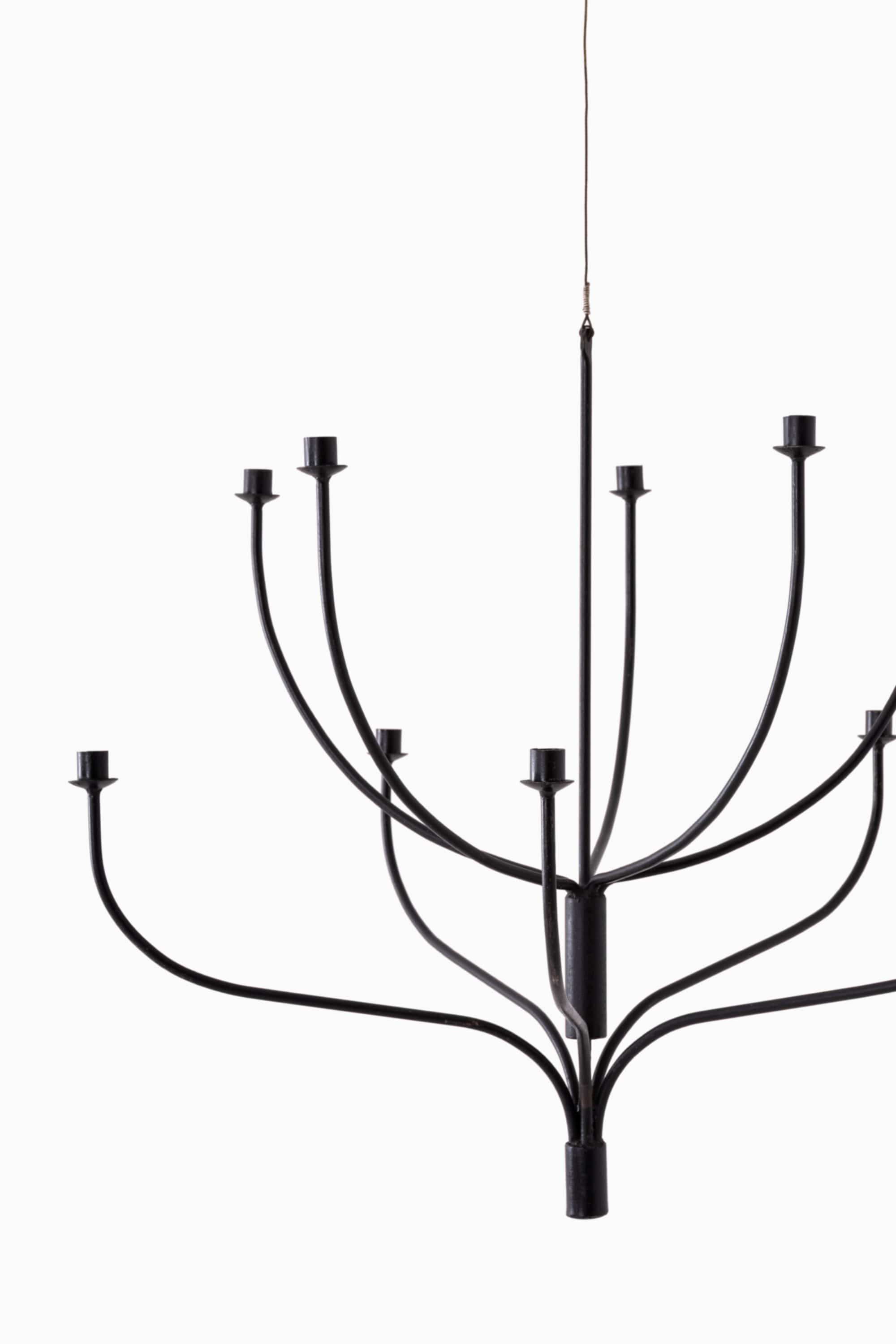 Executed in black wrought iron, the surface has a subtle texture that reveals its artisanal origin. The restrained finish and clean lines align with Swedish functionalist ideals, while the forged construction connects to older Nordic ironworking traditions. The chandelier works equally well in rustic interiors, country houses, and more minimal contemporary spaces where its graphic form can stand out against light walls.