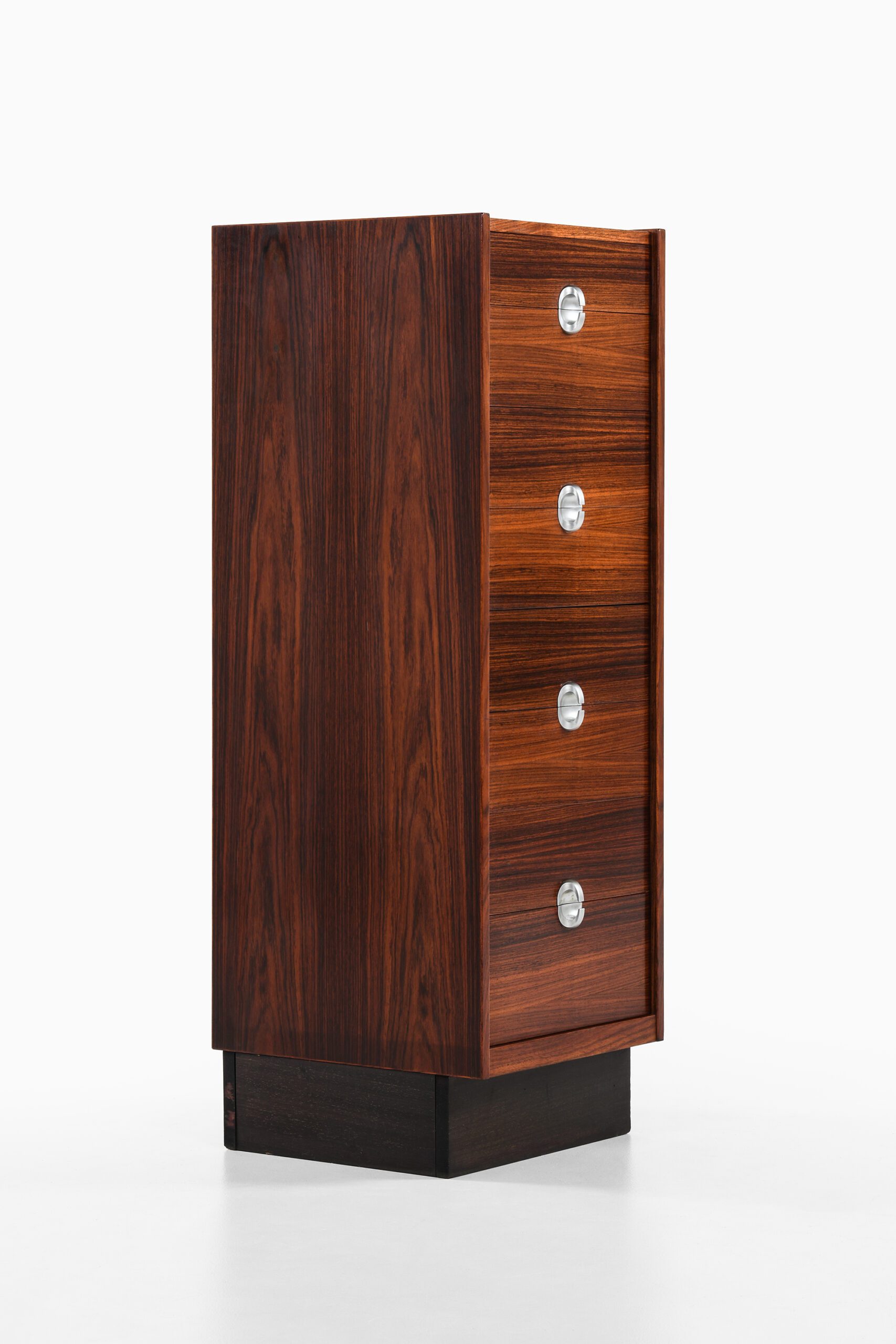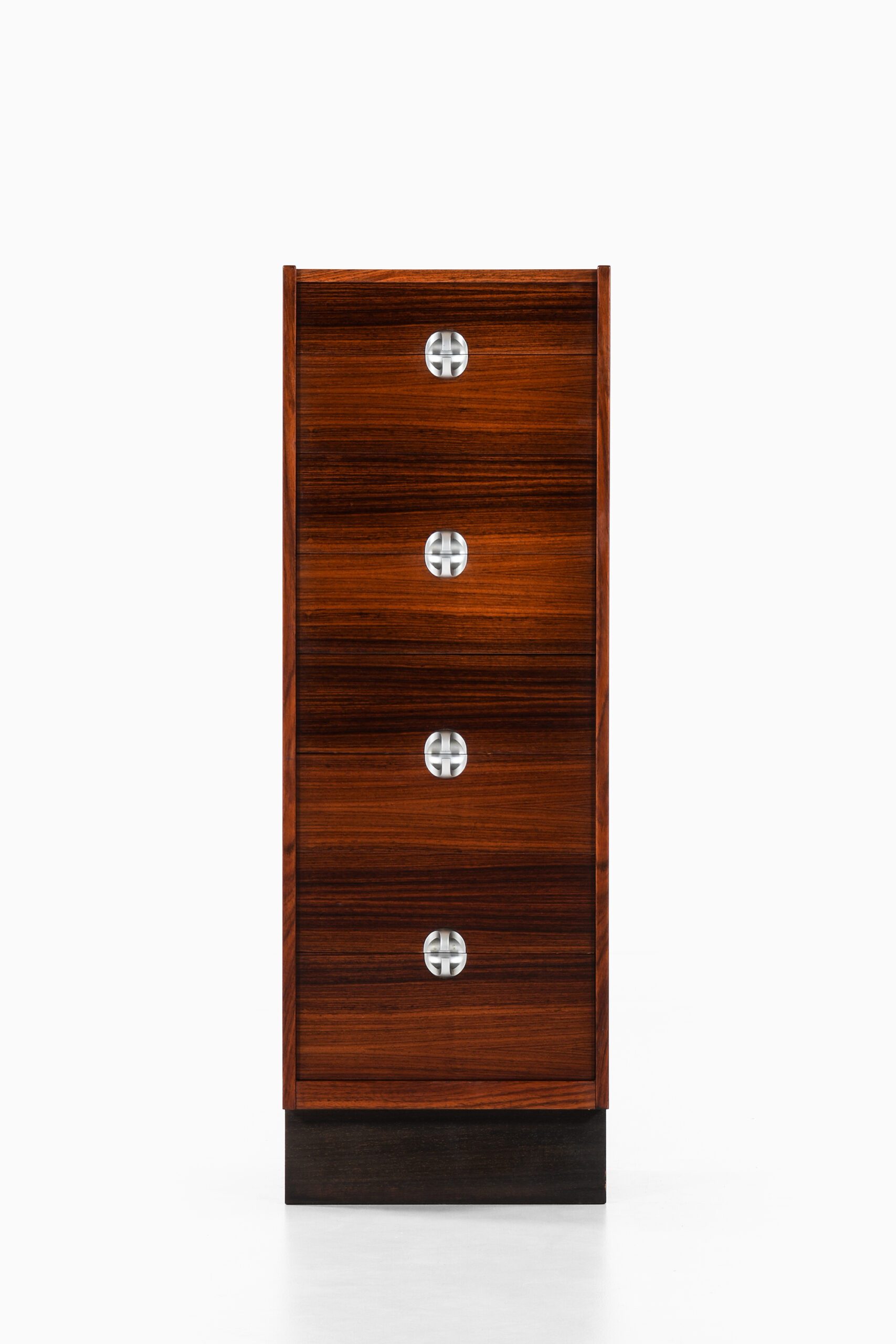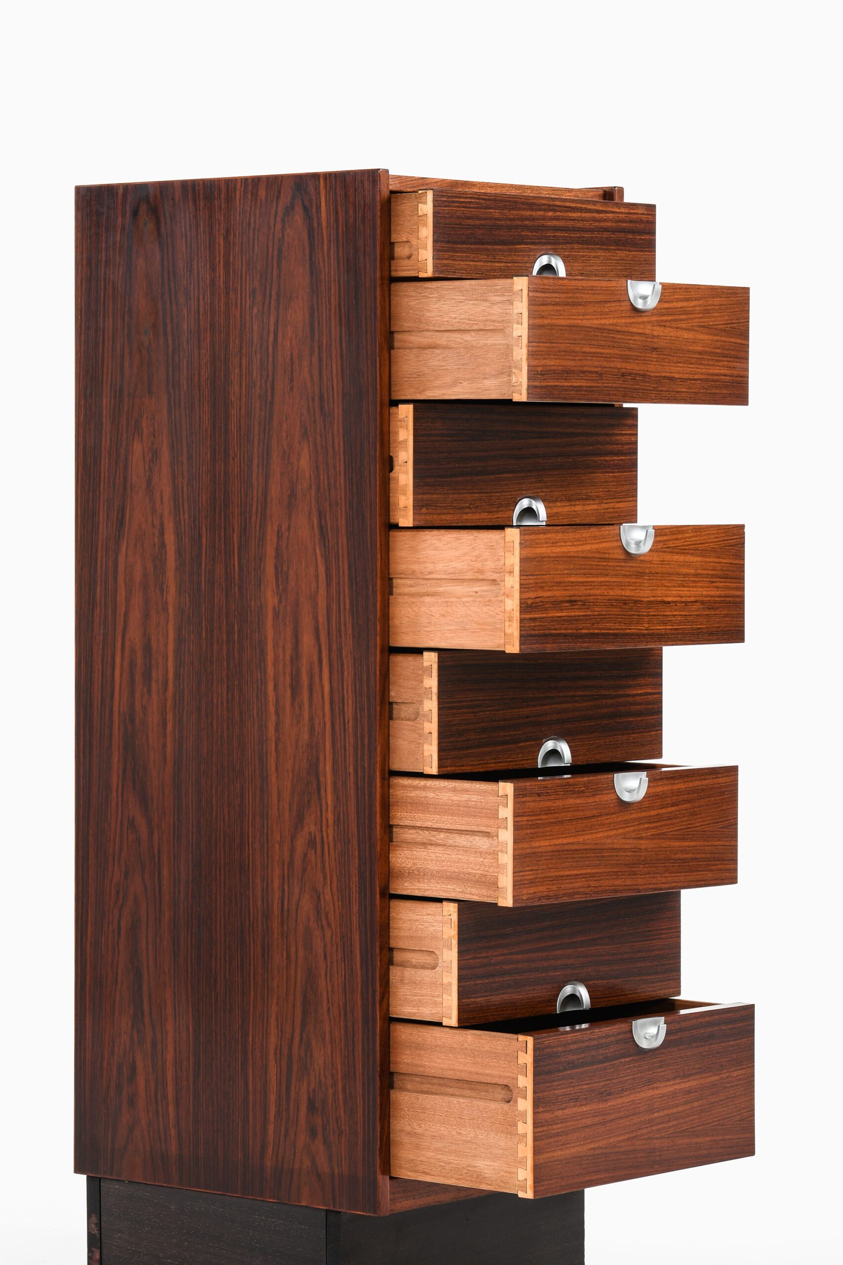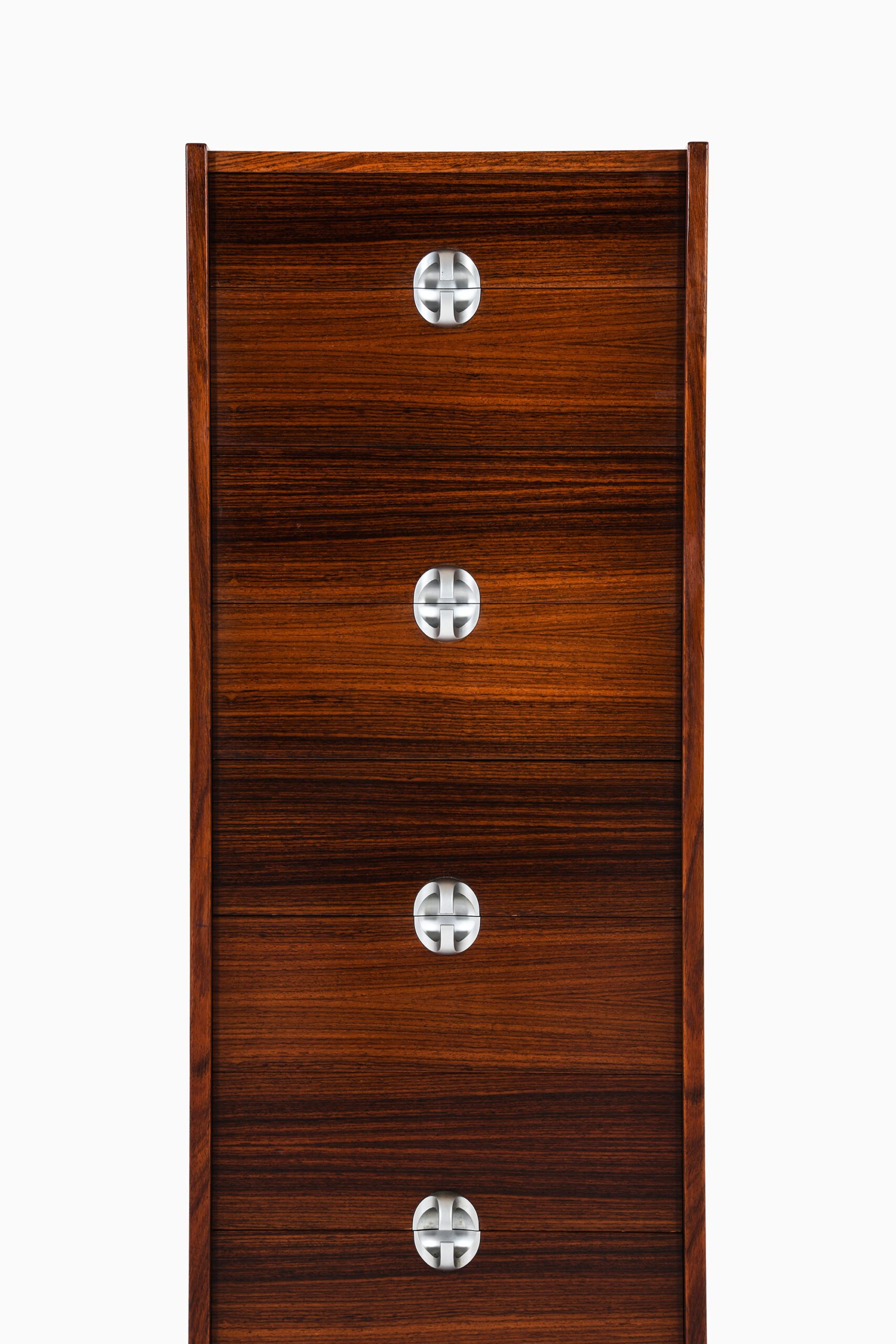This rare high bureau or chest of drawers was produced in Denmark during the 1960s by an unknown designer. The piece is crafted from rosewood, showcasing a pronounced and visually dynamic grain pattern enhanced by a smooth lacquered finish that highlights the wood’s natural depth and contrast.