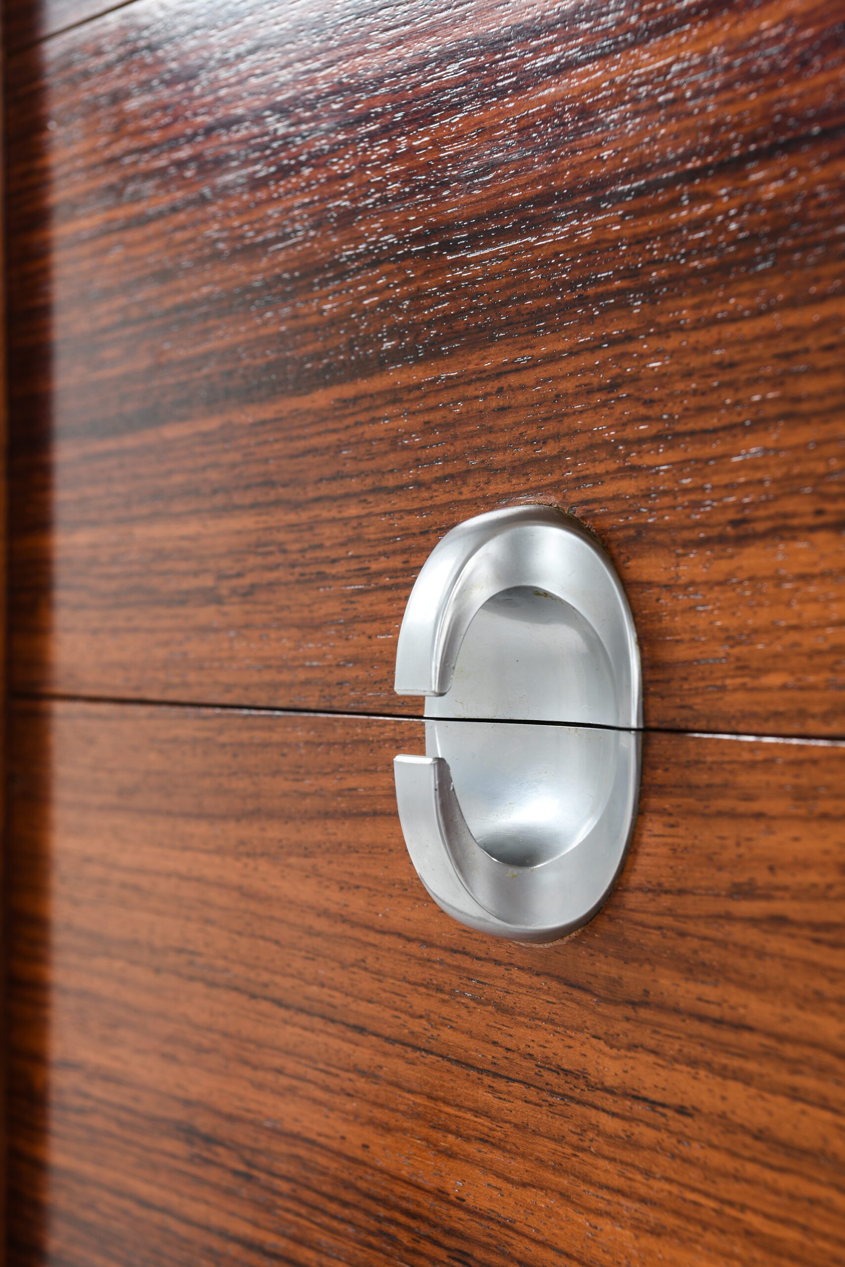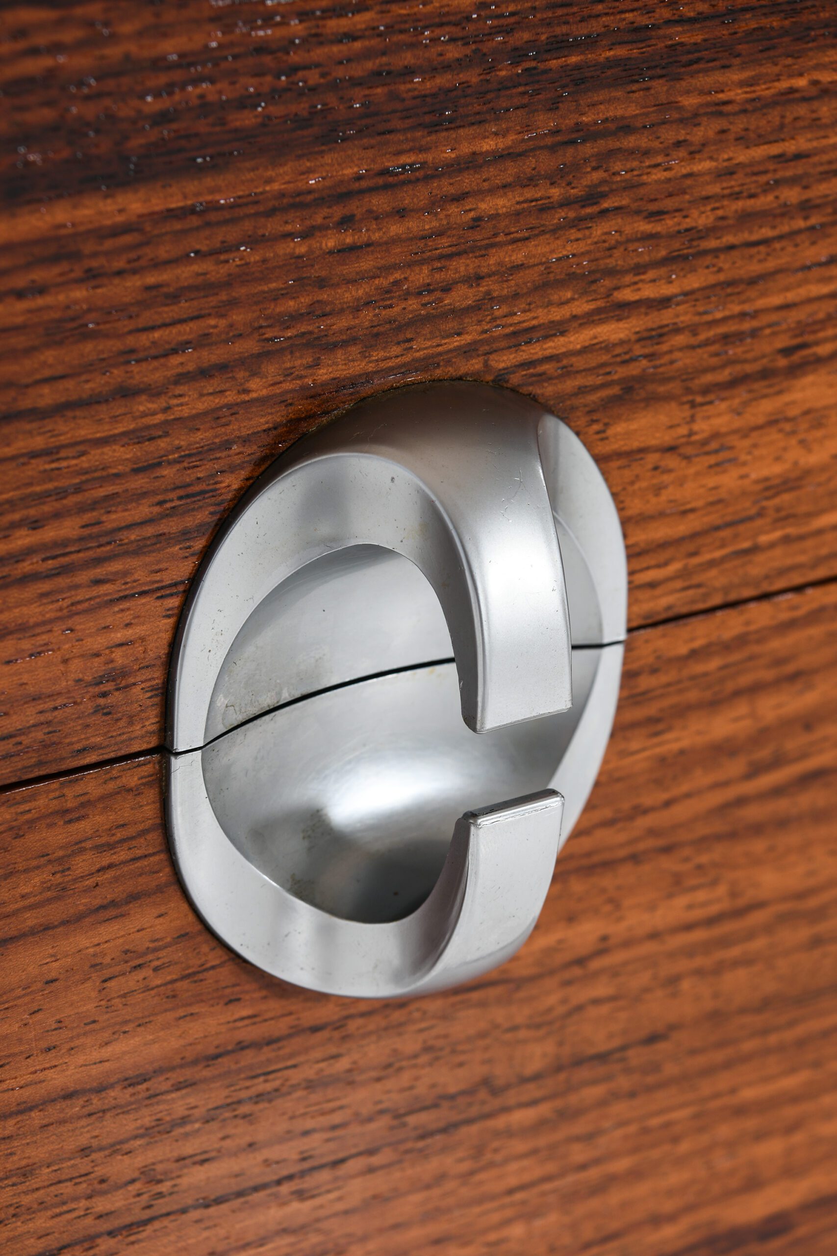 The chest features a vertical arrangement of eight drawers, each equipped with recessed circular handles made of brushed steel. These handles have a distinctive split design, offering a sculptural and tactile contrast to the organic texture of the rosewood. This juxtaposition introduces a modern and slightly industrial edge to an otherwise traditional material palette.
