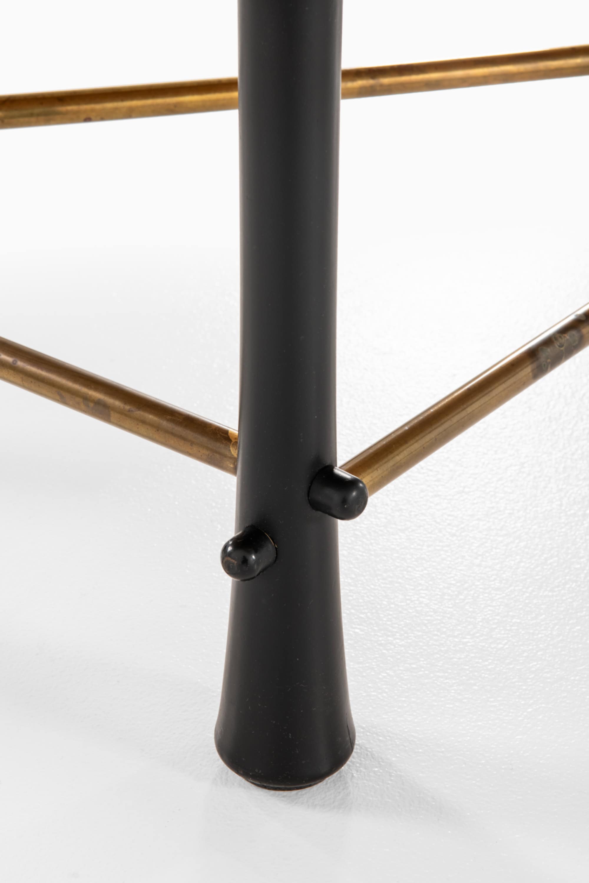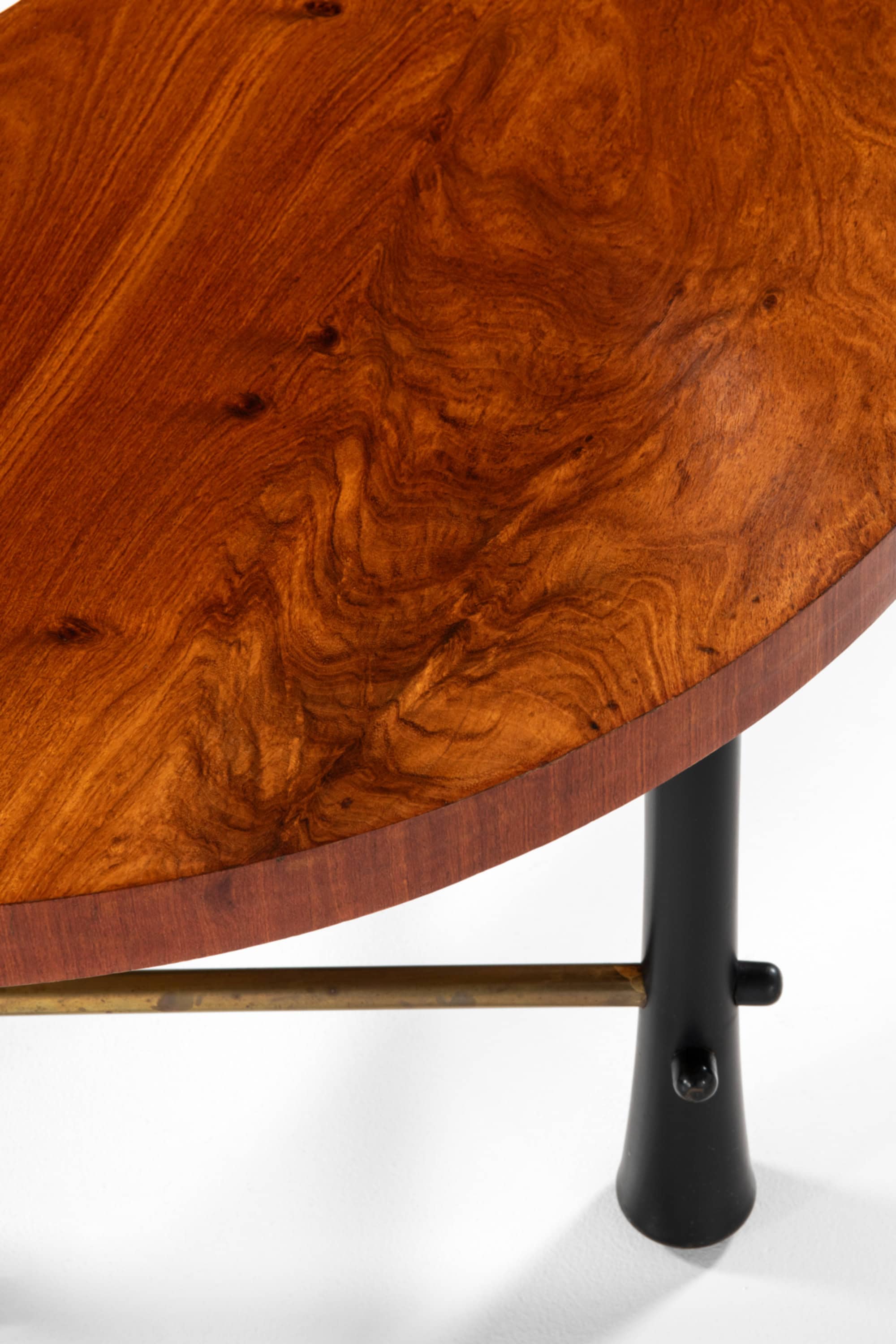 The table stands on black lacquered legs with a slightly tapered, flared profile that adds a subtle sense of lightness while still feeling grounded and stable. A brass stretcher construction connects the legs and introduces a contrasting metallic accent, giving the piece a sophisticated mix of materials typical for the era. Together, the dark lacquer, golden brass, and glowing walnut create a balanced palette that feels both bold and timeless.