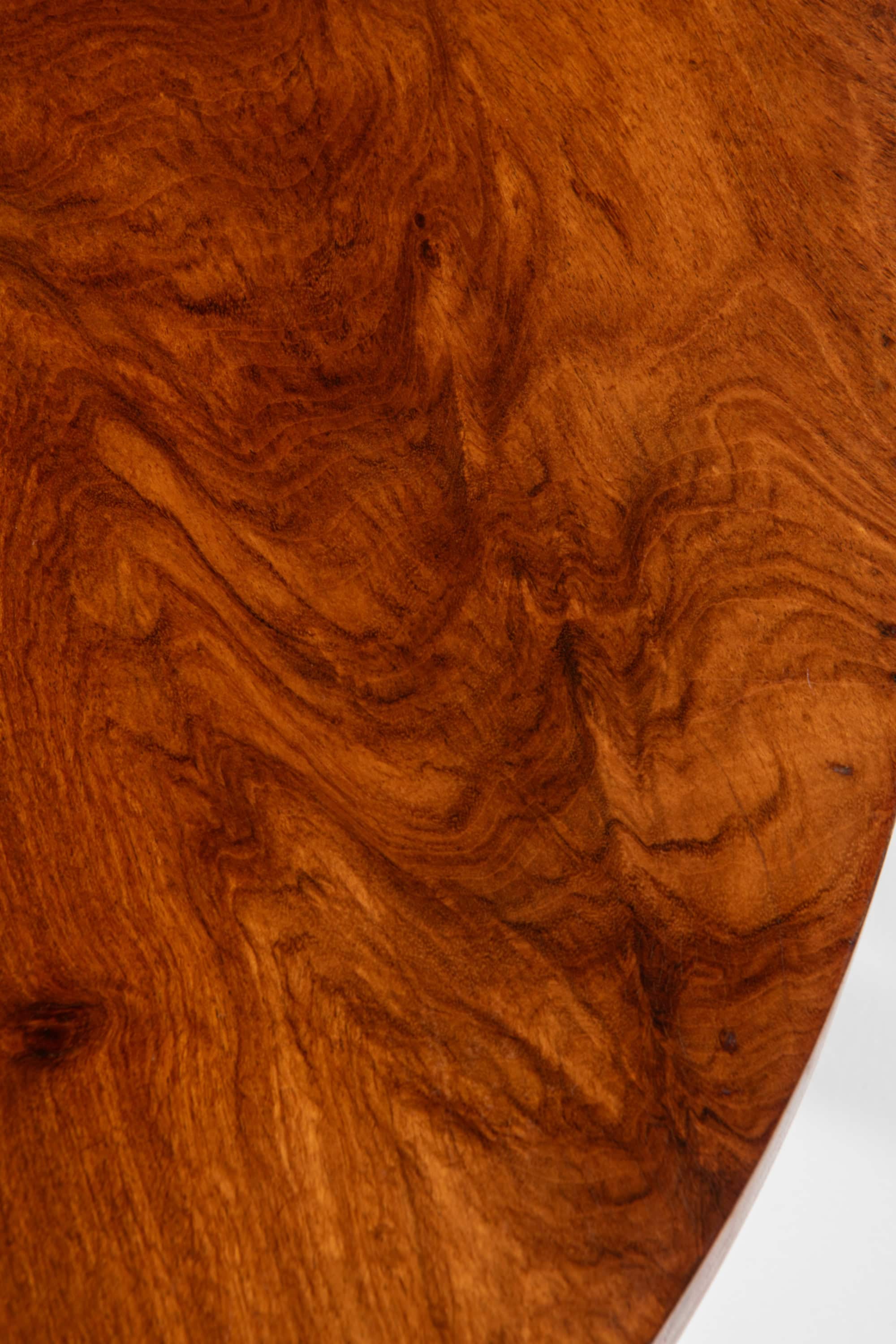 This kidney shaped coffee table from the 1940s is a striking example of the period’s refined and sculptural approach to modern furniture, combining an elegant organic tabletop with a more architectural base. The top is crafted in walnut, featuring a rich, warm tone and beautifully vivid grain movement, with dramatic swirling patterns that give the surface a lively and almost three-dimensional depth. The softly curved outline enhances the expressive character of the wood and creates a dynamic presence from every angle.