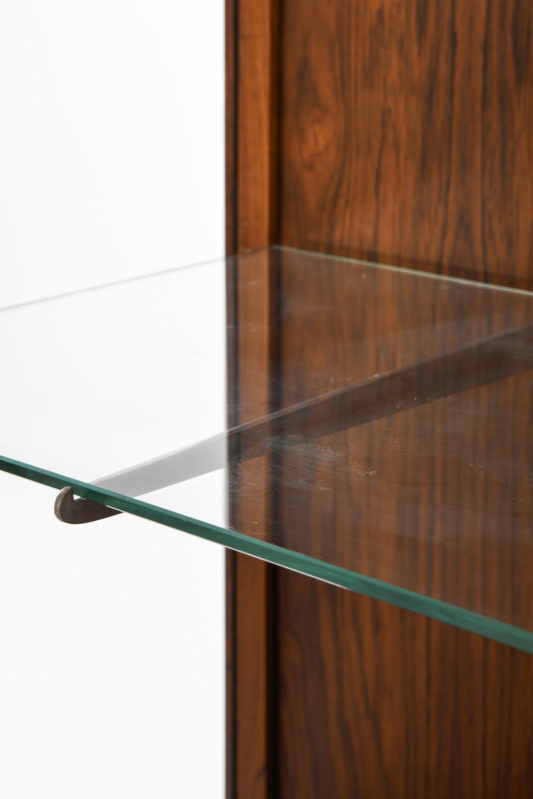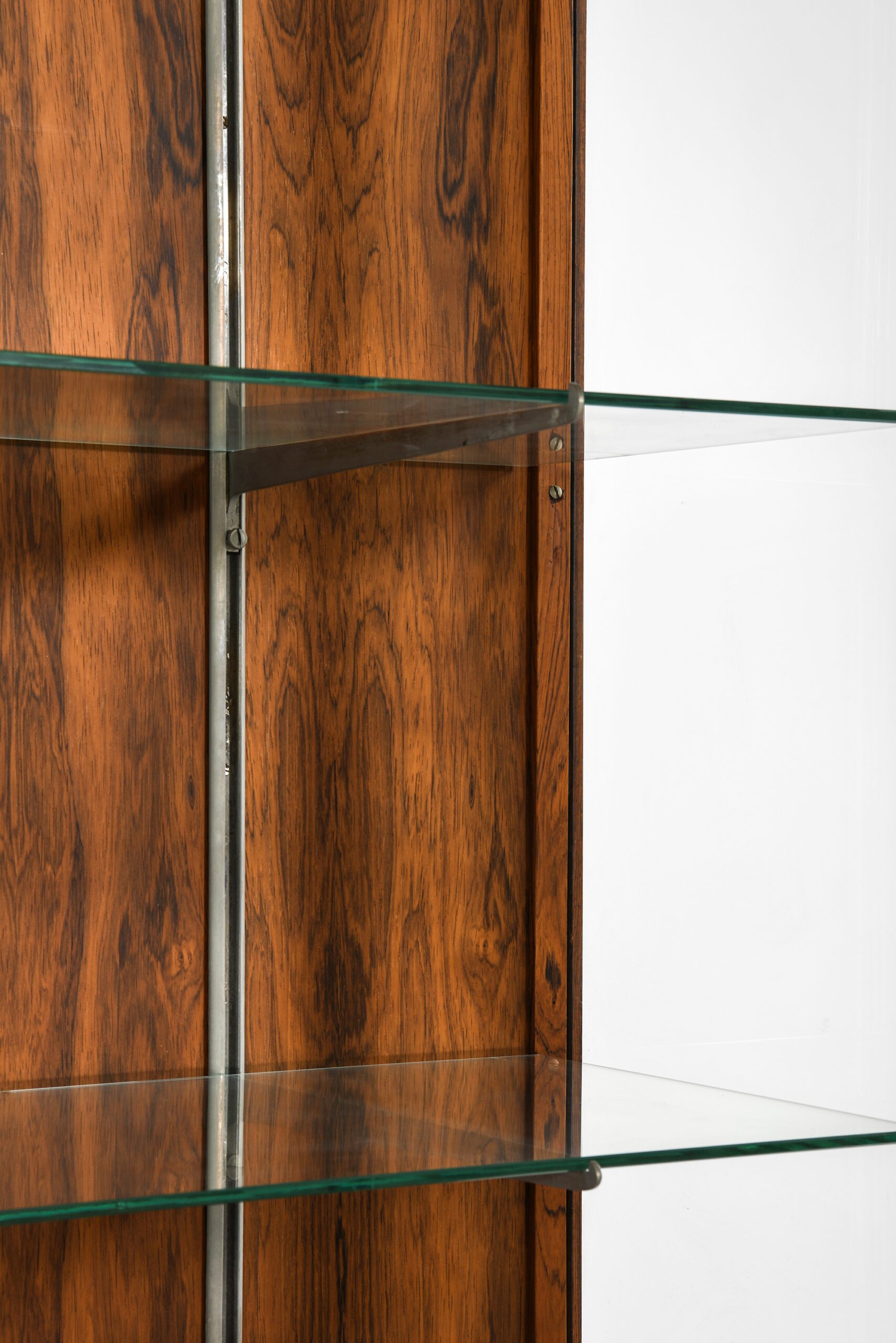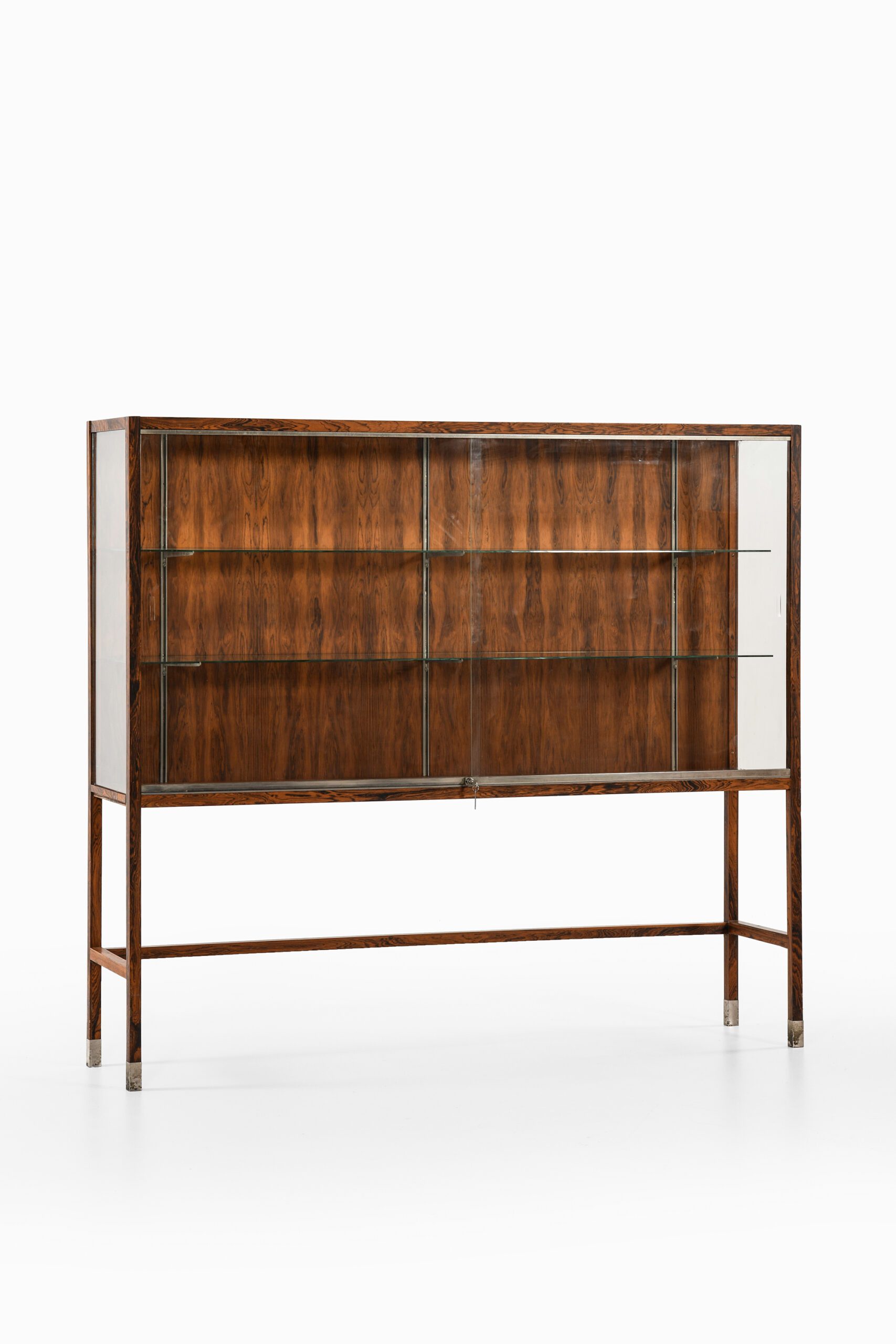 The cabinet features a rectangular rosewood frame with a rich, expressive grain that adds warmth and visual interest. It is elevated on a slender base, which contributes to its overall sense of lightness. The front is enclosed by sliding glass doors equipped with a discreet locking mechanism, while glass panels on the sides maximize visibility from multiple angles. Inside, adjustable glass shelves are supported by steel brackets, offering flexible storage and creating a floating, unobtrusive appearance.