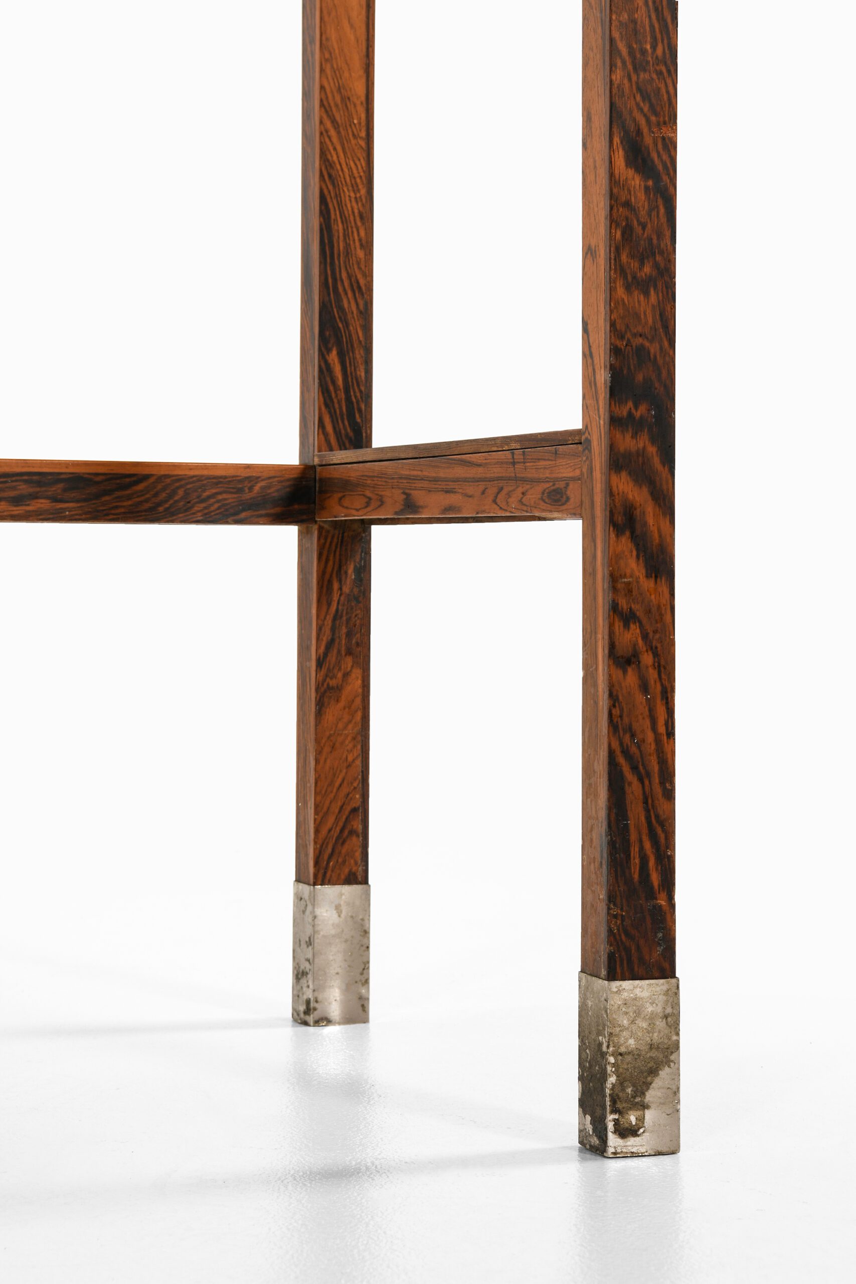The cabinet stands on slim square-section legs connected by horizontal stretchers for added stability. Steel-capped feet provide a subtle industrial contrast to the organic character of the rosewood frame, balancing natural warmth with modern detailing.