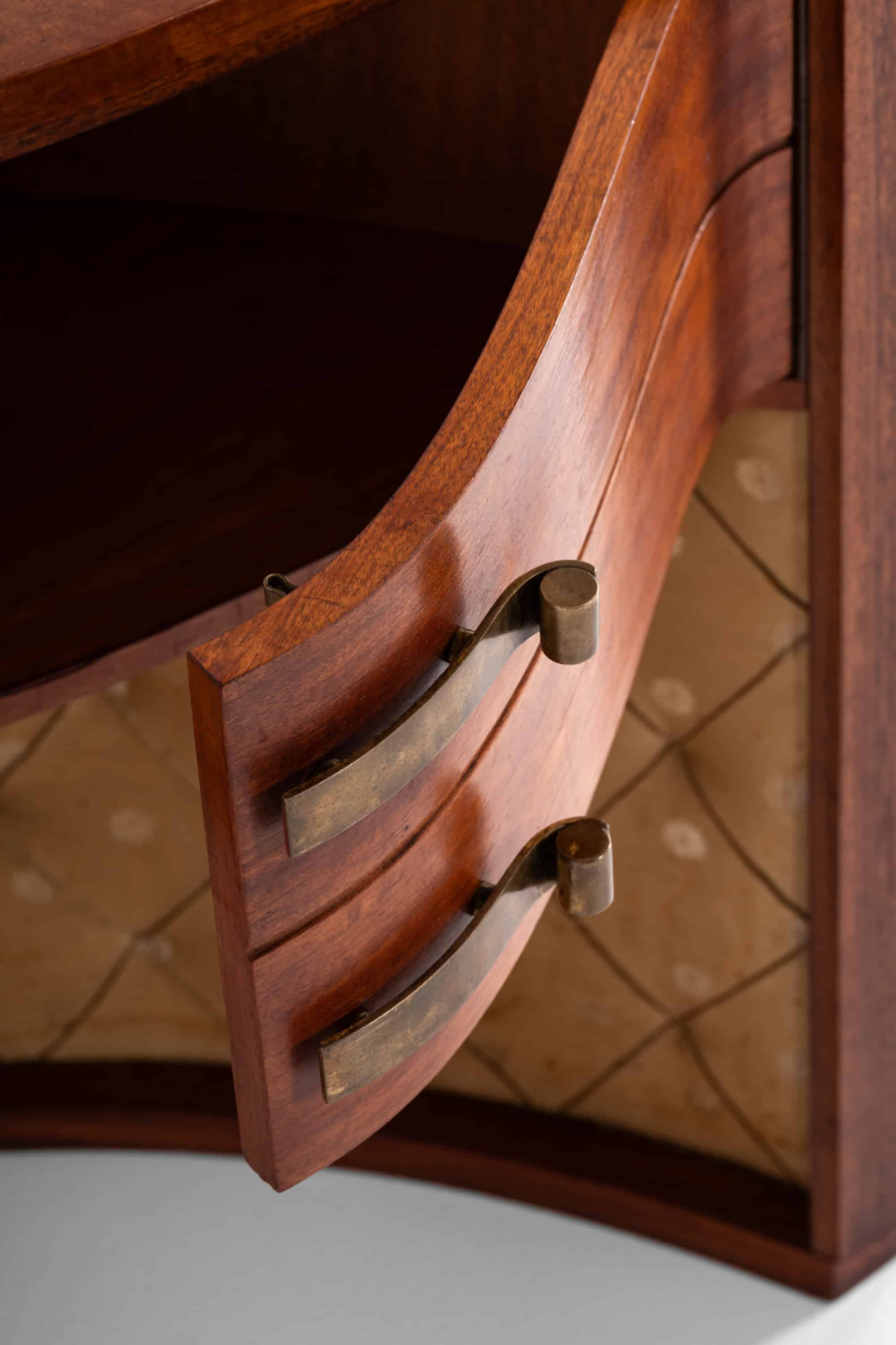 The structure is crafted in richly toned mahogany, displaying a deep reddish-brown hue with a lively grain pattern that is enhanced by a smooth, polished finish. The overall form is defined by a distinctive concave front, creating a soft architectural presence while allowing the piece to wrap subtly around the user. This curvature is echoed in the gently shaped drawer fronts, which are carefully integrated into the façade.