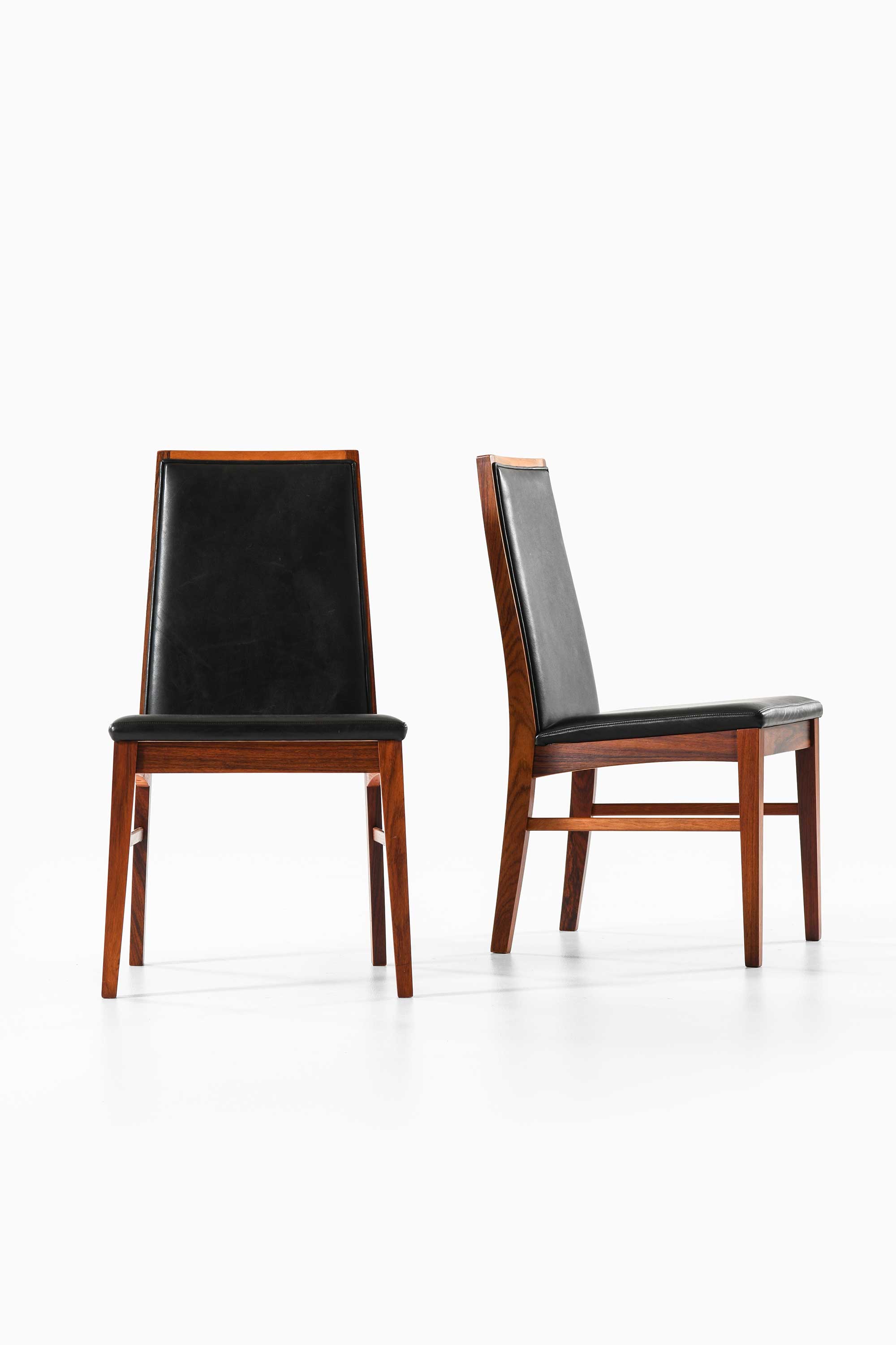 Rare set of eight dining chairs produced by Dyrlund in Denmark. These chairs are crafted from luxurious rosewood, showcasing rich wood grain and a warm hue. The seats and high backrests are upholstered in black leather, providing a sophisticated contrast to the wooden frame.