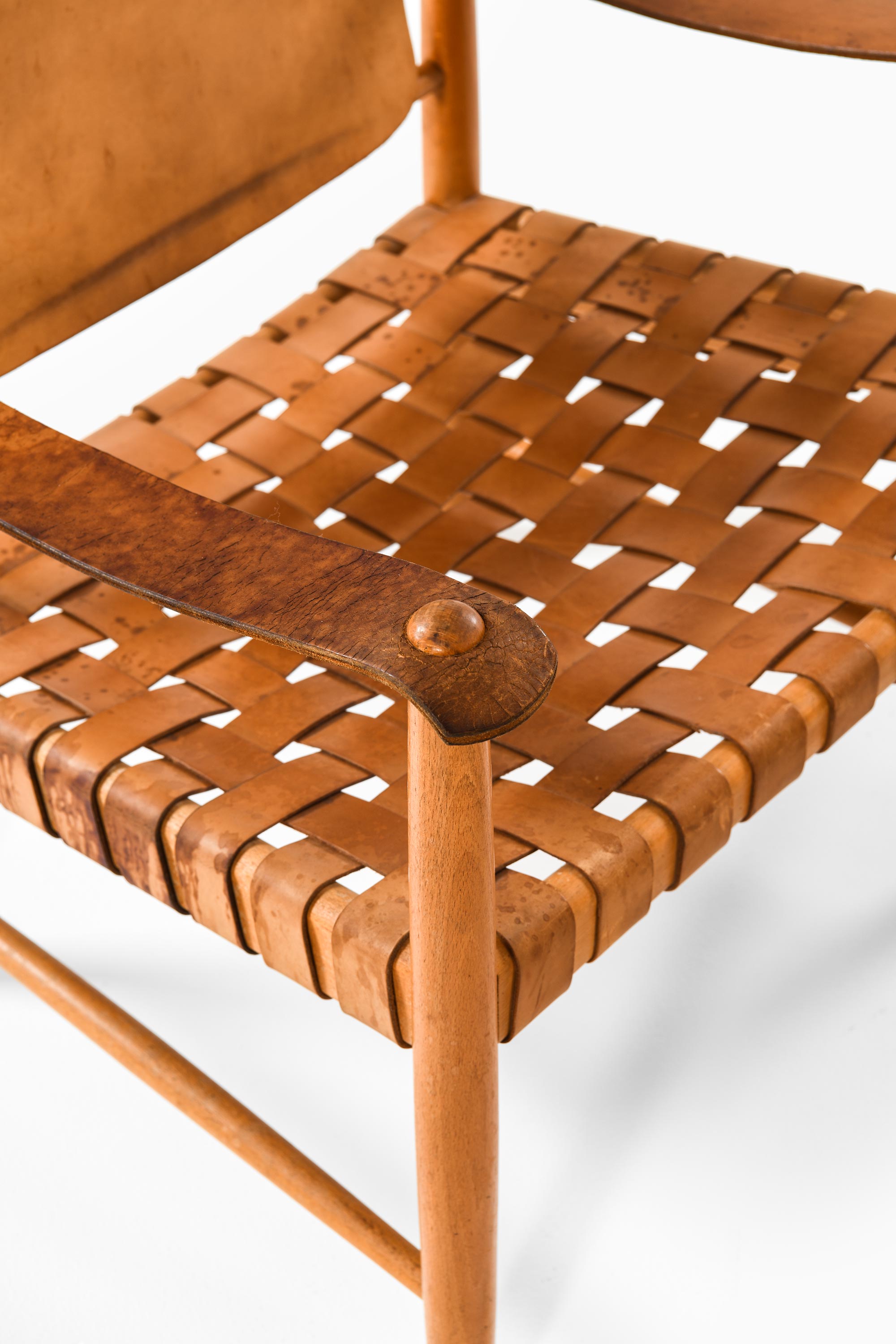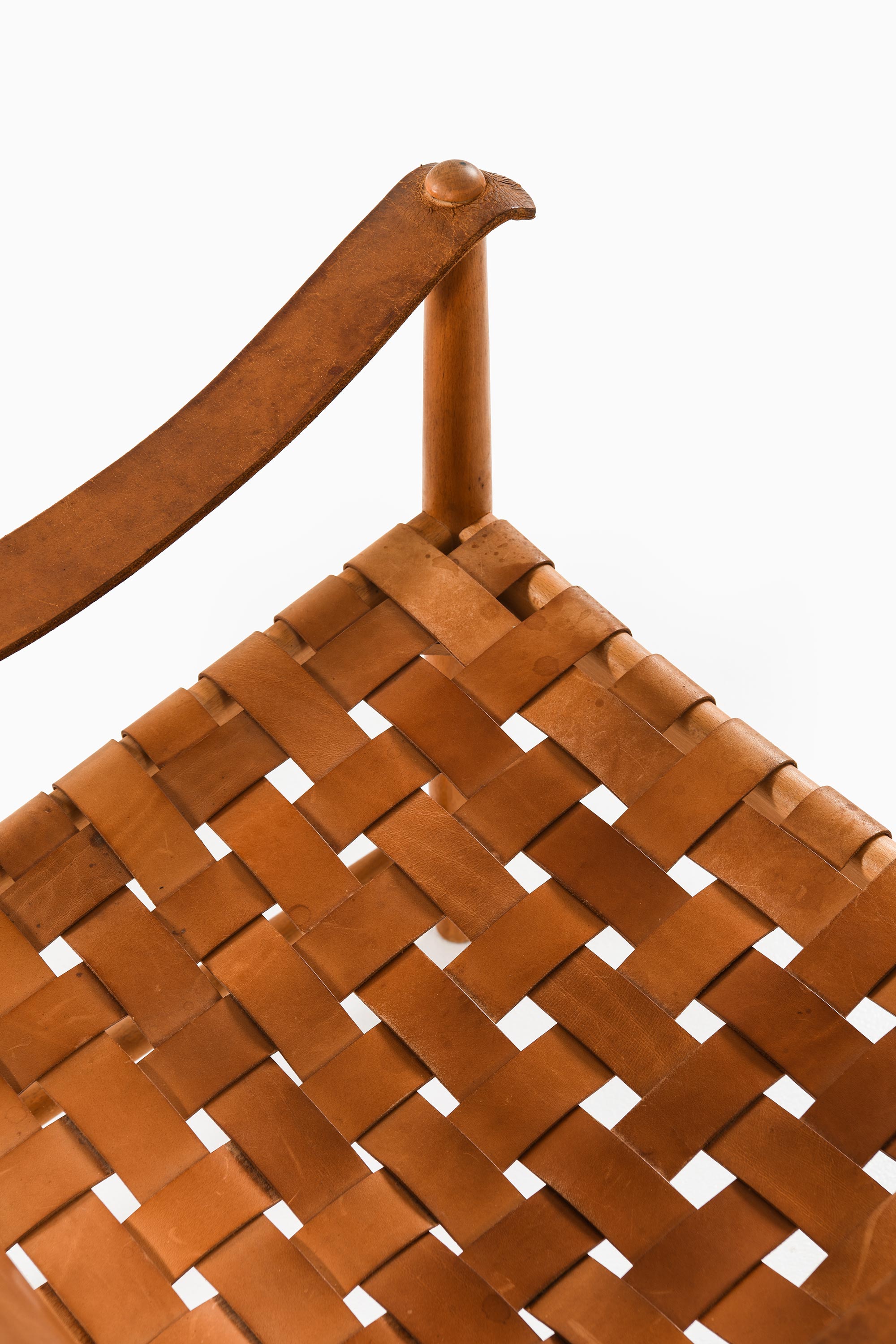 The seats and backrests are crafted from thick natural leather, supported by a woven structure that provides both flexibility and comfort. The woven technique introduces a subtle texture contrast against the smooth leather surfaces, enhancing the tactile and visual appeal of the chairs. Over time, the leather has developed a rich patina, displaying natural variations in color and texture that contribute to the chairs’ vintage character.