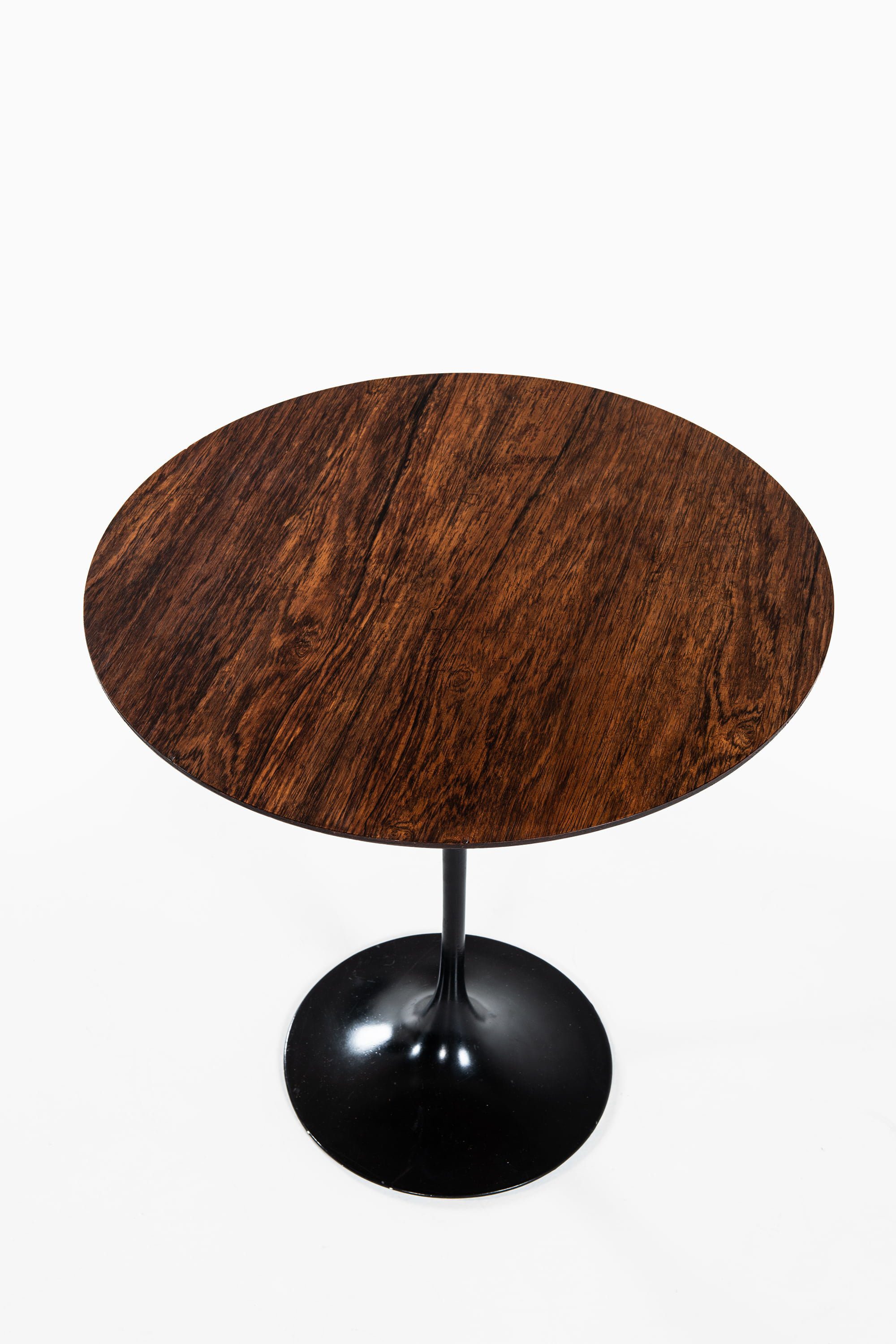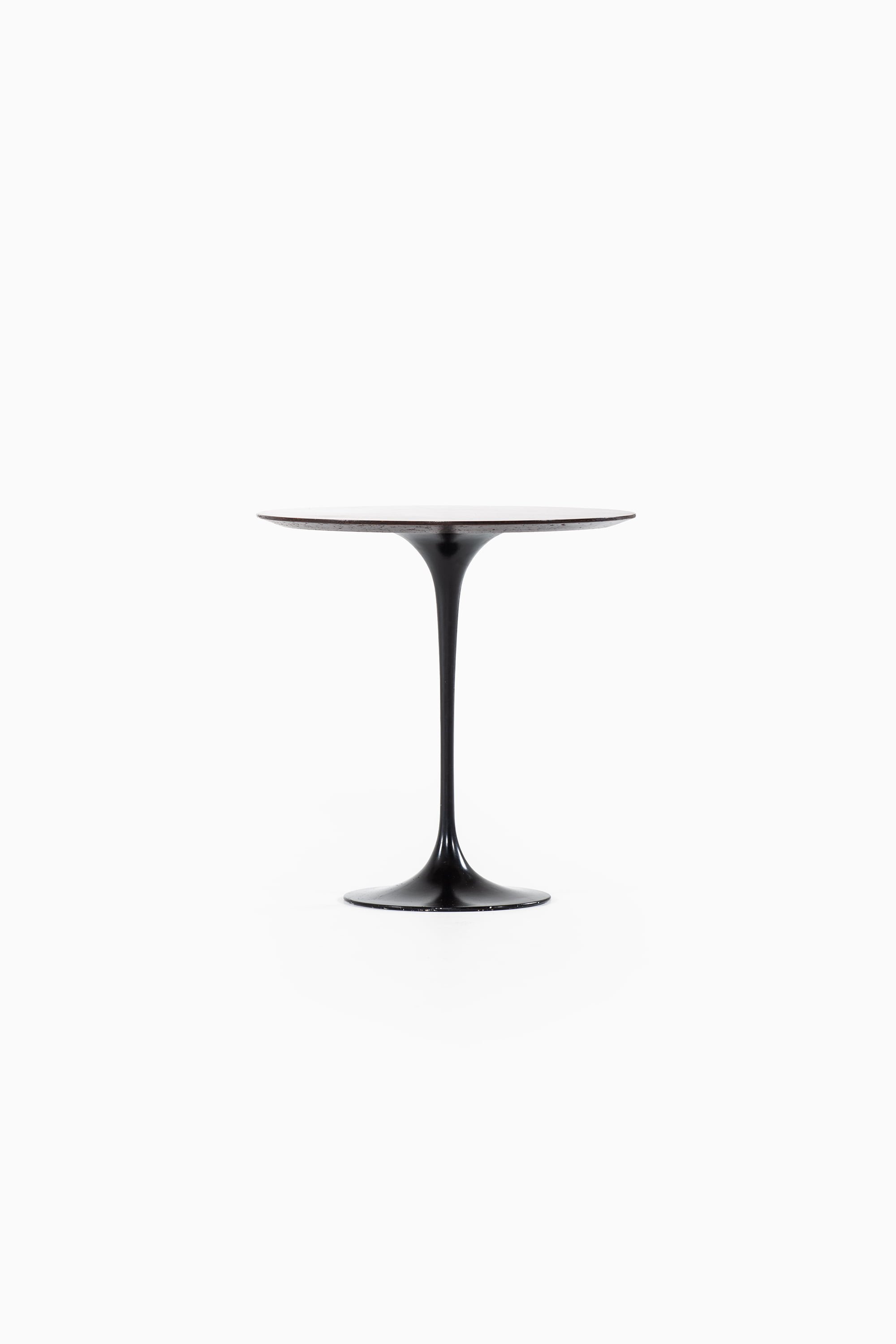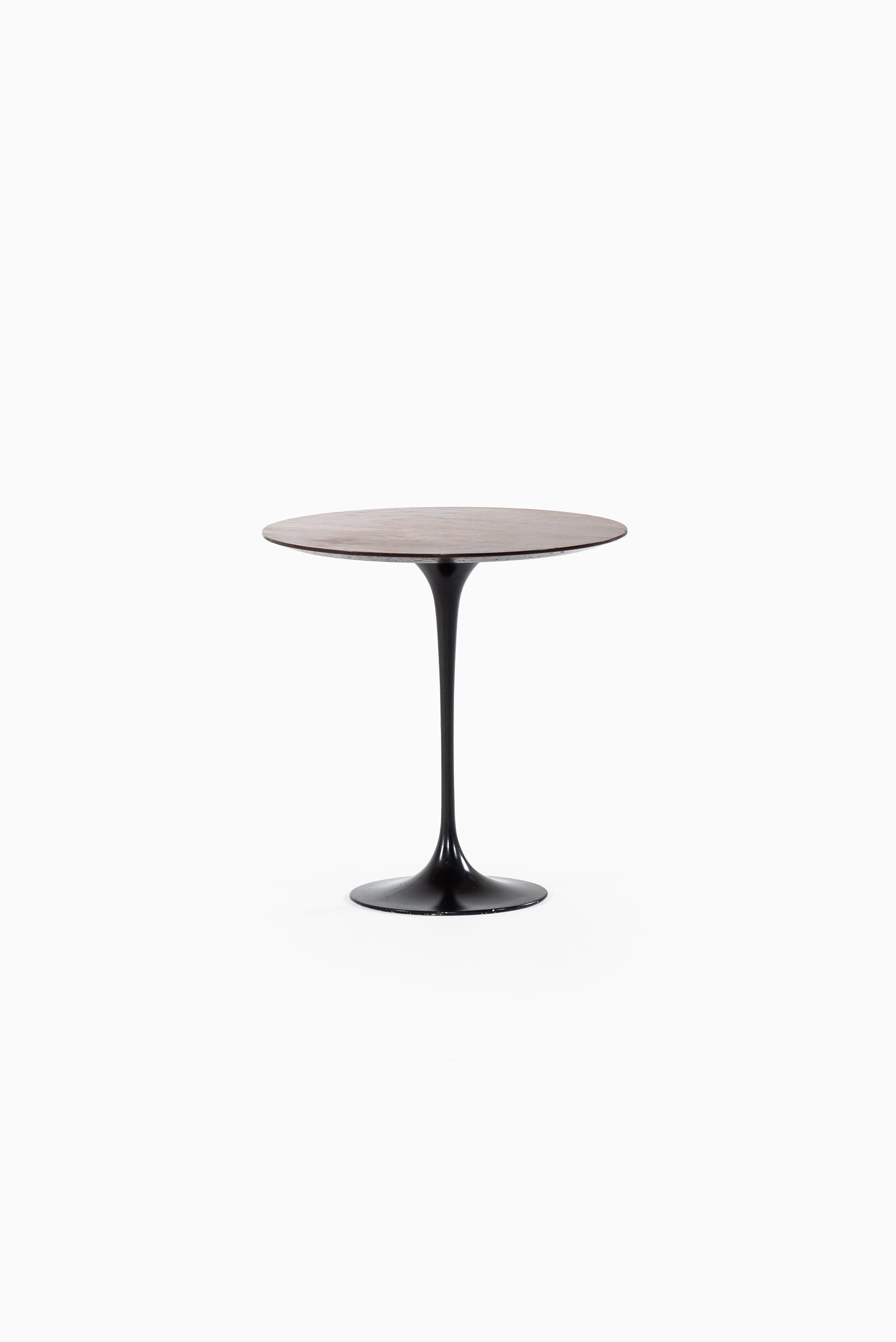 The table features a circular top in richly grained rosewood, characterized by deep brown tones with darker streaks and natural variations that highlight the wood’s organic beauty. The base is crafted from black lacquered metal and takes on Saarinen’s signature pedestal form, tapering elegantly from a round foot to support the tabletop with visual lightness and structural stability. This contrast between the warm, natural surface and the sleek, industrial base exemplifies Saarinen’s modernist philosophy and mastery of material juxtaposition.