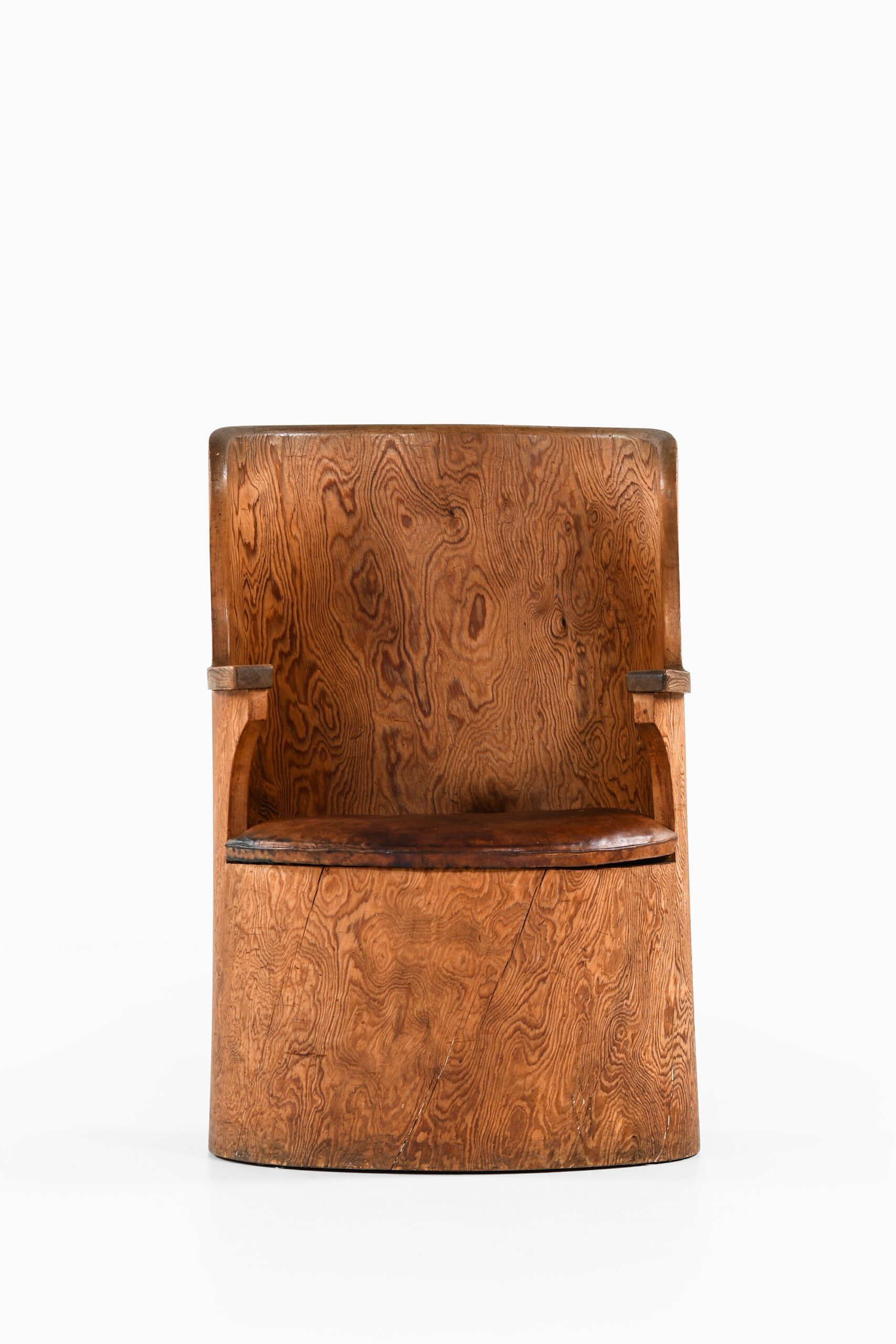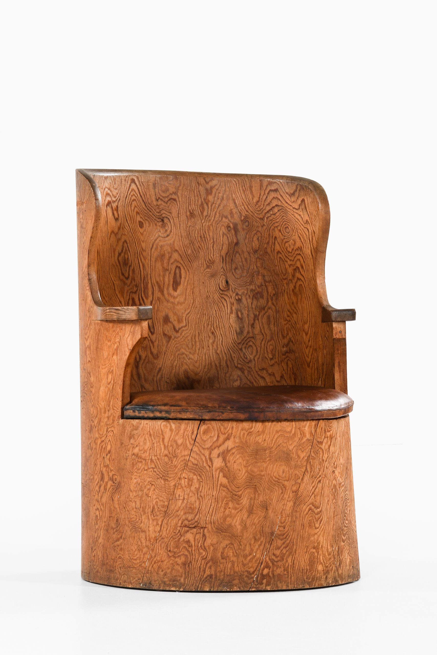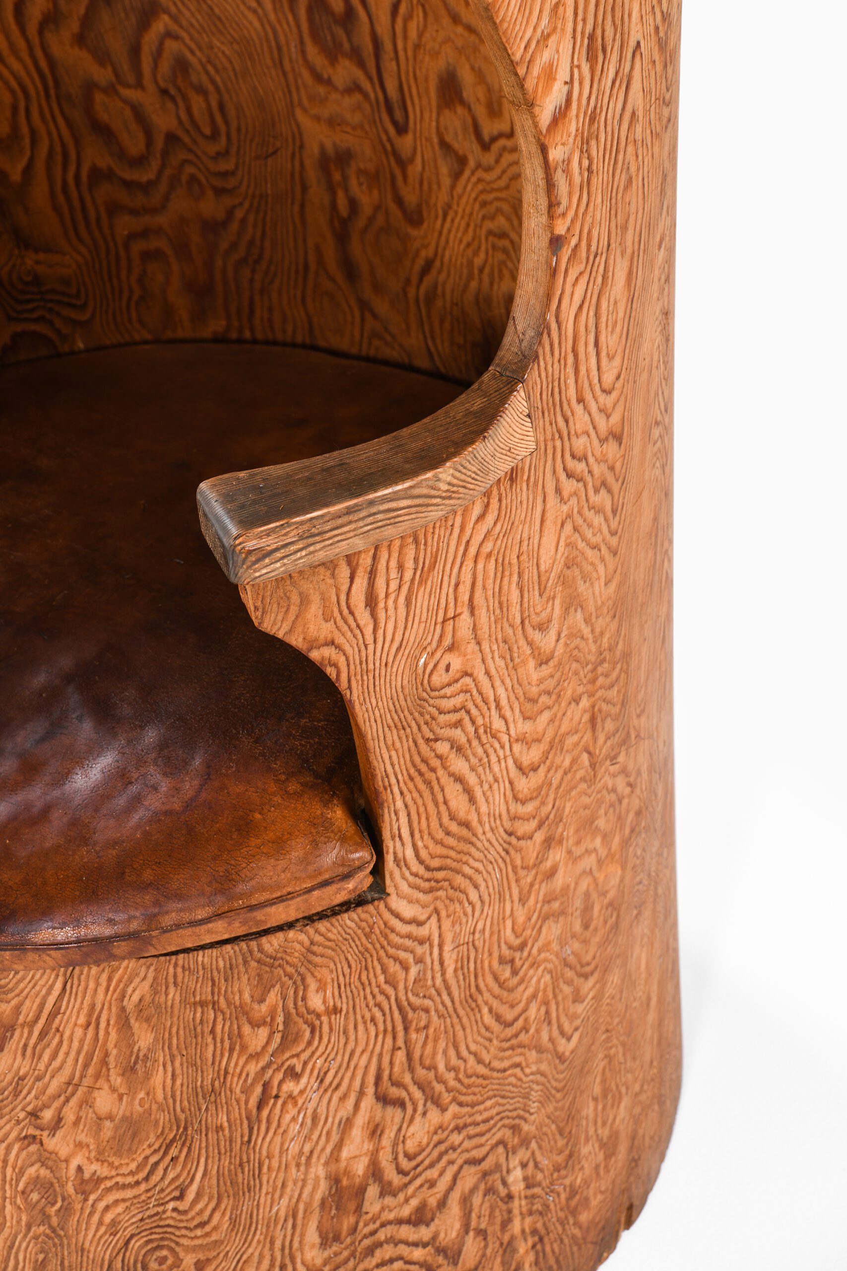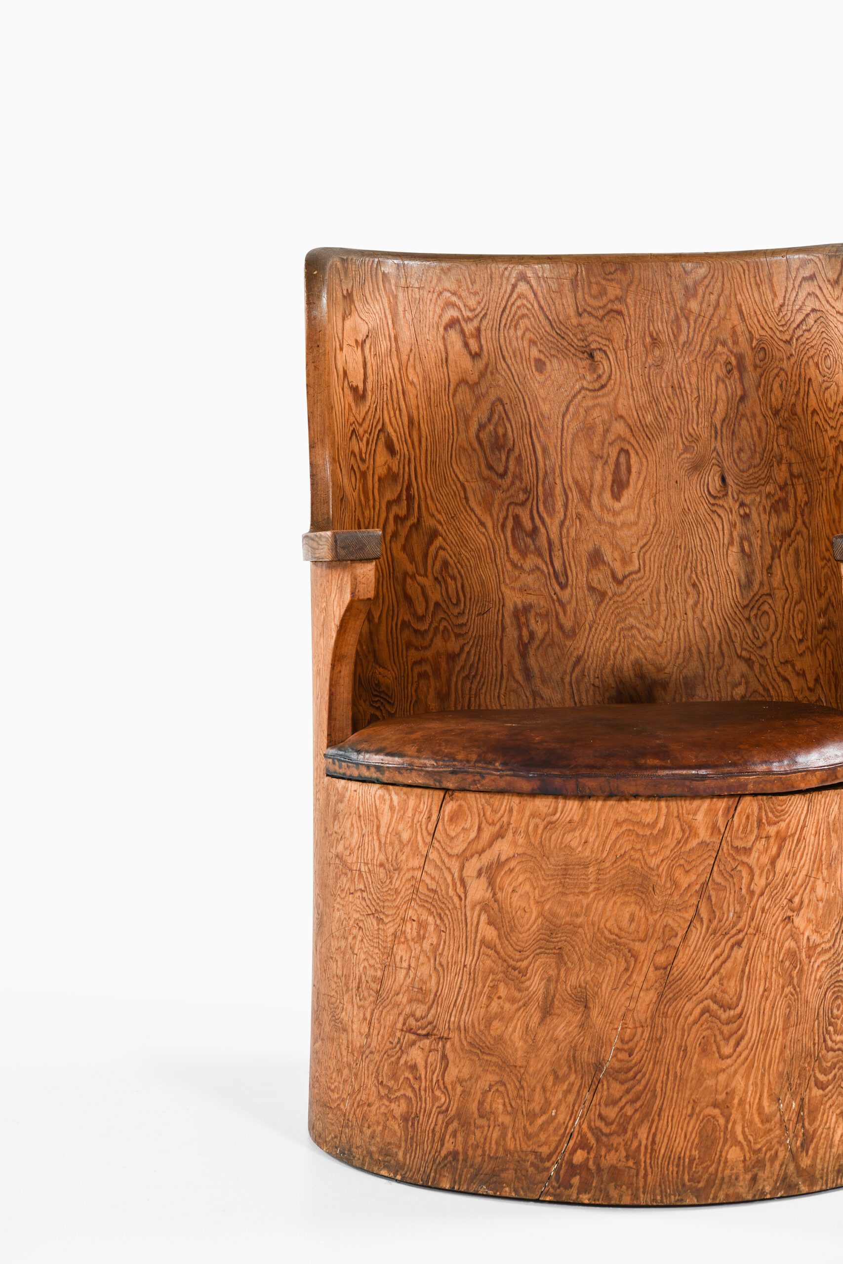 Historically, stump chairs were common in rural Sweden as sturdy, long-lasting seating, but Cederlund’s execution elevates the form to a rare example of early 20th-century sculptural furniture. Its monolithic presence and seamless integration of material and function prefigure later modernist explorations of organic form. The chair remains in good condition: its carved surfaces retain a smooth hand-worn patina, the leather cushion is intact and supple, and the overall structure is stable, making it both a functional seat and a striking artifact of Scandinavian craft heritage.