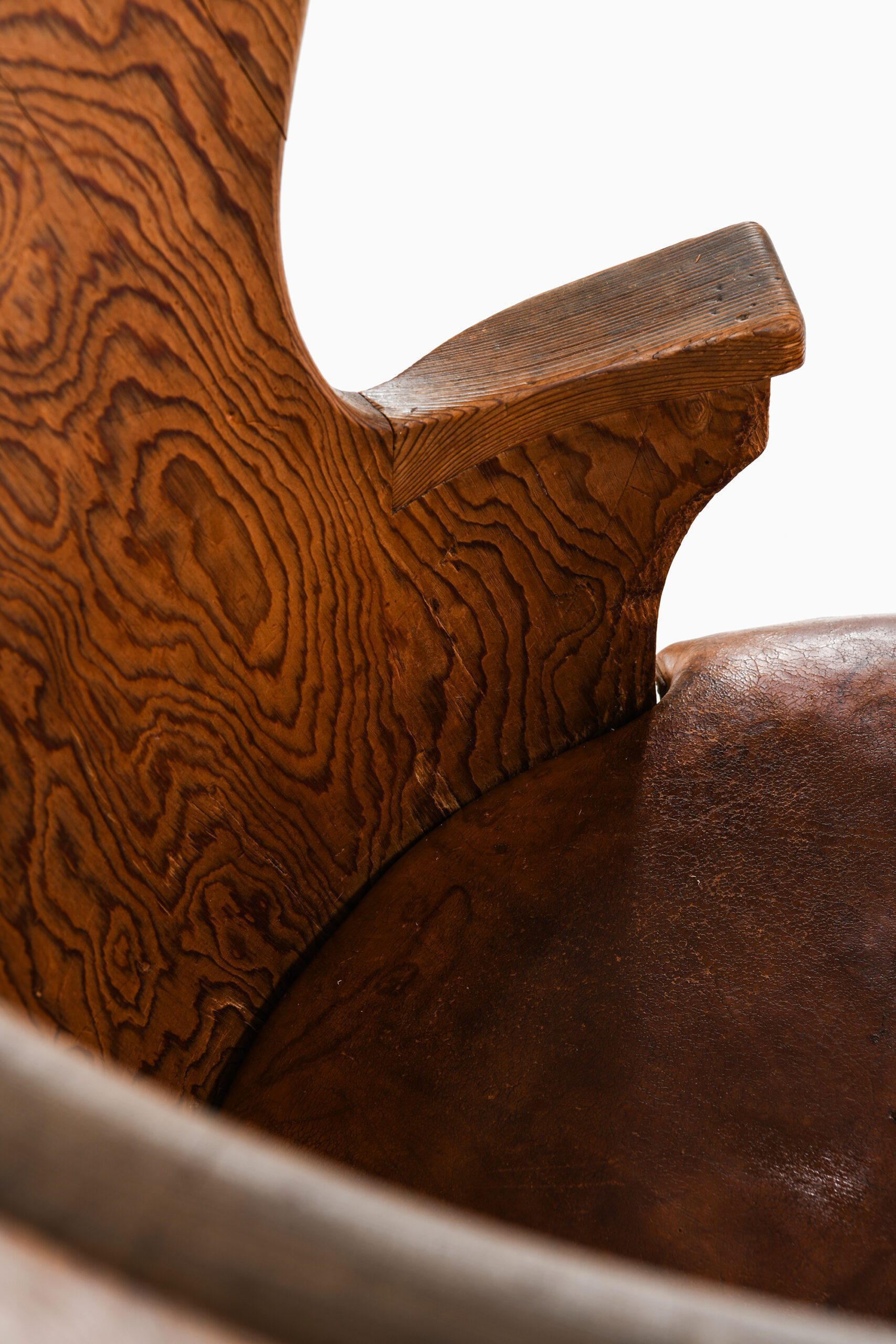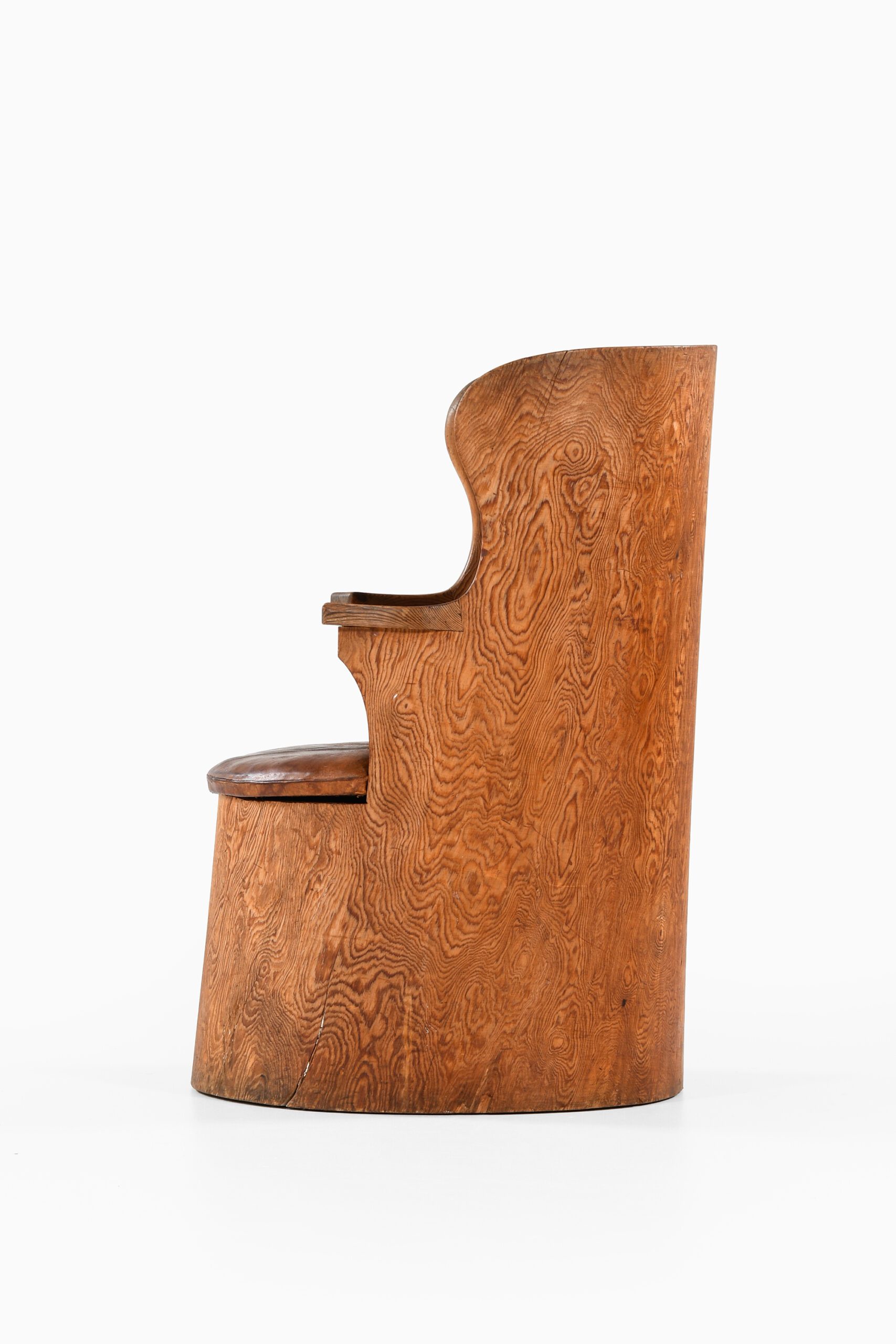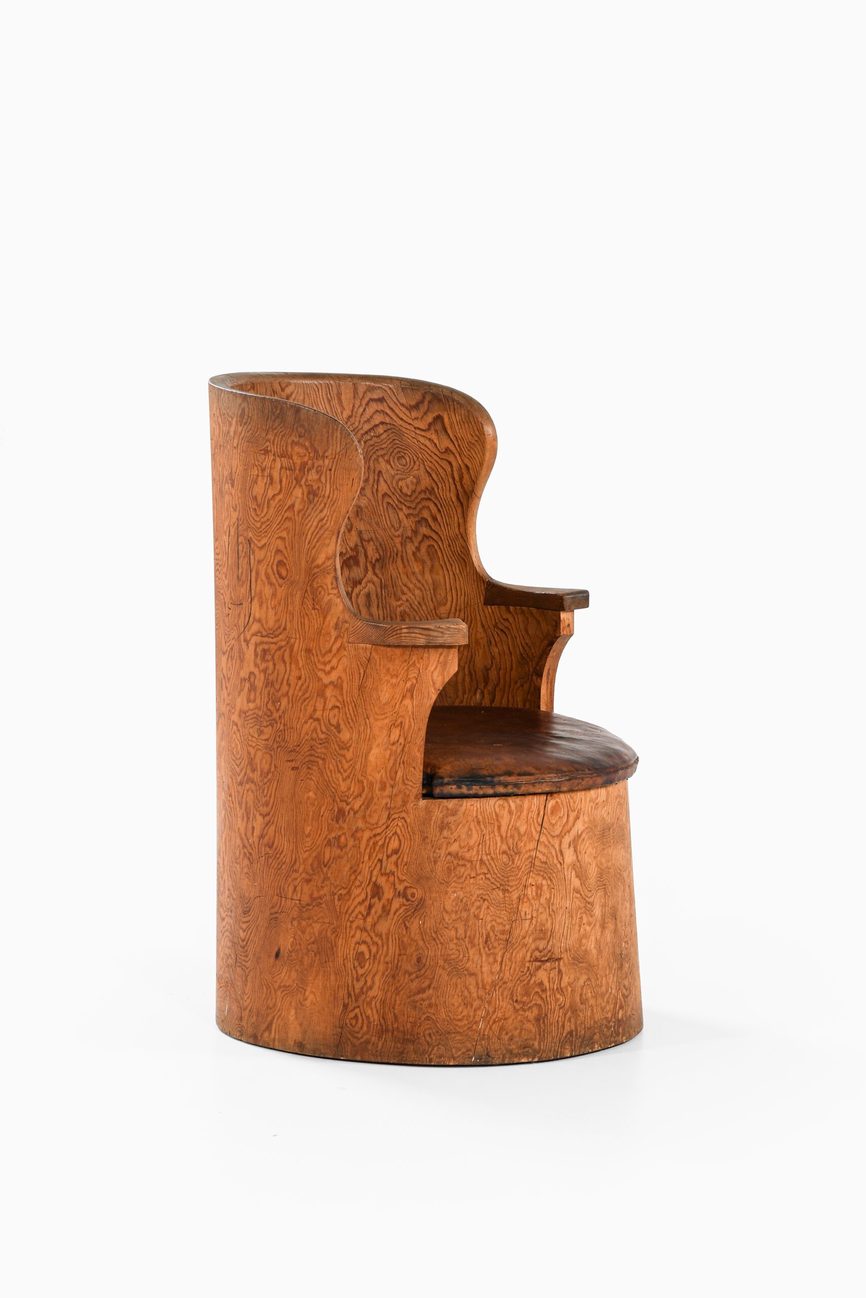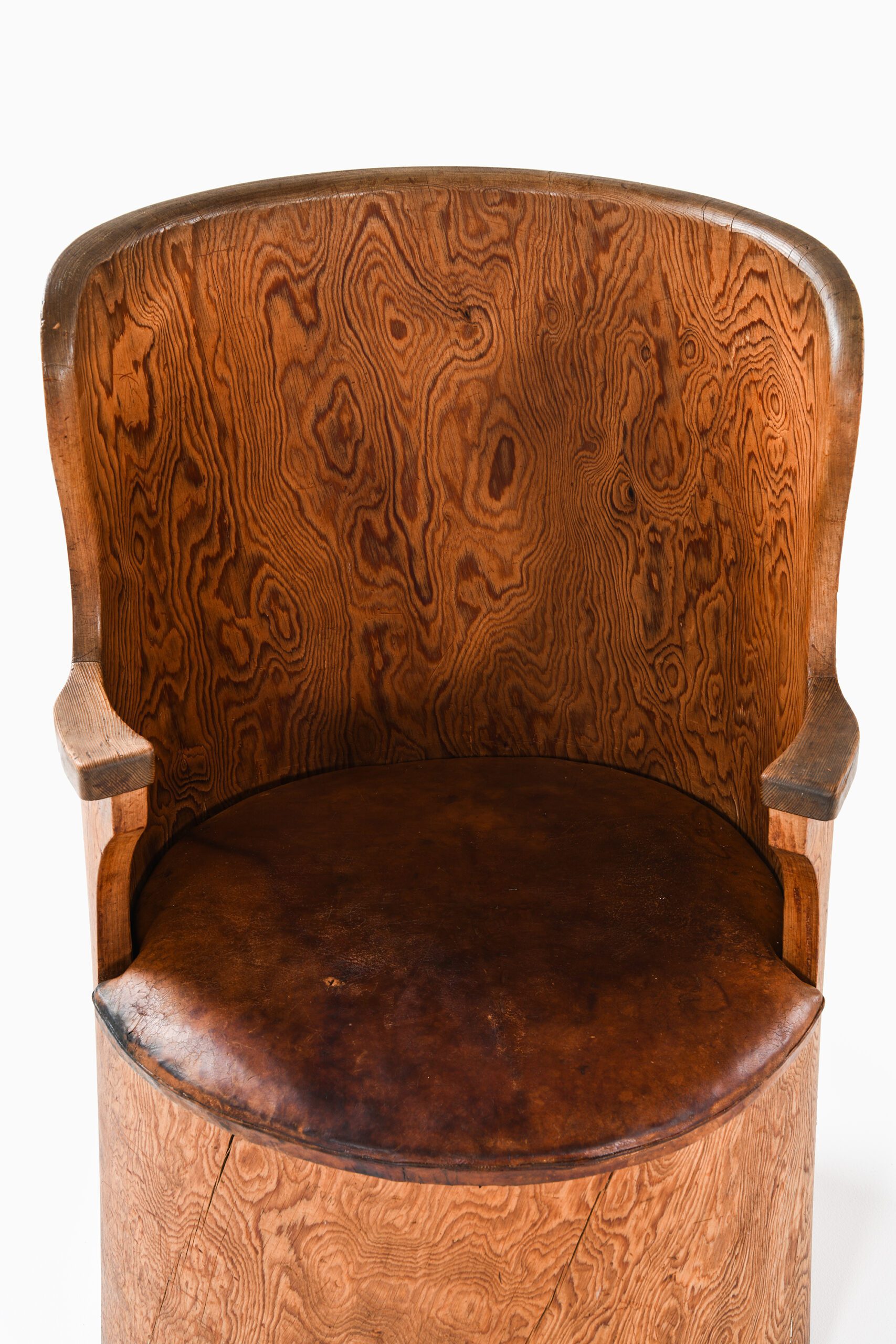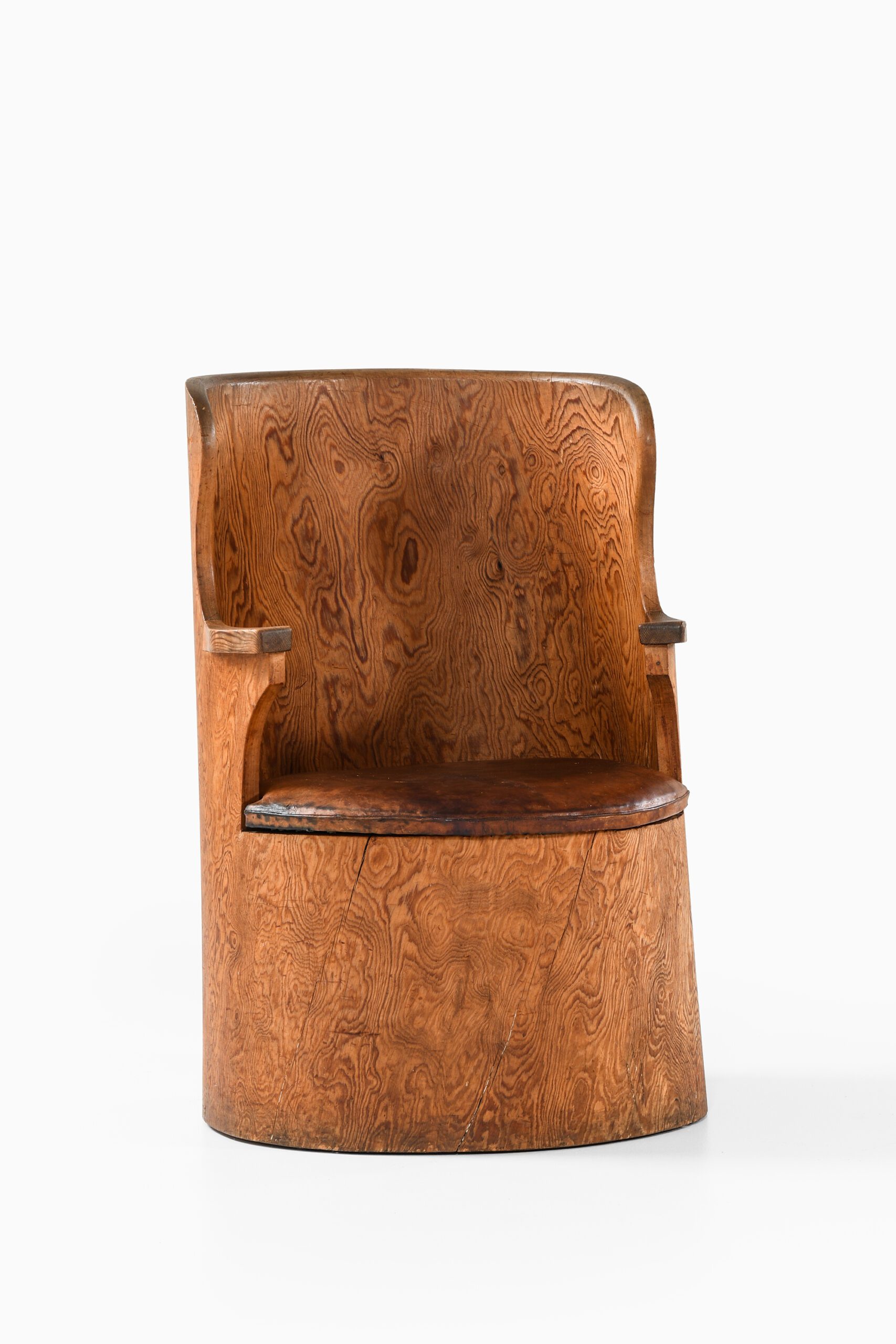 Historically, stump chairs were common in rural Sweden as sturdy, long-lasting seating, but Cederlund’s execution elevates the form to a rare example of early 20th-century sculptural furniture. Its monolithic presence and seamless integration of material and function prefigure later modernist explorations of organic form. The chair remains in good condition: its carved surfaces retain a smooth hand-worn patina, the leather cushion is intact and supple, and the overall structure is stable, making it both a functional seat and a striking artifact of Scandinavian craft heritage.