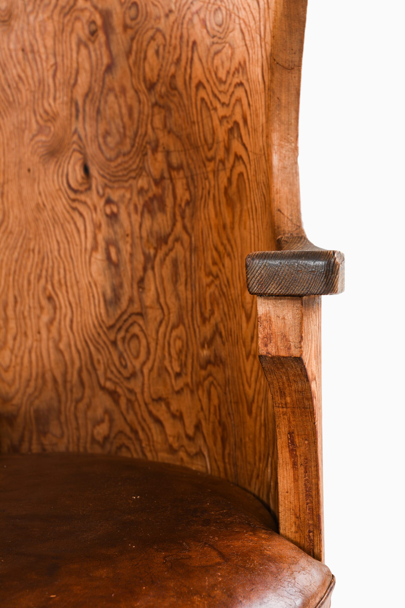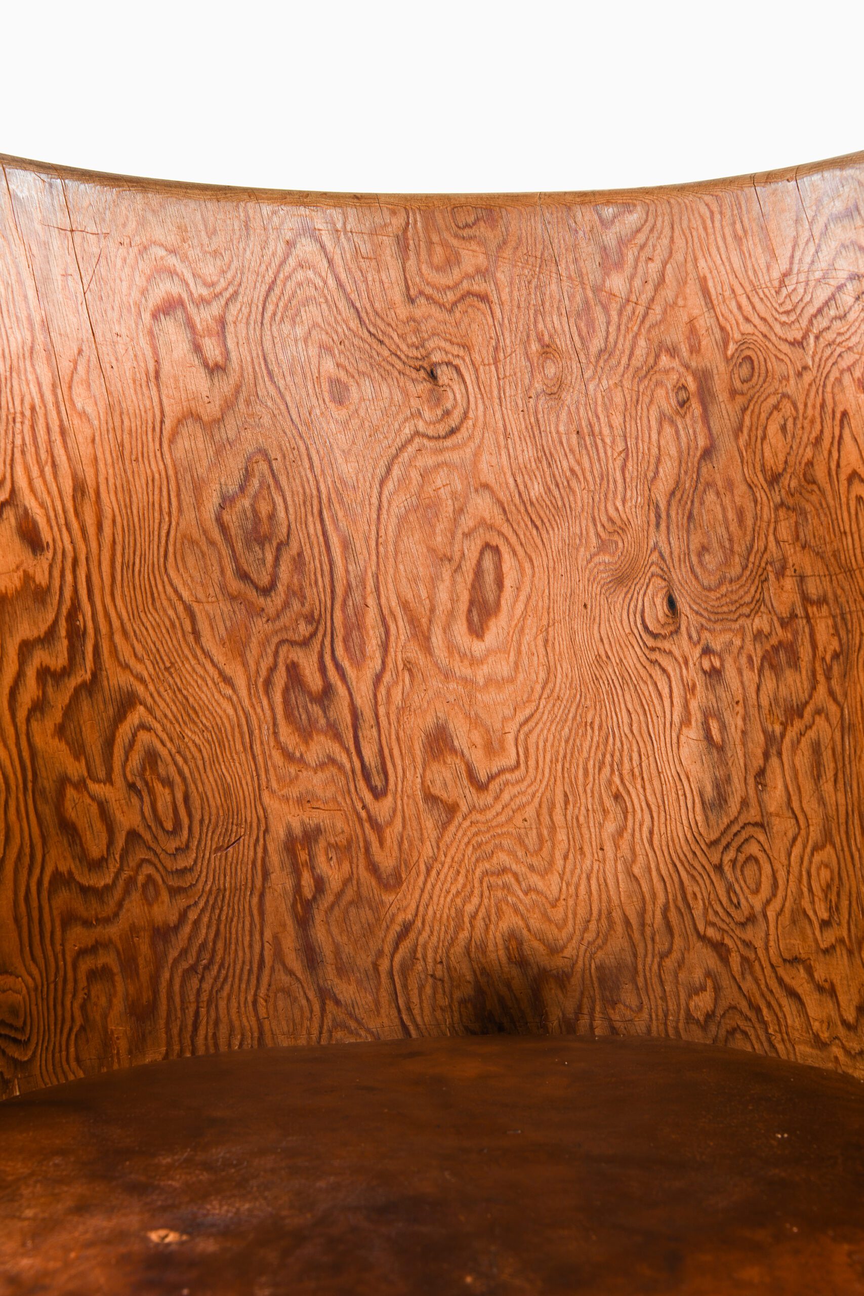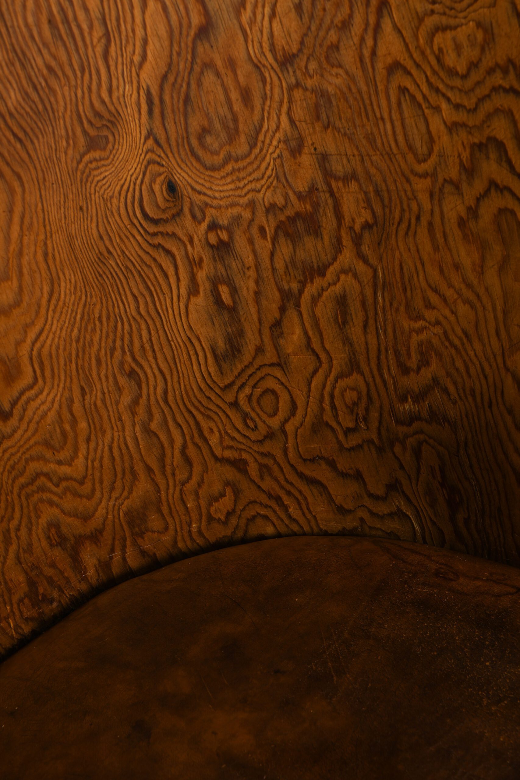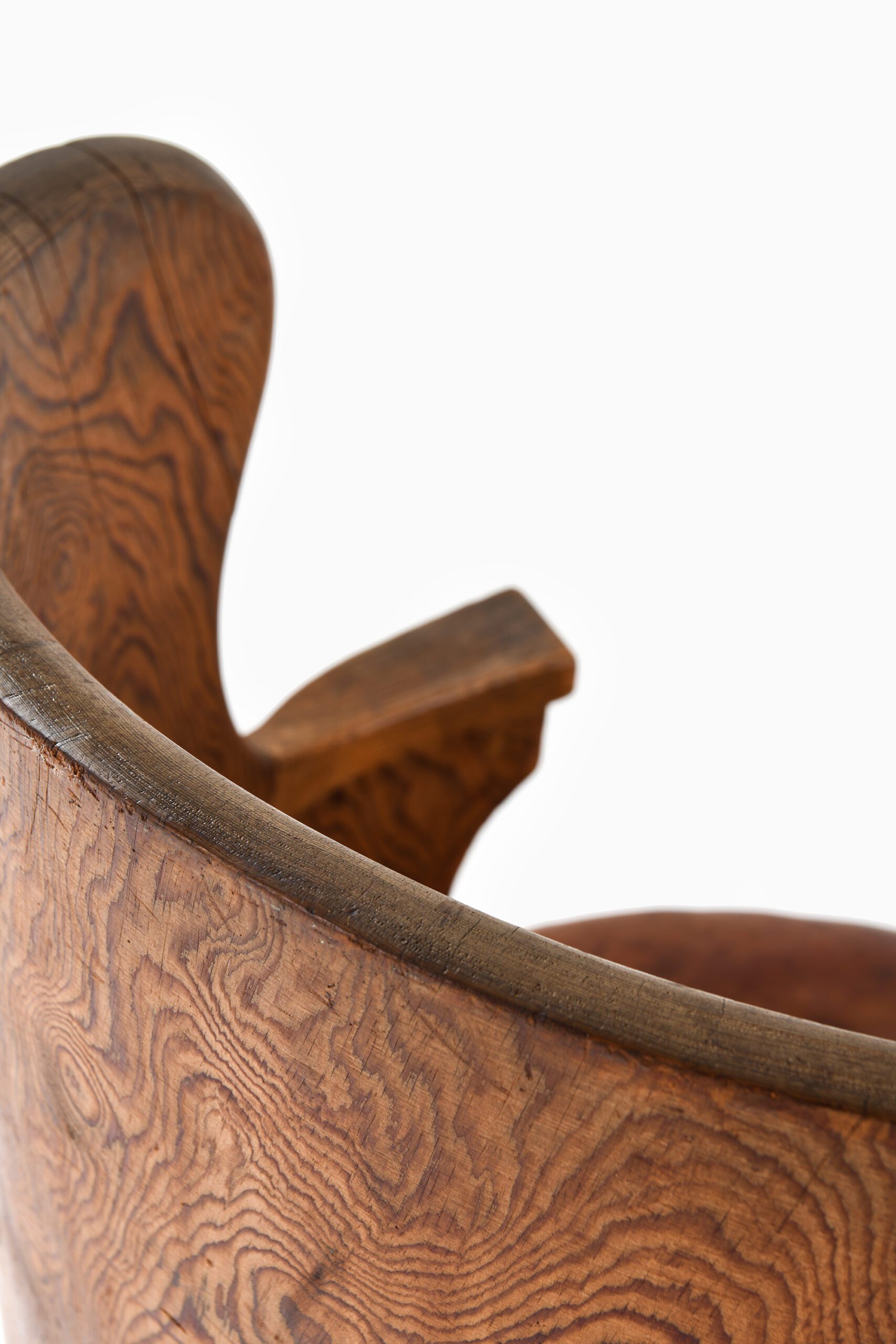 Historically, stump chairs were common in rural Sweden as sturdy, long-lasting seating, but Cederlund’s execution elevates the form to a rare example of early 20th-century sculptural furniture. Its monolithic presence and seamless integration of material and function prefigure later modernist explorations of organic form. The chair remains in good condition: its carved surfaces retain a smooth hand-worn patina, the leather cushion is intact and supple, and the overall structure is stable, making it both a functional seat and a striking artifact of Scandinavian craft heritage.