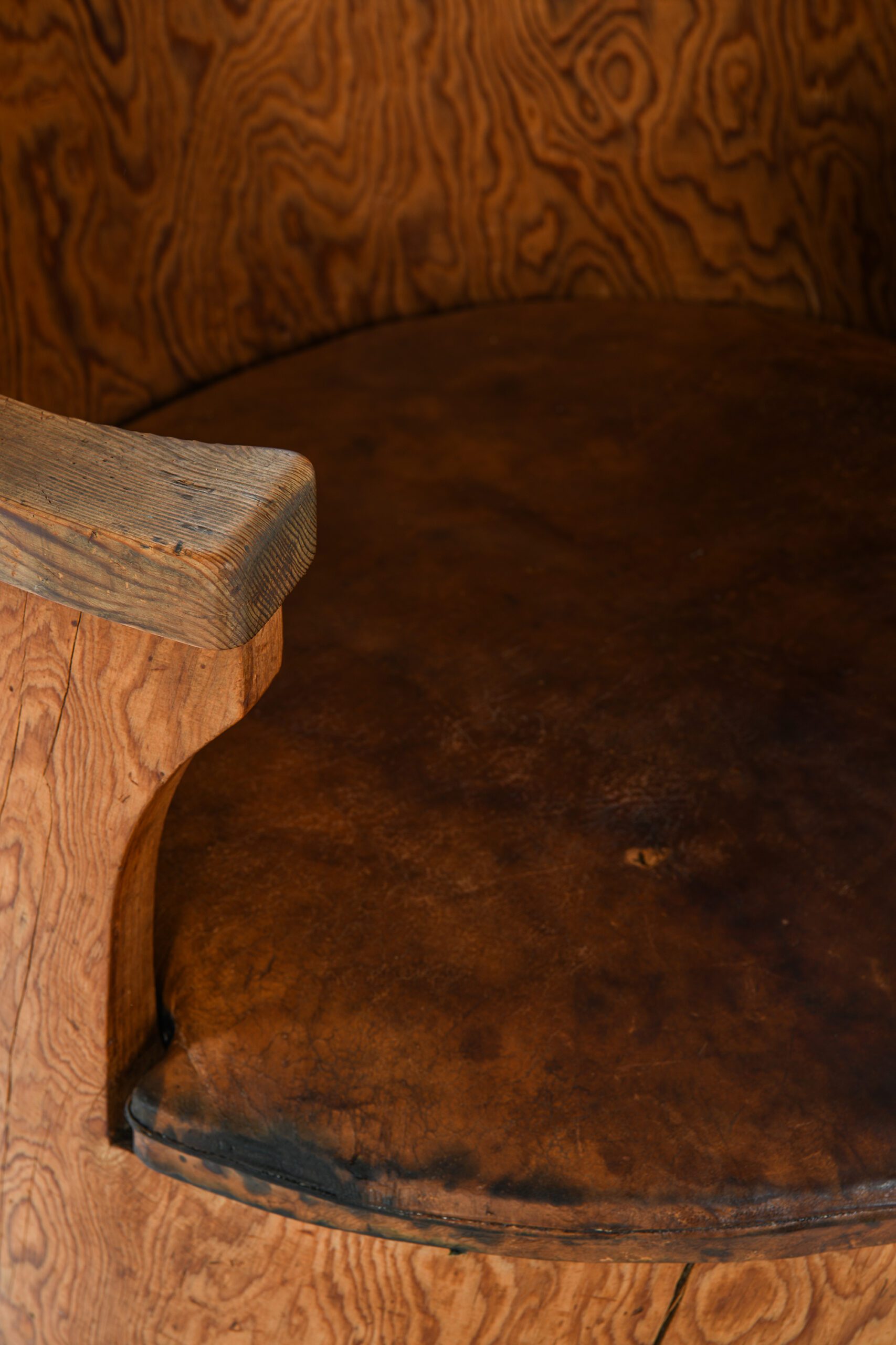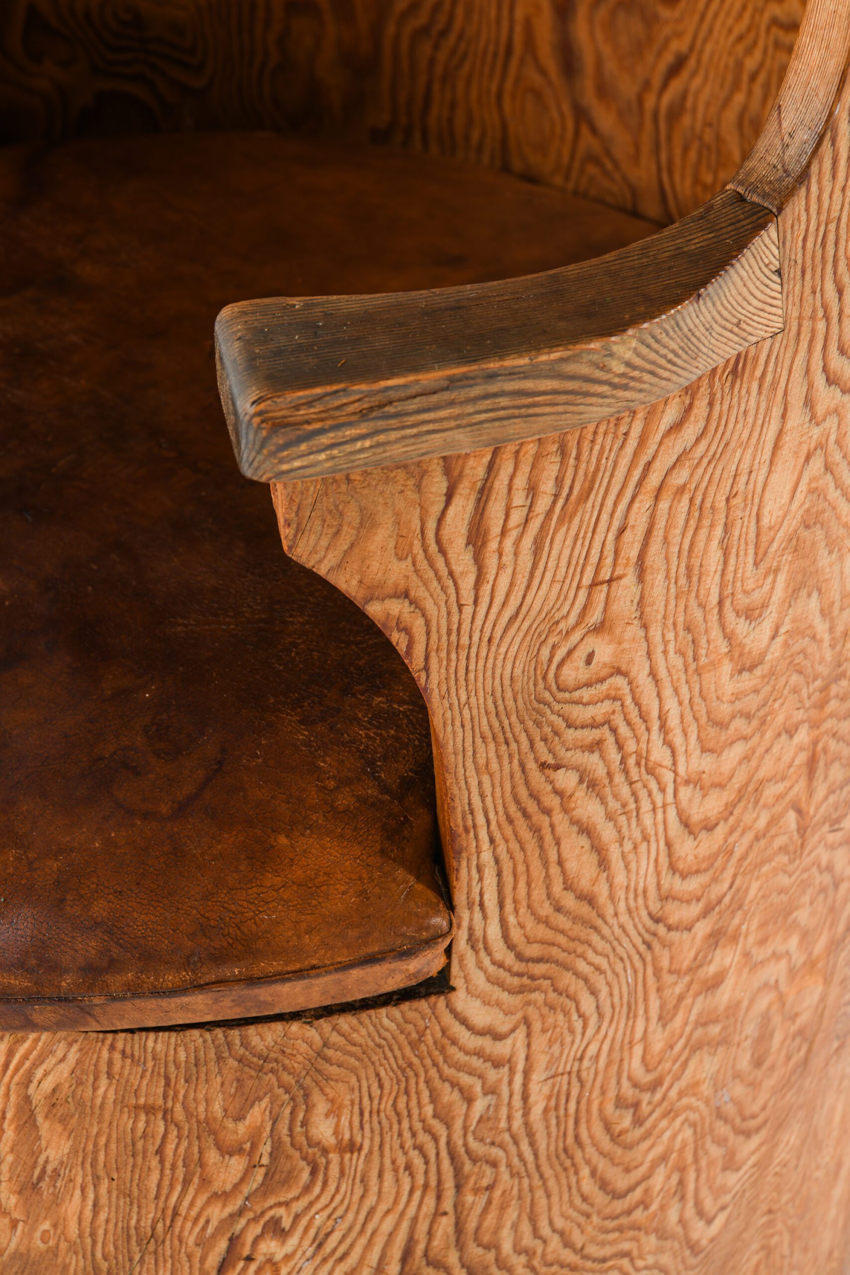 Integrated arm supports emerge organically from the chair’s sidewalls, their rounded tops echoing the chair’s overall silhouette. These supports flow seamlessly into the back, creating a fluid continuity between every surface. The grain of the pine is especially dramatic here: swirling patterns radiate outward from the carved cavity and cascade over the arm supports, highlighting the wood’s natural figure. Small checks and surface splits in the lower section attest to the piece’s age, yet remain stable and add textural interest without compromising structural integrity.