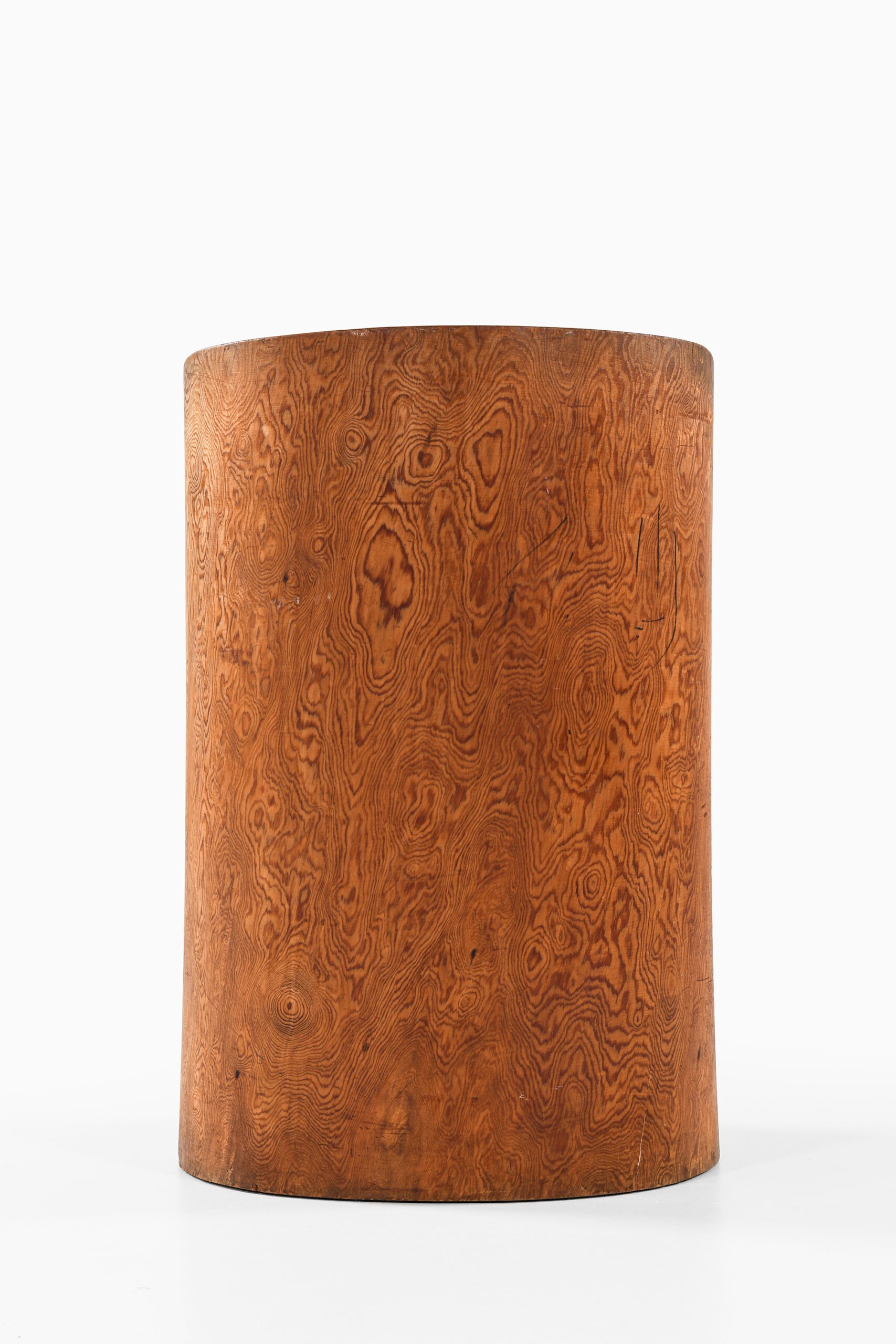 This sculptural stump chair, carved from a single solid pine trunk by Emil Cederlund in Mora, Sweden during the early 1900s, presents a powerful union of material integrity and functional form. The chair’s exterior remains a smooth cylindrical profile, its surface patinated to a warm honey tone by decades of exposure and handling. Within this outer shell, Cederlund excavated a seating cavity, carefully shaping its curved walls to cradle the sitter. The high, enveloping sides sweep upward into a broad, rounded backrest, providing both a sense of enclosure and a commanding presence in any room.