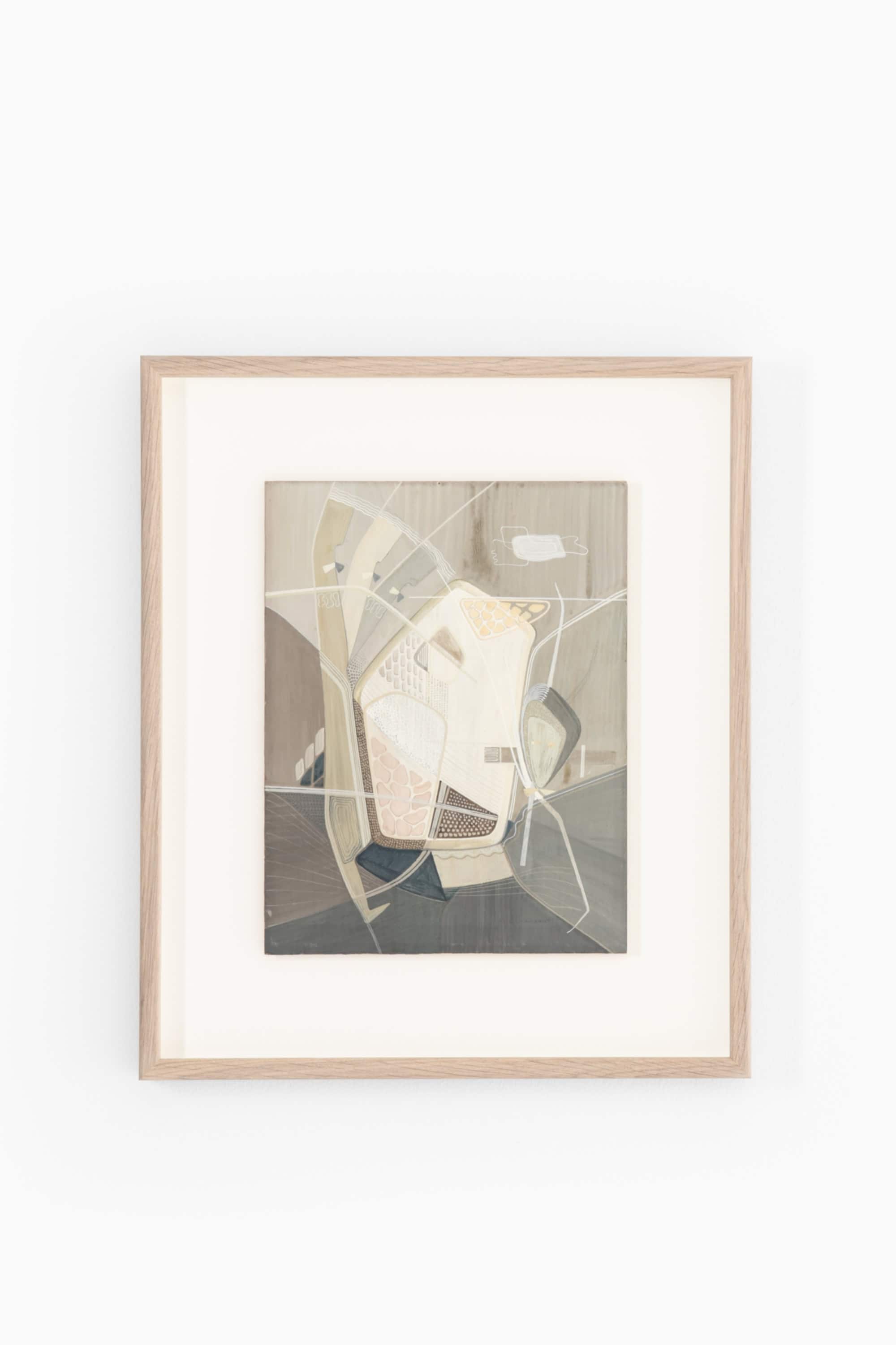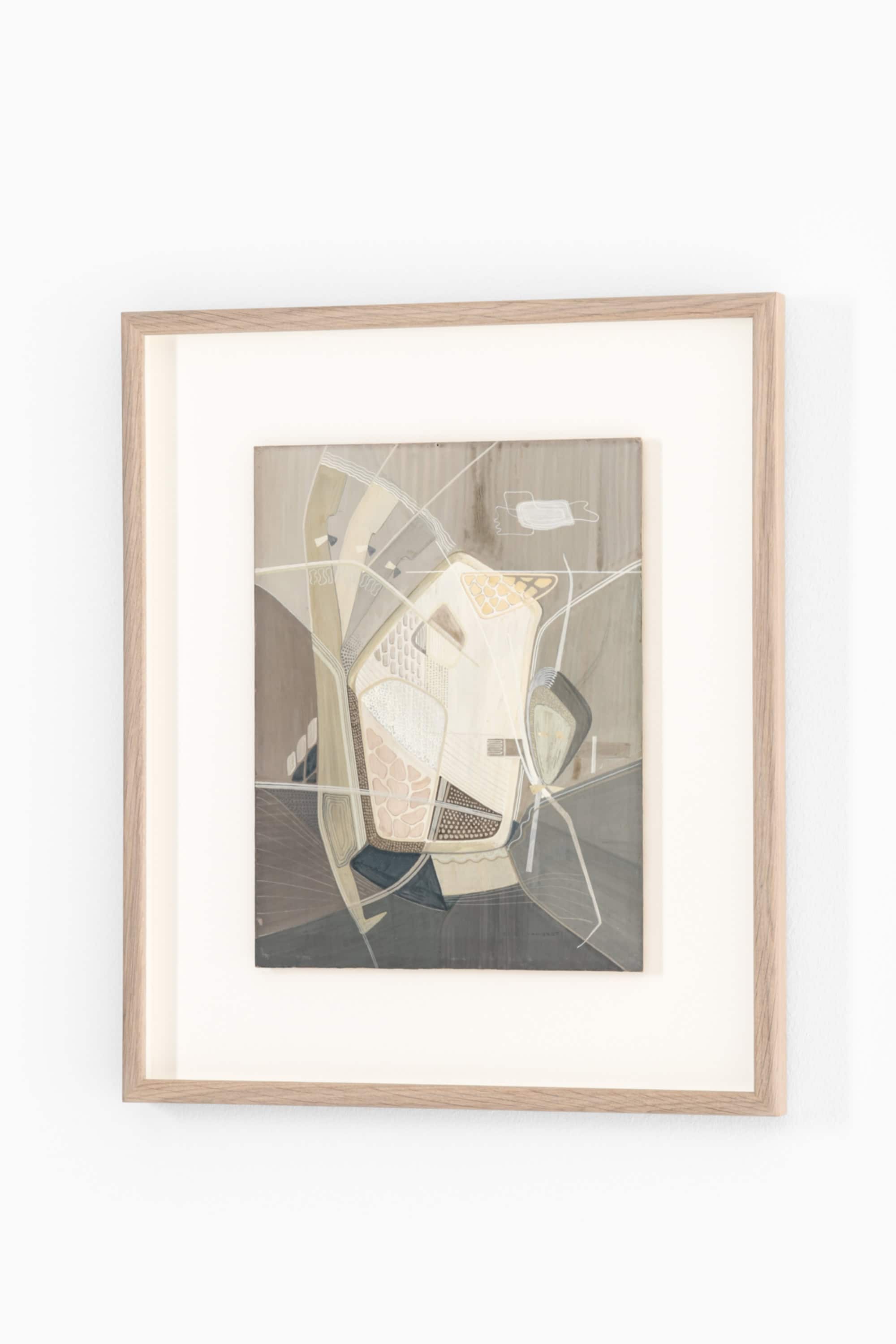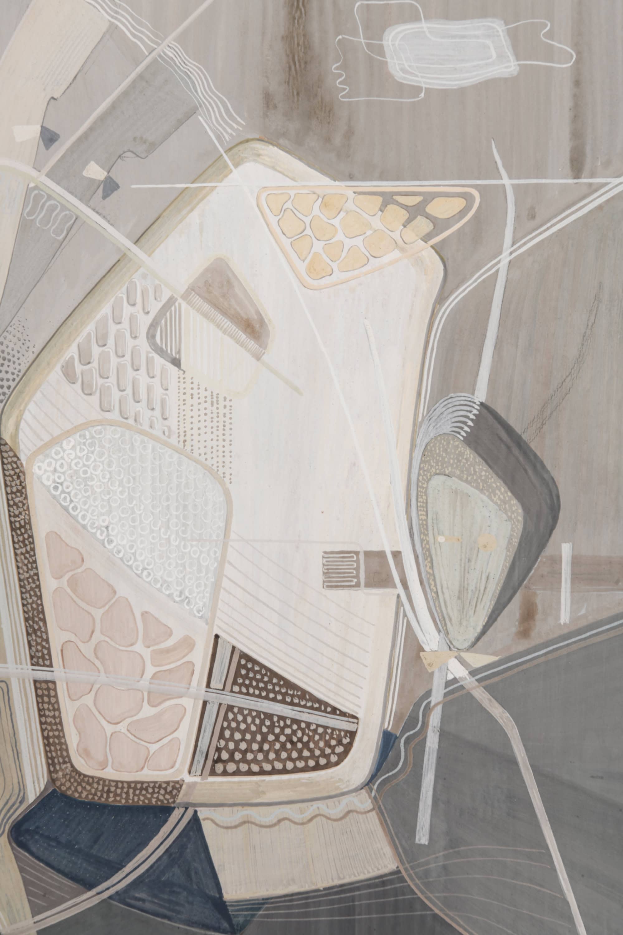 The palette consists of muted tones of grey, beige, ochre, and white, arranged in an intricate, almost architectural pattern. Fine linear detailing and layered surfaces reveal Chambert’s disciplined approach to composition, balancing organic rhythm with structural clarity.