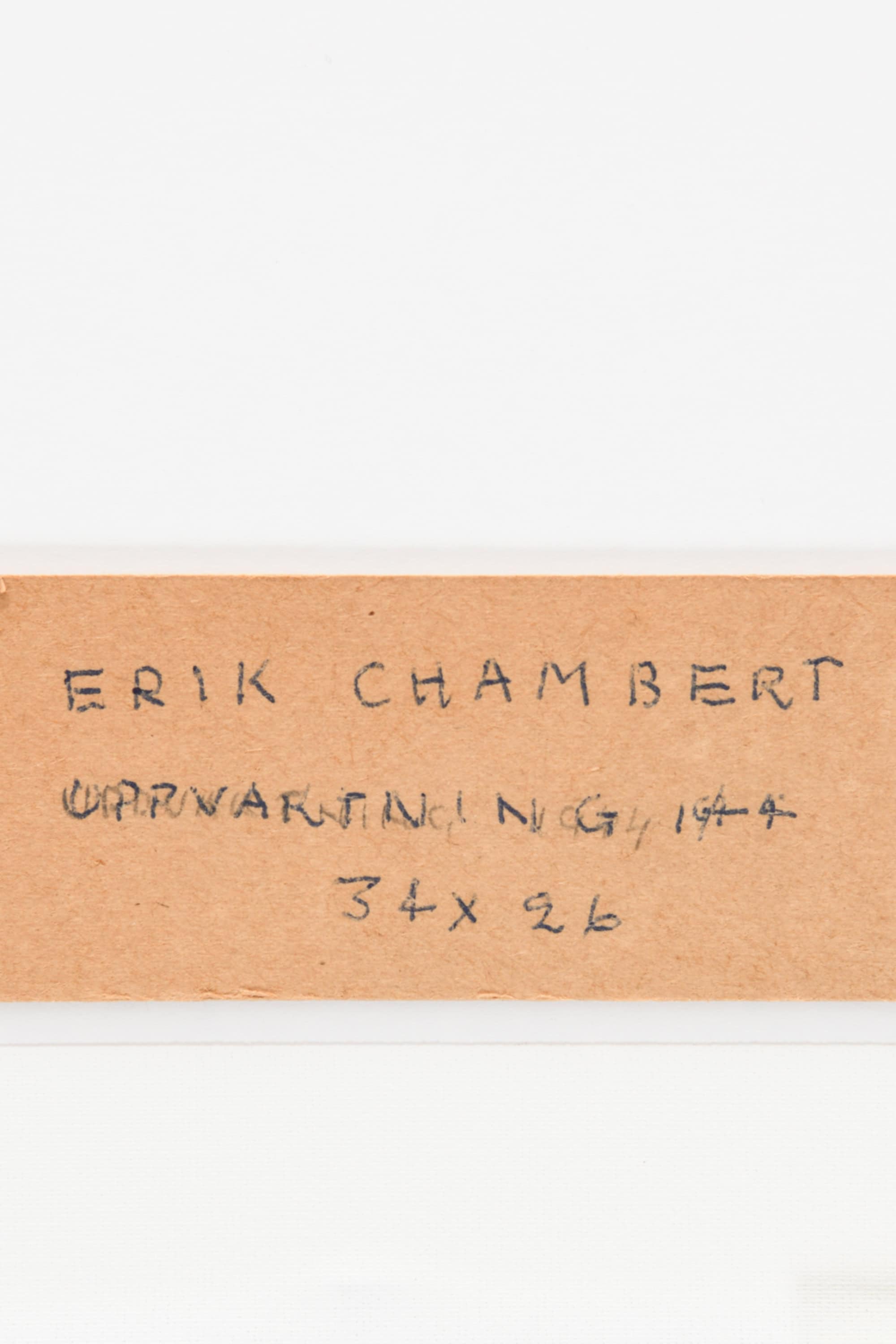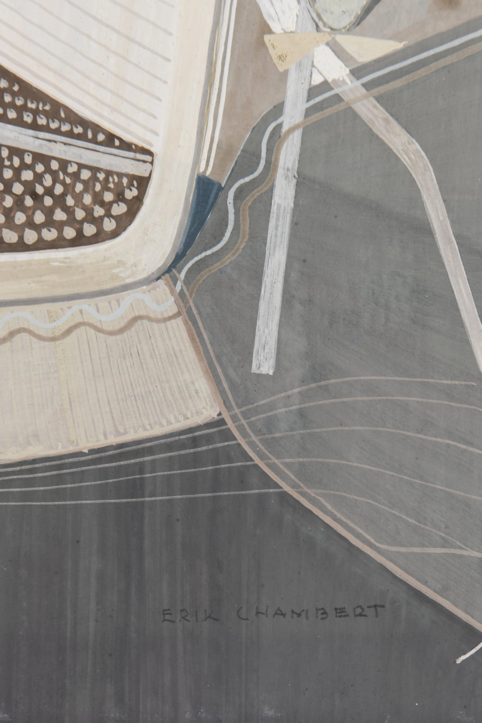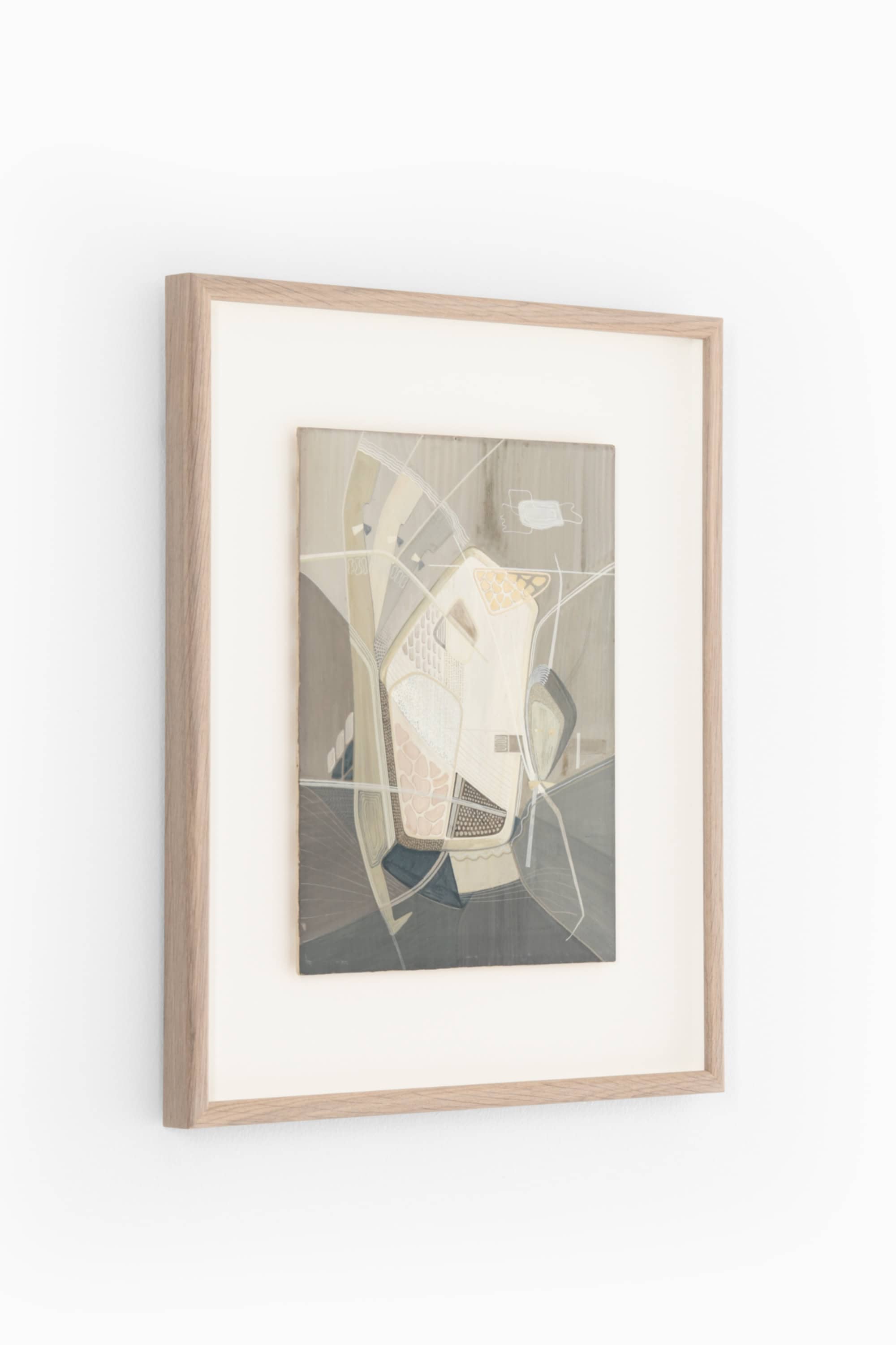 A delicate abstract composition in gouache, signed and dated 1944 by Swedish artist Erik Chambert. The work, titled “Uppvaktning” (which translates to “Courtship”), reflects Chambert’s distinct modernist visual language characterized by geometric abstraction and subtle interplay of color and form.