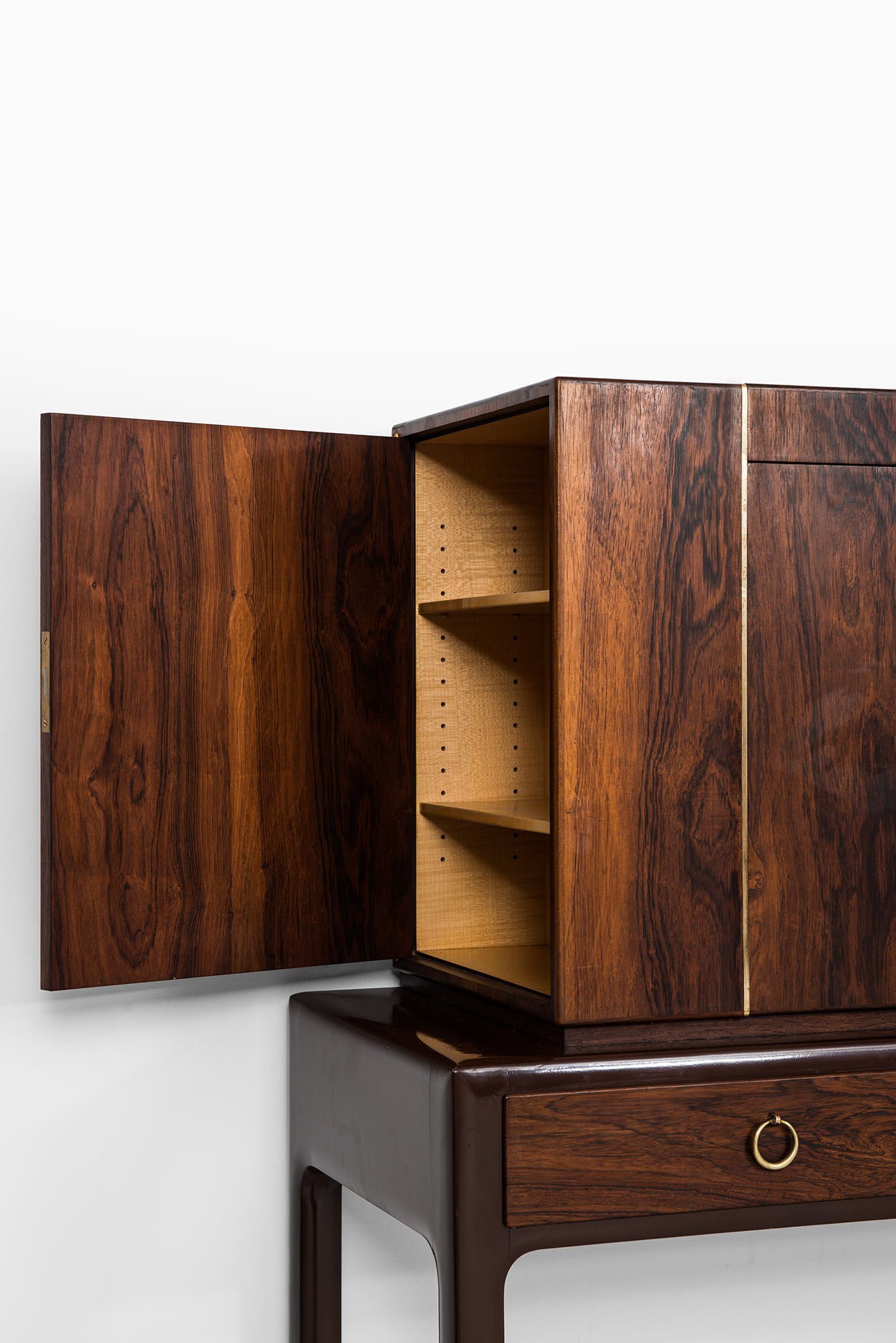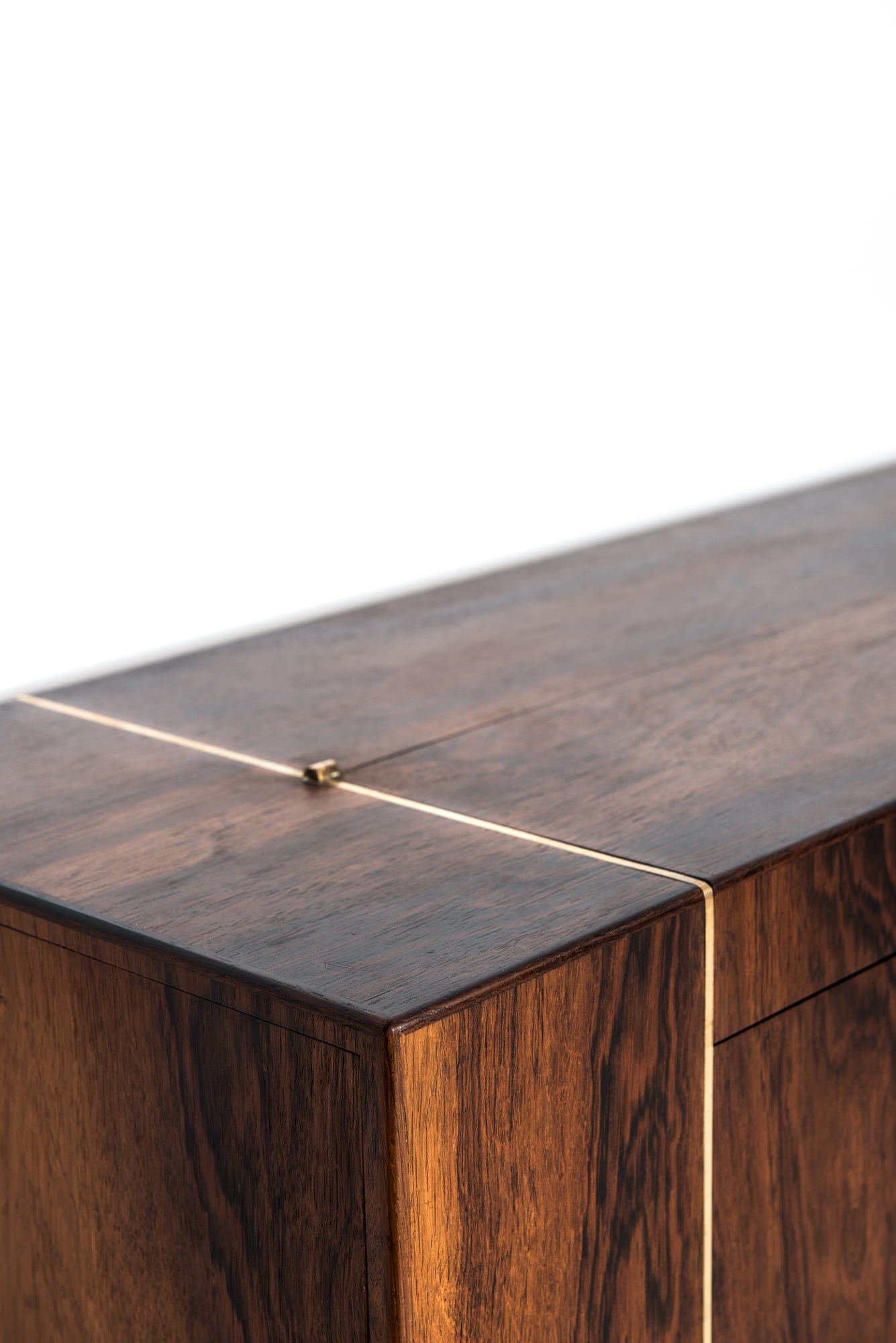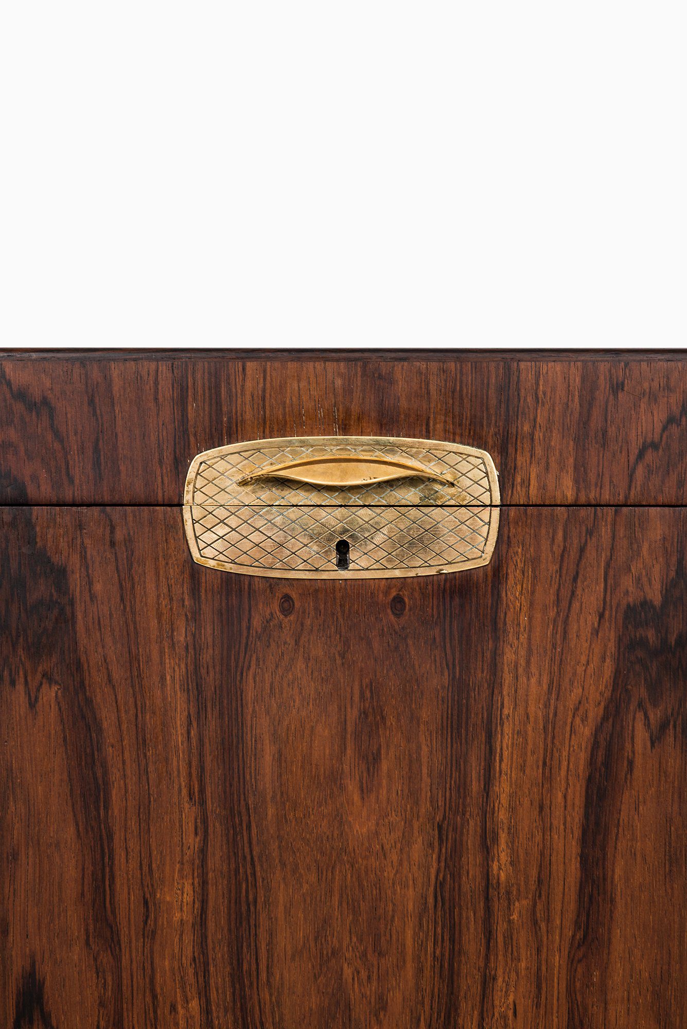 This is an exceptionally rare and finely crafted bar cabinet designed by Ernst Kühn and produced by Lysberg, Hansen & Therp in Denmark during the 1930s. The cabinet is made from richly grained rosewood, with a warm, reddish-brown lacquered frame that provides a subtle contrast and enhances the depth of the wood’s natural pattern. Vertical brass inlays run along the front, adding a refined decorative element and emphasizing the geometric proportions of the design. The piece rests on slender square legs with brass sabots, lending an elegant and slightly elevated appearance.