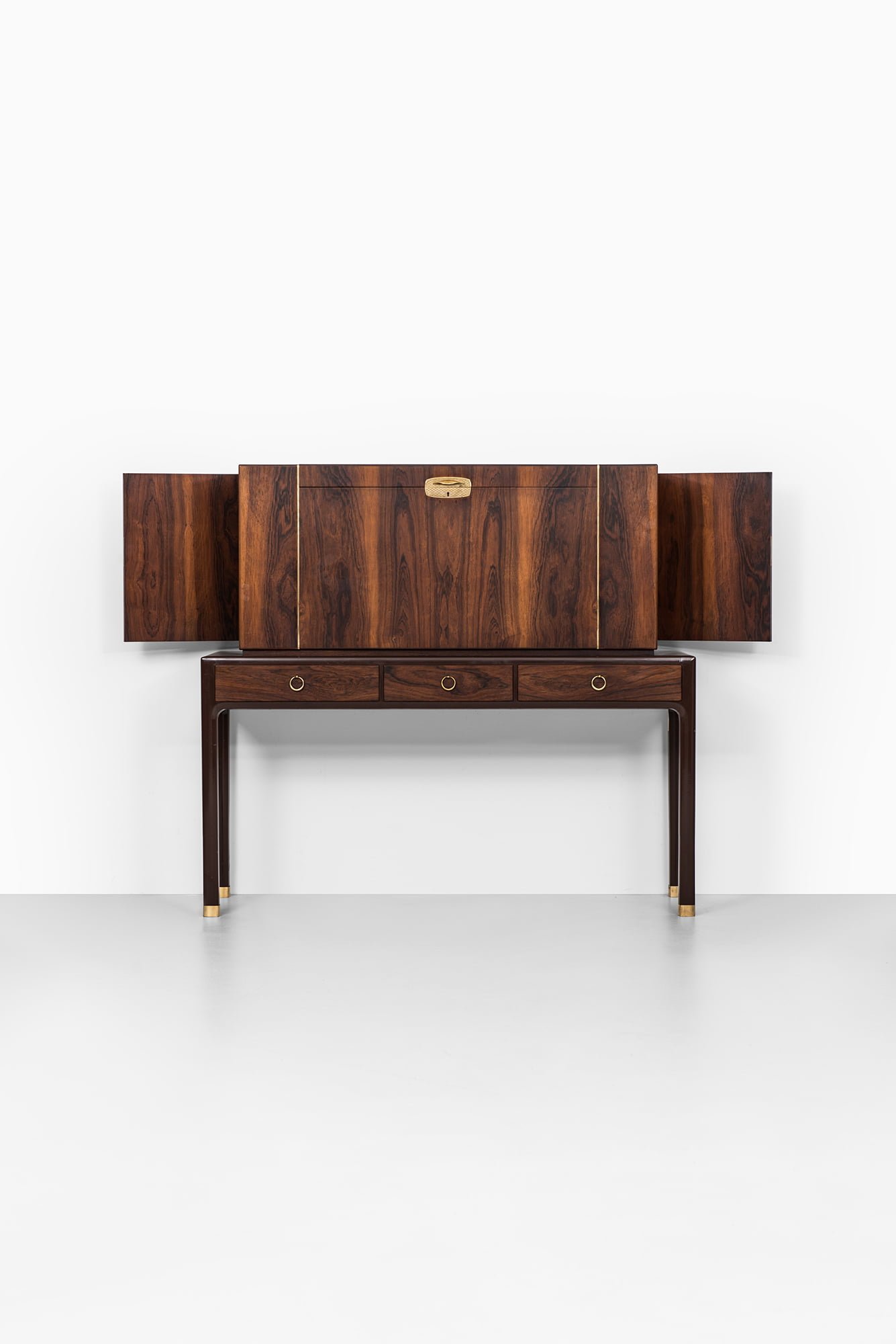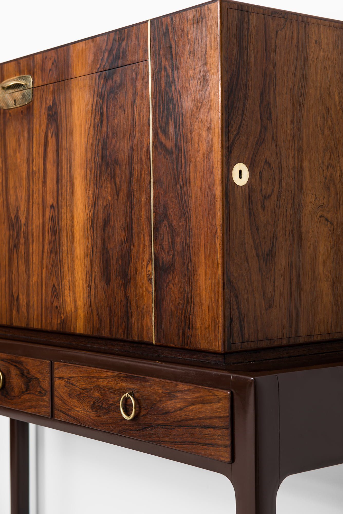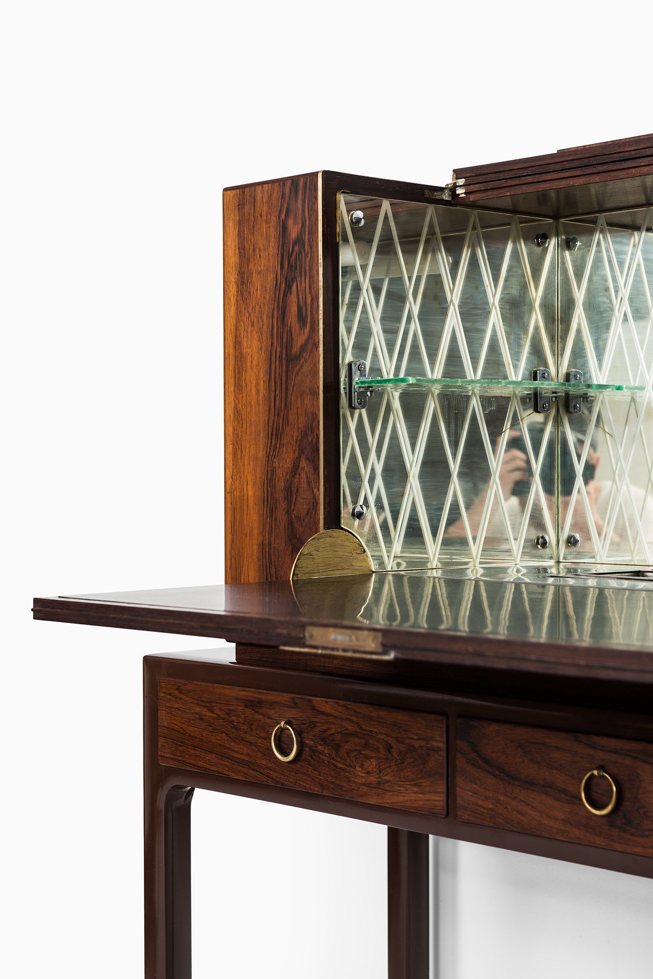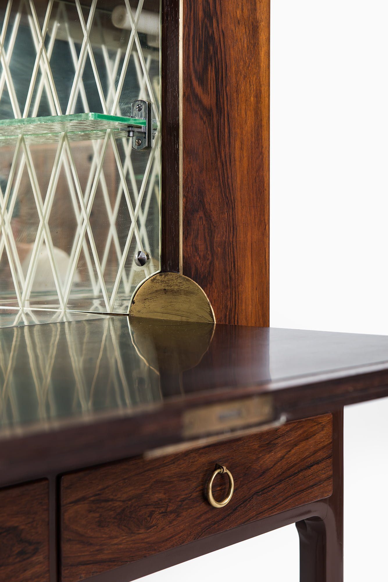 This is an exceptionally rare and finely crafted bar cabinet designed by Ernst Kühn and produced by Lysberg, Hansen & Therp in Denmark during the 1930s. The cabinet is made from richly grained rosewood, with a warm, reddish-brown lacquered frame that provides a subtle contrast and enhances the depth of the wood’s natural pattern. Vertical brass inlays run along the front, adding a refined decorative element and emphasizing the geometric proportions of the design. The piece rests on slender square legs with brass sabots, lending an elegant and slightly elevated appearance.