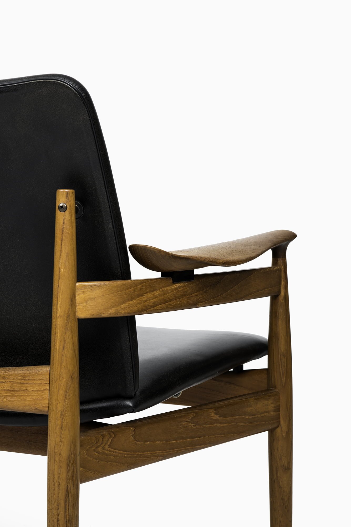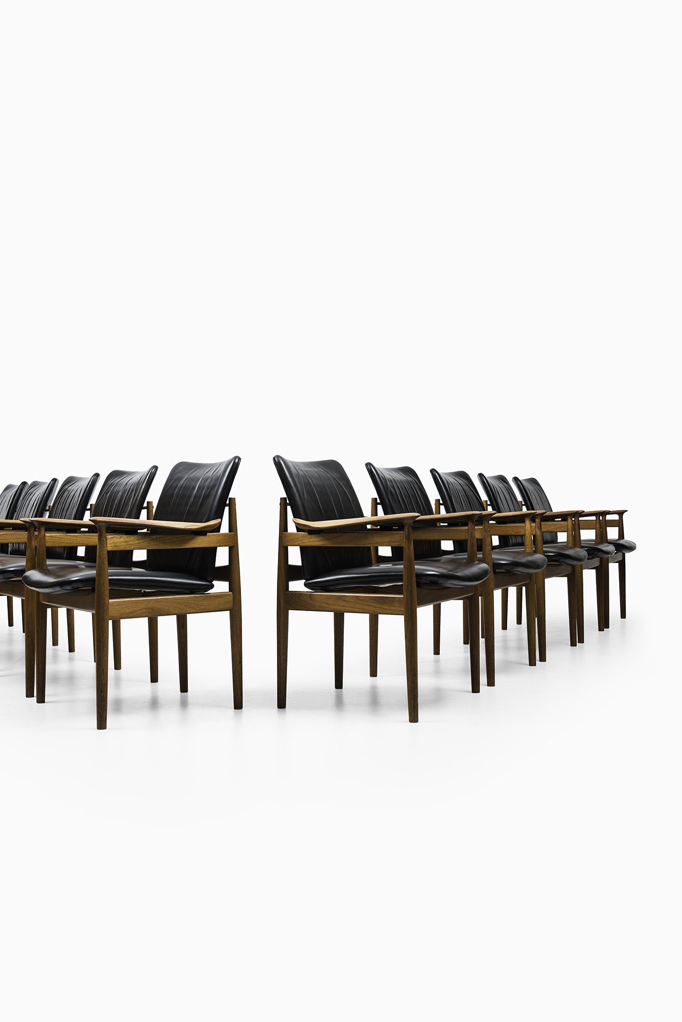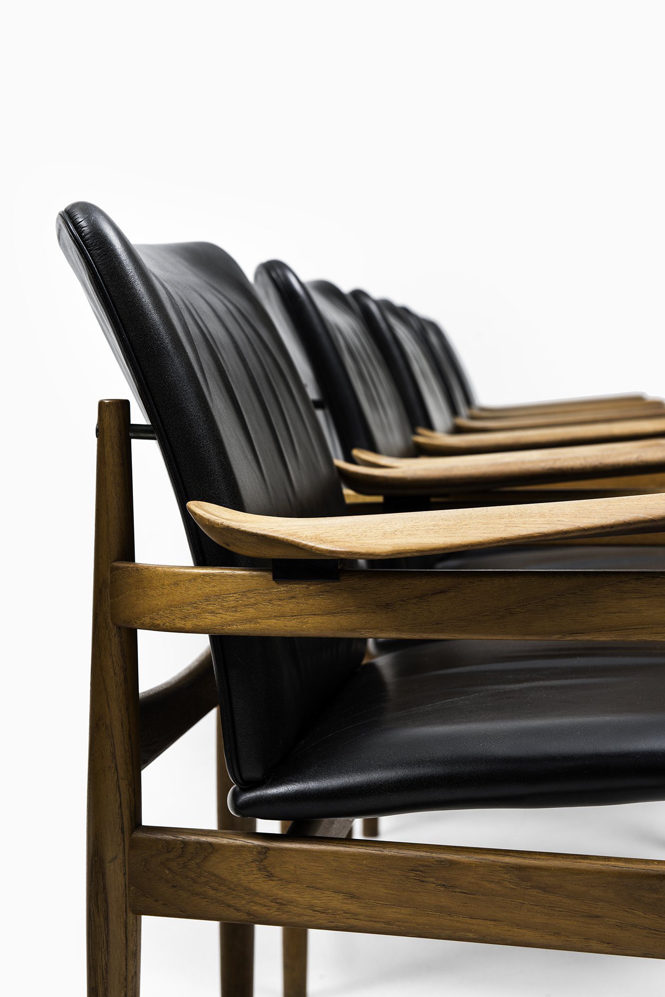 This rare set of ten armchairs, model 192, was designed by Finn Juhl and produced by France & Son in Denmark in 1961. The chairs are constructed in solid teak with a warm, even tone, showing the fine grain pattern characteristic of the species. The armrests are sculpted with subtle curvature, a hallmark of Juhl’s approach to organic shaping and his desire to make furniture that appears almost alive. The seats and backs are upholstered in black leather, which provides a soft contrast to the wood frame and has developed a natural sheen over time.