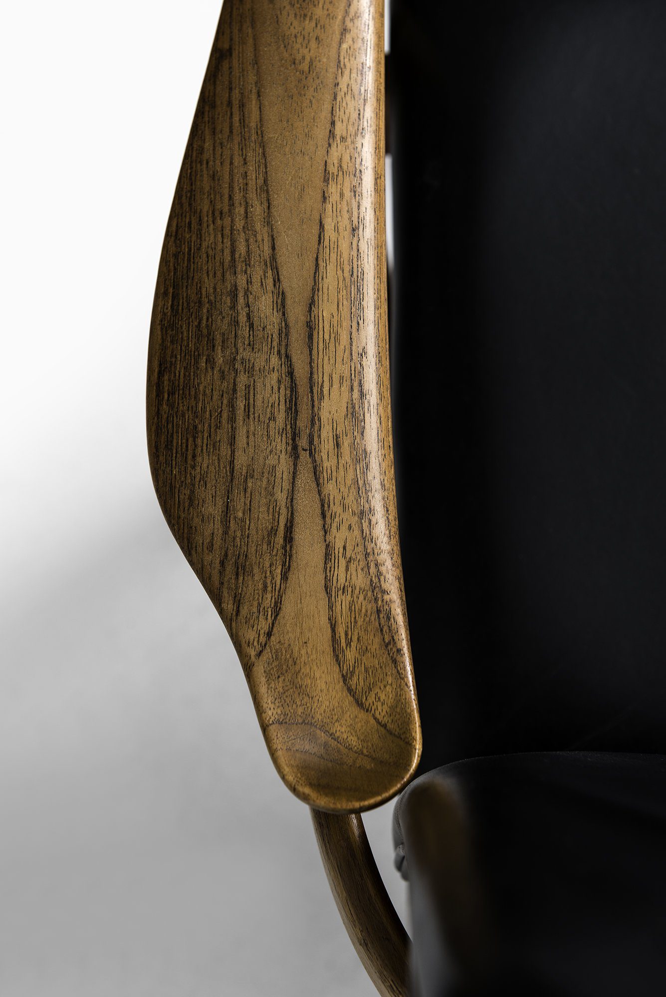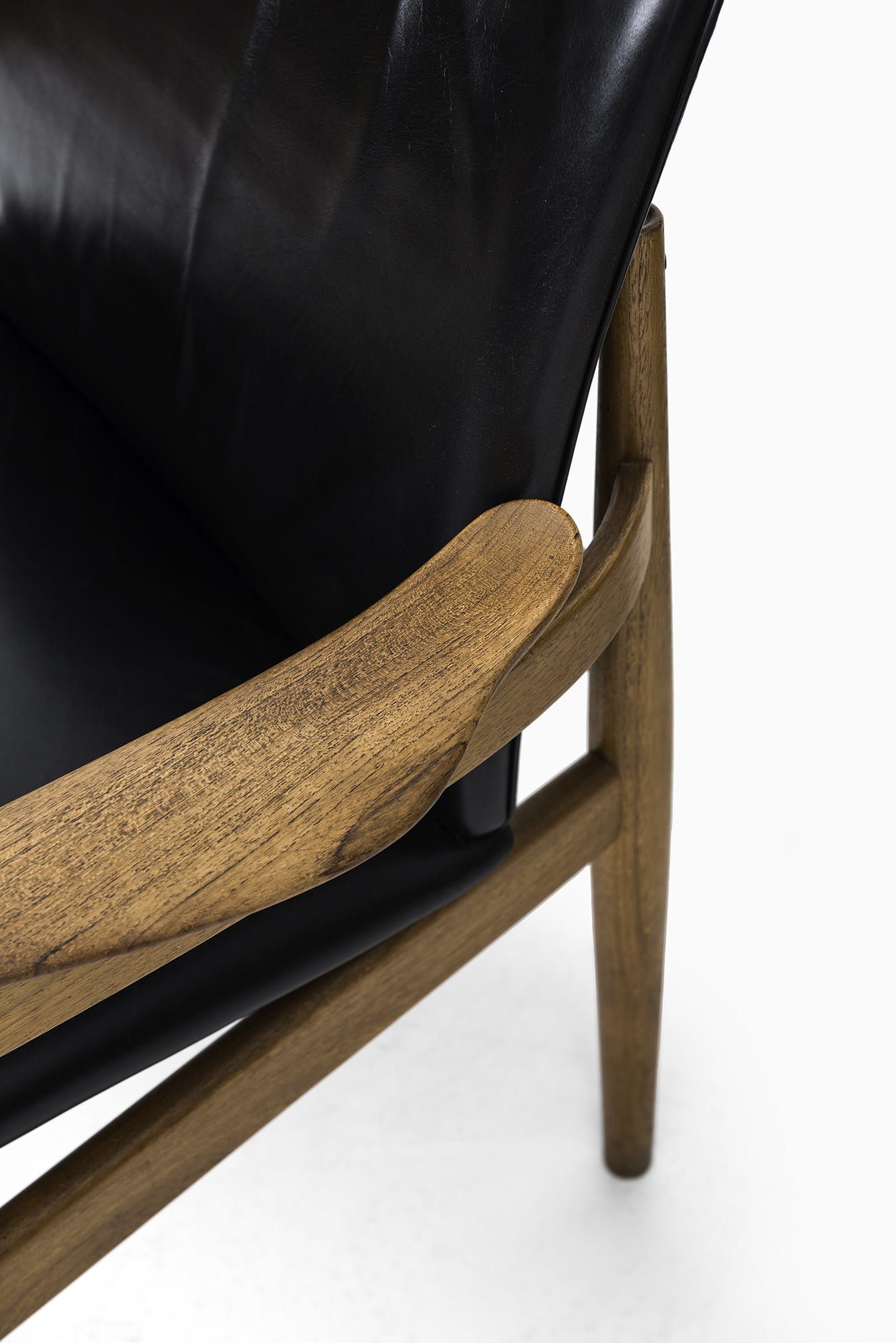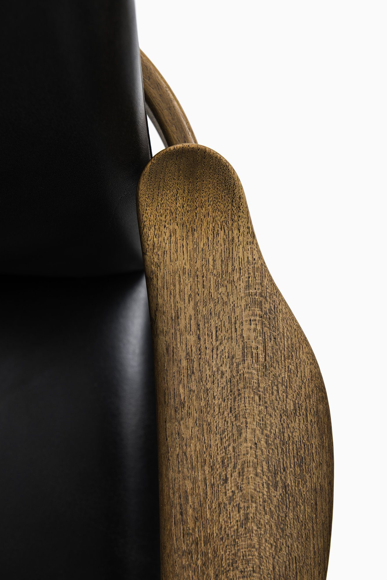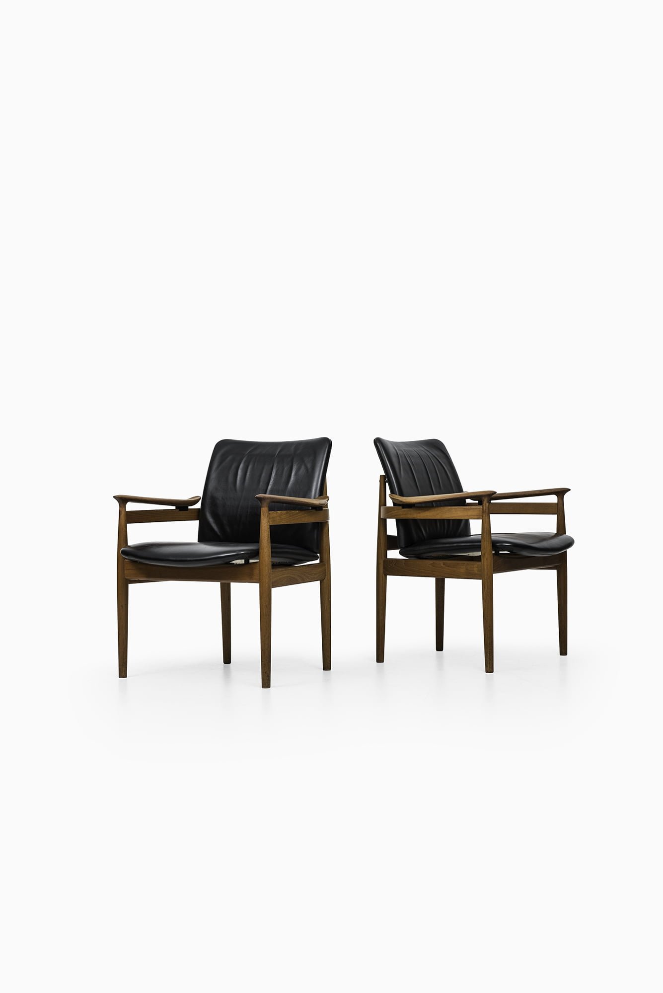 This rare set of ten armchairs, model 192, was designed by Finn Juhl and produced by France & Son in Denmark in 1961. The chairs are constructed in solid teak with a warm, even tone, showing the fine grain pattern characteristic of the species. The armrests are sculpted with subtle curvature, a hallmark of Juhl’s approach to organic shaping and his desire to make furniture that appears almost alive. The seats and backs are upholstered in black leather, which provides a soft contrast to the wood frame and has developed a natural sheen over time.
