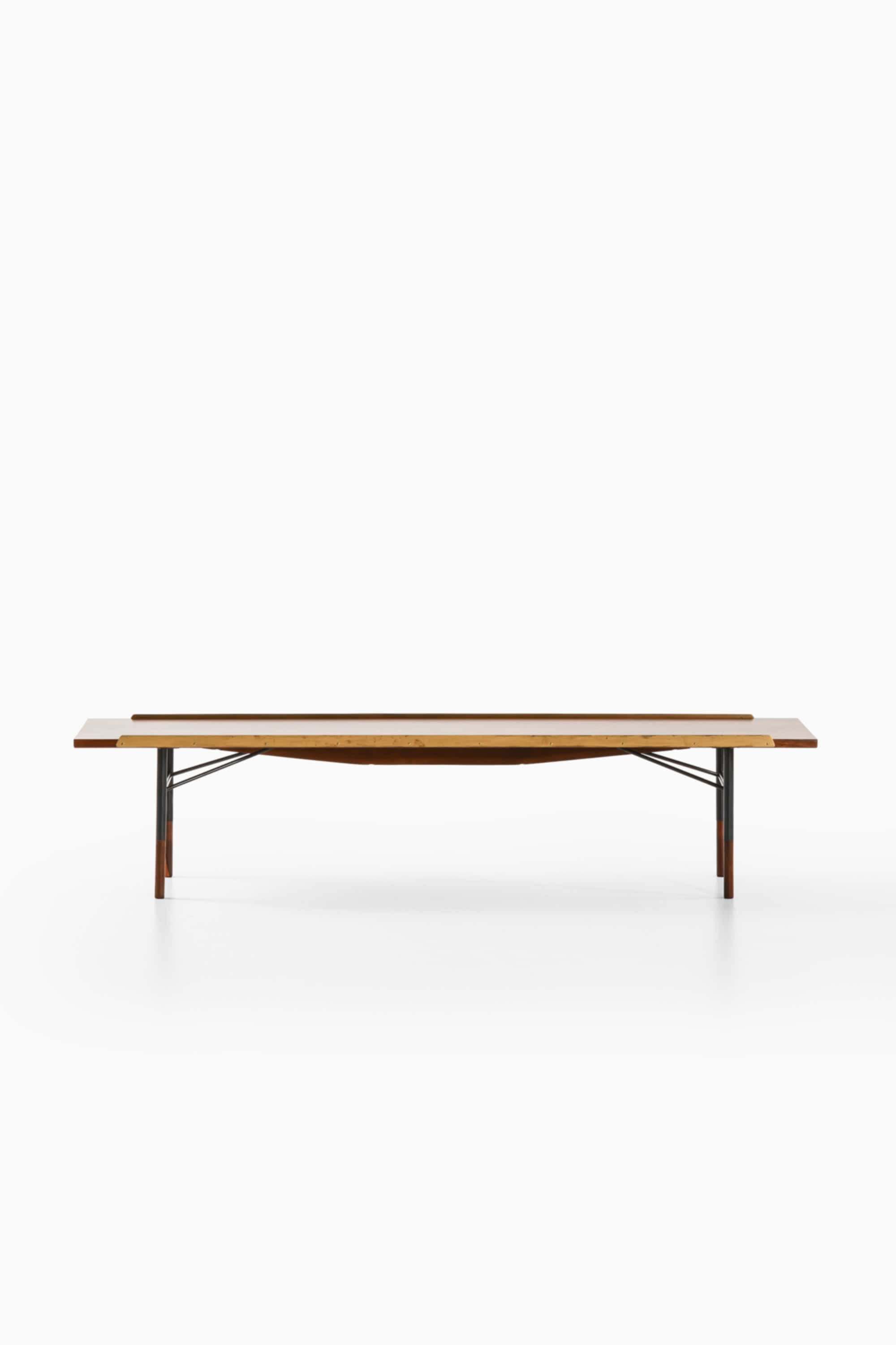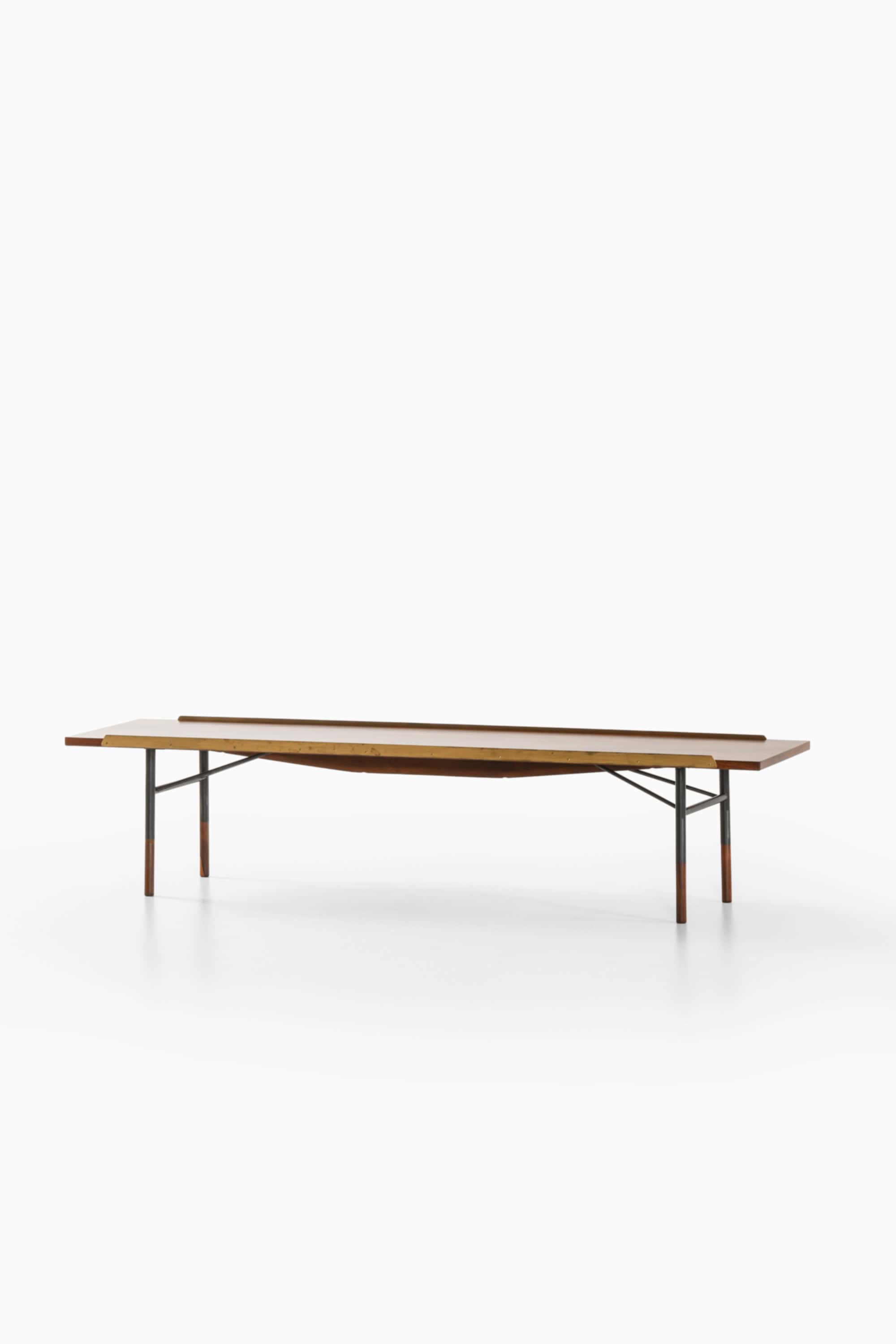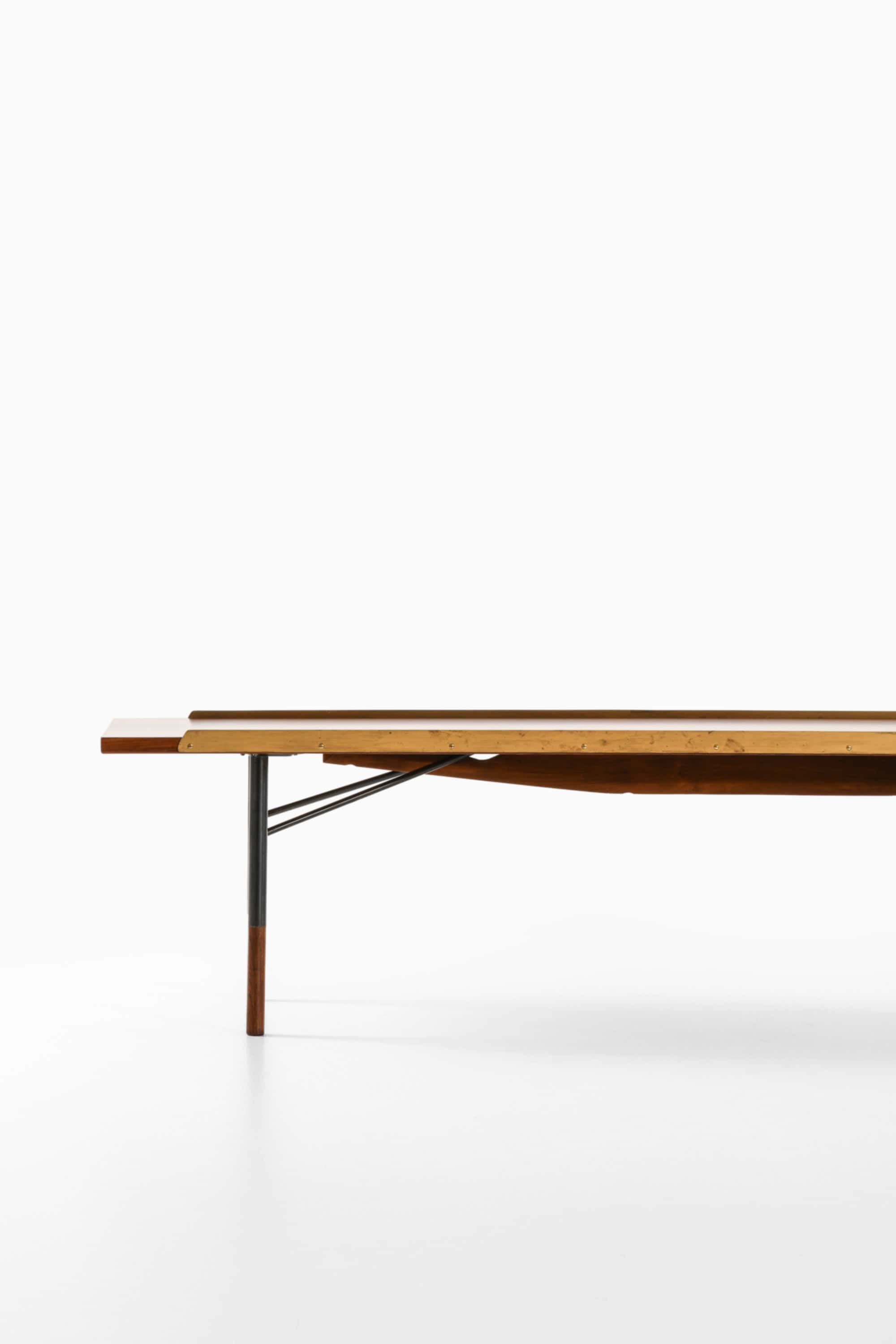 The bench rests on cylindrical legs composed of blackened metal with rosewood feet. These legs are connected by a system of metal braces arranged diagonally beneath the top, providing stability while maintaining an open, lightweight structure. The underside also features a suspended wooden panel that subtly curves along the length of the bench, an element characteristic of Finn Juhl’s sculptural approach to furniture construction.
