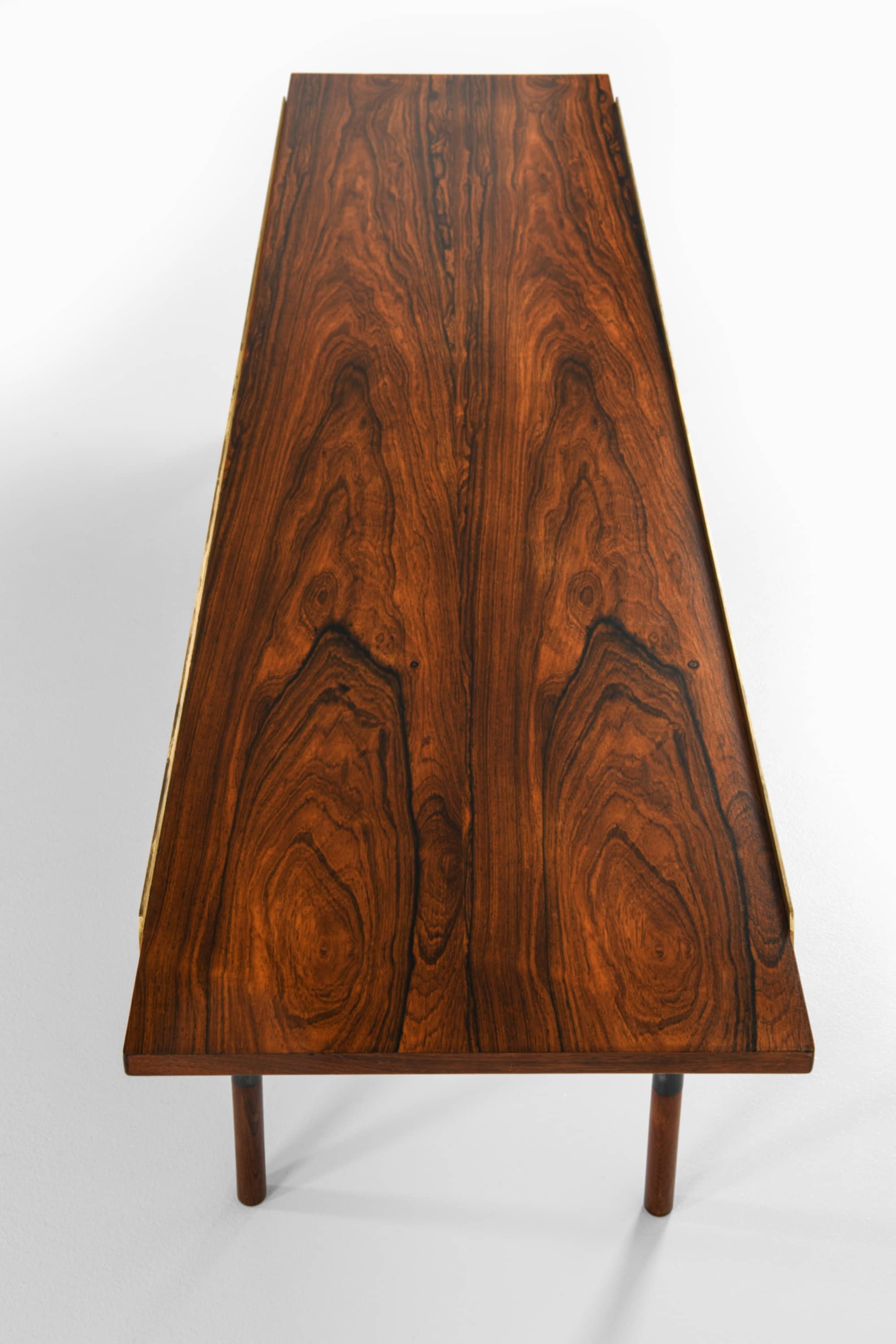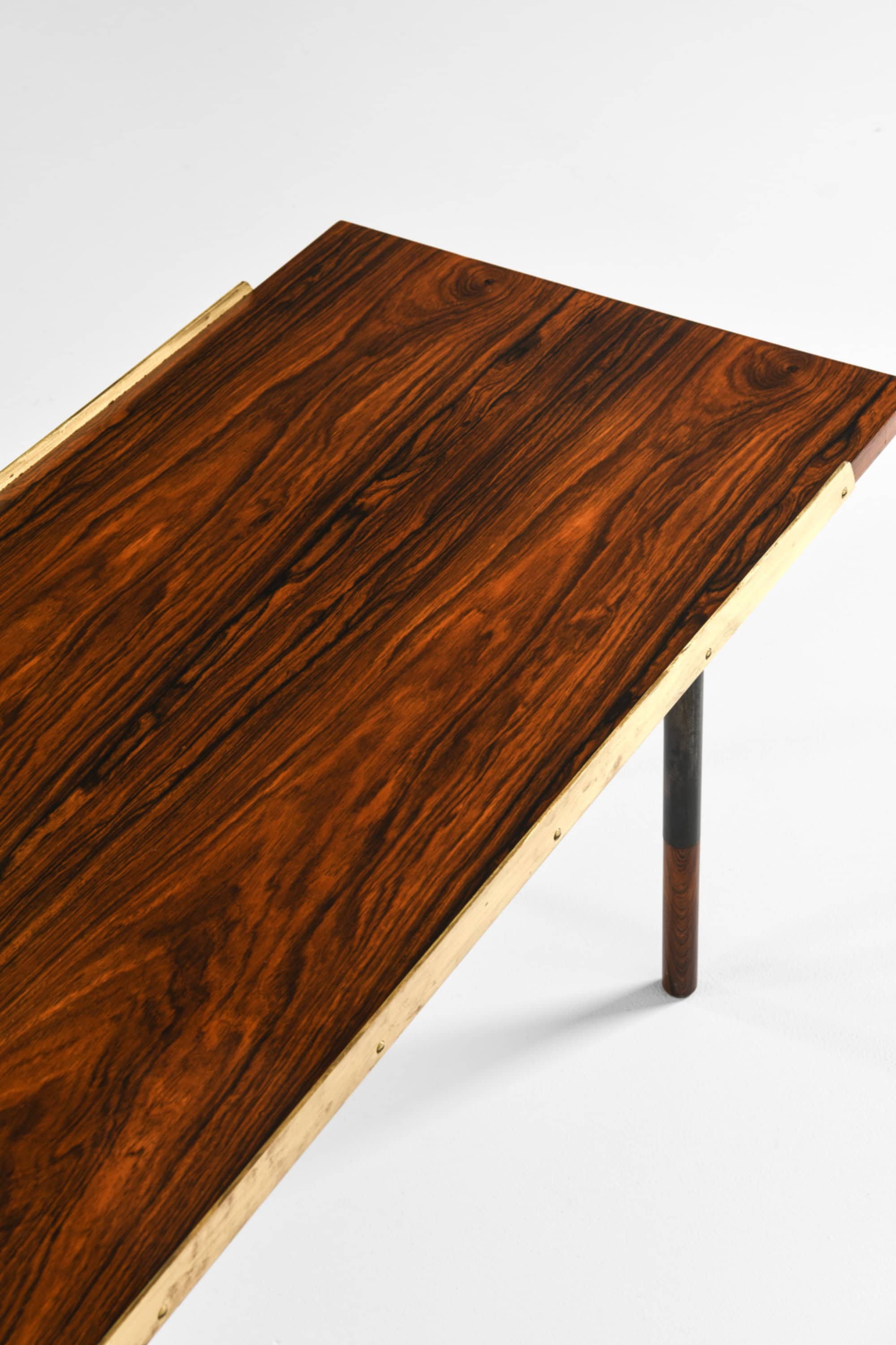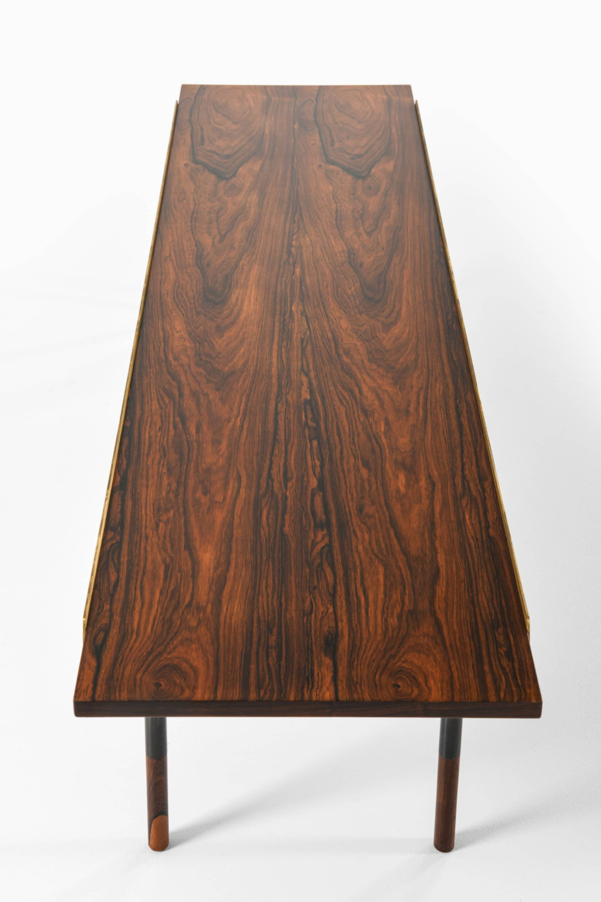 This rare bench or side table, model BO-101, was designed by Finn Juhl and produced by Bovirke in Denmark in 1953. The piece is crafted in rosewood with brass details, combining a richly figured hardwood surface with industrial structural elements. The long, rectangular top displays a striking rosewood grain pattern with deep tonal variations and a highly polished finish. Brass edging runs along the sides of the top, secured with visible screws, forming a functional and decorative boundary that reinforces the edge and introduces a refined metallic contrast.