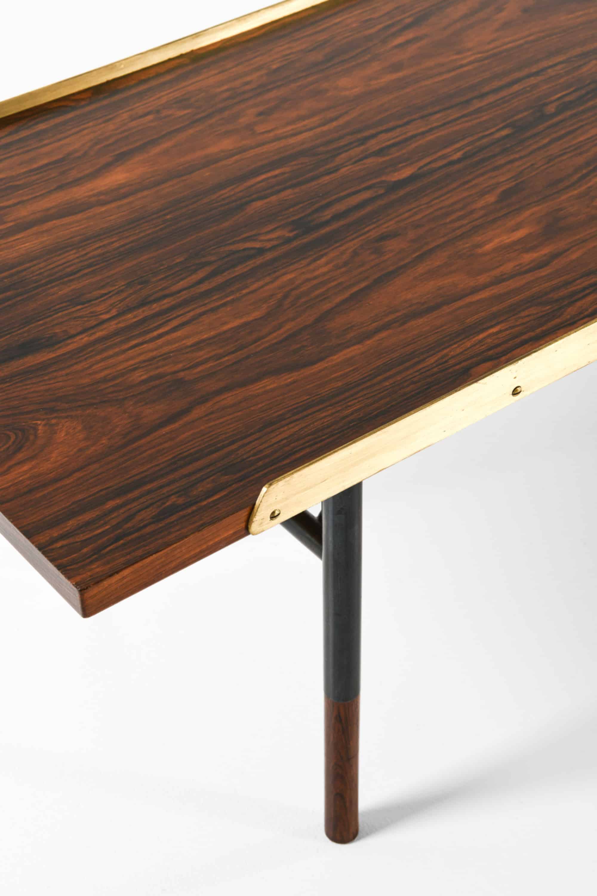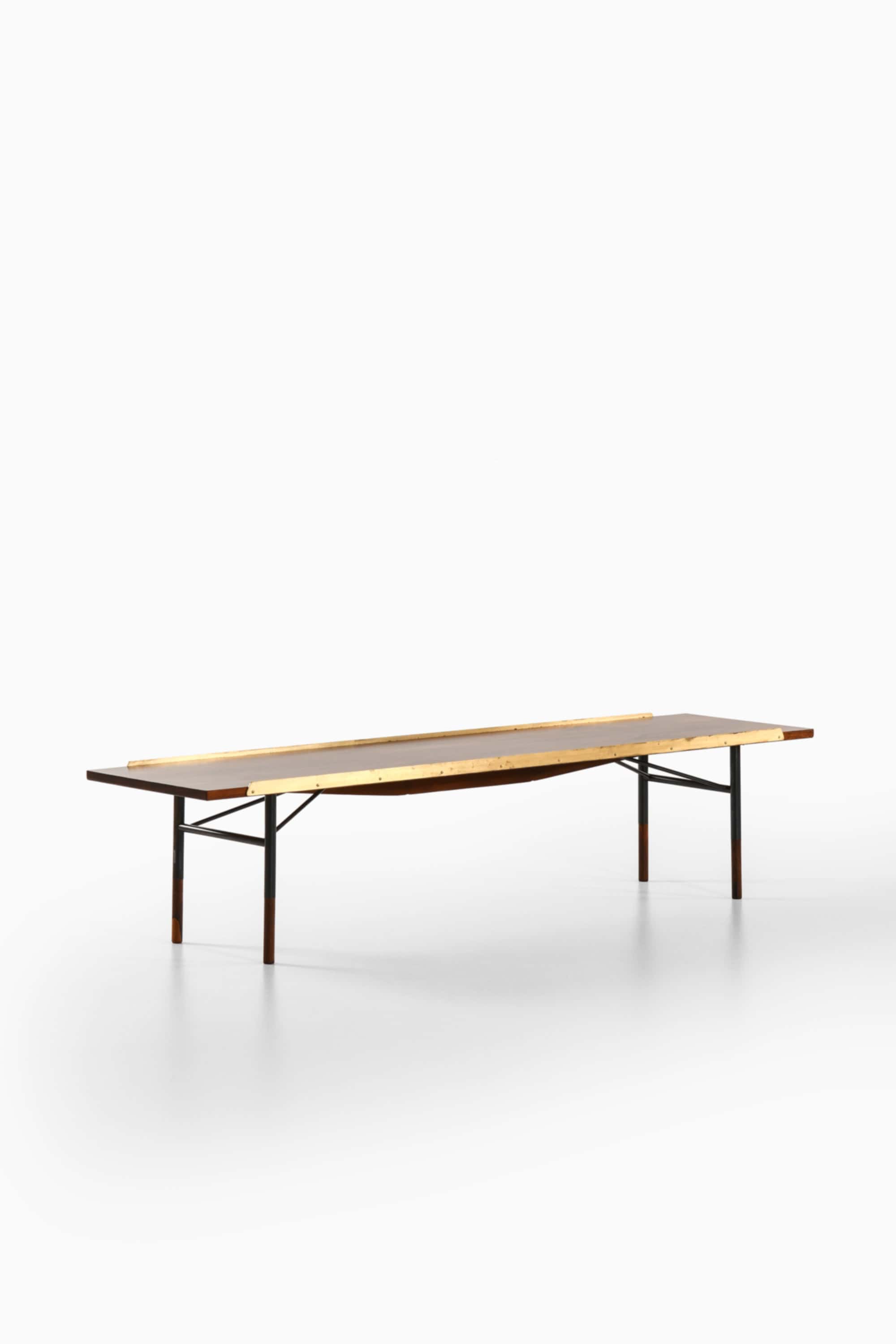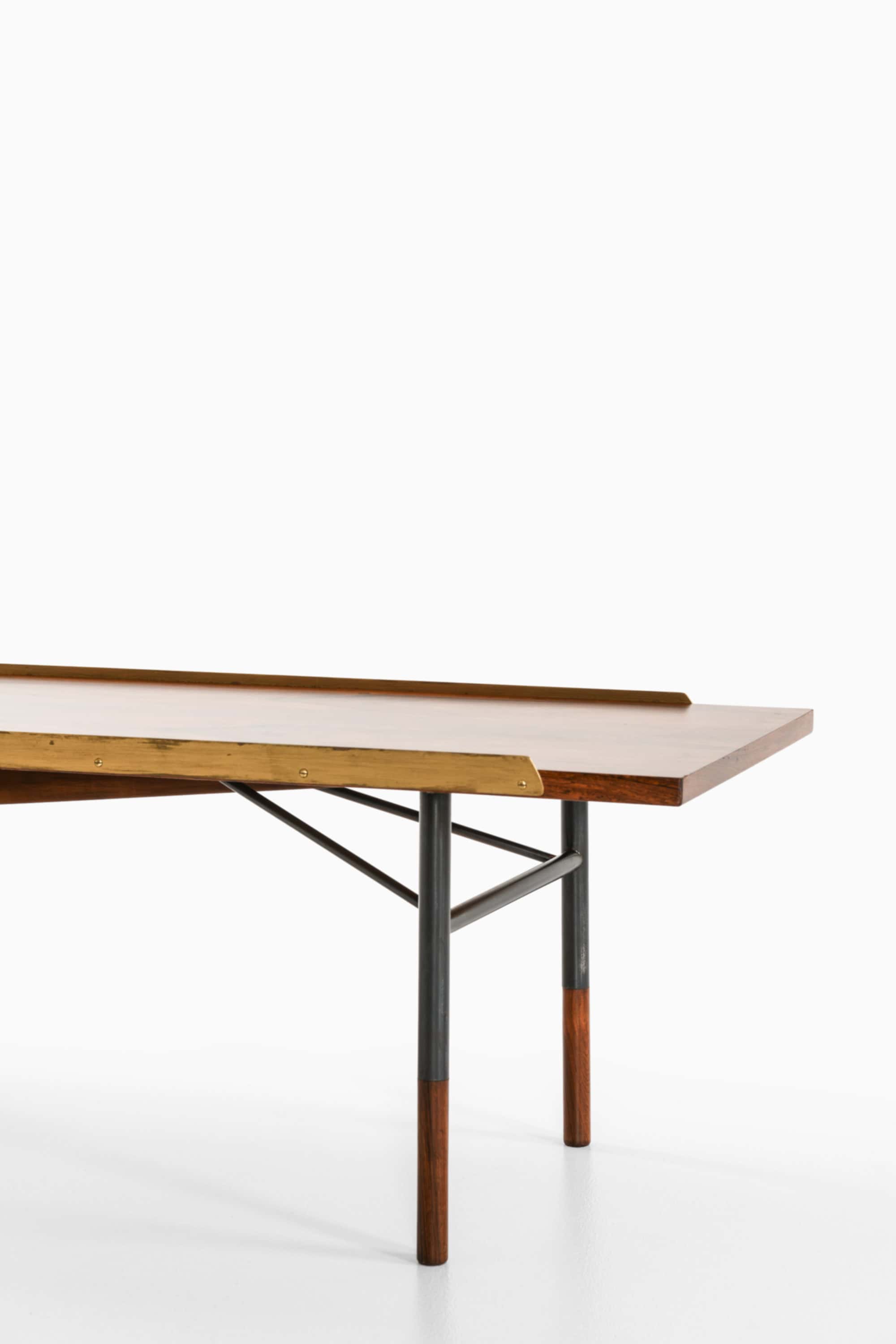 This rare bench or side table, model BO-101, was designed by Finn Juhl and produced by Bovirke in Denmark in 1953. The piece is crafted in rosewood with brass details, combining a richly figured hardwood surface with industrial structural elements. The long, rectangular top displays a striking rosewood grain pattern with deep tonal variations and a highly polished finish. Brass edging runs along the sides of the top, secured with visible screws, forming a functional and decorative boundary that reinforces the edge and introduces a refined metallic contrast.