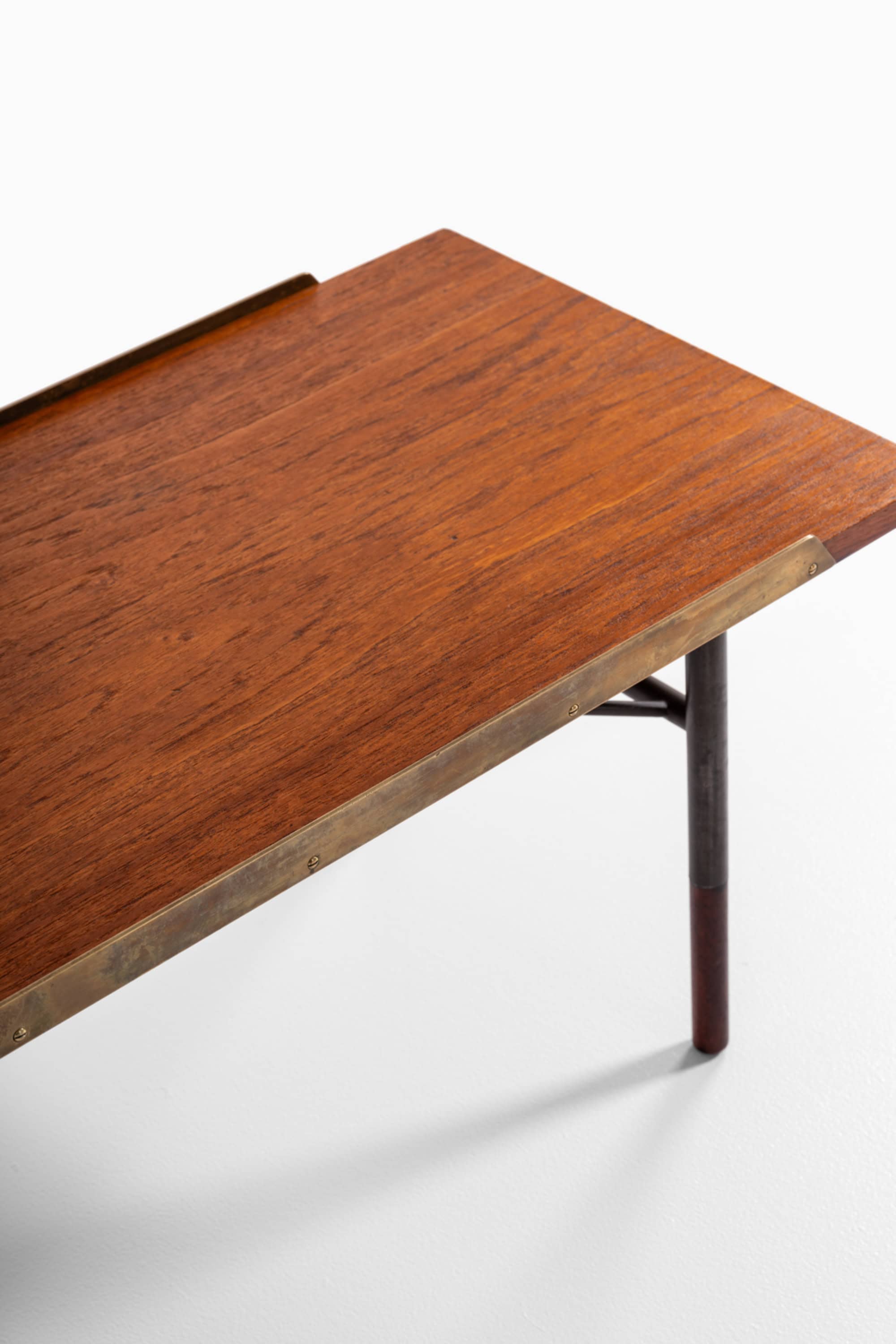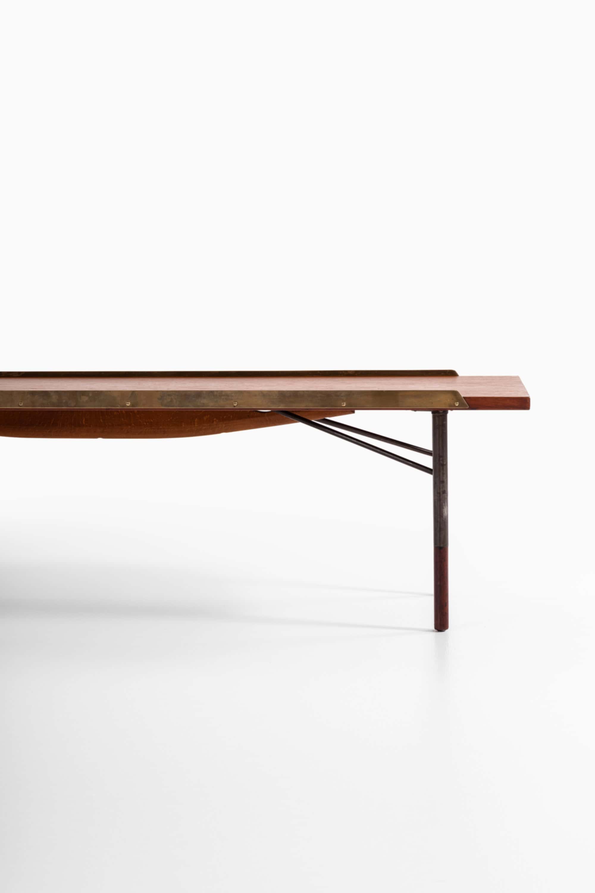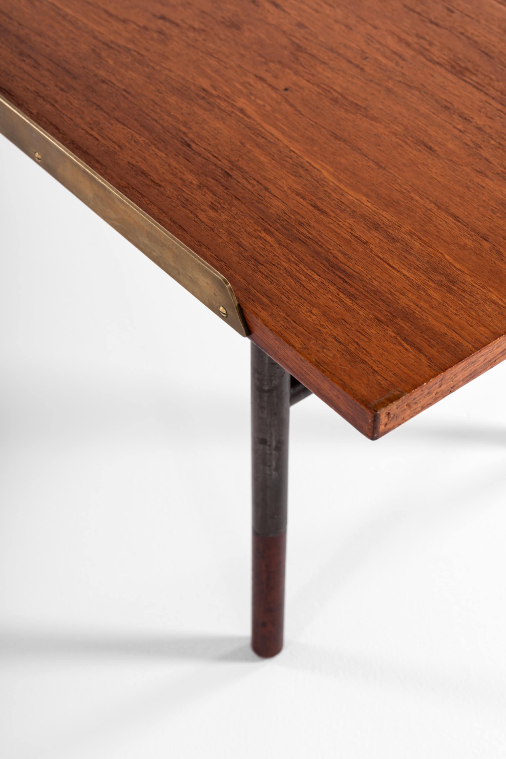 Beneath the top, a gently curved, suspended teak shelf creates a floating effect and reinforces Juhl’s characteristic use of organic forms within a structured framework. The base consists of slender legs in gun metal, with the lower sections finished in teak, creating a refined transition between materials. The legs are connected by delicate metal stretchers, contributing to the lightness of the construction while ensuring stability.