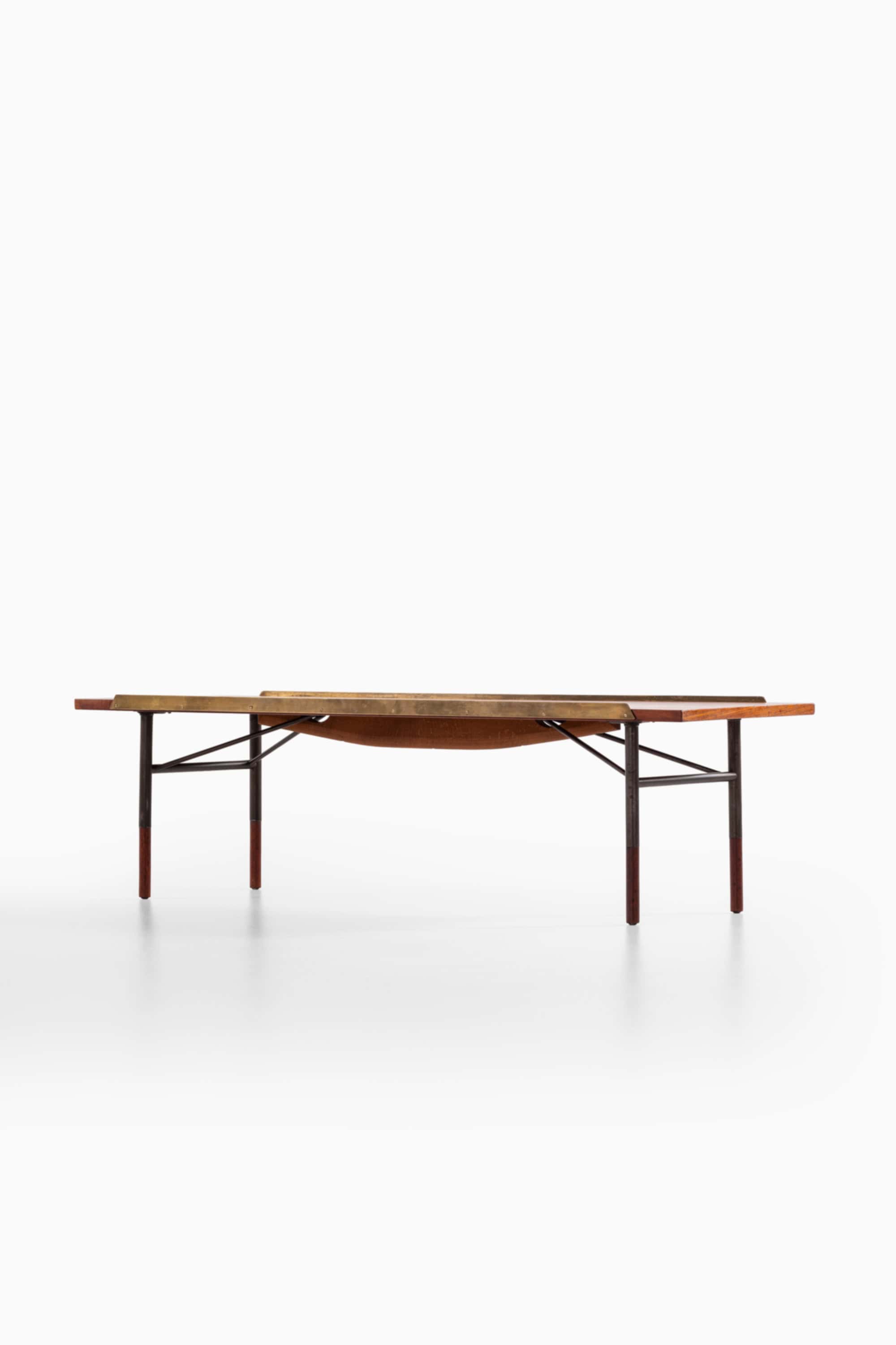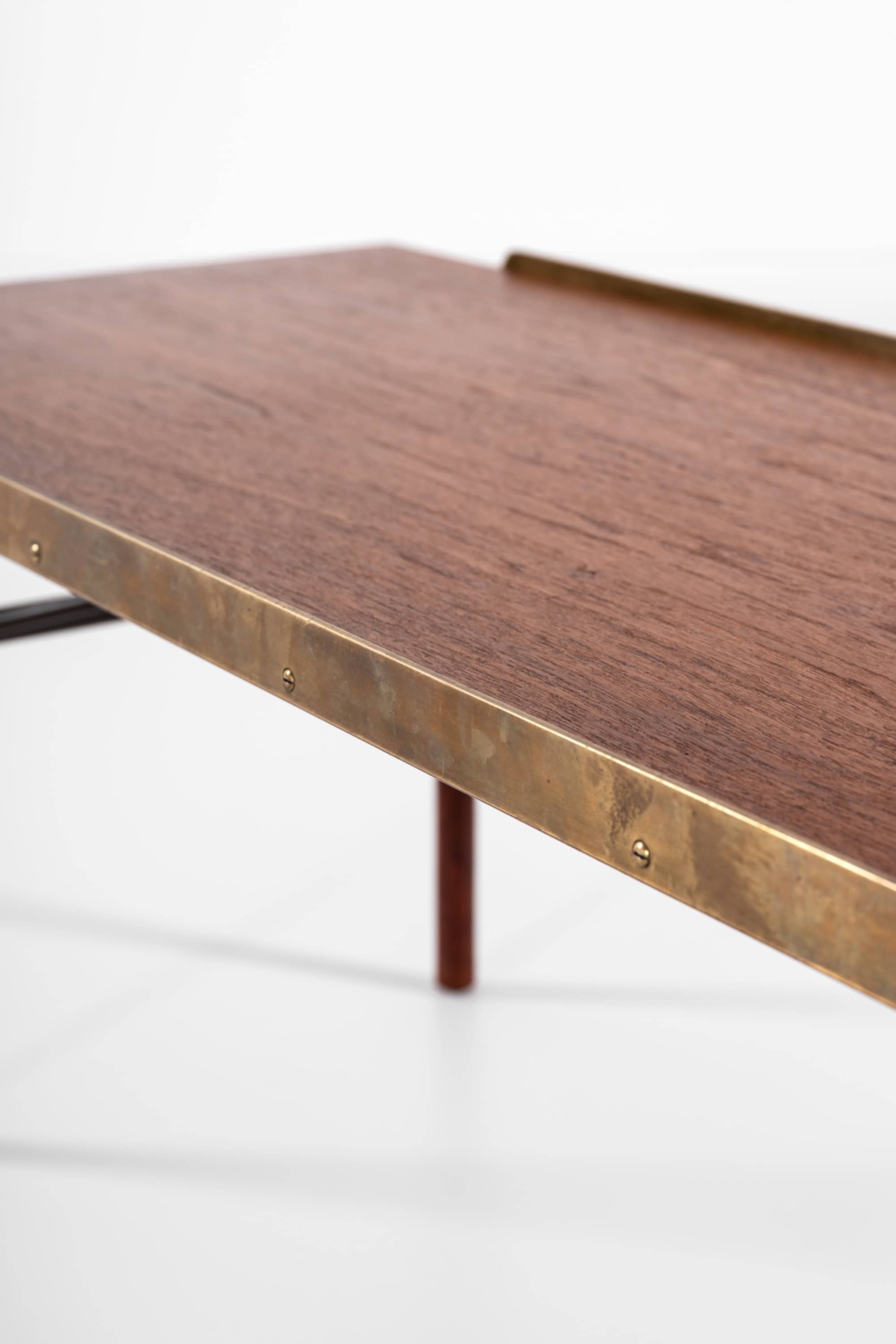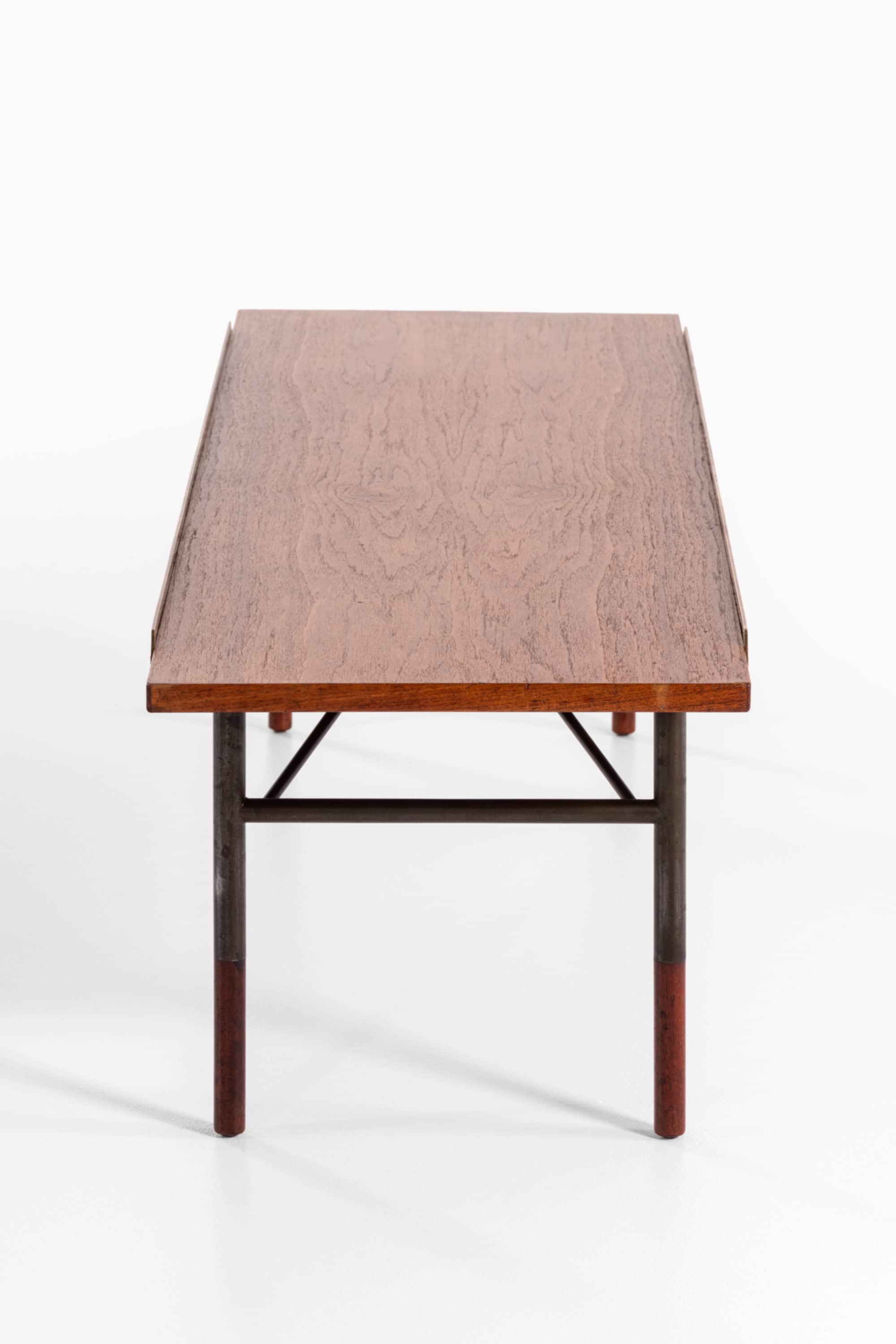 Beneath the top, a gently curved, suspended teak shelf creates a floating effect and reinforces Juhl’s characteristic use of organic forms within a structured framework. The base consists of slender legs in gun metal, with the lower sections finished in teak, creating a refined transition between materials. The legs are connected by delicate metal stretchers, contributing to the lightness of the construction while ensuring stability.