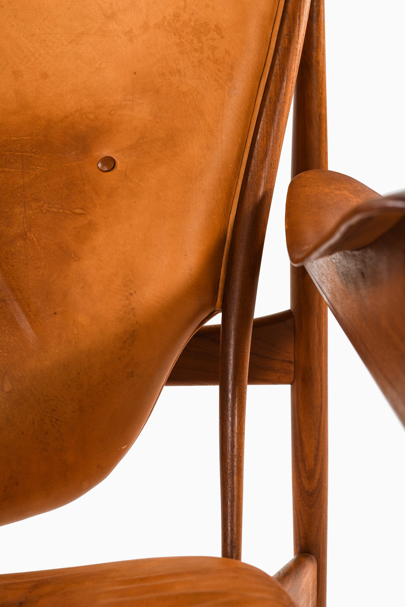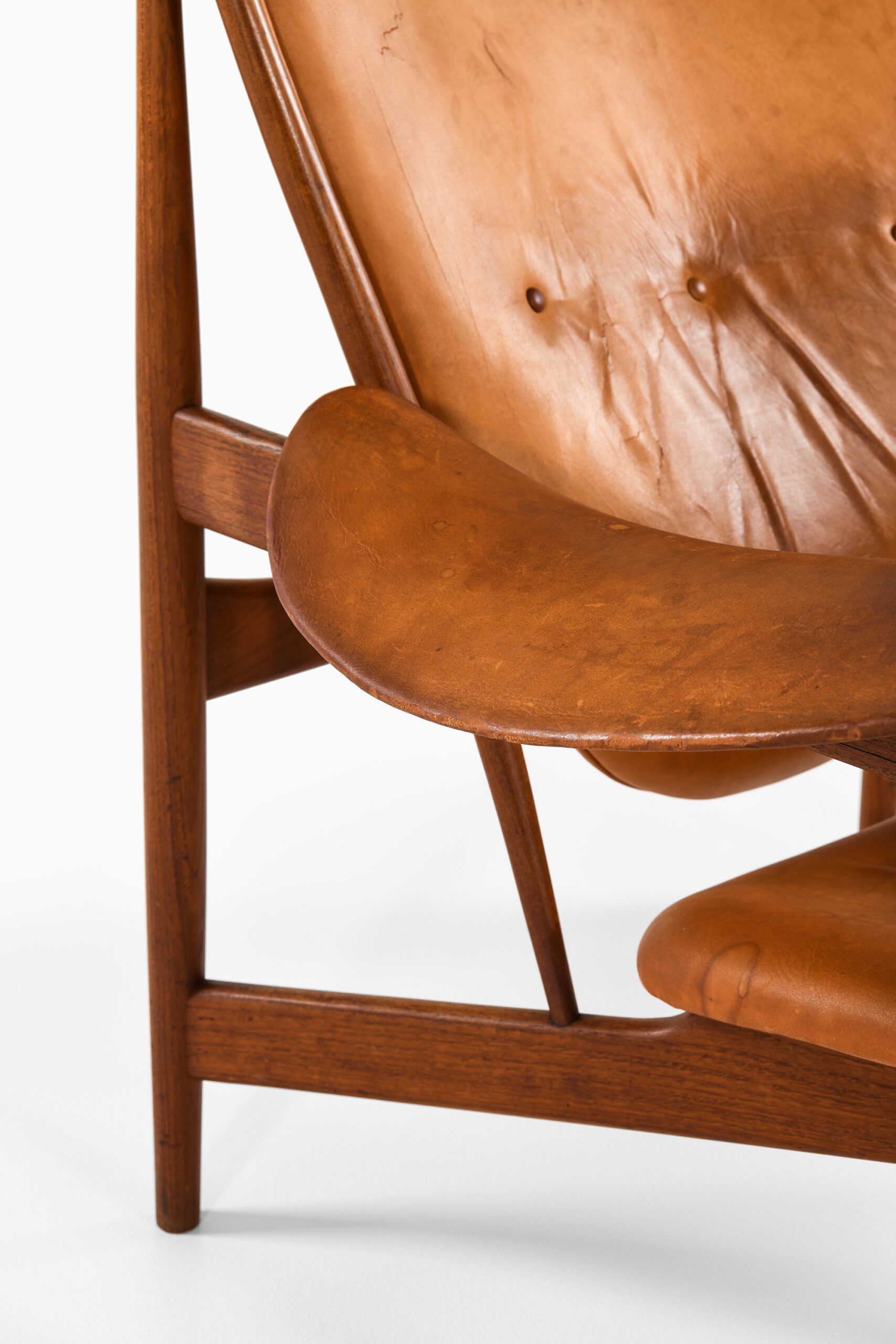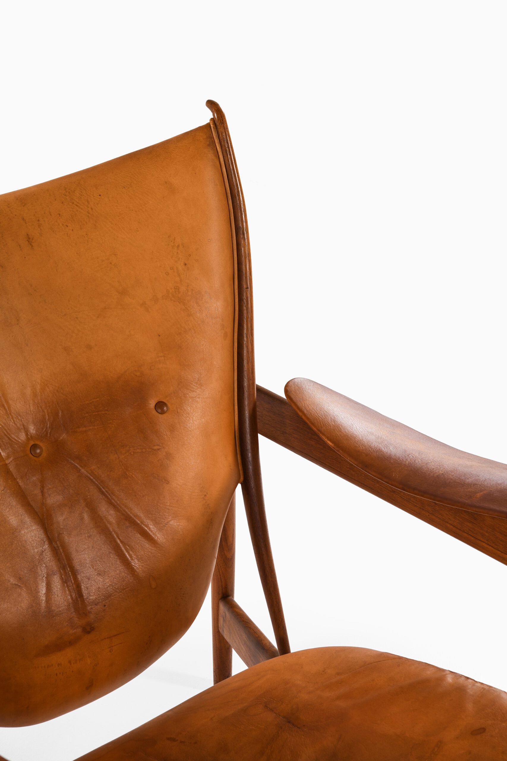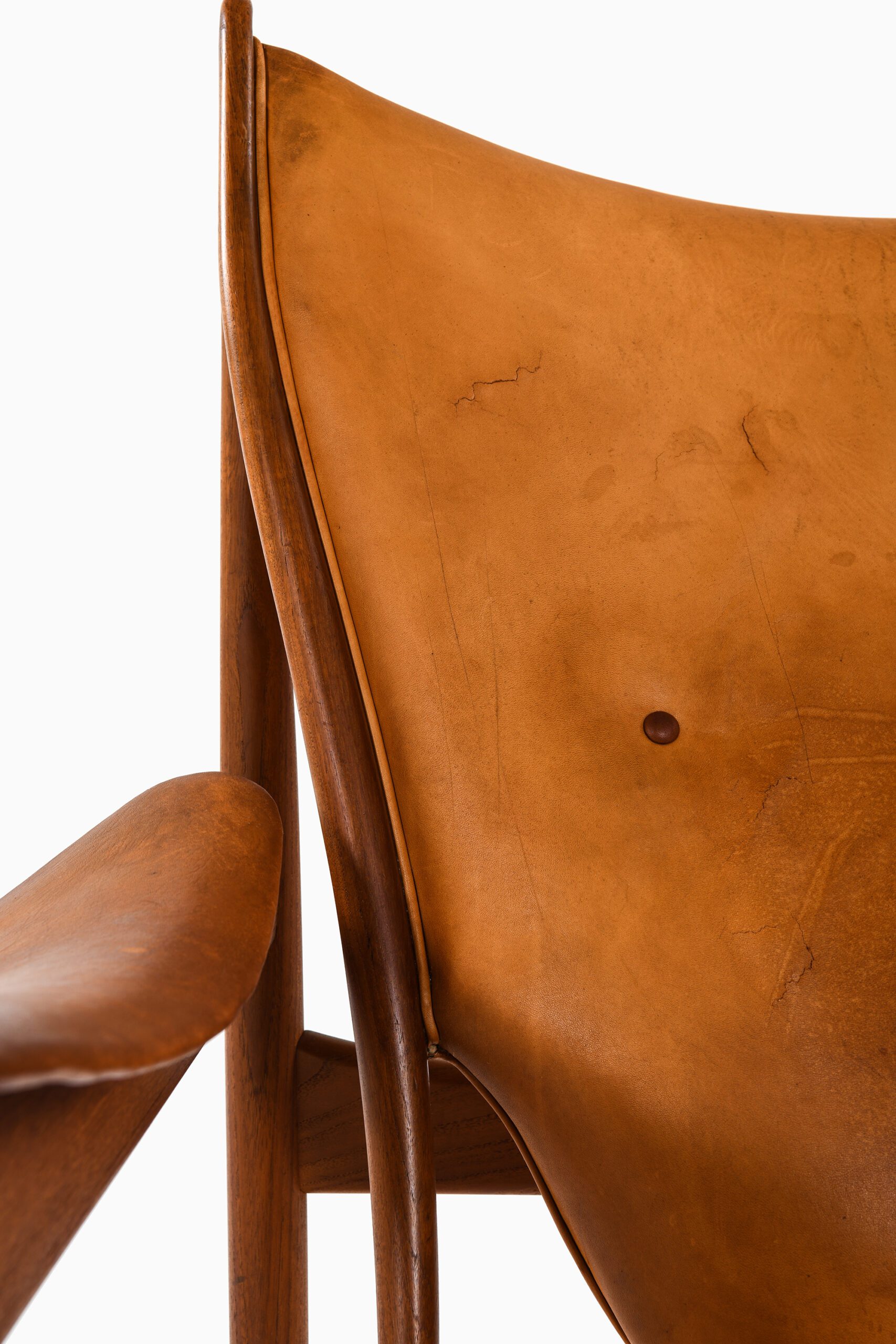 The chair’s bold architectural frame features sweeping curves, tapering elements, and extended rear uprights that serve both structural and aesthetic functions, lifting the form visually. The seat and backrest are suspended within this frame, upholstered in thick leather that displays a rich patina and natural wear, underscoring the chair’s authenticity and age. The upholstery is deliberately stretched and fastened to create a sense of suspension or hovering, a hallmark of Juhl’s design philosophy that separates the leather seat visually from the wooden support.