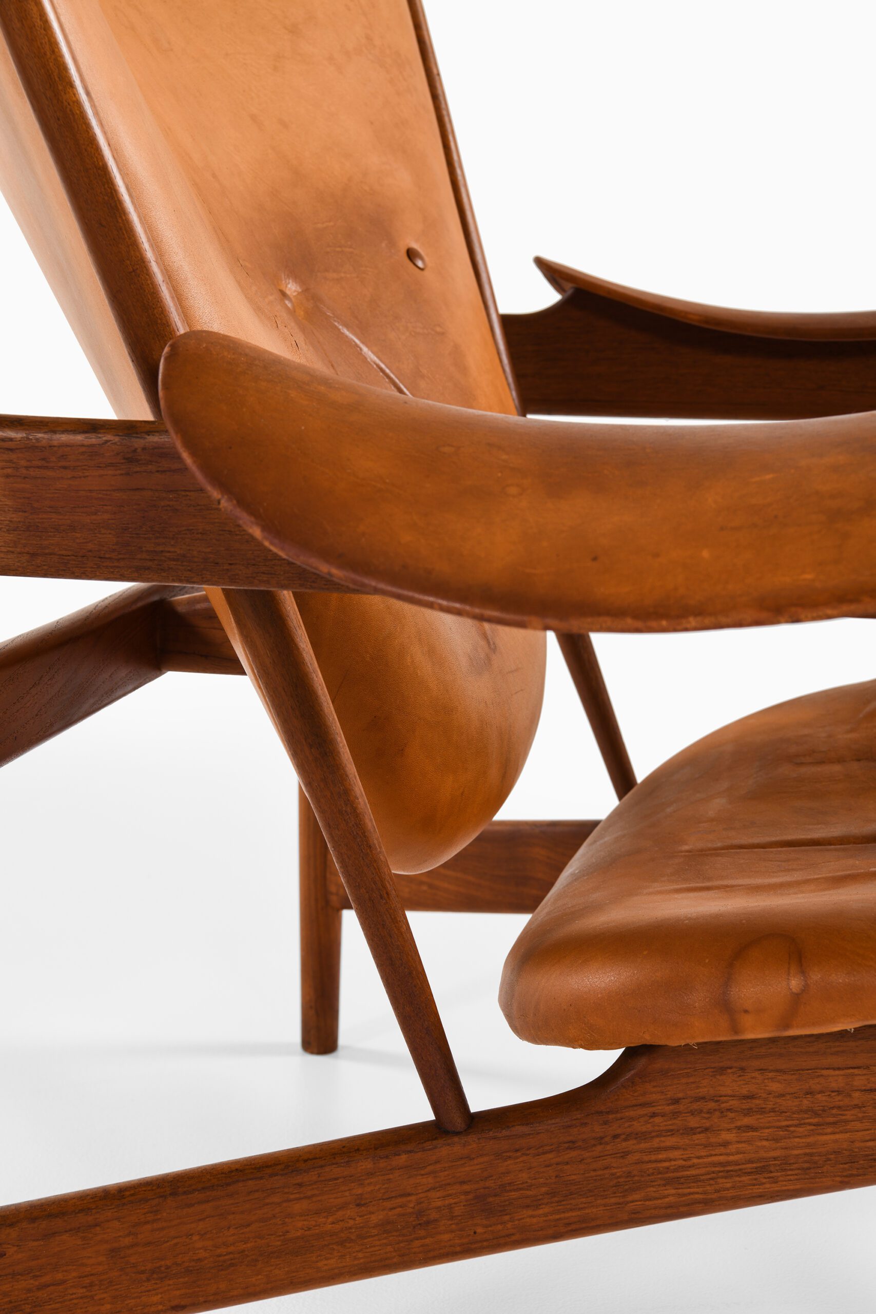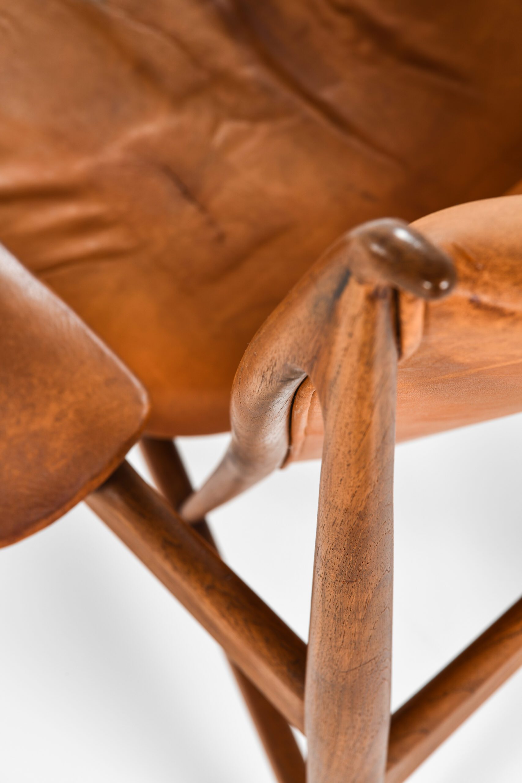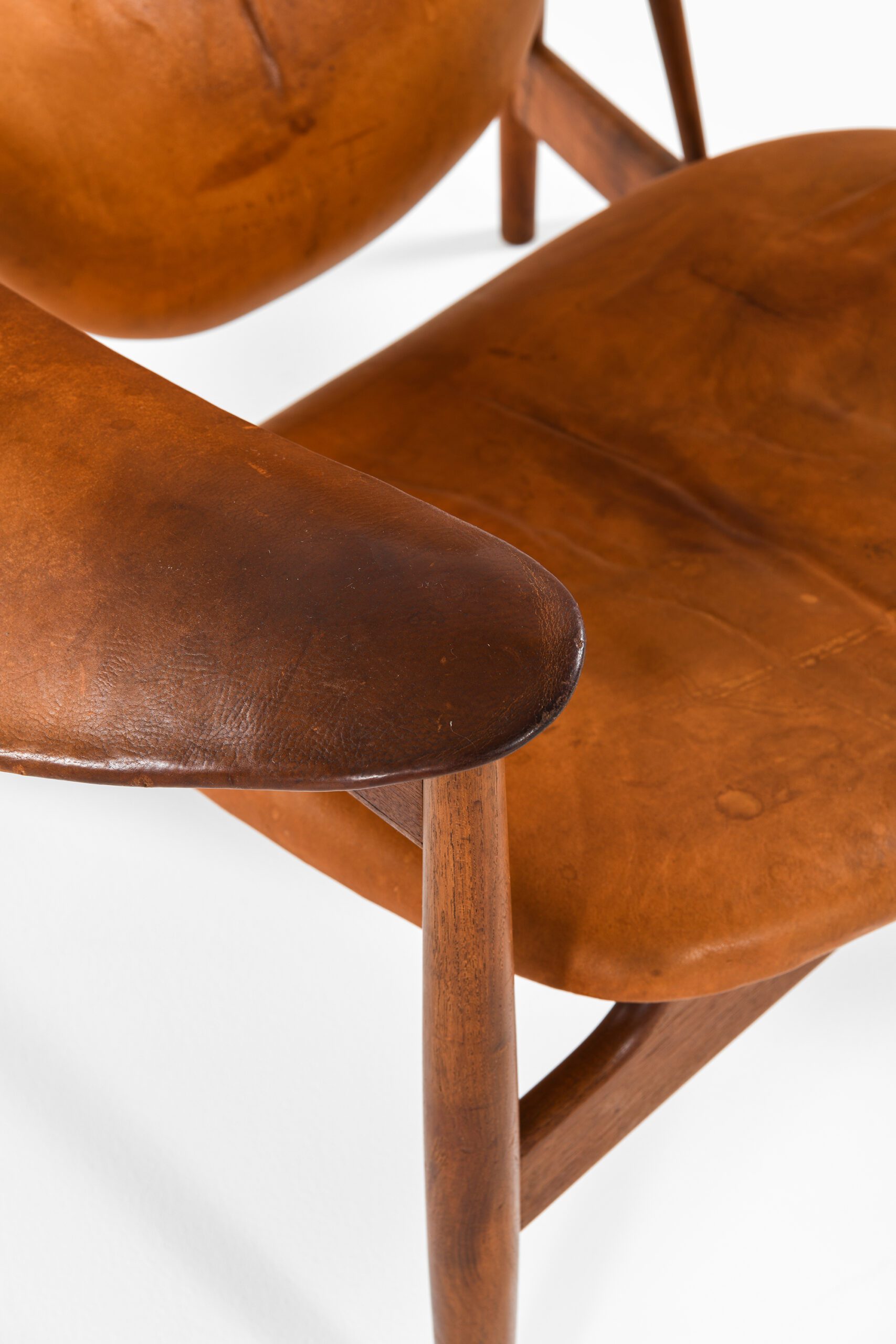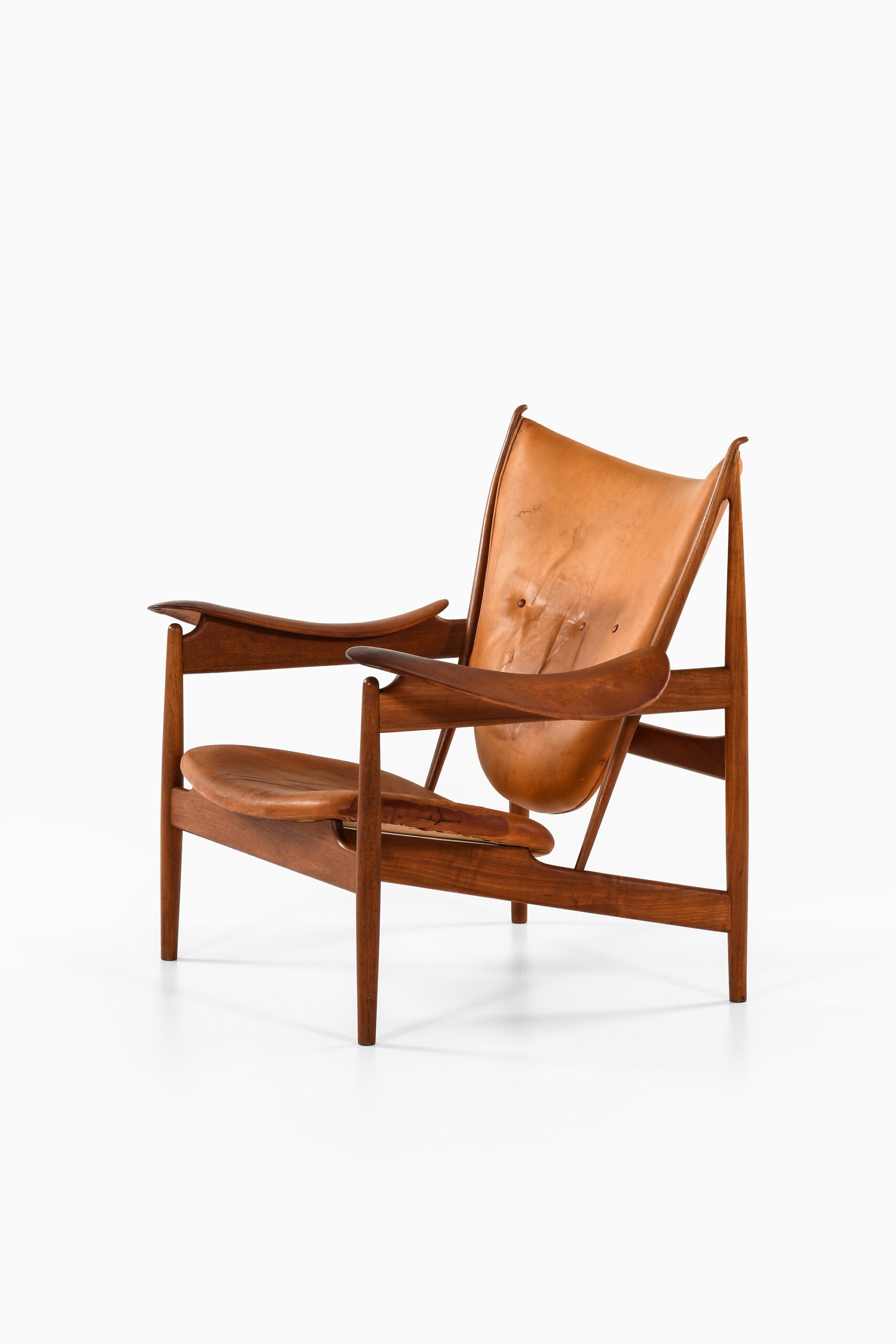 The chair’s bold architectural frame features sweeping curves, tapering elements, and extended rear uprights that serve both structural and aesthetic functions, lifting the form visually. The seat and backrest are suspended within this frame, upholstered in thick leather that displays a rich patina and natural wear, underscoring the chair’s authenticity and age. The upholstery is deliberately stretched and fastened to create a sense of suspension or hovering, a hallmark of Juhl’s design philosophy that separates the leather seat visually from the wooden support.