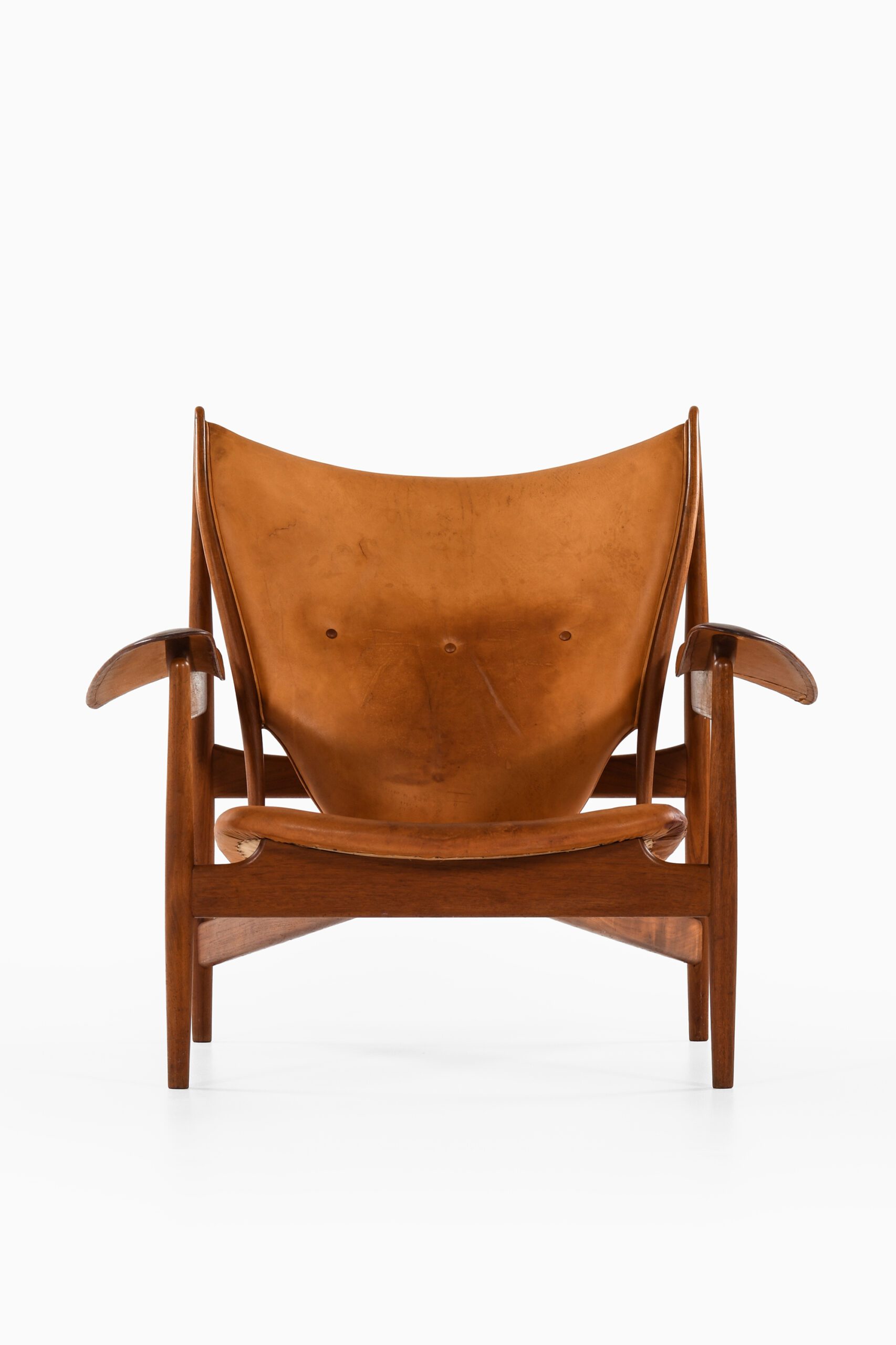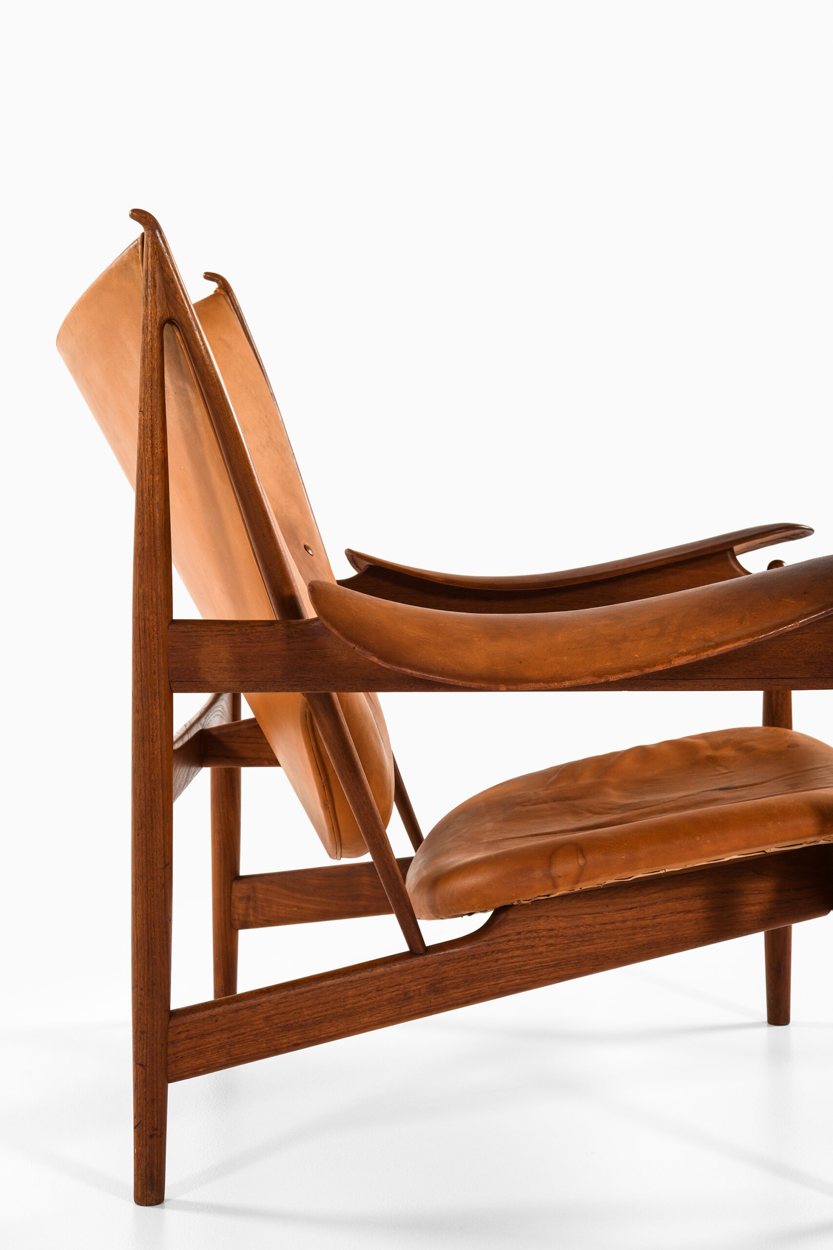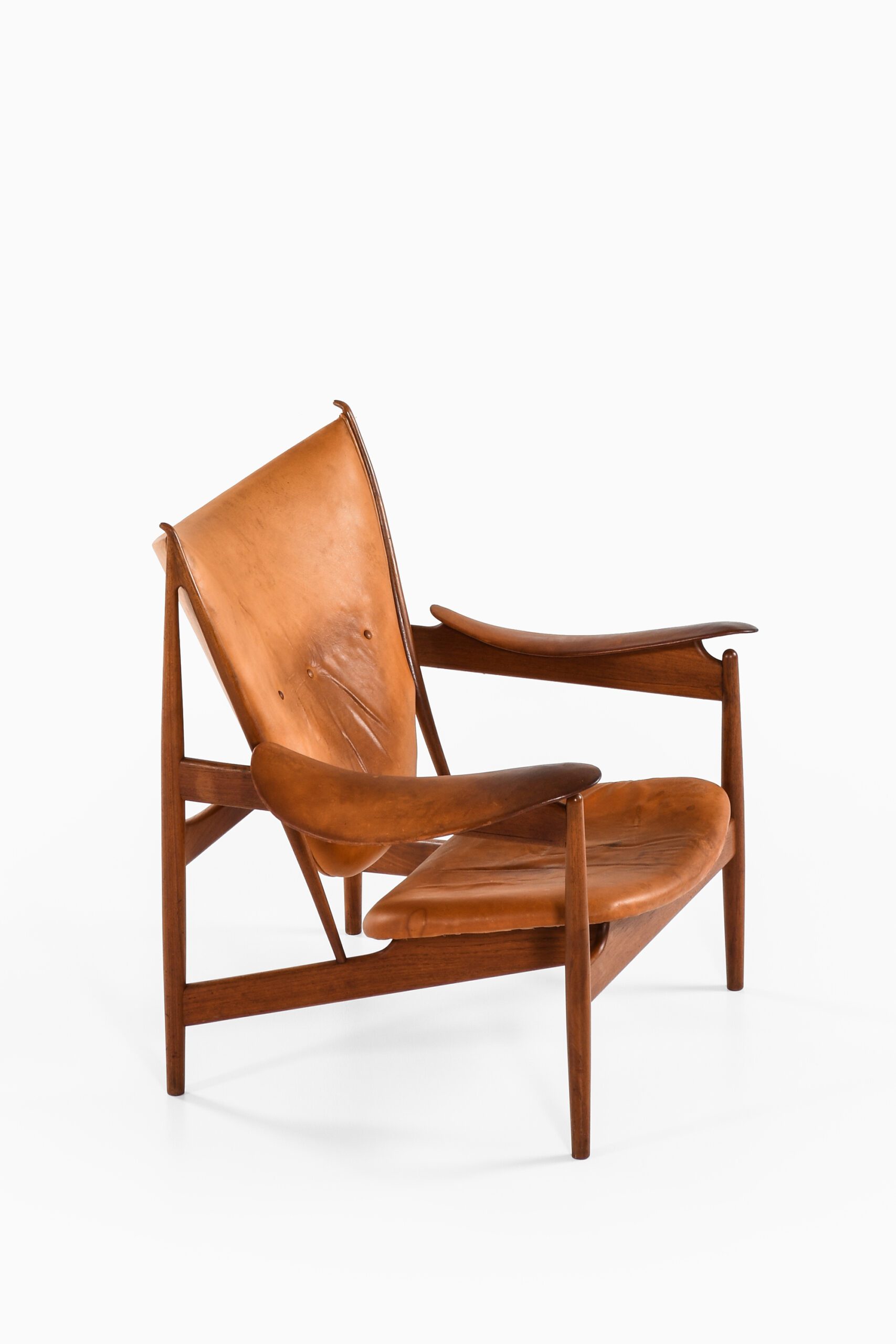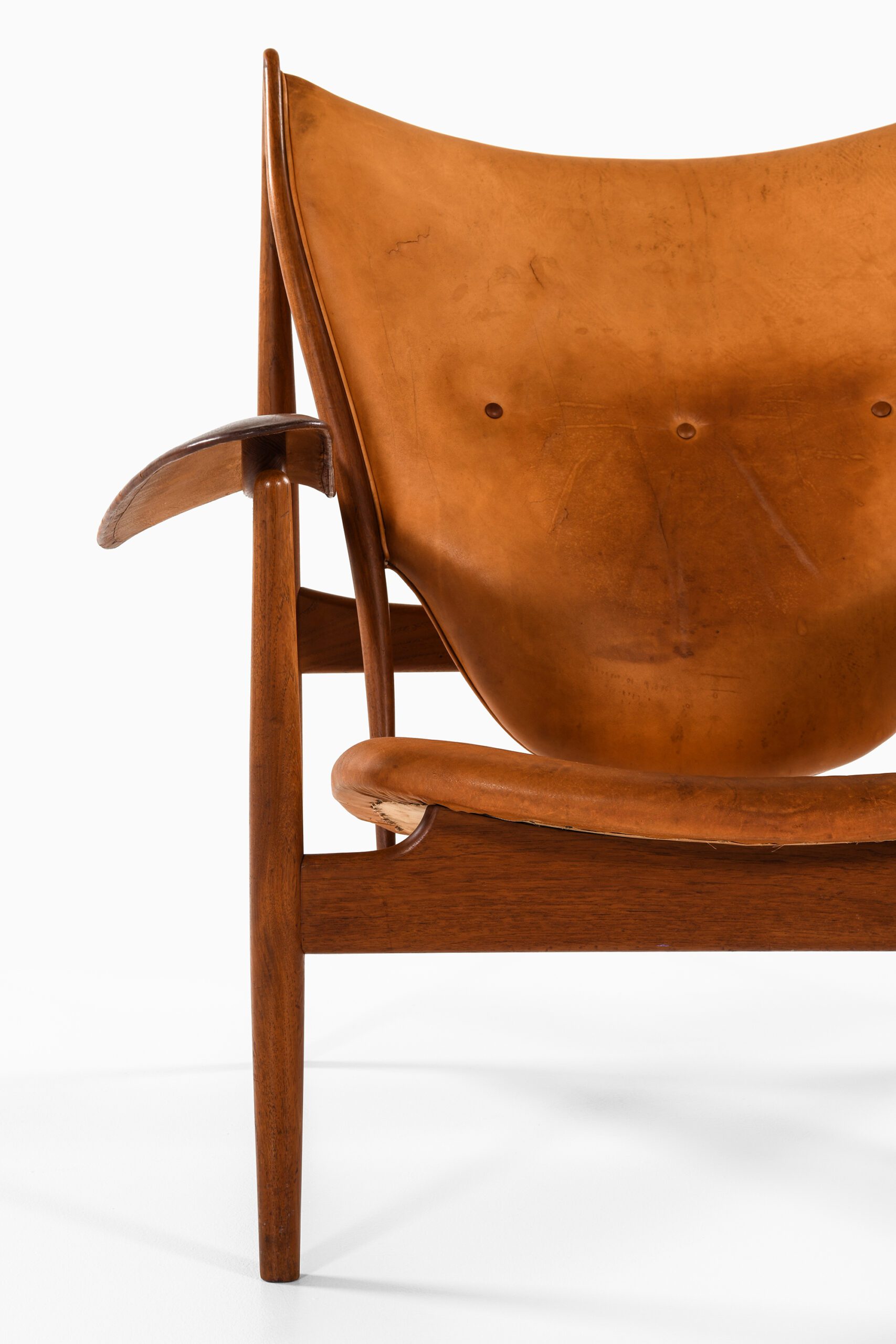 The chair’s bold architectural frame features sweeping curves, tapering elements, and extended rear uprights that serve both structural and aesthetic functions, lifting the form visually. The seat and backrest are suspended within this frame, upholstered in thick leather that displays a rich patina and natural wear, underscoring the chair’s authenticity and age. The upholstery is deliberately stretched and fastened to create a sense of suspension or hovering, a hallmark of Juhl’s design philosophy that separates the leather seat visually from the wooden support.