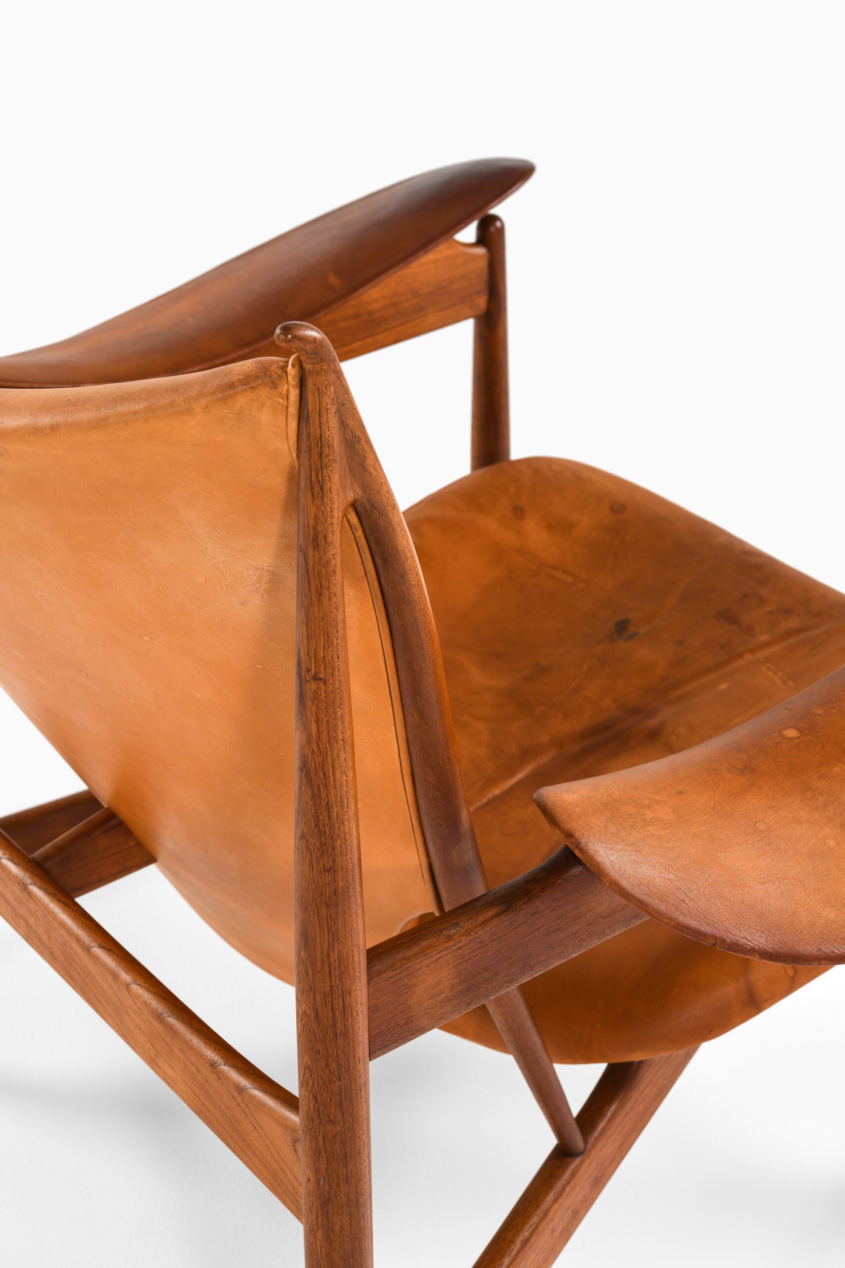 This very rare Chieftain Chair is a distinguished design by Finn Juhl, produced by master cabinetmaker Niels Vodder in Denmark during the 1950s. Crafted from solid teak, the chair retains its original cognac brown leather upholstery, embodying one of the most iconic achievements of Danish modern furniture. Its sculptural form, organic detailing, and masterful joinery exemplify Juhl’s visionary approach to furniture design.