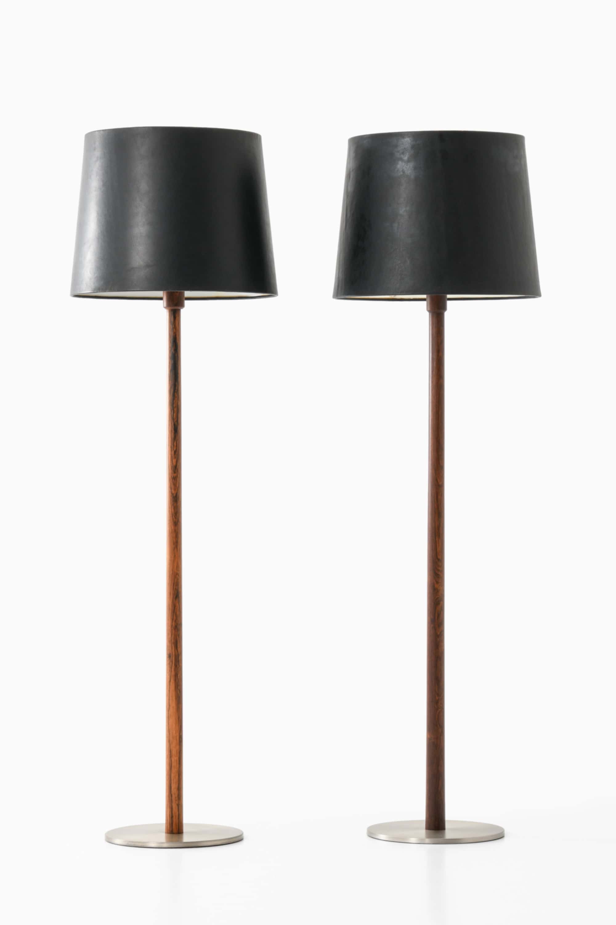 This rare floor lamp was produced in Sweden during the 1950s. It features a slender frame with a base composed of three elongated metal rods radiating from a circular platform, providing stability and a visually light appearance. The structure is finished in lacquered metal accented with brass elements, and the central section includes a tapered decorative detail in a muted gray tone, adding subtle visual interest. An adjustable brass arm extends outward from the central column, allowing for flexible positioning of the light source. The lampshade is made of perforated brass, which produces a soft and diffused glow when illuminated.