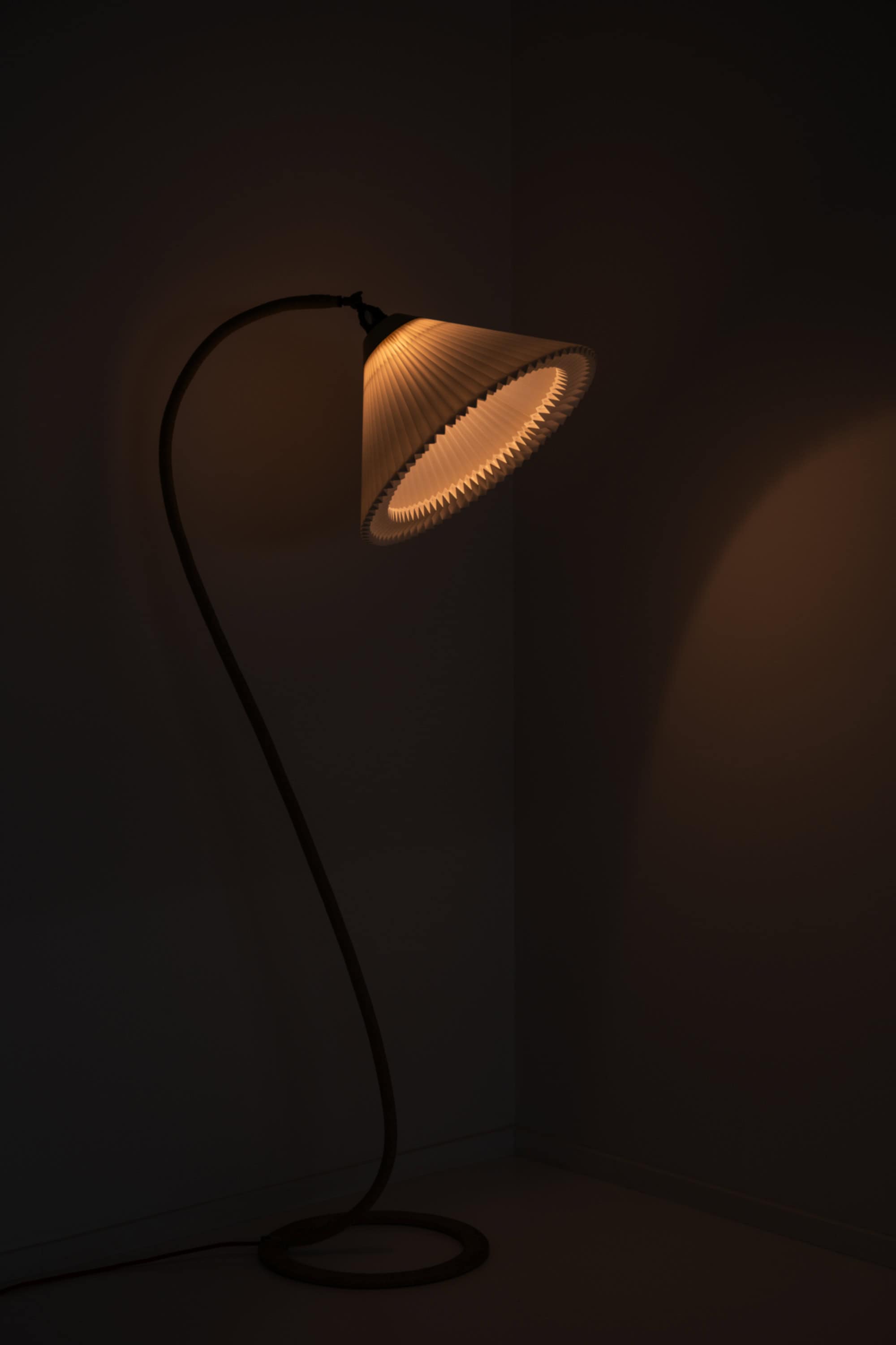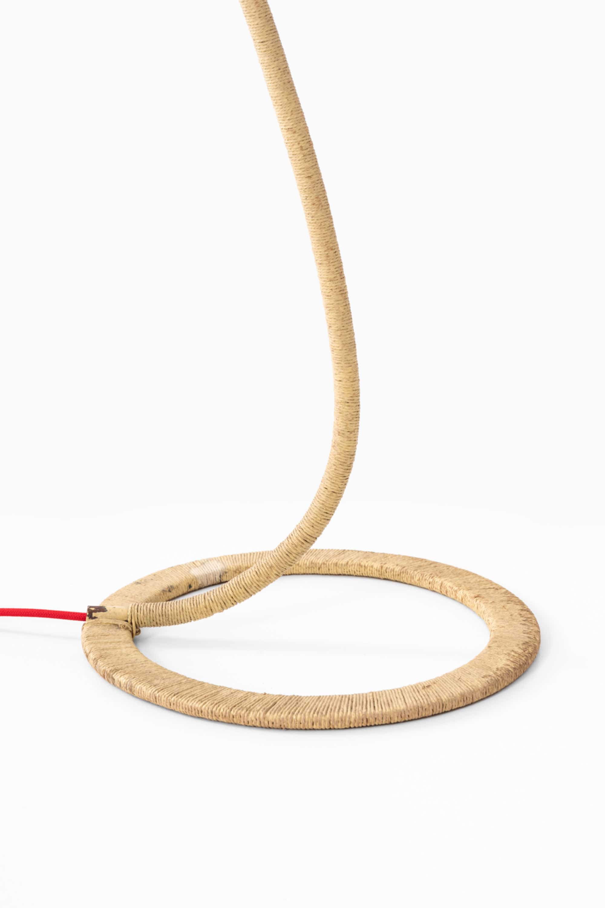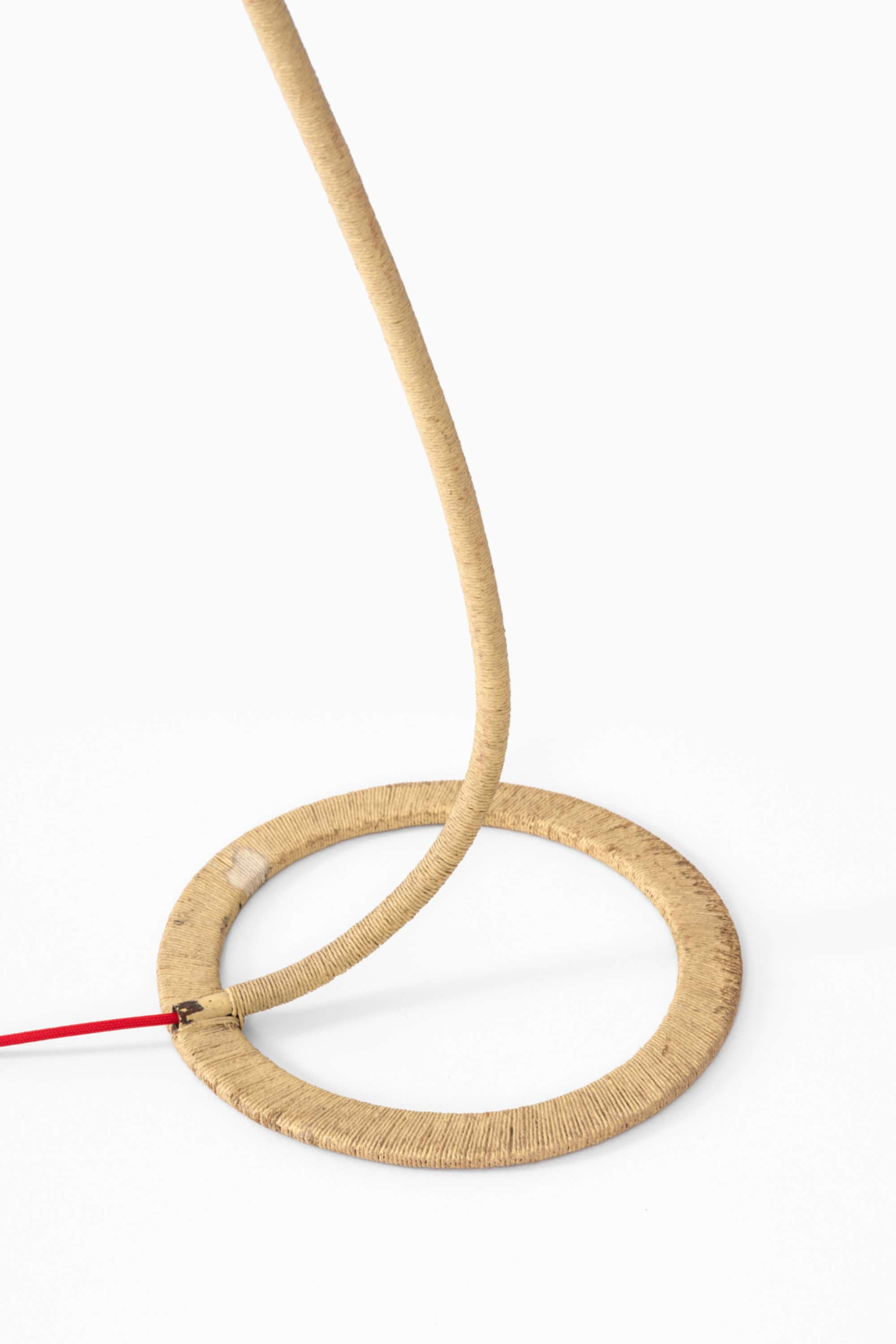 A rare Swedish floor lamp from the 1950s, distinguished by its sculptural and organic form. The design is defined by a slender, continuously curved stem that rises in a soft arc from the circular base, creating a fluid, almost calligraphic silhouette. This elegant line gives the piece a sense of movement and lightness, characteristic of Scandinavian modern lighting from the period.