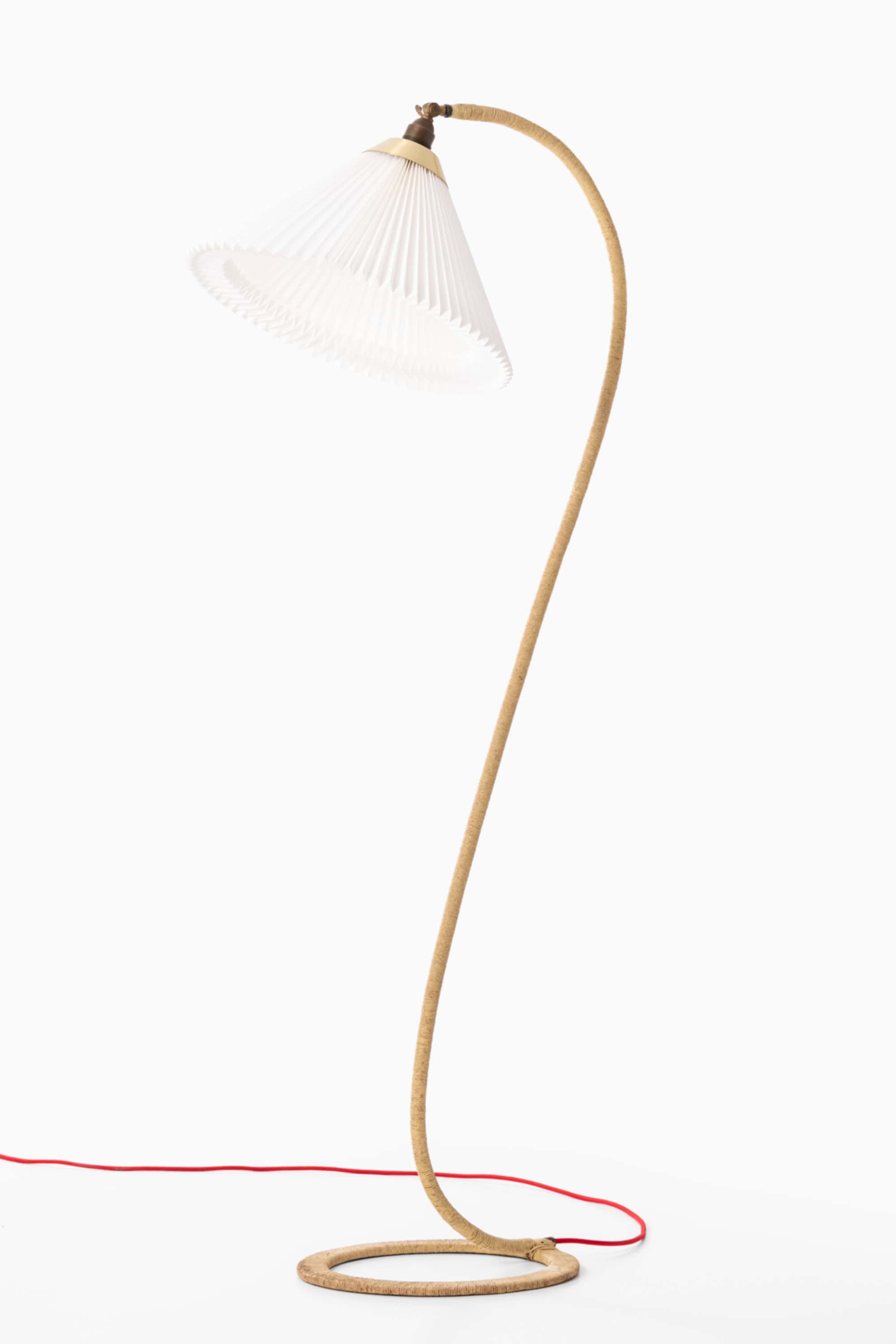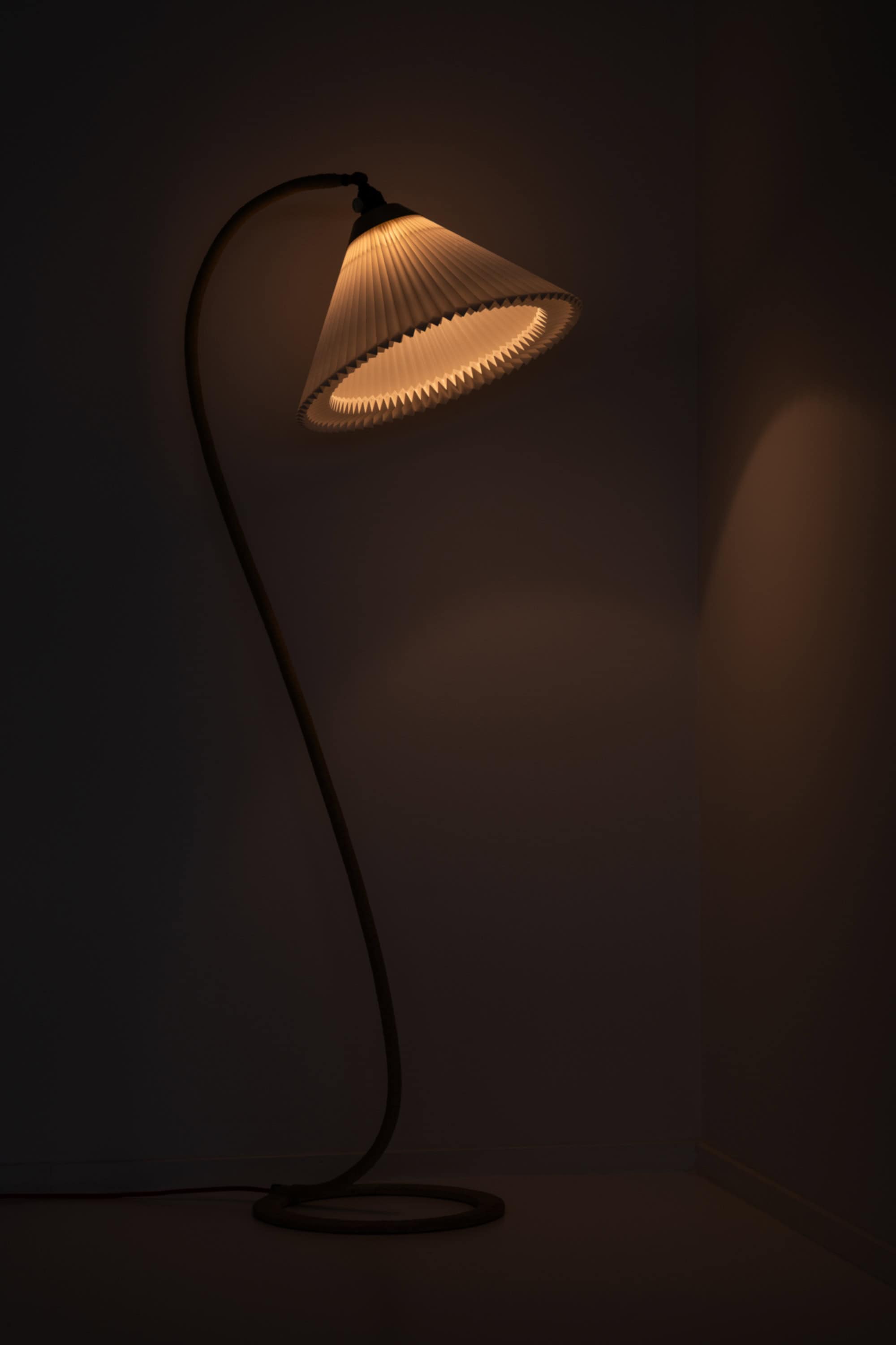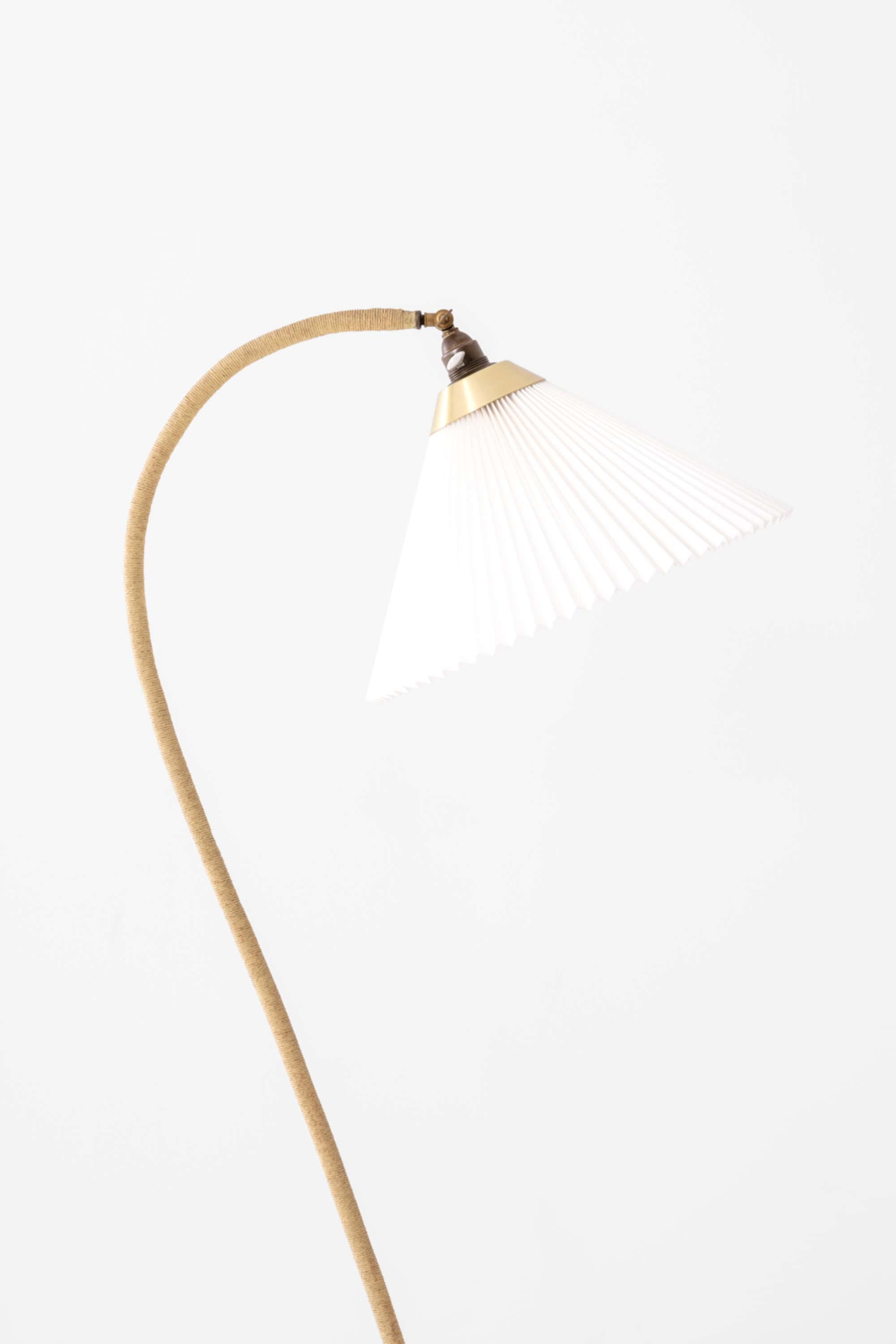 A rare Swedish floor lamp from the 1950s, distinguished by its sculptural and organic form. The design is defined by a slender, continuously curved stem that rises in a soft arc from the circular base, creating a fluid, almost calligraphic silhouette. This elegant line gives the piece a sense of movement and lightness, characteristic of Scandinavian modern lighting from the period.