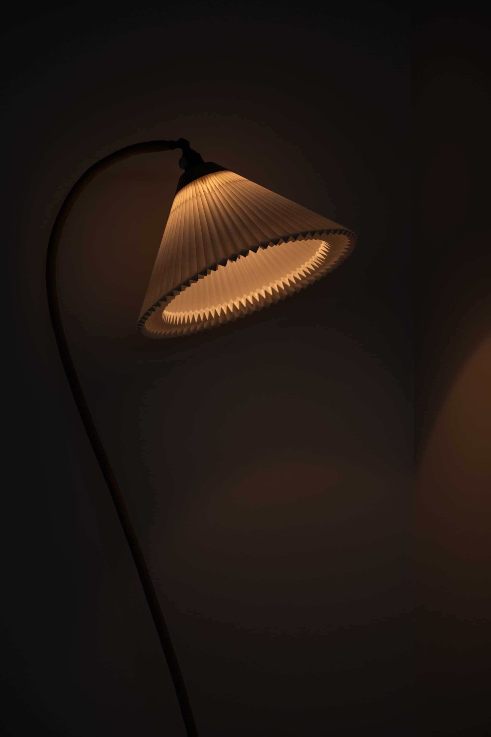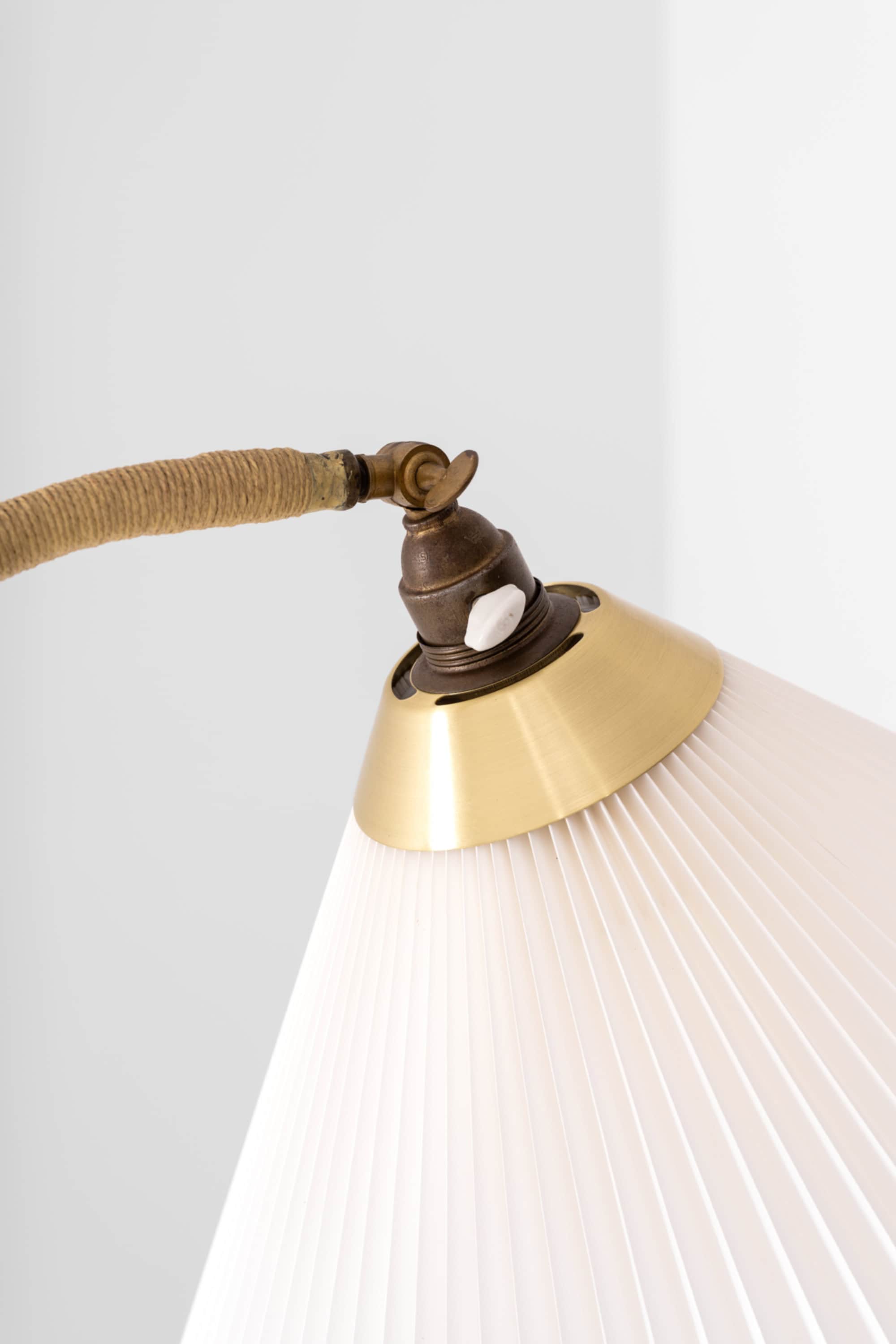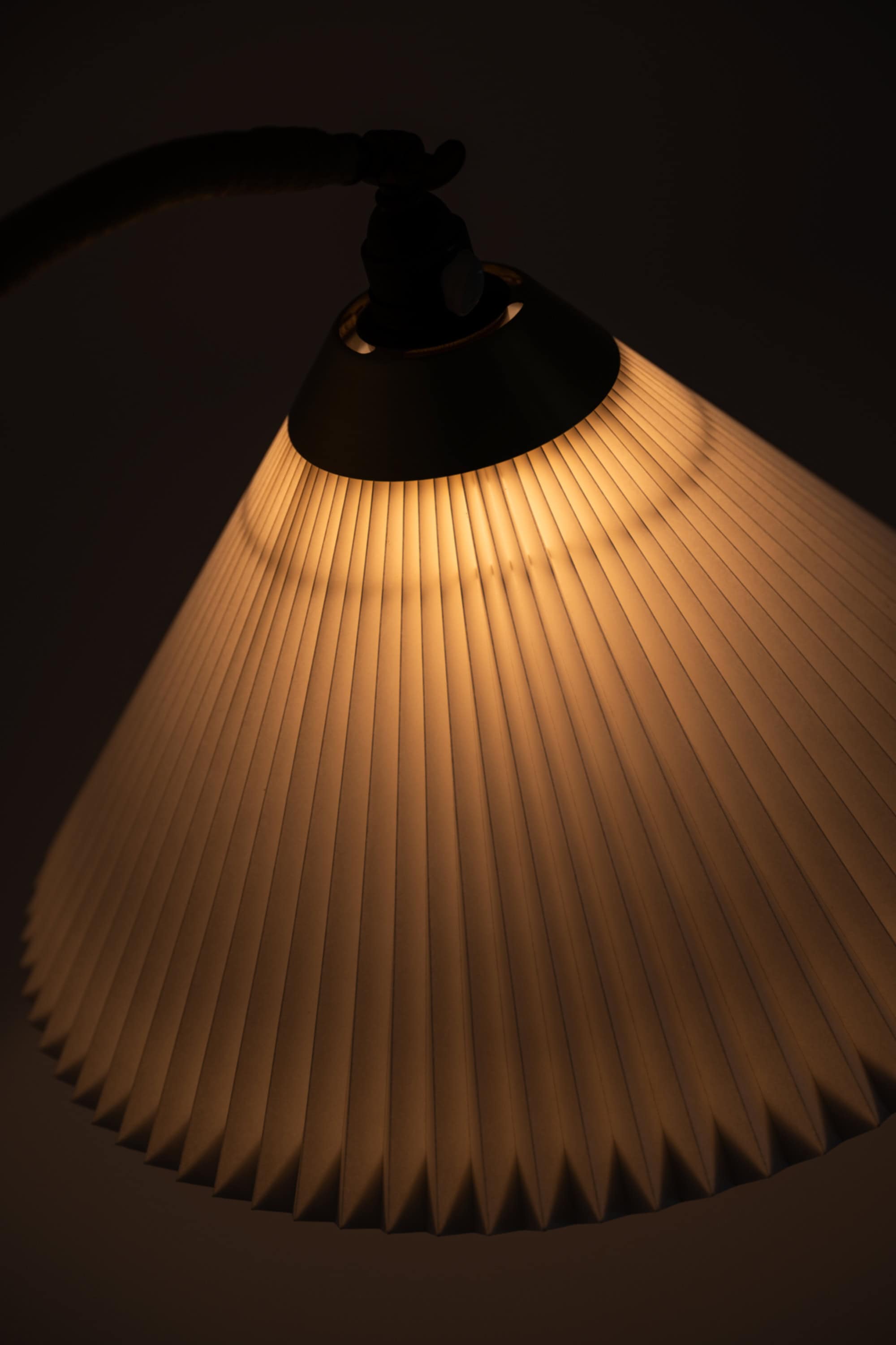 The lamp is fitted with a pleated Le Klint shade, executed in off-white plastic foil. The sharply folded structure of the shade creates a rhythmic pattern that diffuses the light evenly while producing a warm, atmospheric glow. A brushed brass collar and patinated metal socket provide a refined contrast to the lighter materials, adding a subtle decorative accent at the junction between stem and shade.