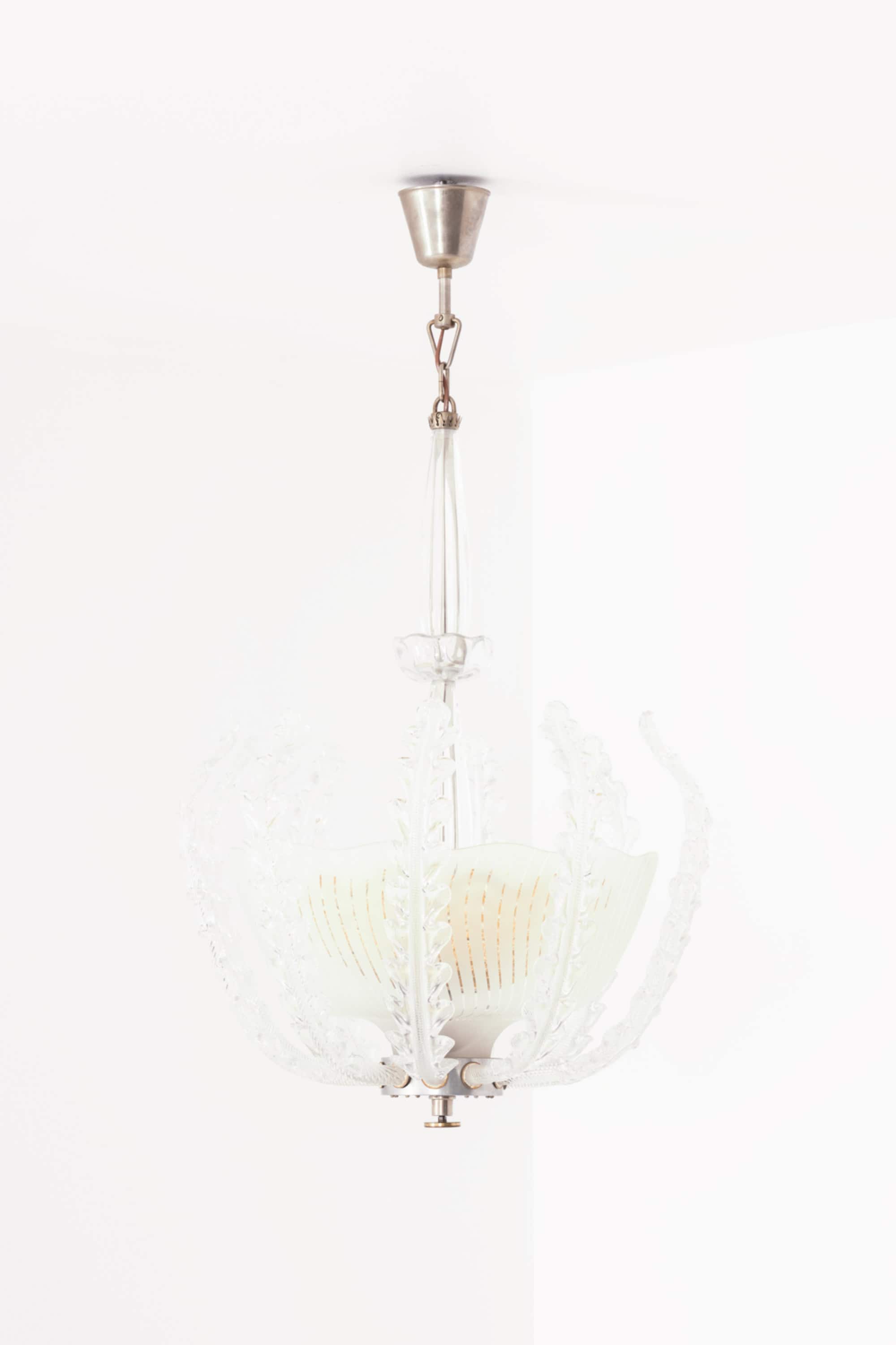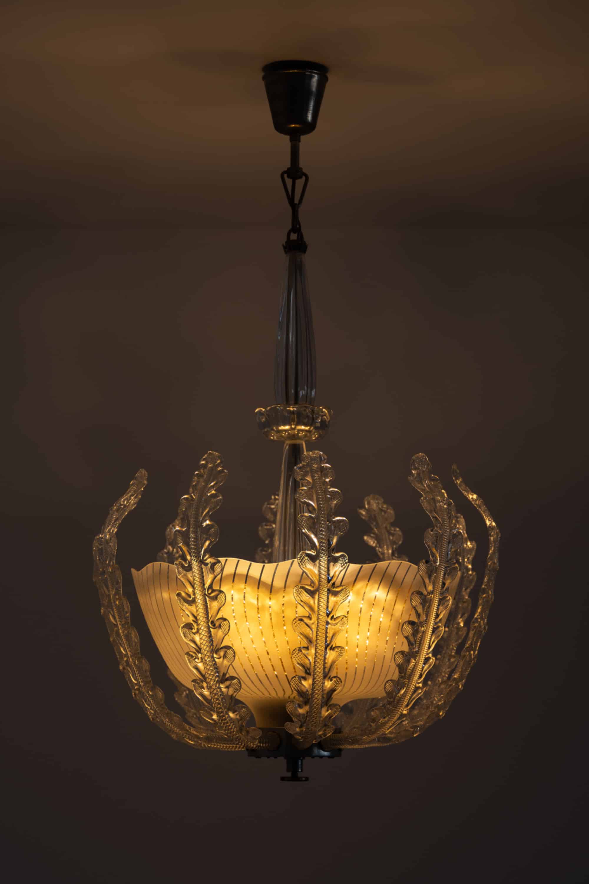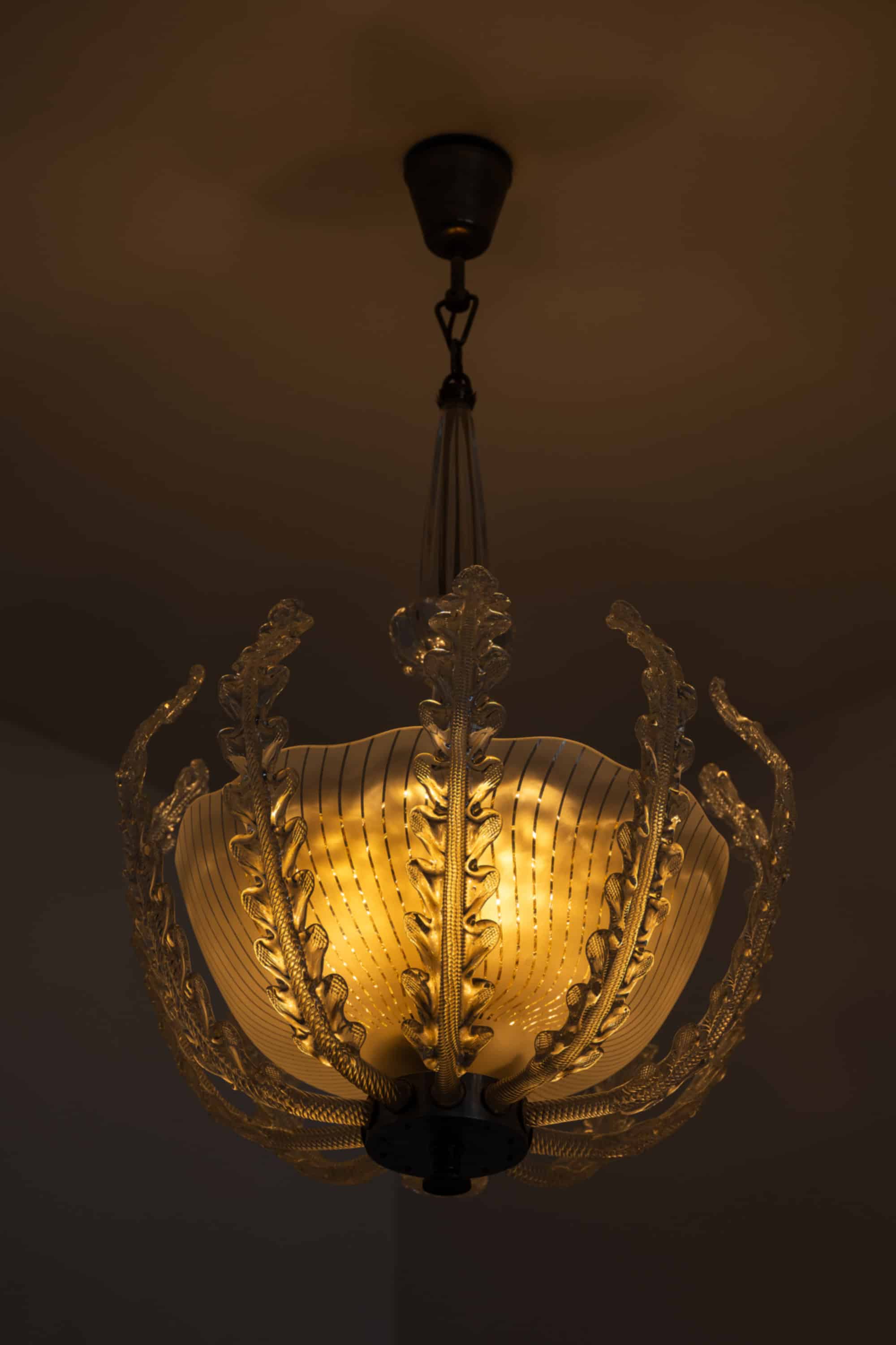 A very rare and large ceiling lamp designed by Fritz Kurz and produced by Orrefors in Sweden during the 1940s. This sculptural piece exemplifies the refined craftsmanship and artistic ambition of Swedish glassmaking in the mid-20th century, combining elegant proportions with intricate organic detailing.