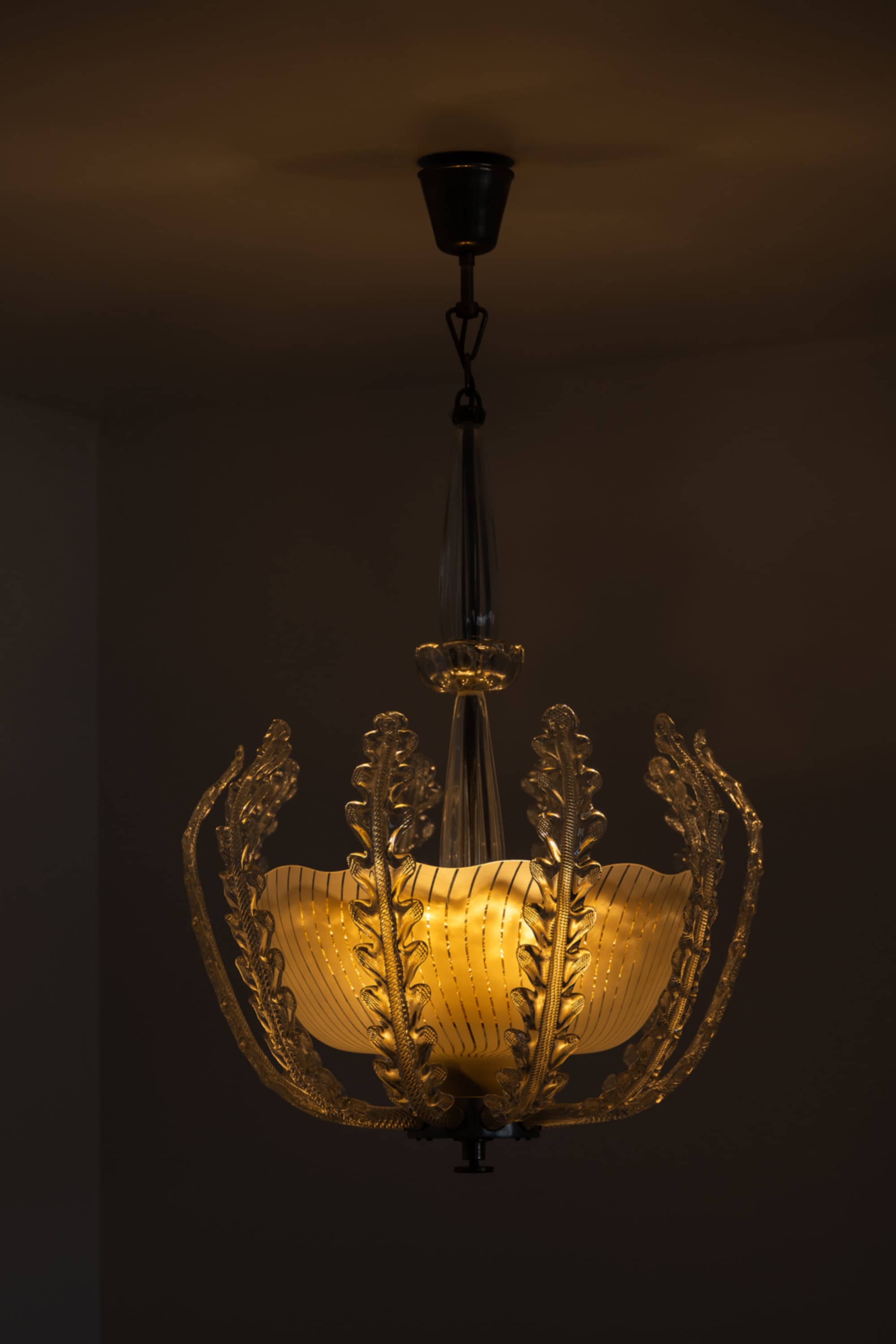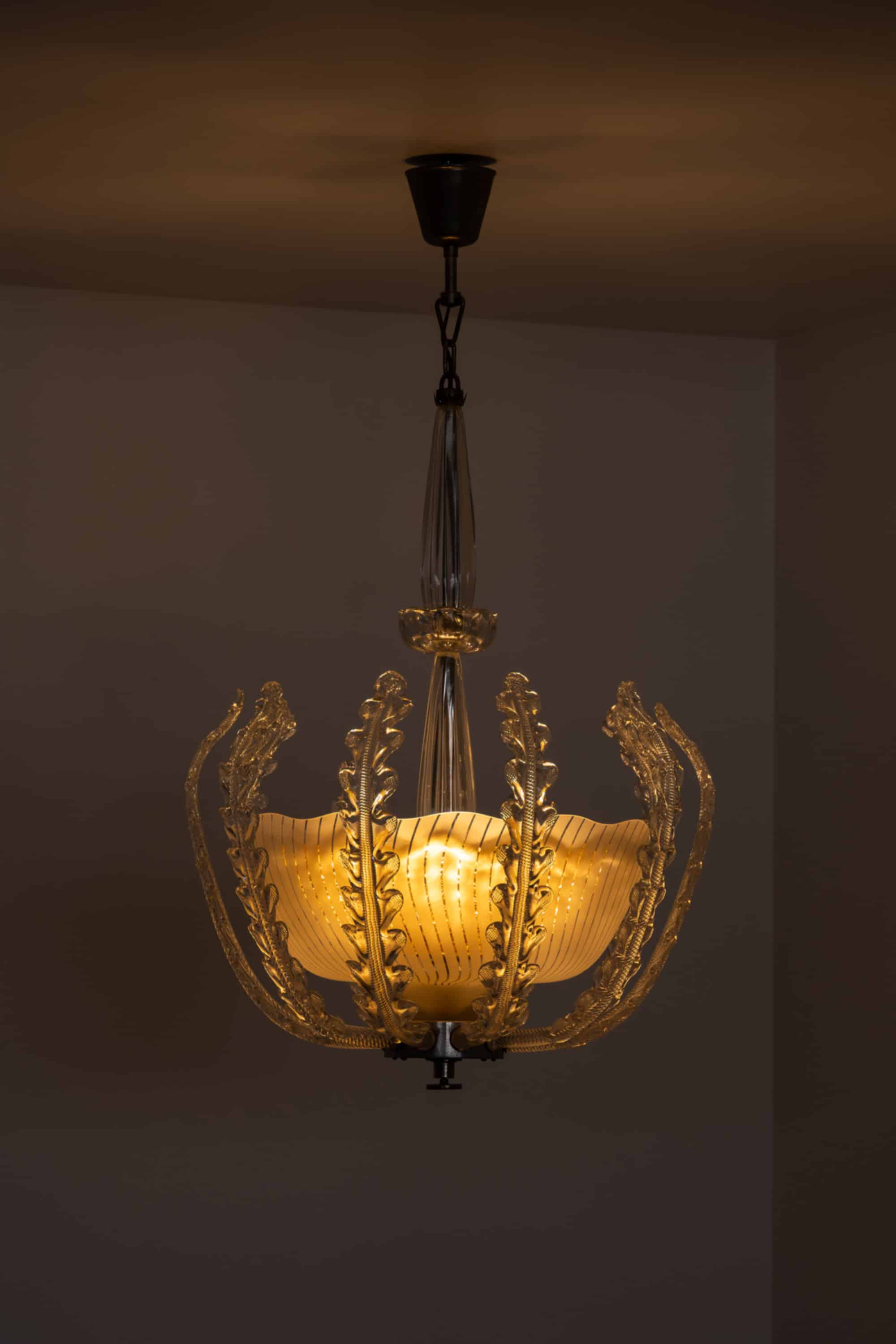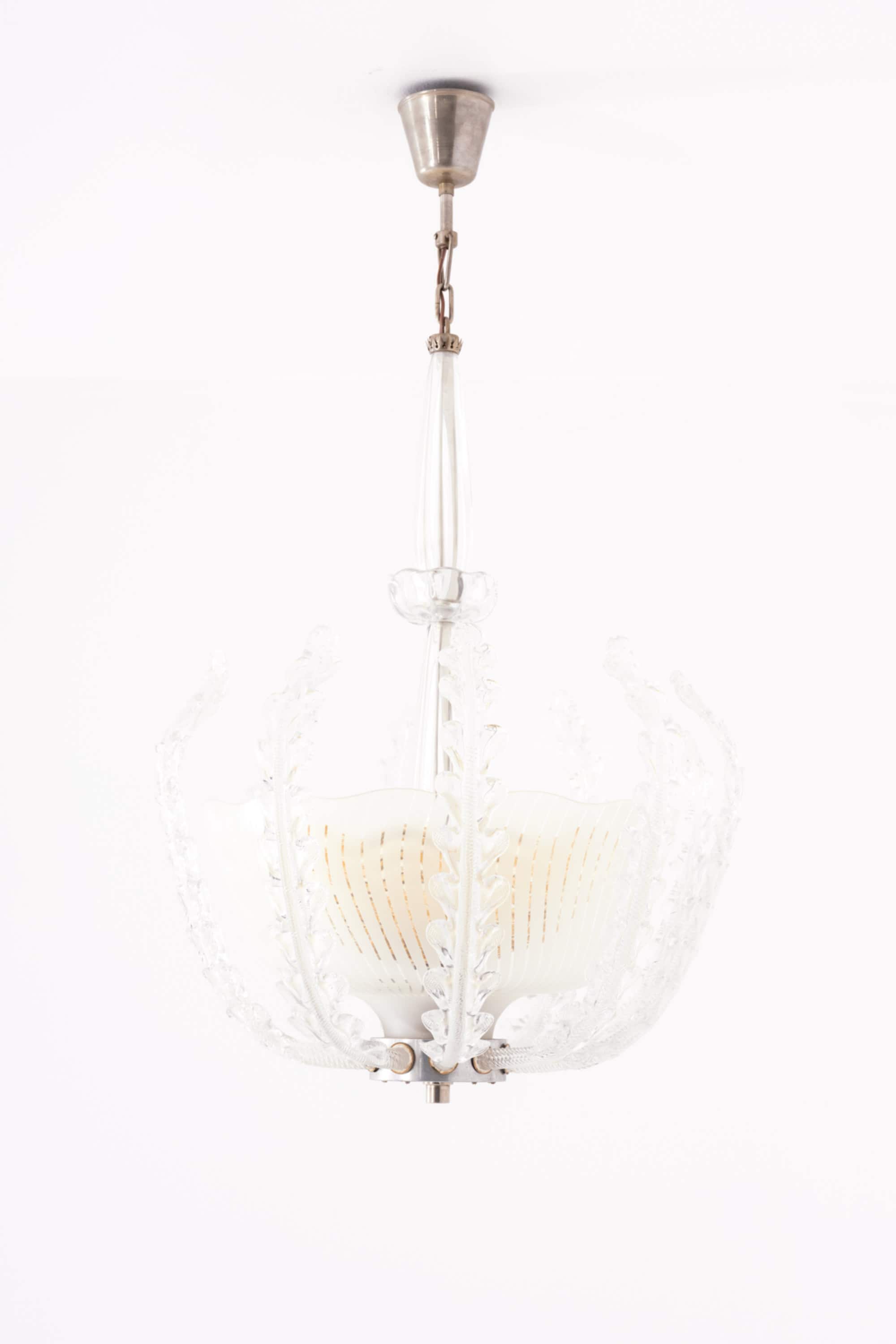 A very rare and large ceiling lamp designed by Fritz Kurz and produced by Orrefors in Sweden during the 1940s. This sculptural piece exemplifies the refined craftsmanship and artistic ambition of Swedish glassmaking in the mid-20th century, combining elegant proportions with intricate organic detailing.