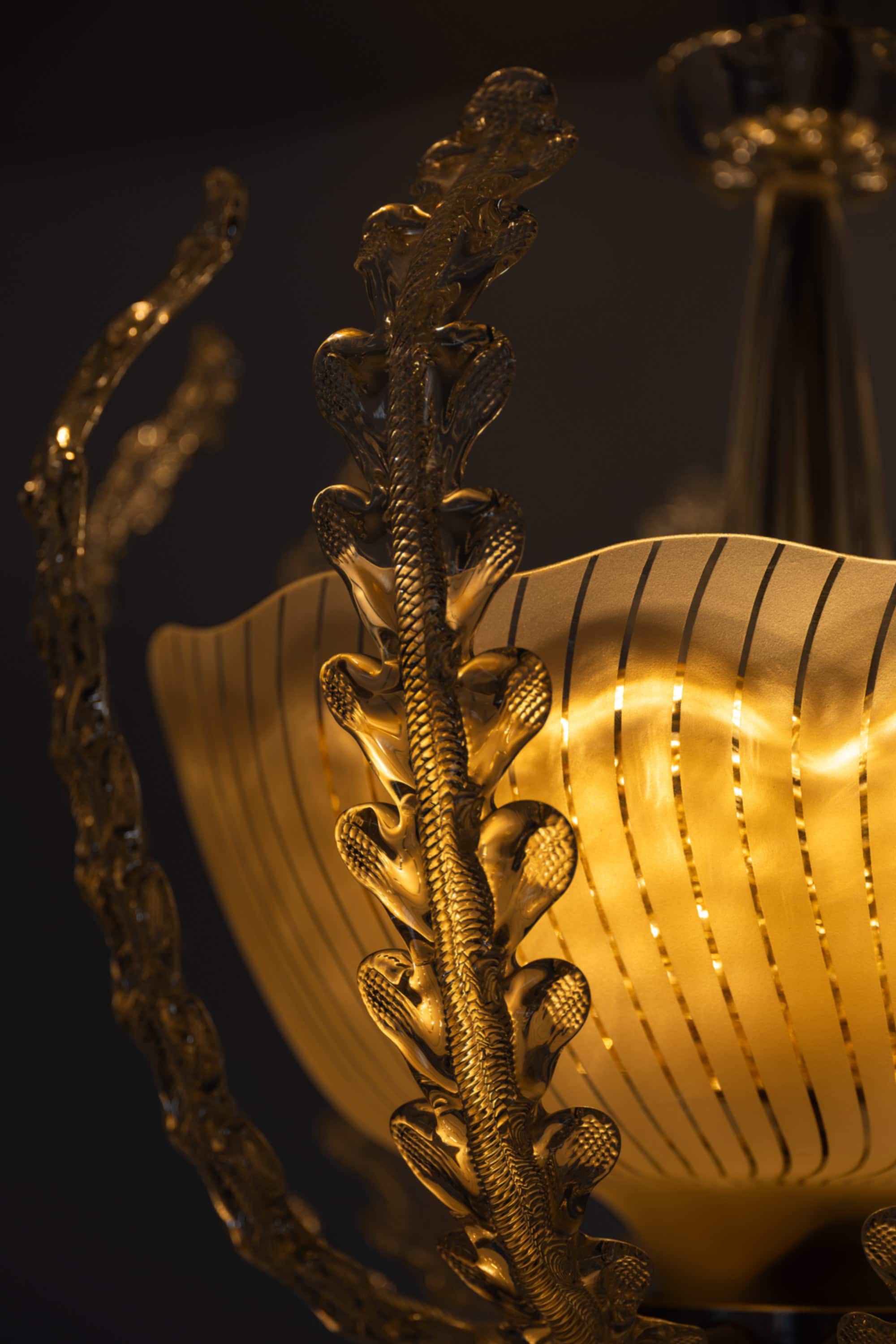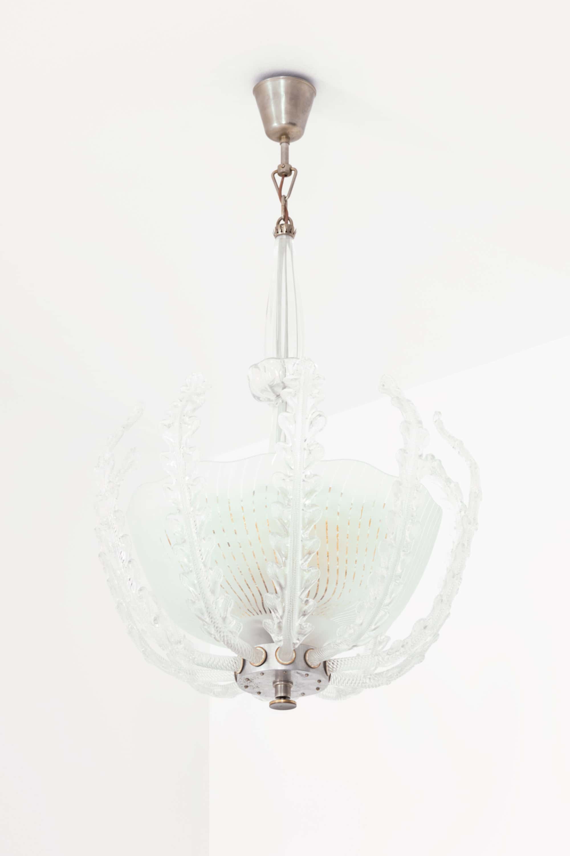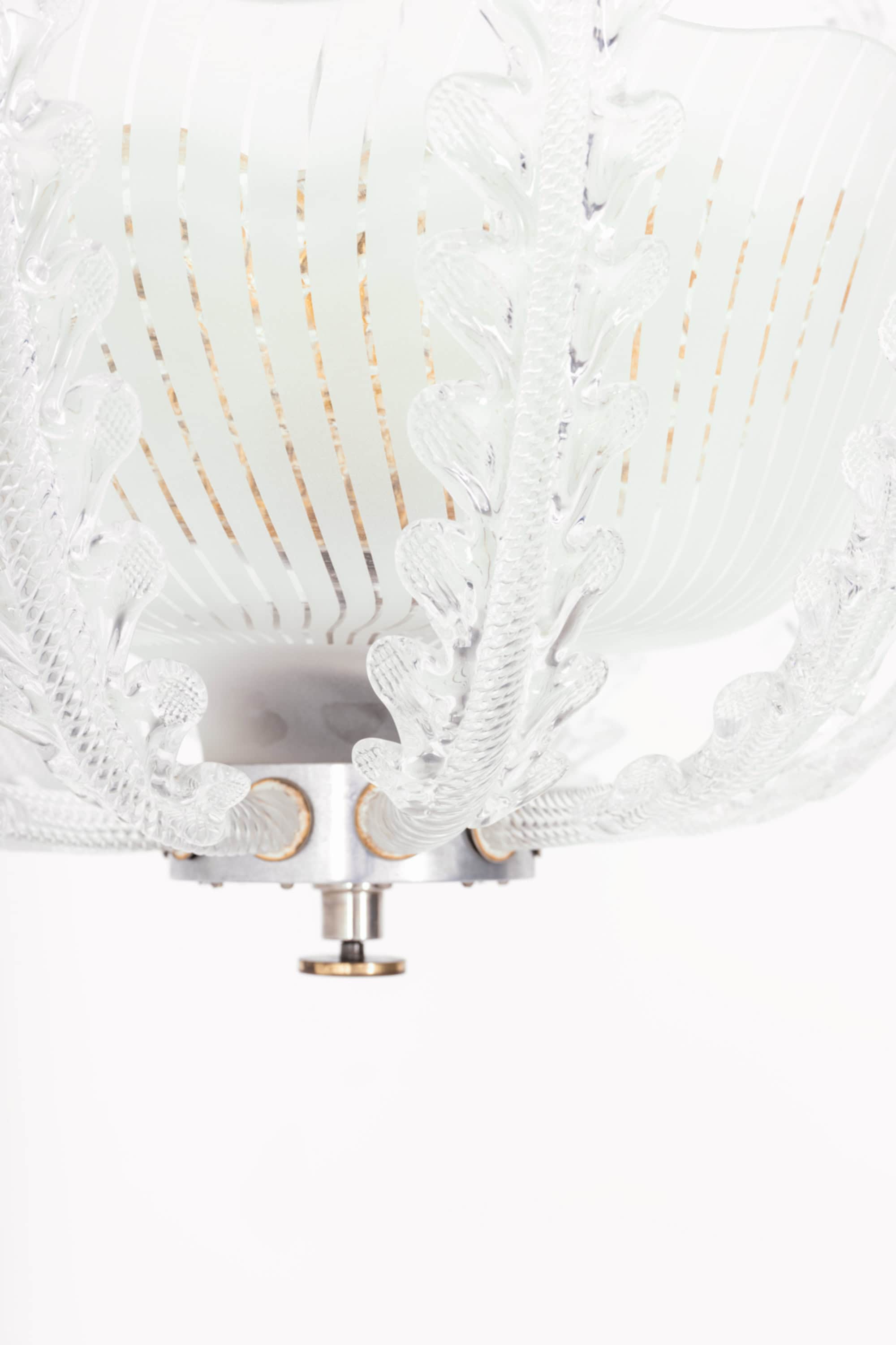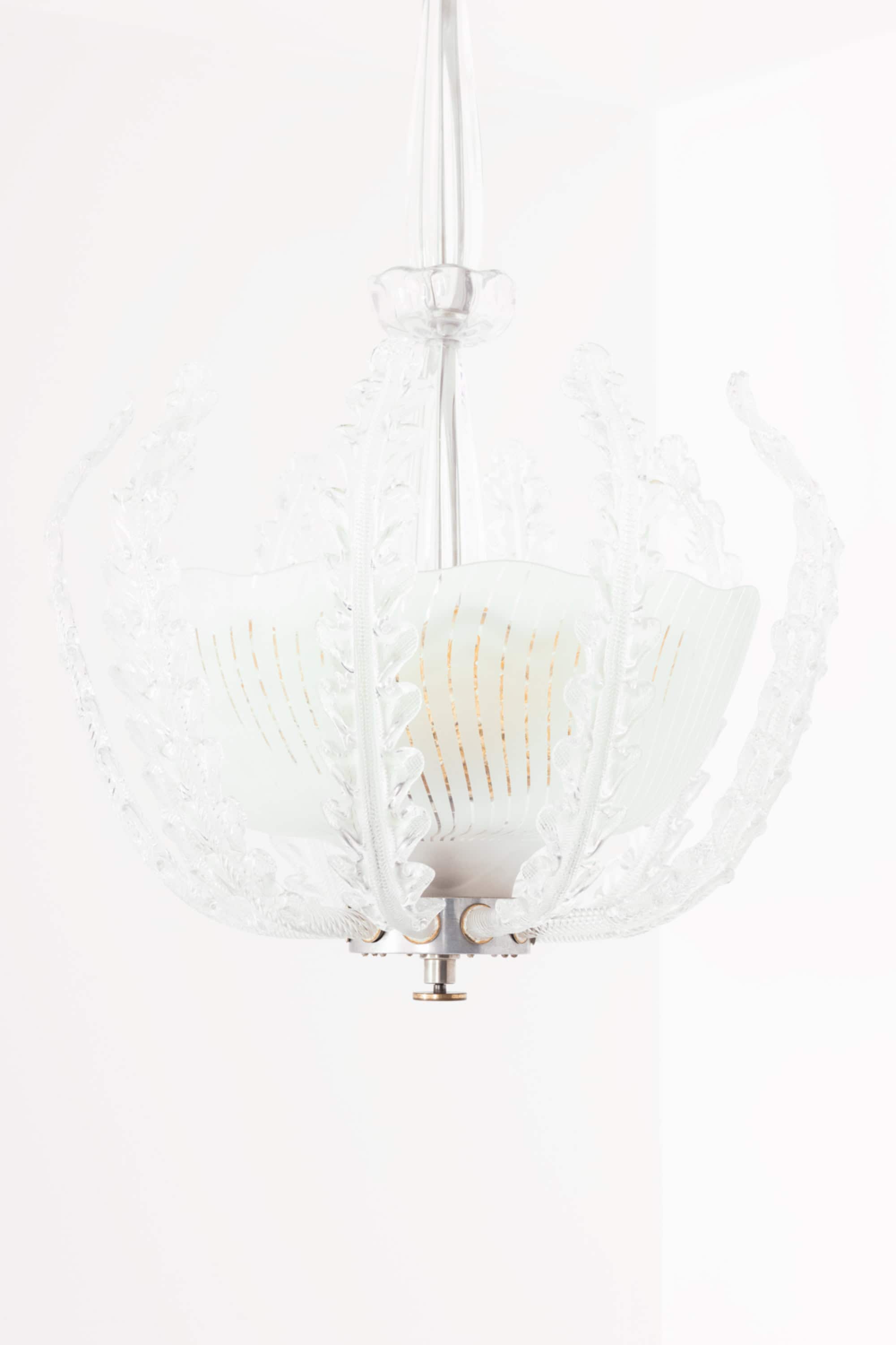 The lamp is composed of a central frosted glass bowl with finely executed vertical incised lines, creating a soft diffusion of light. Surrounding the shade is an elaborate framework of clear glass elements, formed as stylized, leaf-like structures with pronounced texture and curvature. These elements rise gracefully around the bowl, giving the fixture a dynamic, almost botanical character while maintaining symmetry and balance. The central stem is executed in clear glass with subtle vertical fluting, adding further refinement and continuity to the overall design.
